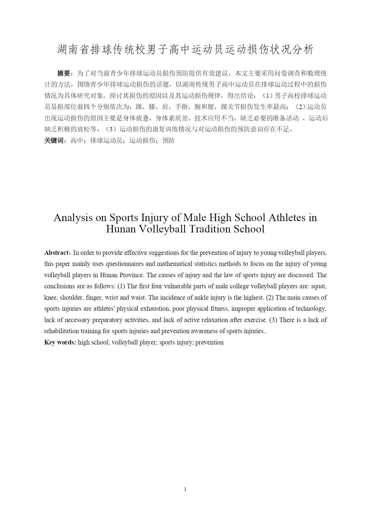 湖南省排球传统校男子高中运动员运动损伤状况分析15000.doc