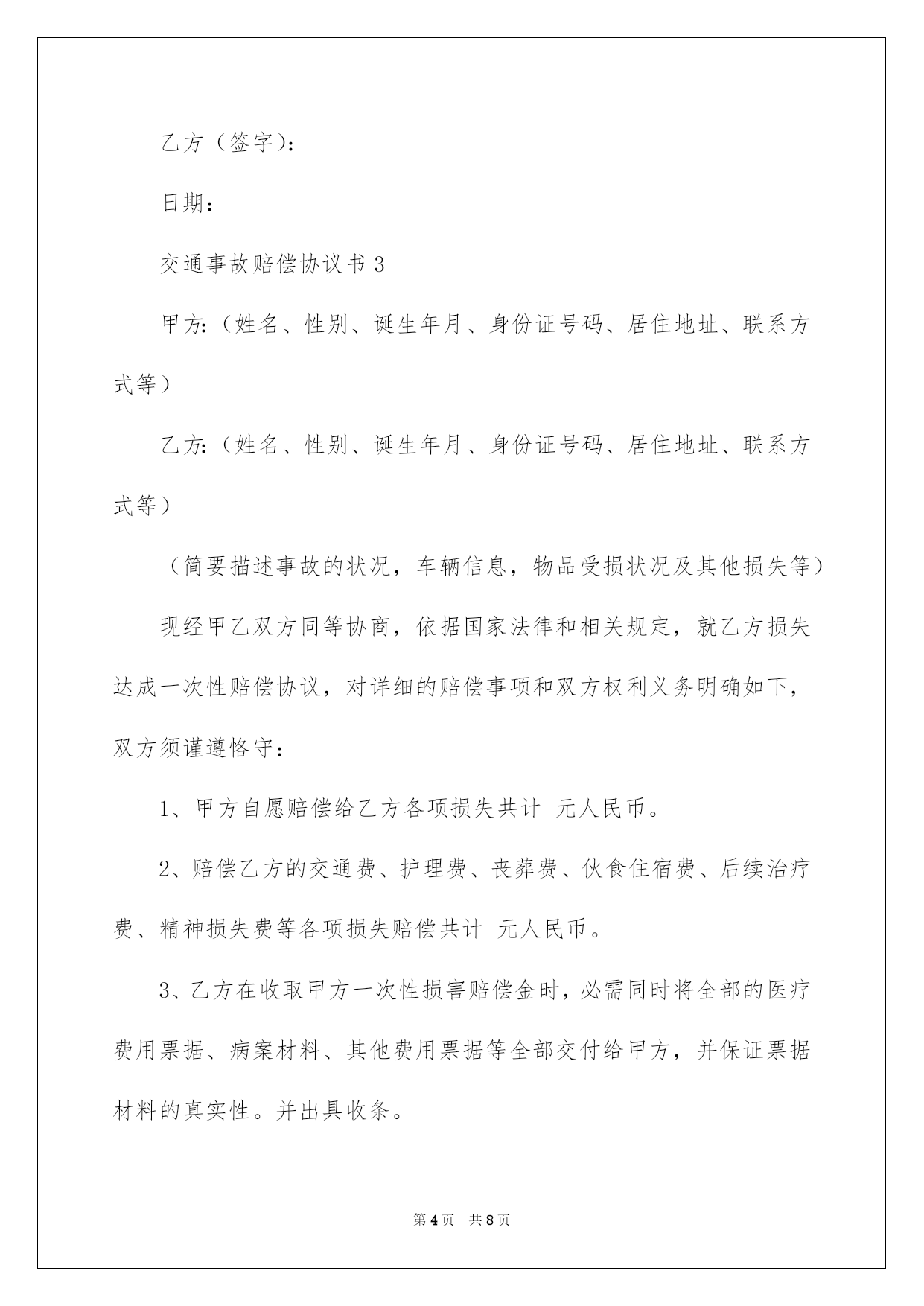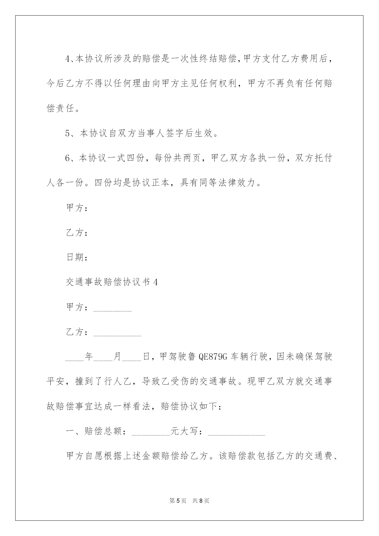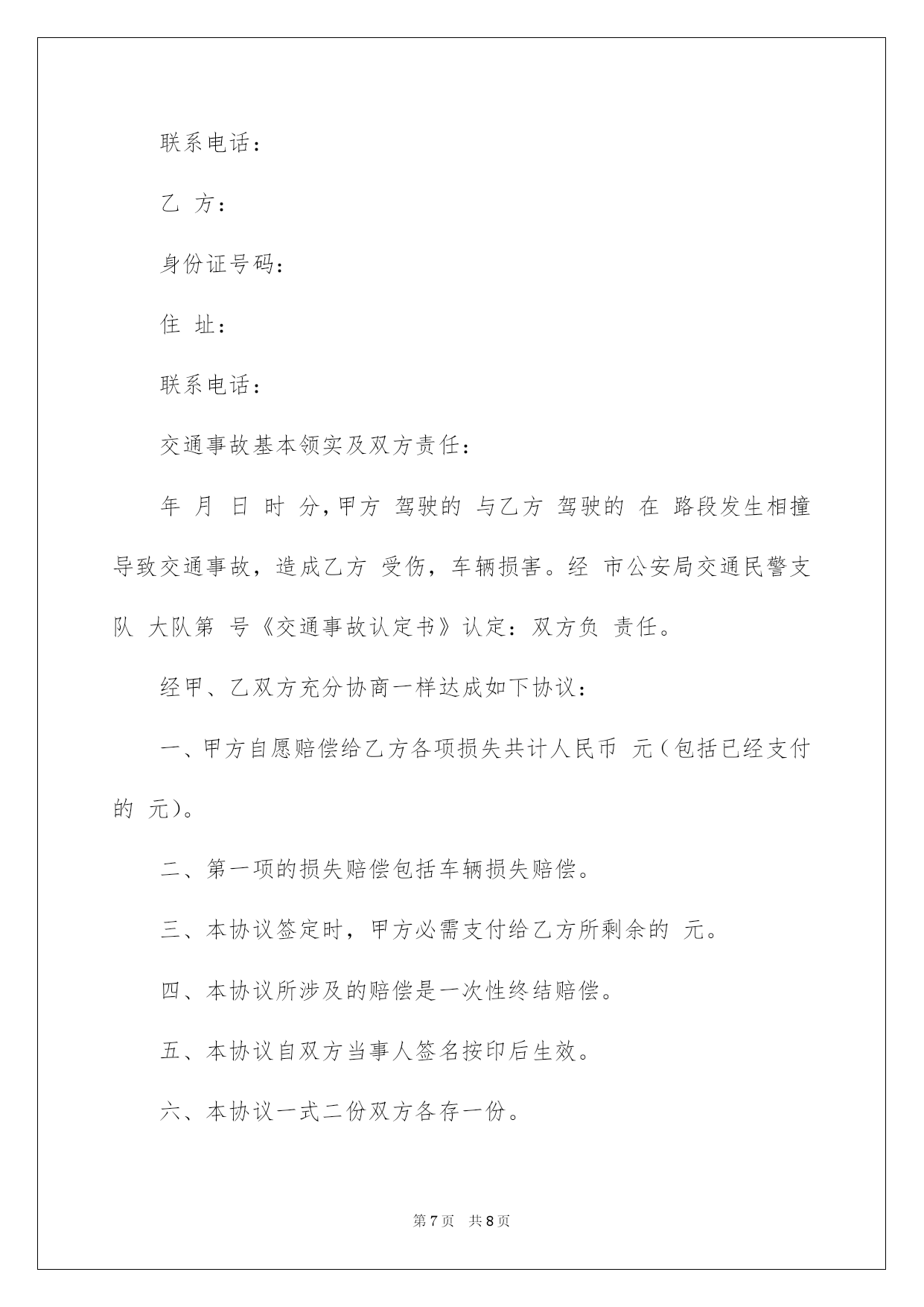第PAGE\*Arabic\*MERGEFORMAT8页共NUMPAGES\*Arabic\*MERGEFORMAT8页第PAGE\*MERGEFORMAT8页共NUMPAGES\*MERGEFORMAT8页第PAGE\*MERGEFORMAT8页共NUMPAGES\*MERGEFORMAT8页第PAGE\*MERGEFORMAT8页共NUMPAGES\*MERGEFORMAT8页第PAGE\*MERGEFORMAT8页共NUMPAGES\*MERGEFORMAT8页第PAGE\*MERGEFORMAT8页共NUMPAGES\*MERGEFORMAT8页第PAGE\*MERGEFORMAT8页共NUMPAGES\*MERGEFORMAT8页第PAGE\*MERGEFORMAT8页共NUMPAGES\*MERGEFORMAT8页第PAGE\*MERGEFORMAT8页共NUMPAGES\*MERGEFORMAT8页第PAGE\*MERGEFORMAT8页共NUMPAGES\*MERGEFORMAT8页第PAGE\*MERGEFORMAT8页共NUMPAGES\*MERGEFORMAT8页2022交通事故赔偿协议书交通事故赔偿协议书范本(精选5篇)在快速改变和不断变革的今日,男女老少都可能须要用到协议,签订协议可以使双方受到法律的爱护。那么什么样的协议才是有效的呢?下面是我为大家收集的交通事故赔偿协议书范本(精选5篇),供大家参考借鉴,希望可以帮助到有须要的挚友。交通事故赔偿协议书1甲方:(姓名、性别、诞生年月日、民族、职业、住址、电话)乙方:(姓名、性别、诞生年月日、民族、职业、住址、电话)年月日时分,于xx驾驶小客车(内乘王XX、王x)由西向东行至xxxx市xx区xx与xx国道交叉口西xxx公里处时,车辆驶入路北侧与路树相撞,造成xxxx抢救无效死亡。现XX(甲方)与XX(乙方)的xxx名近亲属(乙方)就XX死亡赔偿事宜,本着同等、自愿、公允原则,经友好协商,达成如下协议:一、甲方一次性支付给乙方六人死亡赔偿金、被扶养人生活费等共计xxxx万元(未包括丧葬费,丧葬费壹万五仟元已经在本协议签定前由甲方XX支付给了乙方XX的哥哥XX)。二、甲方将上述xxxx万元于本协议签订后日内汇入乙方六人共同指定的银行帐号。帐号为:三、上述费用支付给乙方六人后,由乙方六人内部自行安排、处理,其安排、处理的方式、后果与甲方无关。四、甲方履行汇款义务后,乙方任何一人就此事保证不以任何形式、任何理由就xx死亡一事向甲方要求其他任何费用。五、甲方履行汇款义务后,就此事处理即告终结,甲乙双方之间不再有任何权利、义务。以后因此事衍生的结果亦由乙方自行担当,甲方对此不再担当任何责任。六、本协议为双方同等、自愿协商之结果,是双方真实意思表示,且公允、合理。七、本协议内容甲乙双方共七人已经全文阅读并理解无误,甲乙双方共七人明白本协议所涉及后果,甲乙双方对此协议处理结果完全满足。八、本协议为一次性终结处理协议,九、本协议自甲乙双方共七人签字时生效。本协议一式七份,甲乙双方每人各执一份。甲方:乙方:年月日交通事故赔偿协议书2甲方:乙方:年月日晚,甲方驾驶一辆白色面包车在西滨镇坂兜村把在路边行走的`乙方撞伤,致使乙方左肋骨折断两根。当晚,甲方马上将乙方送至尤溪县医院紧急救治。住院期间,甲方妻子始终陪伴照看。年月日,乙方治愈出院。双方友好协商,并经双方家属同意,无异议,就相关赔偿事宜协议如下:一、乙方住院期间医疗等费用全部由甲方担当。二、出院后,甲方一次性付给乙方养分费元,误工费元,镶牙费元,复查费元,合计元。三、以上各项费用一次性付清后,甲方不再负任何责任。四、本协议一式三份,双方各持一份,交警大队备案一份。甲方(签字):乙方(签字):日期:交通事故赔偿协议书3甲方:(姓名、性别、诞生年月、身份证号码、居住地址、联系方式等)乙方:(姓名、性别、诞生年月、身份证号码、居住地址、联系方式等)(简要描述事故的状况,车辆信息,物品受损状况及其他损失等)现经甲乙双方同等协商,依据国家法律和相关规定,就乙方损失达成一次性赔偿协议,对详细的赔偿事项和双方权利义务明确如下,双方须谨遵恪守:1、甲方自愿赔偿给乙方各项损失共计元人民币。2、赔偿乙方的交通费、护理费、丧葬费、伙食住宿费、后续治疗费、精神损失费等各项损失赔偿共计元人民币。3、乙方在收取甲方一次性损害赔偿金时,必需同时将全部的医疗费用票据、病案材料、其他费用票据等全部交付给甲方,并保证票据材料的真实性。并出具收条。4、本协议所涉及的赔偿是一次性终结赔偿,甲方支付乙方费用后