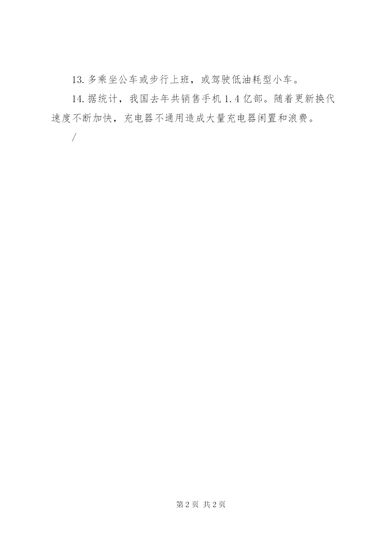 第PAGE\*Arabic\*MERGEFORMAT2页共NUMPAGES\*MERGEFORMAT2页减少碳足迹的环保措施14则1.每天坚持瑜伽、普拉提或者太极拳这样健康自然温和的轻慢运动。2.不抽烟,也尽量不吸二手烟。3.善待他人,以宽容友善温和心看待身边的人和事。4.尽量选择有机食品和健康食用。有机食品在生产加工过程中完全不用化肥、农药和各种添加剂,也不采用基因技术,最后还必须通过独立的有机食品认证。5.尊重生态自然,自觉的环保观,同时还能带动身边人一起倡导环保;不乱扔垃圾,看到别人扔的垃圾,也会捡到垃圾桶里。6.亲近大自然,并;选择环保、自然并且自由的“有机旅行”方式,和传统的在旅途中欣赏美景不一样,它更注重保护性的行为和思维方式,不破坏环境,自觉保护生态。7.积极和身边的人分享乐活生活。8.选择质量可靠的打印机,以免因为卡纸造成浪费。9.使用荧光灯,它比白炽灯至少节电66%。10.关闭电器电源。无论办公室还是家里,电脑、电视等电器不使用时关闭电源比待机状态能节约电源。11.旧物捐赠,将自己多余或无用的物品捐赠给福利组织。12.节约用水,将马桶和水龙头的流量关小,尽量一水多用,比如洗菜水刷碗,洗衣水拖地。13.多乘坐公车或步行上班,或驾驶低油耗型小车。14.据统计,我国去年共销售手机1.4亿部。随着更新换代速度不断加快,充电器不通用造成大量充电器闲置和浪费。/