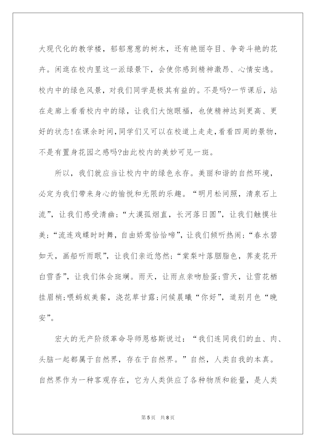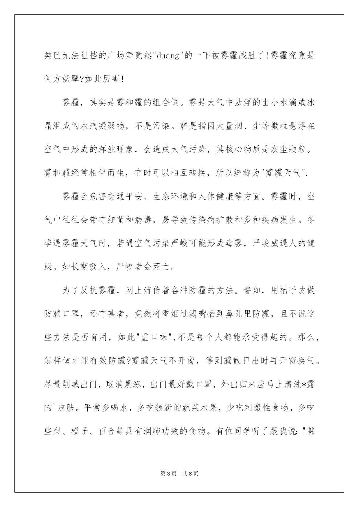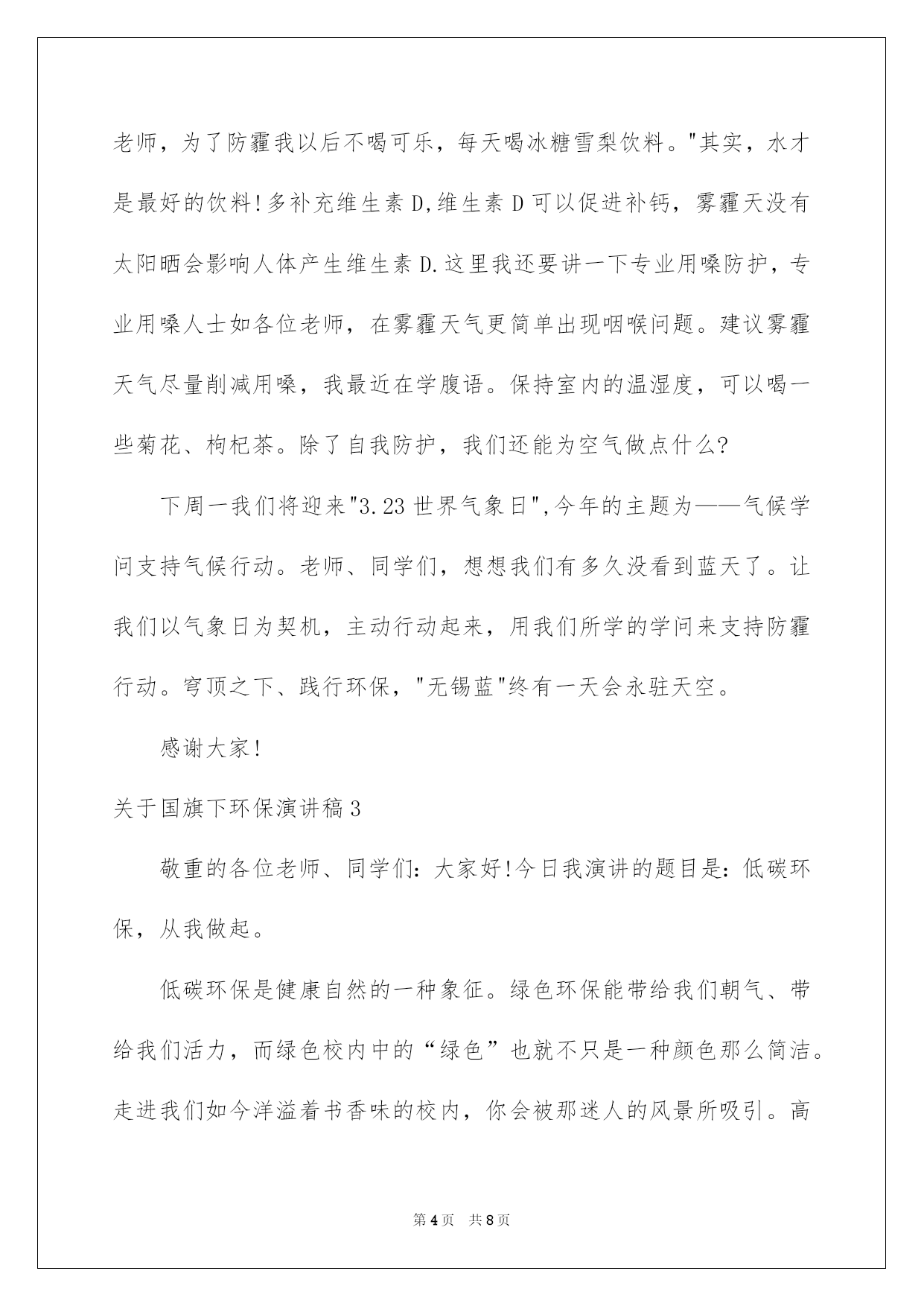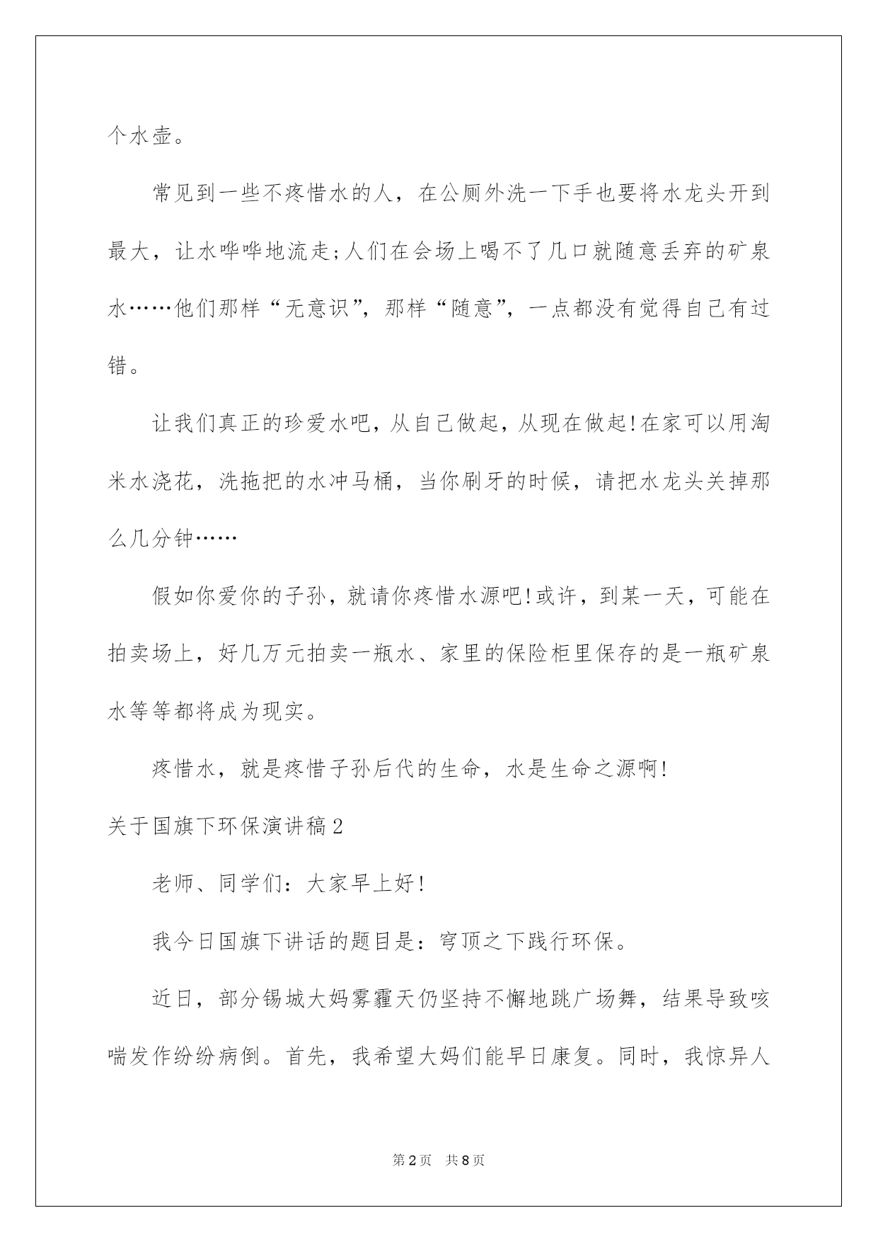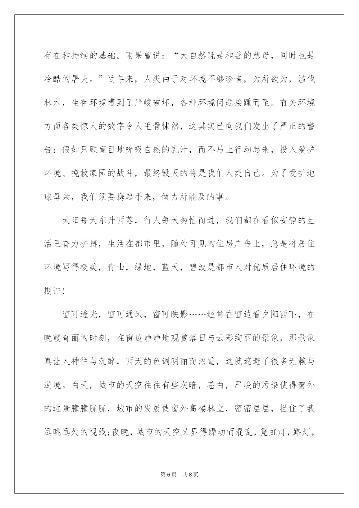 第PAGE\*Arabic\*MERGEFORMAT8页共NUMPAGES\*Arabic\*MERGEFORMAT8页第PAGE\*MERGEFORMAT8页共NUMPAGES\*MERGEFORMAT8页第PAGE\*MERGEFORMAT8页共NUMPAGES\*MERGEFORMAT8页第PAGE\*MERGEFORMAT8页共NUMPAGES\*MERGEFORMAT8页第PAGE\*MERGEFORMAT8页共NUMPAGES\*MERGEFORMAT8页第PAGE\*MERGEFORMAT8页共NUMPAGES\*MERGEFORMAT8页第PAGE\*MERGEFORMAT8页共NUMPAGES\*MERGEFORMAT8页第PAGE\*MERGEFORMAT8页共NUMPAGES\*MERGEFORMAT8页第PAGE\*MERGEFORMAT8页共NUMPAGES\*MERGEFORMAT8页第PAGE\*MERGEFORMAT8页共NUMPAGES\*MERGEFORMAT8页第PAGE\*MERGEFORMAT8页共NUMPAGES\*MERGEFORMAT8页2022国旗下环保演讲稿关于国旗下环保演讲稿关于国旗下环保演讲稿1老师们、同学们:很兴奋能够站在这里给大家做这次演讲。前些日子,我观看了由市环保局、市教化局、市电视台联合主办的《开学第一课》节目,那一期的主题是:同顶一片天,共护一方水。主持人通过一张张照片展示了我们现实生活中水资源被污染的现状:某条河里取出来的水呈黑色;鱼民双手捧着死去的鱼儿欲哭无泪;一河面五彩缤纷的塑料垃圾,根本看不到哪里还有水;一条河长满了绿藻……接着主持人又给我们展示了一些作者的漫画,鱼妈妈和鱼宝宝扛着包袱,举家迁徙……真是让人骇人动目啊!据说,不出20xx年,世界缺水人口将突破25亿。而我国更是一个干旱缺水严峻的国家,人均淡水资源仅占世界水平的1/4。记得我小时候,在我们平房的旧家里,从水龙头里接下的水都可以干脆喝,清洌甘甜。而现在,我们每天喝买来的桶装水,因为干脆接的自来水有股异味不说,水烧开后大量的水垢,没多久就会坏掉一个水壶。常见到一些不疼惜水的人,在公厕外洗一下手也要将水龙头开到最大,让水哗哗地流走;人们在会场上喝不了几口就随意丢弃的矿泉水……他们那样“无意识”,那样“随意”,一点都没有觉得自己有过错。让我们真正的珍爱水吧,从自己做起,从现在做起!在家可以用淘米水浇花,洗拖把的水冲马桶,当你刷牙的时候,请把水龙头关掉那么几分钟……假如你爱你的子孙,就请你疼惜水源吧!或许,到某一天,可能在拍卖场上,好几万元拍卖一瓶水、家里的保险柜里保存的是一瓶矿泉水等等都将成为现实。疼惜水,就是疼惜子孙后代的生命,水是生命之源啊!关于国旗下环保演讲稿2老师、同学们:大家早上好!我今日国旗下讲话的题目是:穹顶之下践行环保。近日,部分锡城大妈雾霾天仍坚持不懈地跳广场舞,结果导致咳喘发作纷纷病倒。首先,我希望大妈们能早日康复。同时,我惊异人类已无法阻挡的广场舞竟然"duang"的一下被雾霾战胜了!雾霾究竟是何方妖孽?如此厉害!雾霾,其实是雾和霾的组合词。雾是大气中悬浮的由小水滴或冰晶组成的水汽凝聚物,不是污染。霾是指因大量烟、尘等微粒悬浮在空气中形成的浑浊现象,会造成大气污染,其核心物质是灰尘颗粒。雾和霾经常相伴而生,有时可以相互转换,所以统称为"雾霾天气".雾霾会危害交通平安、生态环境和人体健康等方面。雾霾时,空气中往往会带有细菌和病毒,易导致传染病扩散和多种疾病发生。冬季遇雾霾天气时,若遇空气污染严峻可能形成毒雾,严峻威逼人的健康。如长期吸入,严峻者会死亡。为了反抗雾霾,网上流传着各种防霾的方法。譬如,用柚子皮做防霾口罩,还有甚者,竟然将香烟过滤嘴插到鼻孔里防霾,且不说这些方法是否有用,如此"重口味",不是每个人都能承受得起的。那么,怎样做才能有效防霾?雾霾天气不开窗,等到霾散日出时再开窗换气。尽量削减出门,取消晨练,出门最好戴口罩,外出归来应马上清洗*露的`皮肤。平常多喝水,多吃簇新的蔬菜水果,少吃刺激性食物,多吃些梨、橙子、百合等具有润肺功效的食物。有位同学听了跟我说:"韩老师,为了防霾我以后不喝可乐,每天喝冰糖雪梨饮料。"其实,水才是最好的饮料!多补充维生素D,维生素D可以促进补钙,雾霾天没有太阳晒会影响人体产生维生素D.这里我还要讲一下专业用嗓防护,专业用嗓人士如各位老师,在雾霾天气更简单出现咽喉问题。建议雾霾天气尽量削减用嗓,我最近在学腹语。保持室内的温湿度,可以喝一些菊花、枸杞茶。除了自我防护,我们还能为空气做点什么