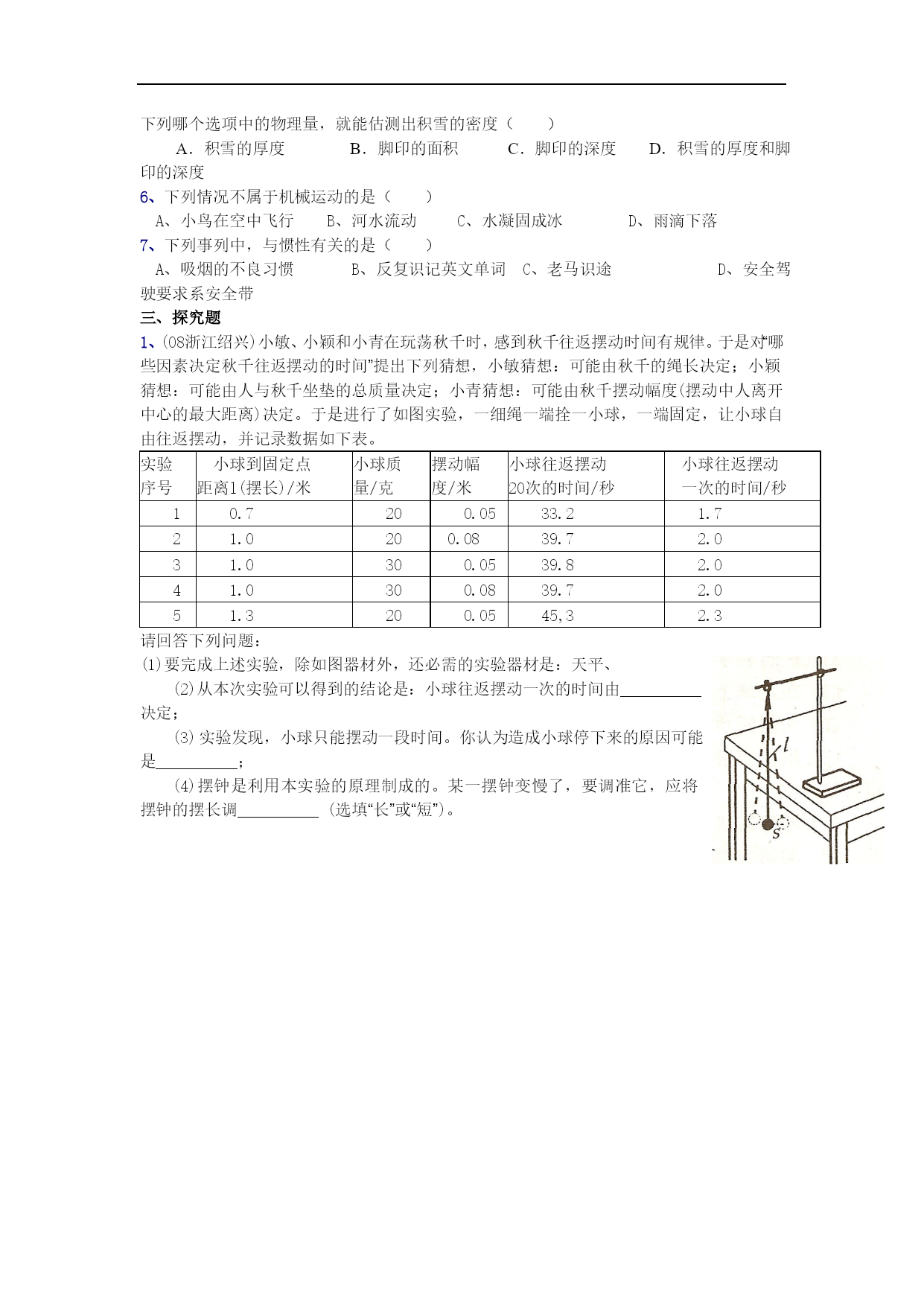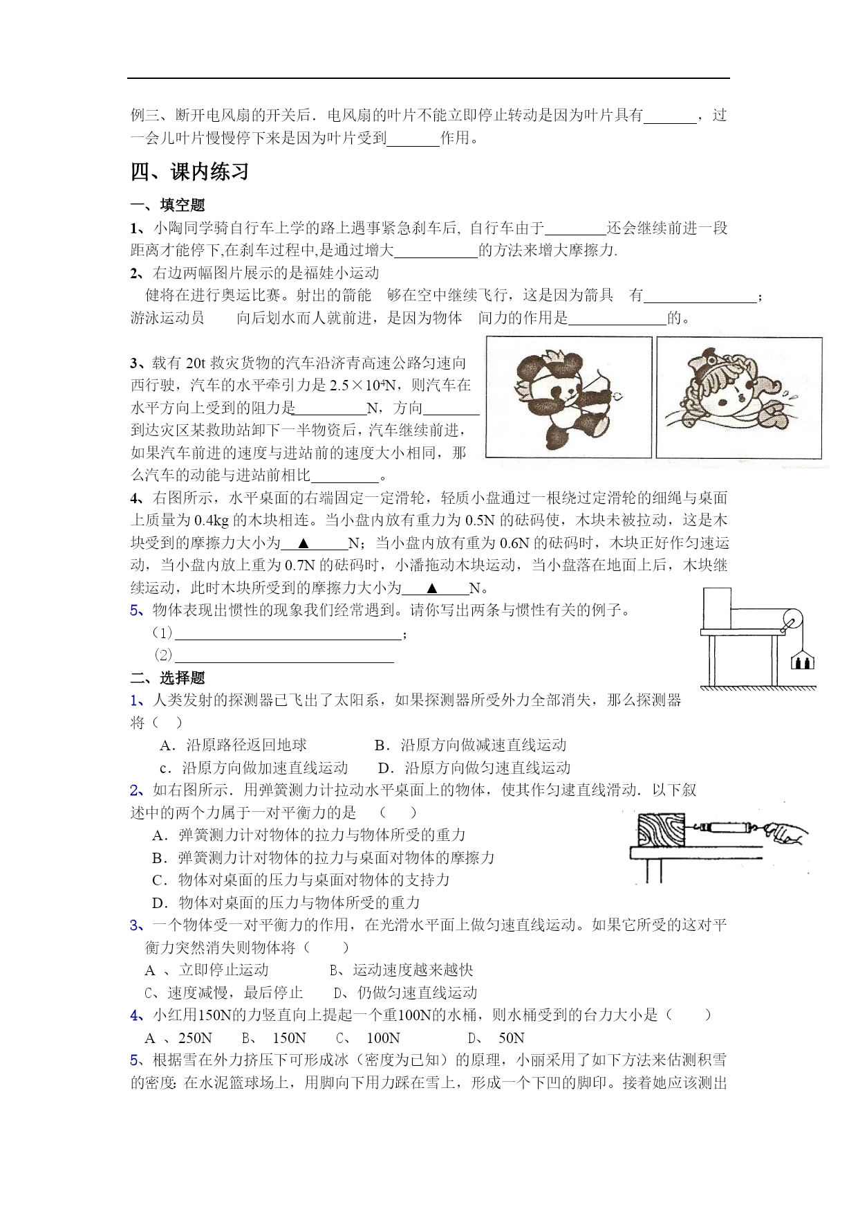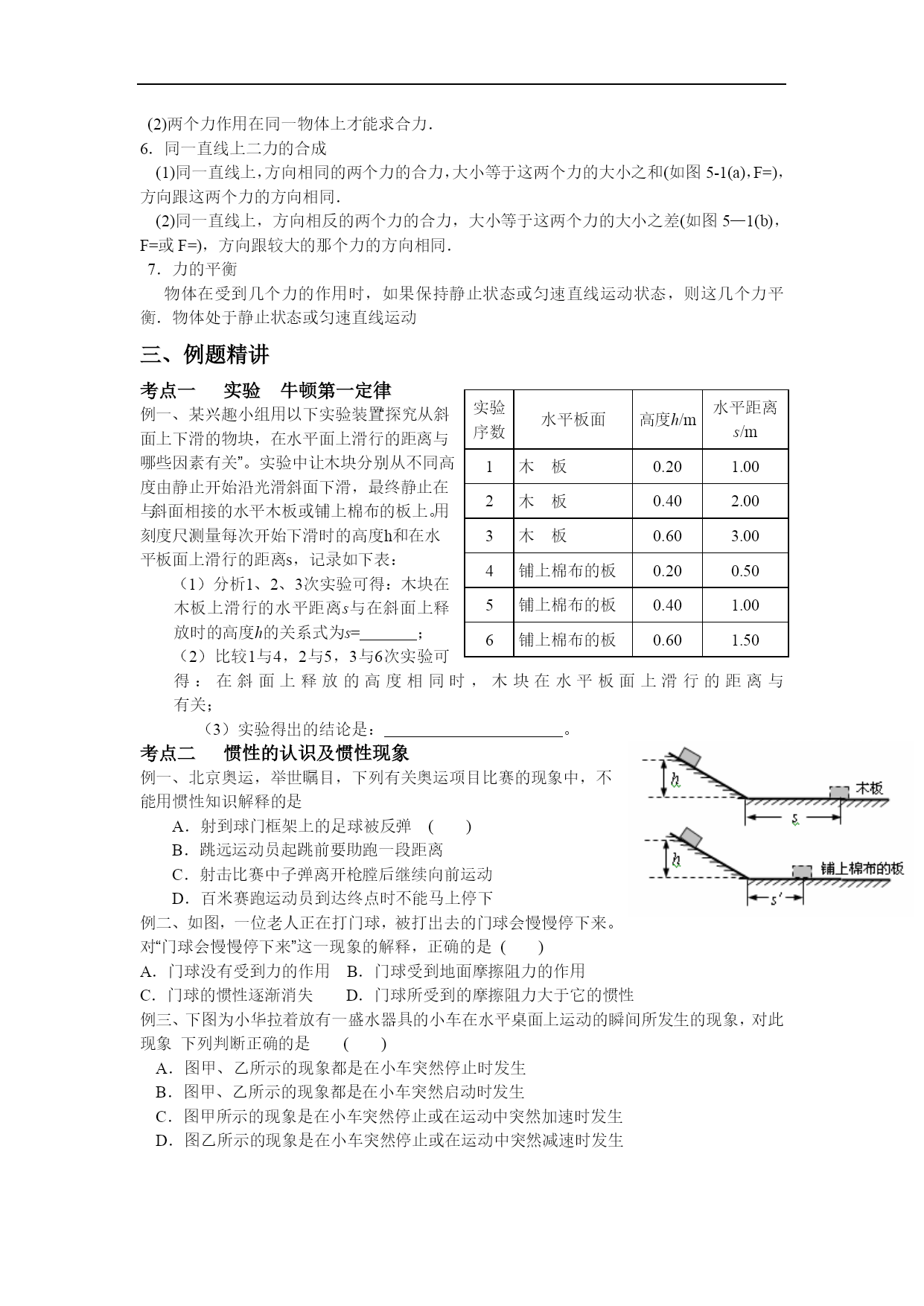 PAGE中考第三单元力与运动单元复习学习目标:1.认识力的作用效果。能用示意图描述力。2.知道二力平衡条件。了解物体运动状态变化的原因。3.通过实验探究,理解物体的惯性。能描述牛顿第一定律。一、中考热点力和运动所研究的物理现象、物理规律与生活紧密相关,也是初中物理的重点内容之一,近年来中考试卷中相关知识点出现的几率较大,如二力平衡及平衡力的判断、惯性及惯性现象的解释、力与运动的关系及牛顿第一定律的实验探究等均是考试的热点.考题形式一般以填空、选择、作图为主.由于中考注重过程和方法及联系同学们生活实际的考查,故在近年的中考试题中设计性、开放性及解释与应用等方面的内容将会得到适当加强.在2009年的考前复习过程中,应特别注意以下几点:(1)弹簧测力计的使用方法;(2)力的图示方法;(3)力和运动之间的关系;(4)通过对实验现象的分析归纳物理规律;(5)摩擦及增大或减小摩擦的方法;(6)物体受力分析等.二、考点精讲1.牛顿第一定律(1)一切物体在没有受到力的作用的时候,总保持静止状态或匀速直线运动状态,这个结论叫牛顿第一定律.(2)牛顿第一定律是在大量经验事实的基础上,通过进一步的推理而概括出来的.(3)牛顿第一定律揭示了力不是维持物体原来运动状态的原因,而是改变物体运动状态的原因.物体不受力时,会保持原来的运动状态不变化.而当物体的运动状态改变时,物体必定受到力的作用2.物体运动状态的改变包括下列两种情况:(1)运动快慢的改变;(2)运动方向的改变3.惯性(1)从牛顿第一定律可以看出,物体有一种保持原来运动状态的特性,这种特性的表现是不愿意改变原来的运动状态.我们把物体保持运动状态不变的性质叫做惯性.(2)惯性是物体固有的性质:①一切物体在任何情况下都具有惯性.一切物体包括气体、液体、固体;静止的、运动的物体;运动状态改变或不改变的物体;受力或不受力的物体.②惯性的大小由自身因素决定,与其他外界因素无关.惯性由物体的质量决定,质量越大,惯性越大.(3)惯性不是力.惯性是物体具有的一种性质,力是物体对物体的作用,它们的本质不同.不能把惯性说成惯性力,不能认为能用力克服惯性,或比较惯性和力的大小.(4)惯性现象及其解释:任何物体都有惯性,因惯性现象普遍存在于自然界和日常生活中,所以我们应当正确认识与惯性有关的现象及其产生的物理过程.4.合力的概念(1)如果一个力产生的作用效果跟几个力共同作用产生的效果相同,这个力就叫做那几个力的合力.(2)在解决实际问题时,可用一个力替代几个力,也可以用几个力替代一个力,这就是等效替代.5.二力的合成(1)求两个力的合力叫做二力的合成.(2)两个力作用在同一物体上才能求合力.6.同一直线上二力的合成(1)同一直线上,方向相同的两个力的合力,大小等于这两个力的大小之和(如图5-1(a),F=),方向跟这两个力的方向相同.(2)同一直线上,方向相反的两个力的合力,大小等于这两个力的大小之差(如图5—1(b),F=或F=),方向跟较大的那个力的方向相同.7.力的平衡物体在受到几个力的作用时,如果保持静止状态或匀速直线运动状态,则这几个力平衡.物体处于静止状态或匀速直线运动实验序数水平板面高度h/m水平距离s/m1木板0.201.002木板0.402.003木板0.603.004铺上棉布的板0.200.505铺上棉布的板0.401.006铺上棉布的板0.601.50三、例题精讲考点一实验牛顿第一定律例一、某兴趣小组用以下实验装置“探究从斜面上下滑的物块,在水平面上滑行的距离与哪些因素有关”。实验中让木块分别从不同高度由静止开始沿光滑斜面下滑,最终静止在与斜面相接的水平木板或铺上棉布的板上。用刻度尺测量每次开始下滑时的高度h和在水平板面上滑行的距离s,记录如下表:(1)分析1、2、3次实验可得:木块在木板上滑行的水平距离s与在斜面上释放时的高度h的关系式为s=;(2)比较1与4,2与5,3与6次实验可得:在斜面上释放的高度相同时,木块在水平板面上滑行的距离与有关;(3)实验得出的结论是:。考点二惯性的认识及惯性现象例一、北京奥运,举世瞩目,下列有关奥运项目比赛的现象中,不能用惯性知识解释的是A.射到球门框架上的足球被反弹()B.跳远运动员起跳前要助跑一段距离C.射击比赛中子弹离开枪膛后继续向前运动D.百米赛跑运动员到达终点时不能马上停下例二、如图,一位老人正在打门球,被打出去的门球会慢慢停下来。对“门球会慢慢停下来”这一现象的解释,正确的是()A.门球没有受到力的作用B.门球受到地面摩擦阻力的作用C.门球的惯性逐渐消失D.门球所受到的摩擦阻力大于它的惯性例三、下图为小华拉着放有一盛水器具的小车在水平桌面