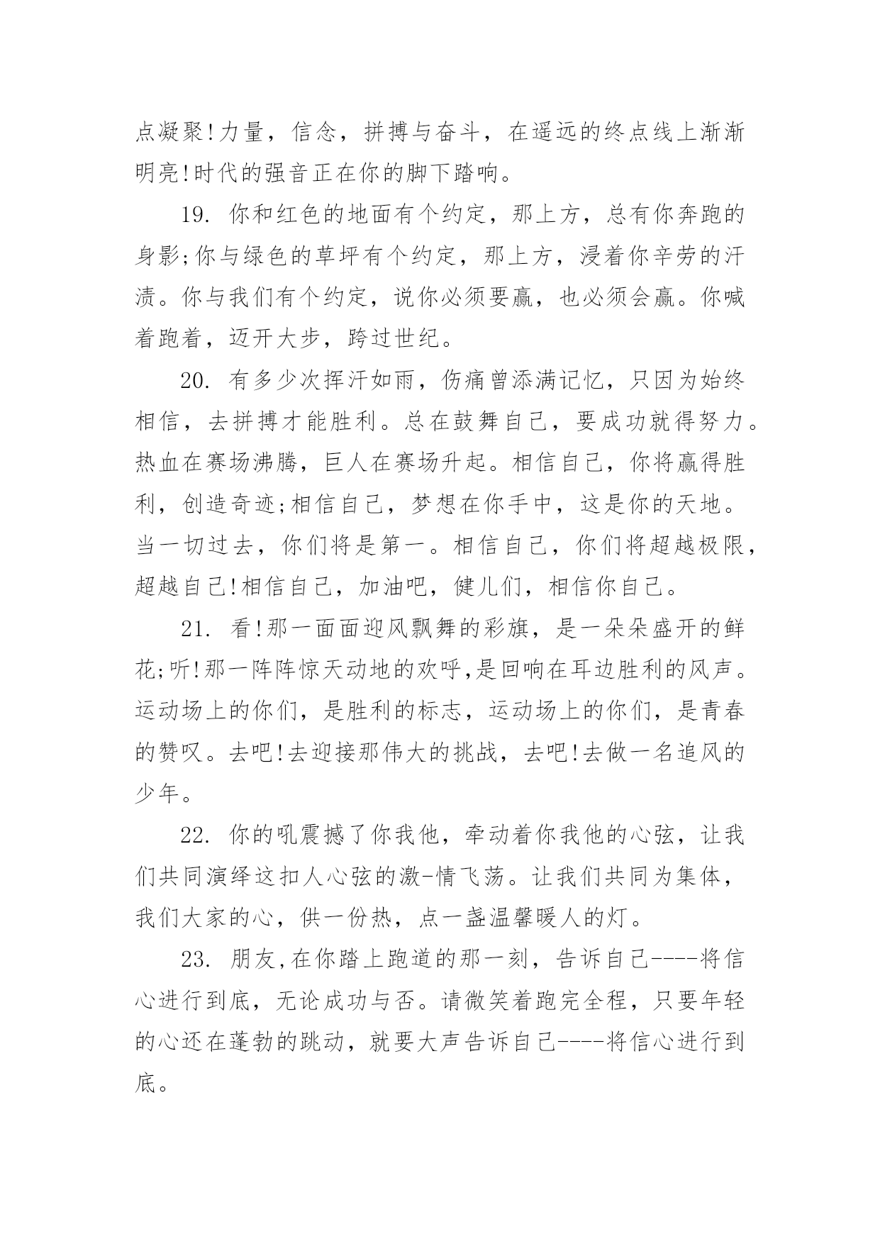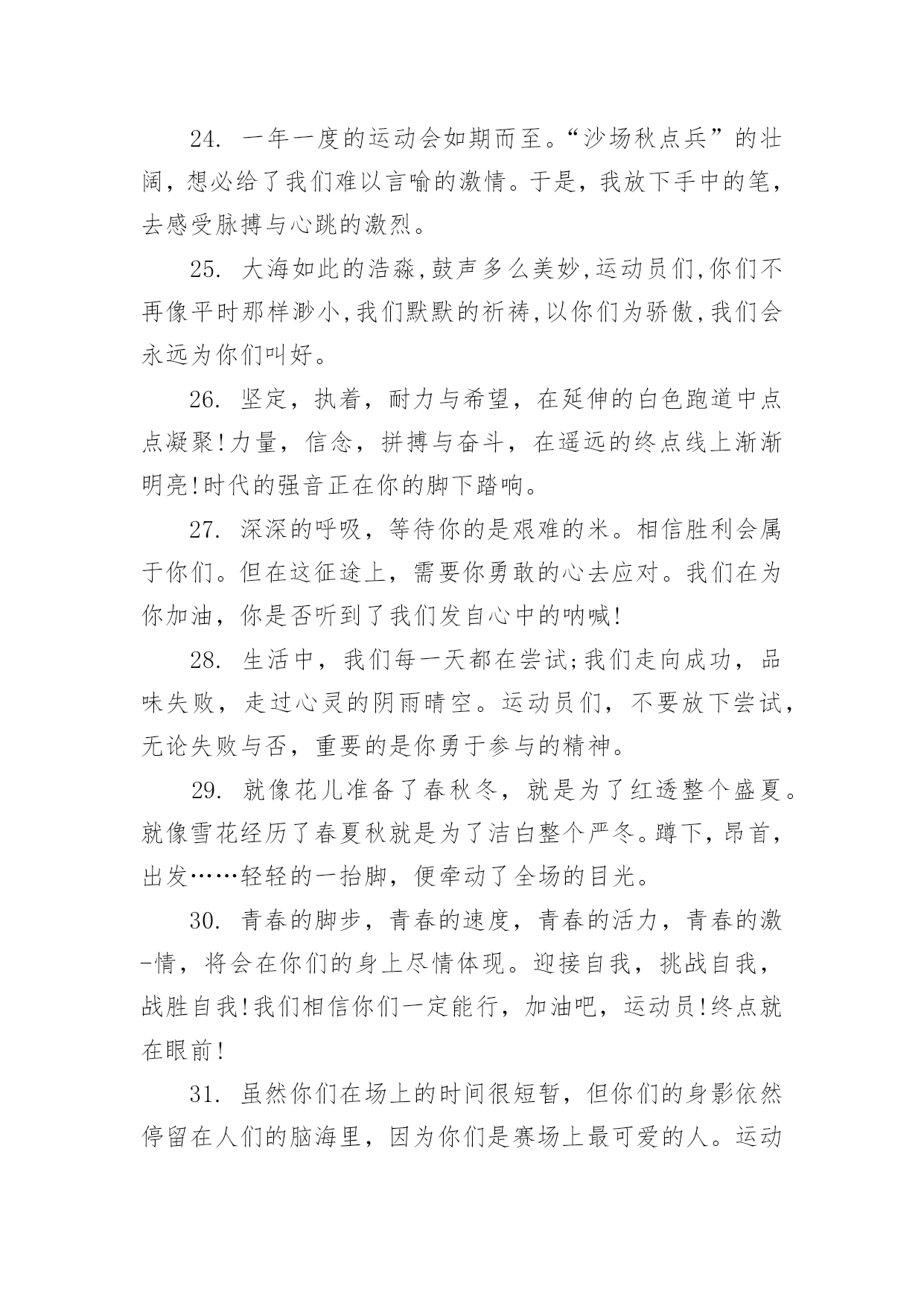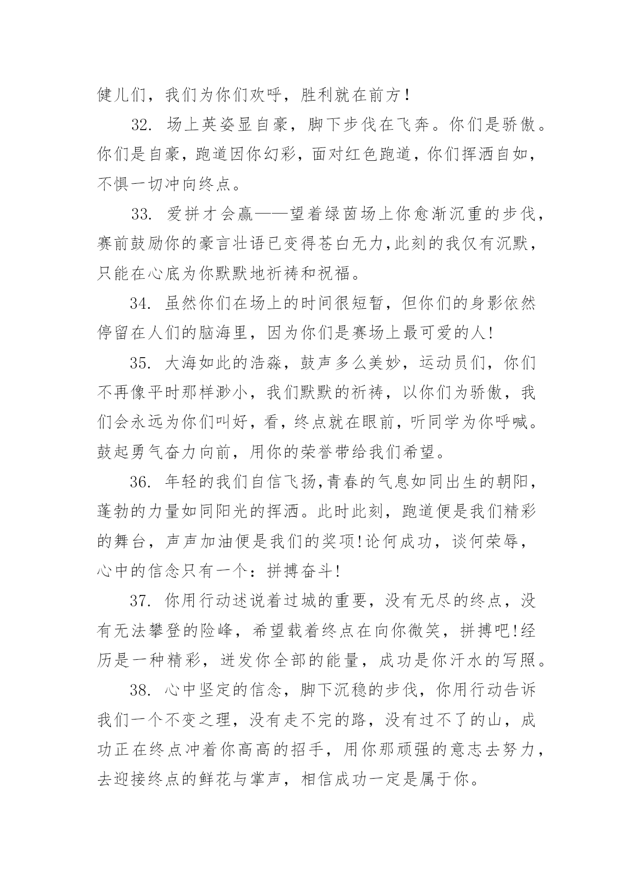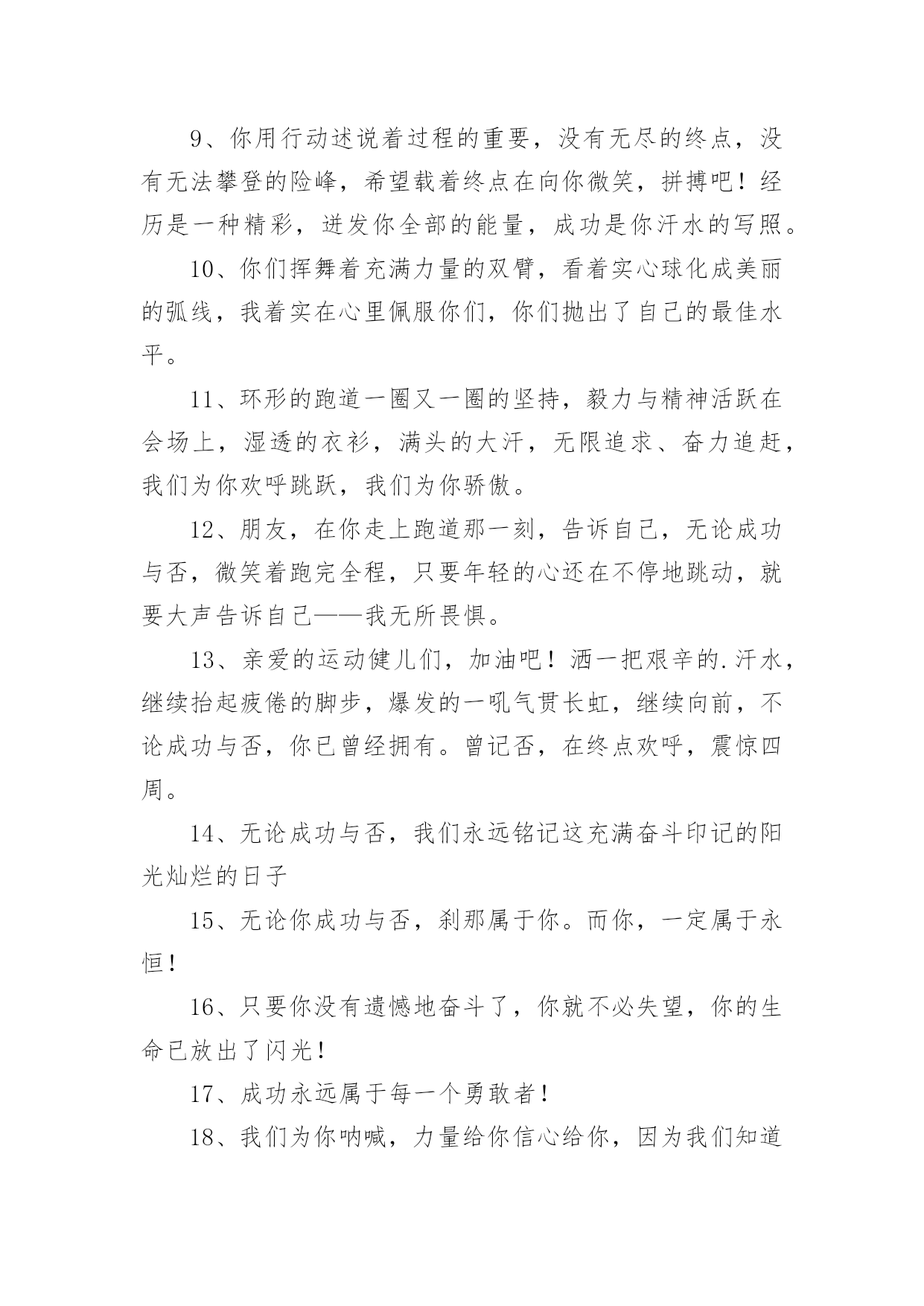 运动会加油稿运动会加油稿在现在的社会生活中,用到加油稿的地方越来越多,借助加油稿往往可以提升对方的气势。你知道加油稿怎样才能写的好吗?以下是小编收集整理的运动会加油稿,供大家参考借鉴,希望可以帮助到有需要的朋友。运动会加油稿1大地属于你,蓝天属于你,在你一跃的瞬间,同时跃出了我们的希望。草儿欣赏你,白云欢迎你,身轻如燕,飞跃蓝天,奥林匹克精神在你身上体现,跳吧,跳出你的自信,跳出你的.顶尖,跳出你的胜利山颠。跳出你们的英姿飒爽;跳出你们的活力四射;跳出你们的无限激情;跳出你们的青春活力;跳出你们的辉煌成就。运动会加油稿21、不为掌声的诠释、不为刻意的征服、只有辛勤的汗水化作追求的脚步、心中坚定的信念、脚下沉稳的步伐、你用行动诉说着一个不变的真理、没有比脚更长的路、没有比人更高的山、希望在终点向你招手、努力吧用你坚韧不拔的毅志、去迎接终点的鲜花与掌声、相信成功属于你们。2、深深的呼吸,等待你的是艰难的米。相信胜利会属于你们。但在这征途上,需要你勇敢的心去面对。我们在为你加油,你是否听到了我们发自心中的呐喊?困难和胜利都在向你招手,去呀,快去呀,不要犹豫。快去击败困难、快去夺取胜利!相信你会送给我们一个汗水浸湿的微笑!3、这是意志的拼搏,这是速度的挑战,胜利在向你们招手,胜利在向你们呼唤!4、踏上跑道,是一种选择。离开起点,是一种勇气。驰骋赛场,是一种胜利。5、看,终点就在眼前;听,同学为你呼喊。鼓起勇气奋力向前,用你的荣誉带给我们希望。6、运动健将们,用你的实力,用你的精神,去开拓出,一片属于你的长跑天地!7、不为掌声的注释,不为刻意的征服,不为失败的痛苦,只有辛勤的汗水,化作成功的脚步!8、不为鲜花的围绕,不为刹那的荣耀,只有执着的信念,化作不停的奔跑,心中燃烧着梦想,脚下不停的步伐!9、你用行动述说着过程的重要,没有无尽的终点,没有无法攀登的险峰,希望载着终点在向你微笑,拼搏吧!经历是一种精彩,迸发你全部的能量,成功是你汗水的写照。10、你们挥舞着充满力量的双臂,看着实心球化成美丽的弧线,我着实在心里佩服你们,你们抛出了自己的最佳水平。11、环形的跑道一圈又一圈的坚持,毅力与精神活跃在会场上,湿透的衣衫,满头的大汗,无限追求、奋力追赶,我们为你欢呼跳跃,我们为你骄傲。12、朋友,在你走上跑道那一刻,告诉自己,无论成功与否,微笑着跑完全程,只要年轻的心还在不停地跳动,就要大声告诉自己——我无所畏惧。13、亲爱的运动健儿们,加油吧!洒一把艰辛的.汗水,继续抬起疲倦的脚步,爆发的一吼气贯长虹,继续向前,不论成功与否,你已曾经拥有。曾记否,在终点欢呼,震惊四周。14、无论成功与否,我们永远铭记这充满奋斗印记的阳光灿烂的日子15、无论你成功与否,刹那属于你。而你,一定属于永恒!16、只要你没有遗憾地奋斗了,你就不必失望,你的生命已放出了闪光!17、成功永远属于每一个勇敢者!18、我们为你呐喊,力量给你信心给你,因为我们知道那一步步的前进十分勇敢。我们为你呐喊,虽然显得火热,但却希望你能加油。19、你带来的,是拼搏的精神;你带走的,是悦耳的呐喊;你付出的,是淋漓的汗水;你收获的,是轰鸣的掌声。运动的盛会为你们而召开,观众的掌声为你们而拍响,雄壮的号角为你们而擂起,成功的花朵为你们而芳香!20、你是运动场的心脏,跳动梦想;你是漫长路的精神,激励辉煌;你们是将上下求索的人!风为你加油,云为你助兴,坚定,执着,耐力与希望,在延伸的白色跑道中点点凝聚!力量,信念,拼搏与奋斗,在遥远的终点线上渐渐明亮!时代的强音正在你的脚下踏响。21、拼搏者,你是赛场上最亮的点。在你的眼中,不在乎胜利的欢乐和失败的眼泪,完全只是为了展示生命跳跃的节拍。拼搏者,你是生命乐章中最响的音符。在你的心中,只有不停拼搏的信念,用自己坚实的步伐去迈开人生新的旅程。场上的拼搏者,你是我们永远的骄傲!运动会加油稿31.青春的脚步,青春的速度,青春的活力,青春的激情,将会在你们的身上尽情体现。迎接自我,挑战自我,战胜自我!我们相信你们一定能行,加油吧,运动员!终点就在眼前!2.温暖的阳光洒在赛场上,男子乙组标枪的比赛即将开始。赛场上,一道道优美的弧线将轻盈地划过天空。健儿们用手中的标枪向距离的权限发起一轮又一轮的挑战。标枪在空中轻盈的姿态,是健儿们强健的力量和熟练的技巧的结合。谁能在这场激烈的竞争中获胜?让我们拭目以待,让我们为他们呐喊、助威吧!只有将力量与技巧合二为一的人,才能获得胜利的桂冠!3.年轻的我们自信飞扬,青春的气息如同出生的朝阳,蓬勃的力量如同阳光的挥洒。此时此刻,跑道便是我们精彩的舞台,声声加油便是我们最高的奖项!论何成功,谈何荣辱,心中的信念只有一个:拼搏!萧瑟的秋风,挡不住你们破竹的锐气。4.不长不短的距离,需要的是全身心全程投入,自始至终你们都在拼全力此