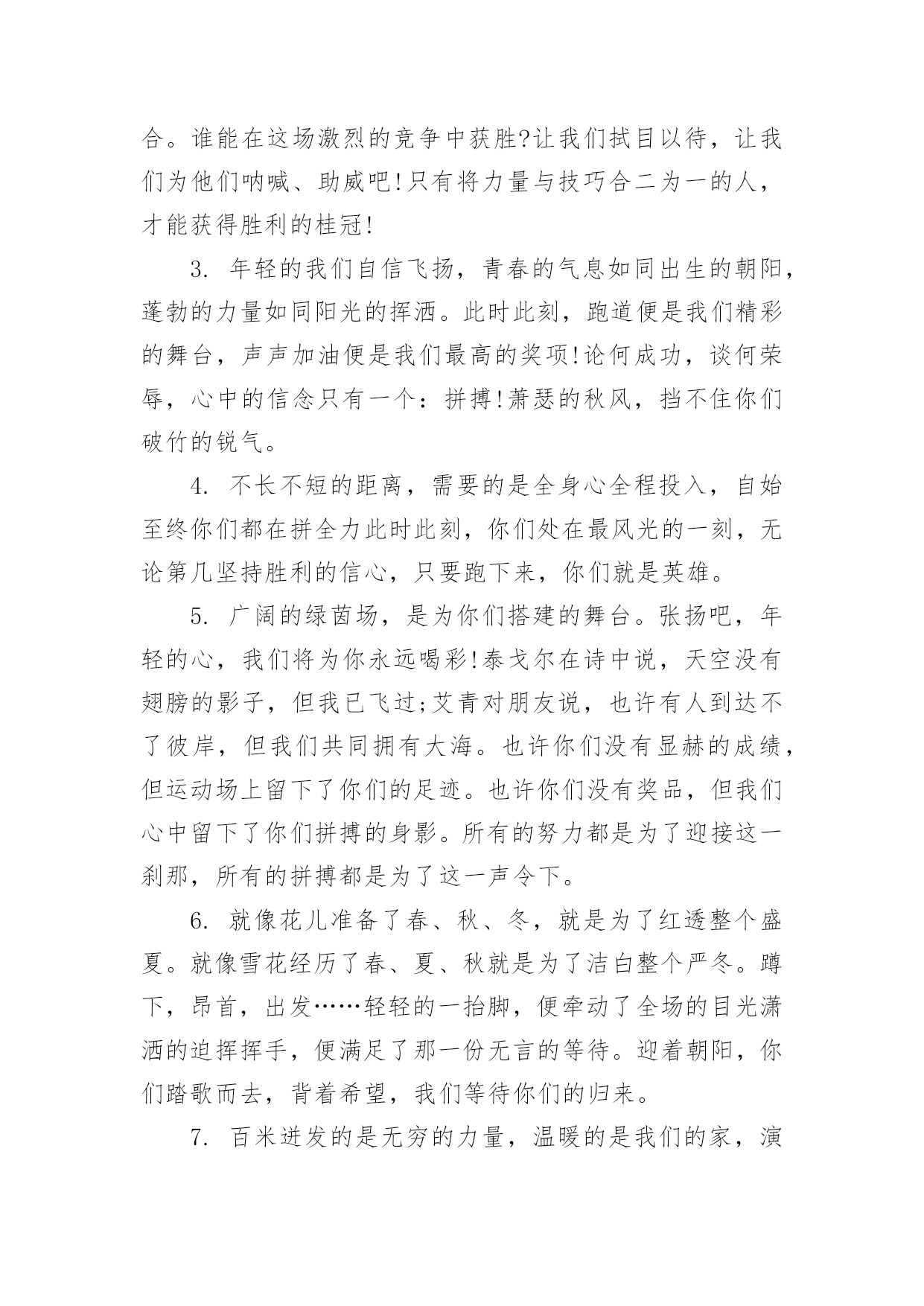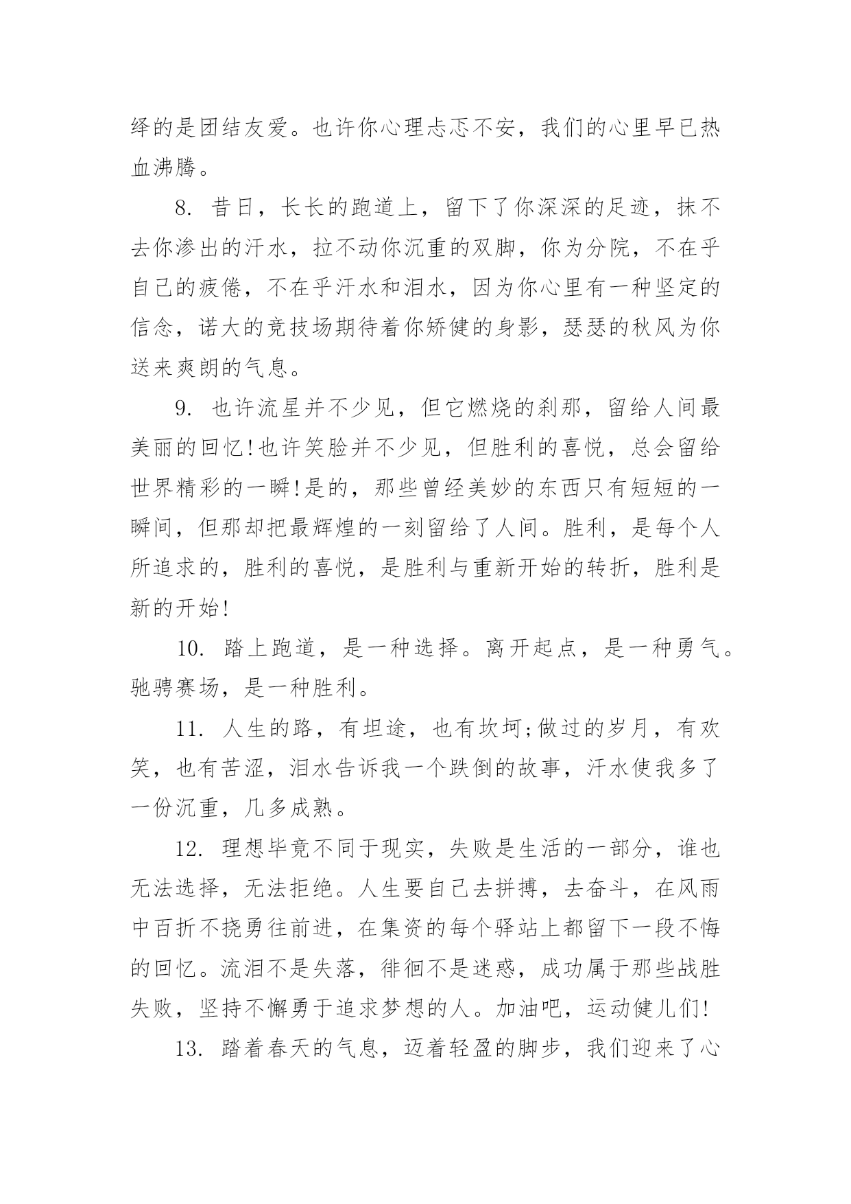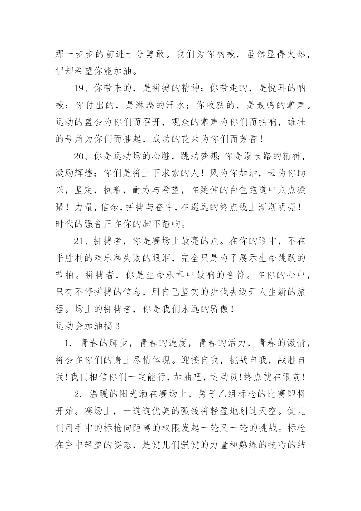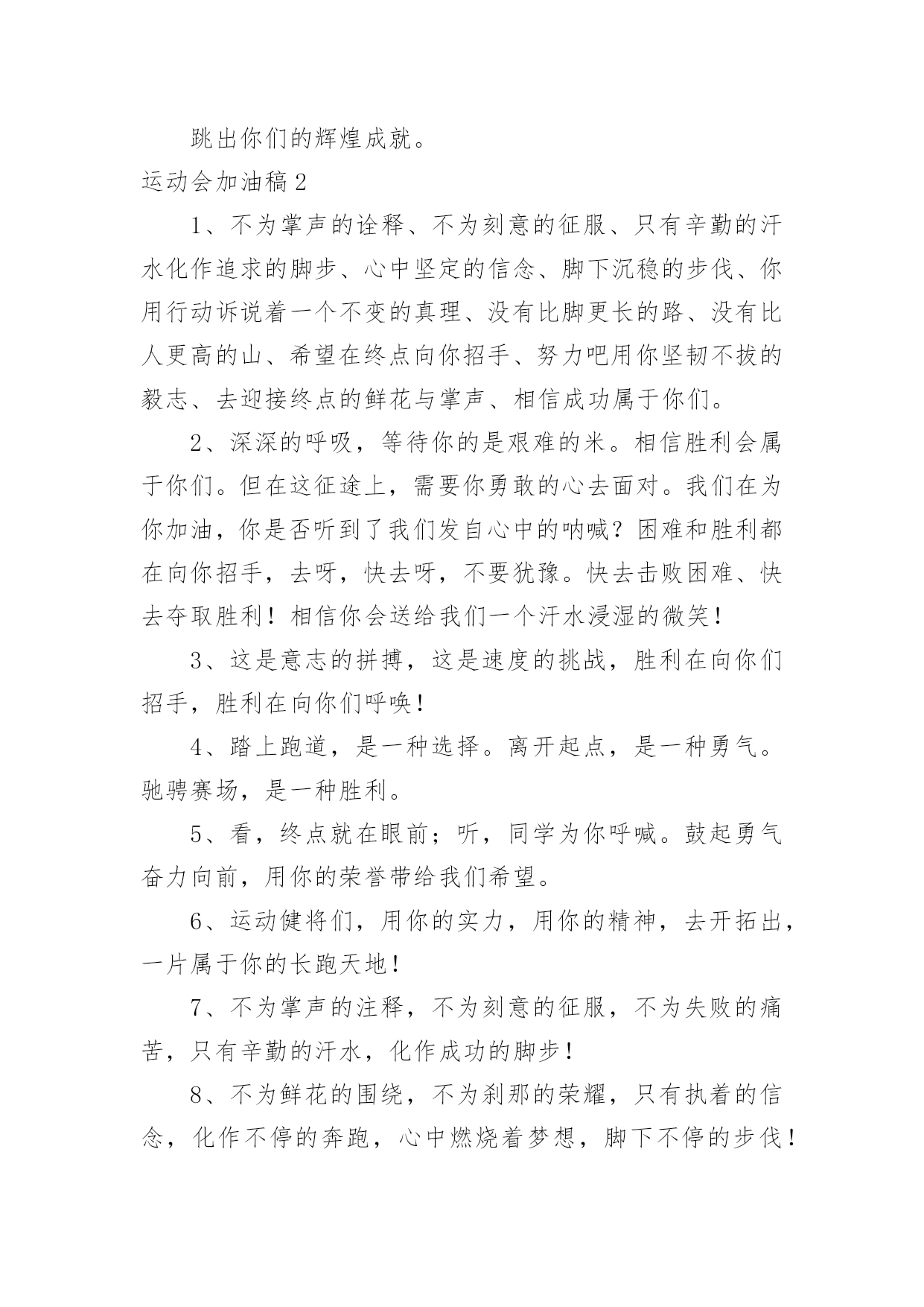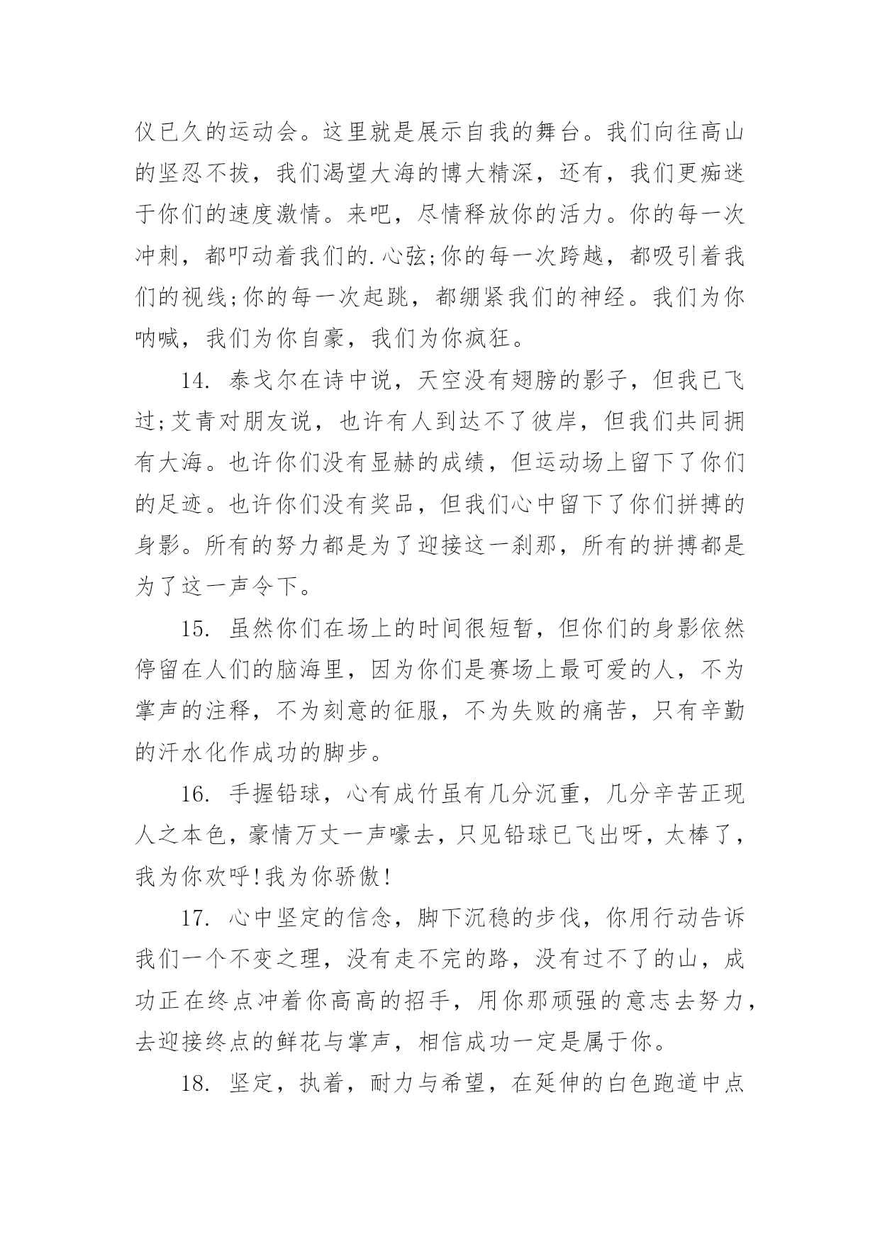运动会加油稿运动会加油稿在现在的社会生活中,用到加油稿的地方越来越多,借助加油稿往往可以提升对方的气势。你知道加油稿怎样才能写的好吗?以下是小编收集整理的运动会加油稿,供大家参考借鉴,希望可以帮助到有需要的朋友。运动会加油稿1大地属于你,蓝天属于你,在你一跃的瞬间,同时跃出了我们的希望。草儿欣赏你,白云欢迎你,身轻如燕,飞跃蓝天,奥林匹克精神在你身上体现,跳吧,跳出你的自信,跳出你的.顶尖,跳出你的胜利山颠。跳出你们的英姿飒爽;跳出你们的活力四射;跳出你们的无限激情;跳出你们的青春活力;跳出你们的辉煌成就。运动会加油稿21、不为掌声的诠释、不为刻意的征服、只有辛勤的汗水化作追求的脚步、心中坚定的信念、脚下沉稳的步伐、你用行动诉说着一个不变的真理、没有比脚更长的路、没有比人更高的山、希望在终点向你招手、努力吧用你坚韧不拔的毅志、去迎接终点的鲜花与掌声、相信成功属于你们。2、深深的呼吸,等待你的是艰难的米。相信胜利会属于你们。但在这征途上,需要你勇敢的心去面对。我们在为你加油,你是否听到了我们发自心中的呐喊?困难和胜利都在向你招手,去呀,快去呀,不要犹豫。快去击败困难、快去夺取胜利!相信你会送给我们一个汗水浸湿的微笑!3、这是意志的拼搏,这是速度的挑战,胜利在向你们招手,胜利在向你们呼唤!4、踏上跑道,是一种选择。离开起点,是一种勇气。驰骋赛场,是一种胜利。5、看,终点就在眼前;听,同学为你呼喊。鼓起勇气奋力向前,用你的荣誉带给我们希望。6、运动健将们,用你的实力,用你的精神,去开拓出,一片属于你的长跑天地!7、不为掌声的注释,不为刻意的征服,不为失败的痛苦,只有辛勤的汗水,化作成功的脚步!8、不为鲜花的围绕,不为刹那的荣耀,只有执着的信念,化作不停的奔跑,心中燃烧着梦想,脚下不停的步伐!9、你用行动述说着过程的重要,没有无尽的终点,没有无法攀登的险峰,希望载着终点在向你微笑,拼搏吧!经历是一种精彩,迸发你全部的能量,成功是你汗水的写照。10、你们挥舞着充满力量的双臂,看着实心球化成美丽的弧线,我着实在心里佩服你们,你们抛出了自己的最佳水平。11、环形的跑道一圈又一圈的坚持,毅力与精神活跃在会场上,湿透的衣衫,满头的大汗,无限追求、奋力追赶,我们为你欢呼跳跃,我们为你骄傲。12、朋友,在你走上跑道那一刻,告诉自己,无论成功与否,微笑着跑完全程,只要年轻的心还在不停地跳动,就要大声告诉自己——我无所畏惧。13、亲爱的运动健儿们,加油吧!洒一把艰辛的.汗水,继续抬起疲倦的脚步,爆发的一吼气贯长虹,继续向前,不论成功与否,你已曾经拥有。曾记否,在终点欢呼,震惊四周。14、无论成功与否,我们永远铭记这充满奋斗印记的阳光灿烂的日子15、无论你成功与否,刹那属于你。而你,一定属于永恒!16、只要你没有遗憾地奋斗了,你就不必失望,你的生命已放出了闪光!17、成功永远属于每一个勇敢者!18、我们为你呐喊,力量给你信心给你,因为我们知道那一步步的前进十分勇敢。我们为你呐喊,虽然显得火热,但却希望你能加油。19、你带来的,是拼搏的精神;你带走的,是悦耳的呐喊;你付出的,是淋漓的汗水;你收获的,是轰鸣的掌声。运动的盛会为你们而召开,观众的掌声为你们而拍响,雄壮的号角为你们而擂起,成功的花朵为你们而芳香!20、你是运动场的心脏,跳动梦想;你是漫长路的精神,激励辉煌;你们是将上下求索的人!风为你加油,云为你助兴,坚定,执着,耐力与希望,在延伸的白色跑道中点点凝聚!力量,信念,拼搏与奋斗,在遥远的终点线上渐渐明亮!时代的强音正在你的脚下踏响。21、拼搏者,你是赛场上最亮的点。在你的眼中,不在乎胜利的欢乐和失败的眼泪,完全只是为了展示生命跳跃的节拍。拼搏者,你是生命乐章中最响的音符。在你的心中,只有不停拼搏的信念,用自己坚实的步伐去迈开人生新的旅程。场上的拼搏者,你是我们永远的骄傲!运动会加油稿31.青春的脚步,青春的速度,青春的活力,青春的激情,将会在你们的身上尽情体现。迎接自我,挑战自我,战胜自我!我们相信你们一定能行,加油吧,运动员!终点就在眼前!2.温暖的阳光洒在赛场上,男子乙组标枪的比赛即将开始。赛场上,一道道优美的弧线将轻盈地划过天空。健儿们用手中的标枪向距离的权限发起一轮又一轮的挑战。标枪在空中轻盈的姿态,是健儿们强健的力量和熟练的技巧的结合。谁能在这场激烈的竞争中获胜?让我们拭目以待,让我们为他们呐喊、助威吧!只有将力量与技巧合二为一的人,才能获得胜利的桂冠!3.年轻的我们自信飞扬,青春的气息如同出生的朝阳,蓬勃的力量如同阳光的挥洒。此时此刻,跑道便是我们精彩的舞台,声声加油便是我们最高的奖项!论何成功,谈何荣辱,心中的信念只有一个:拼搏!萧瑟的秋风,挡不住你们破竹的锐气。4.不长不短的距离,需要的是全身心全程投入,自始至终你们都在拼全力此