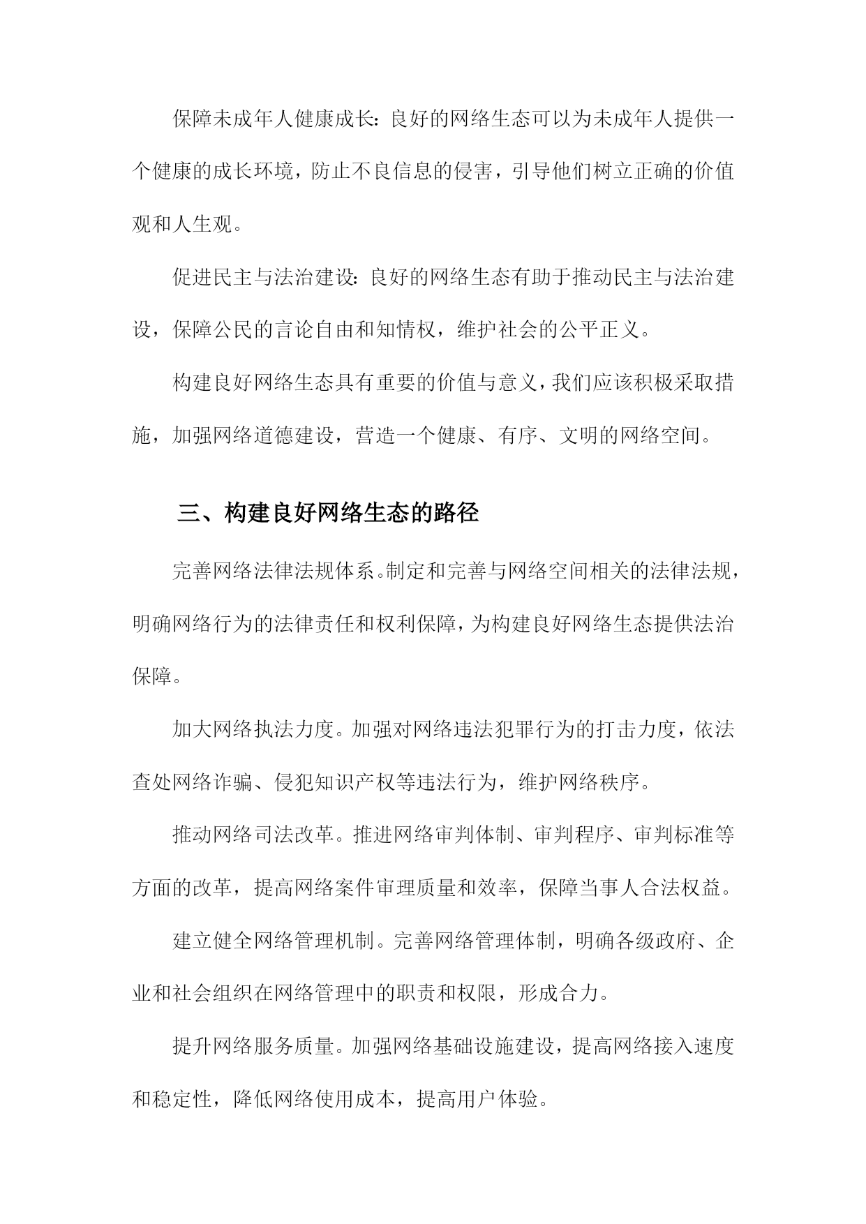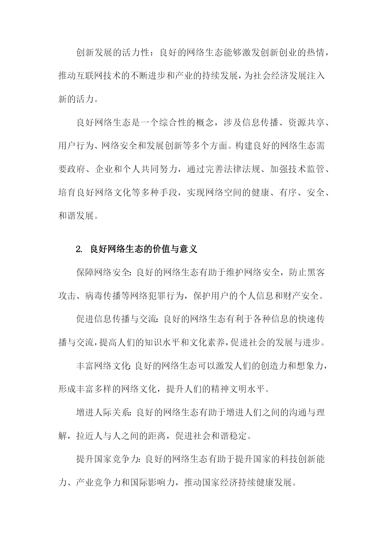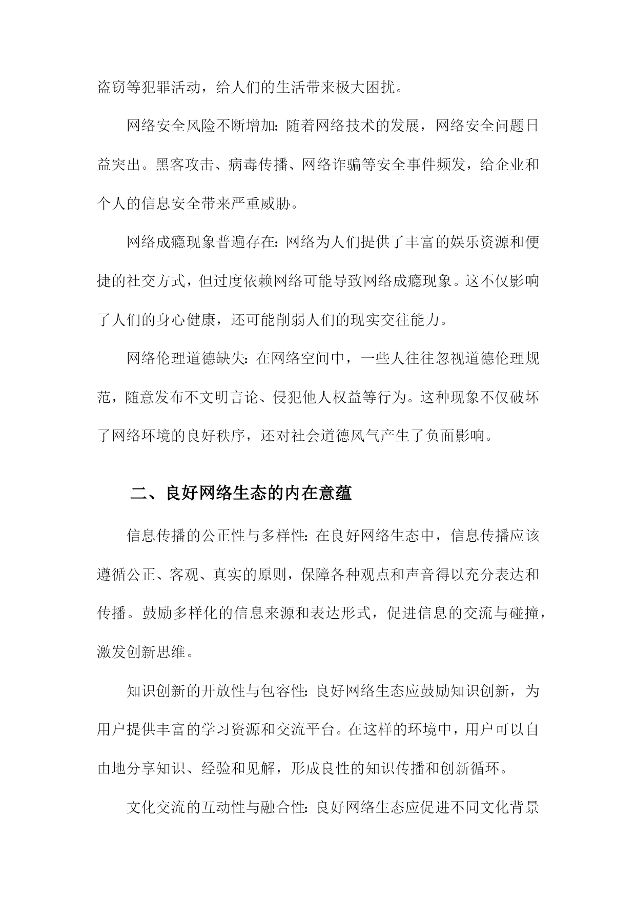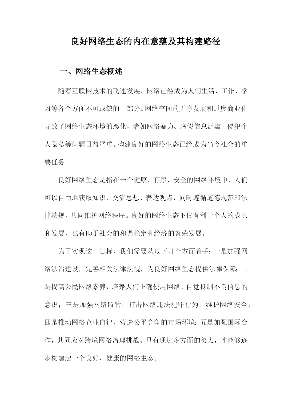 良好网络生态的内在意蕴及其构建路径一、网络生态概述随着互联网技术的飞速发展,网络已经成为人们生活、工作、学习等各个方面不可或缺的一部分。网络空间的无序发展和过度商业化导致了网络生态环境的恶化,诸如网络暴力、虚假信息泛滥、侵犯个人隐私等问题日益严重。构建良好的网络生态已经成为当今社会的重要任务。良好网络生态是指在一个健康、有序、安全的网络环境中,人们可以自由地获取知识、交流思想、表达观点,同时遵循道德规范和法律法规,共同维护网络秩序。良好的网络生态不仅有利于个人的成长和发展,也有助于社会的和谐稳定和经济的繁荣发展。为了实现这一目标,我们需要从以下几个方面着手:一是加强网络法治建设,完善相关法律法规,为良好网络生态提供法律保障;二是提高公民网络素养,培养人们正确使用网络、自觉抵制不良信息的意识;三是加强网络监管,打击网络违法犯罪行为,维护网络安全;四是推动网络企业自律,营造公平竞争的市场环境;五是加强国际合作,共同应对跨境网络治理挑战。只有通过多方面的努力,才能够逐步构建起一个良好、健康的网络生态。1.网络生态的概念和意义网络生态是指在网络空间中,由各种网络元素、组织和用户共同构成的一种生态系统。它包括了网络基础设施、网络服务、网络应用、网络信息资源以及与之相关的法律法规、政策、技术和管理等方面。网络生态的意义在于,它为人们提供了一个便捷、高效、安全的交流和合作平台,促进了信息的传播和共享,推动了社会的经济发展和科技创新。网络生态还具有一定的社会价值,如维护国家安全、保障公共利益、促进文化传承等。构建良好的网络生态对于实现可持续发展和社会和谐具有重要意义。2.当前网络生态存在的问题信息泛滥:随着互联网的普及,信息传播速度越来越快,但同时也导致了信息过载、虚假信息和谣言的泛滥。这不仅影响了人们的正常生活,还可能导致社会恐慌和不稳定。网络暴力现象严重:网络空间为人们提供了一个表达观点和情感的空间,但同时也容易滋生网络暴力、谩骂和人身攻击等不良行为。这些行为不仅损害了他人的权益,还可能对社会道德风气产生负面影响。隐私泄露问题突出:在网络环境中,人们的个人信息往往容易被泄露,导致隐私权受到侵犯。一些不法分子利用网络技术进行诈骗、盗窃等犯罪活动,给人们的生活带来极大困扰。网络安全风险不断增加:随着网络技术的发展,网络安全问题日益突出。黑客攻击、病毒传播、网络诈骗等安全事件频发,给企业和个人的信息安全带来严重威胁。网络成瘾现象普遍存在:网络为人们提供了丰富的娱乐资源和便捷的社交方式,但过度依赖网络可能导致网络成瘾现象。这不仅影响了人们的身心健康,还可能削弱人们的现实交往能力。网络伦理道德缺失:在网络空间中,一些人往往忽视道德伦理规范,随意发布不文明言论、侵犯他人权益等行为。这种现象不仅破坏了网络环境的良好秩序,还对社会道德风气产生了负面影响。二、良好网络生态的内在意蕴信息传播的公正性与多样性:在良好网络生态中,信息传播应该遵循公正、客观、真实的原则,保障各种观点和声音得以充分表达和传播。鼓励多样化的信息来源和表达形式,促进信息的交流与碰撞,激发创新思维。知识创新的开放性与包容性:良好网络生态应鼓励知识创新,为用户提供丰富的学习资源和交流平台。在这样的环境中,用户可以自由地分享知识、经验和见解,形成良性的知识传播和创新循环。文化交流的互动性与融合性:良好网络生态应促进不同文化背景的人们进行深入的交流与互动,增进相互了解和尊重。在这个过程中,各种文化元素可以相互融合,形成更加丰富多彩的网络文化景观。价值观念传承的引导性与塑造性:良好网络生态应承担起价值观念传承的责任,引导用户树立正确的世界观、人生观和价值观。通过网络平台,传播正能量,弘扬社会主义核心价值观,为构建和谐社会提供有力支撑。网络安全的保障性与可持续性:良好网络生态应注重网络安全,保障用户的隐私权和信息安全。要实现网络生态的可持续发展,平衡经济利益与社会责任,确保网络空间的长远繁荣。1.良好网络生态的内涵特征信息传播的高效性:良好的网络生态能够实现信息的快速、准确、全面传播,满足用户多样化的信息需求,提高信息利用效率。资源共享的便捷性:良好的网络生态能够实现各类网络资源的有效整合和共享,为用户提供便捷的资源获取途径,促进资源的合理利用和创新。用户行为的自律性:良好的网络生态要求用户遵守网络道德规范,自觉抵制不良信息,积极参与网络公共事务,共同维护网络秩序。网络安全的保障性:良好的网络生态能够确保网络运行的安全稳定,防范网络攻击和病毒侵袭,保护用户的隐私和数据安全。创新发展的活力性:良好的网络生态能够激发创新创业的热情,推动互联网技术的不断进步和产业的持续发展,为社会经济发展注入新的活力。良好网络生态是一个综合性的概念,涉及信息传播、资源