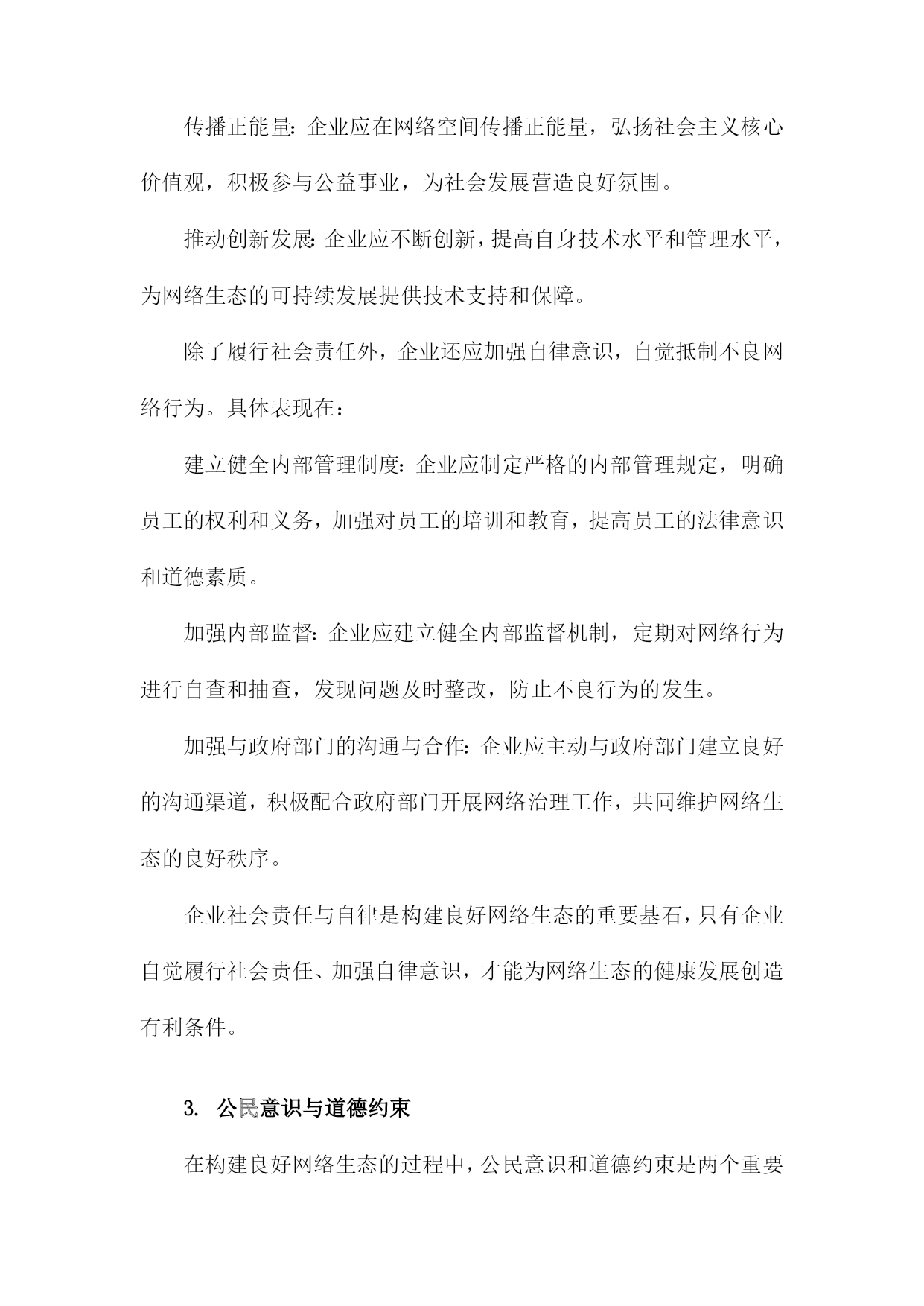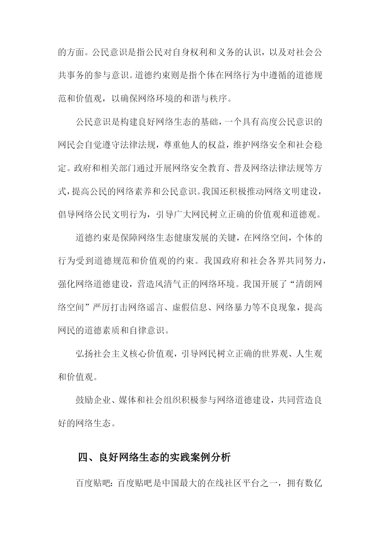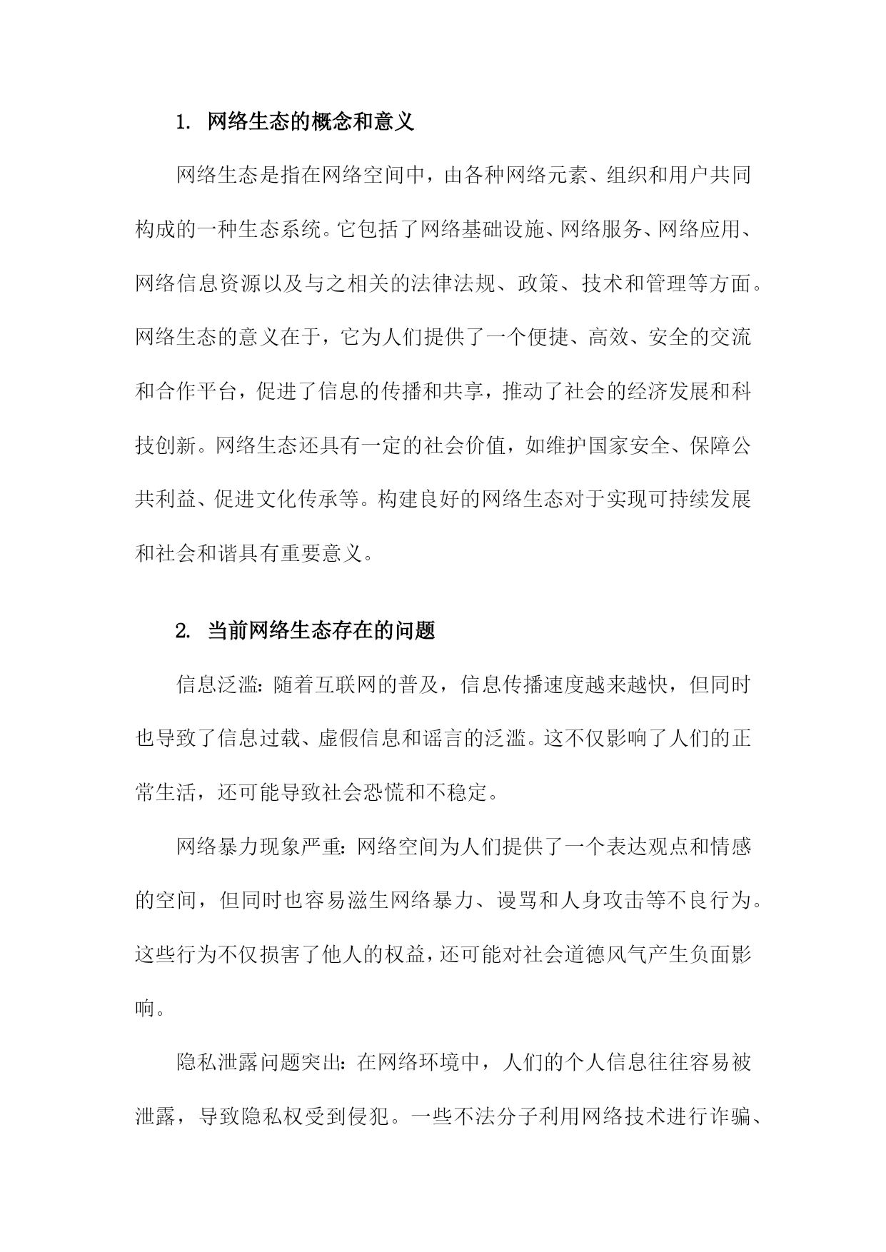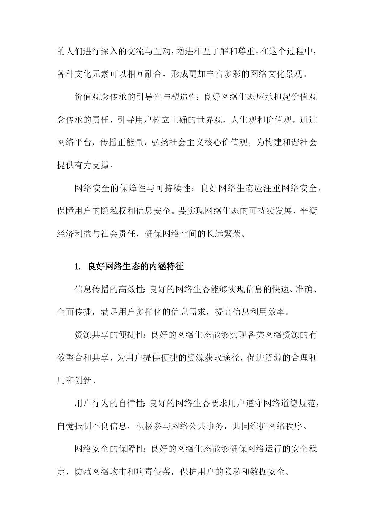 良好网络生态的内在意蕴及其构建路径一、网络生态概述随着互联网技术的飞速发展,网络已经成为人们生活、工作、学习等各个方面不可或缺的一部分。网络空间的无序发展和过度商业化导致了网络生态环境的恶化,诸如网络暴力、虚假信息泛滥、侵犯个人隐私等问题日益严重。构建良好的网络生态已经成为当今社会的重要任务。良好网络生态是指在一个健康、有序、安全的网络环境中,人们可以自由地获取知识、交流思想、表达观点,同时遵循道德规范和法律法规,共同维护网络秩序。良好的网络生态不仅有利于个人的成长和发展,也有助于社会的和谐稳定和经济的繁荣发展。为了实现这一目标,我们需要从以下几个方面着手:一是加强网络法治建设,完善相关法律法规,为良好网络生态提供法律保障;二是提高公民网络素养,培养人们正确使用网络、自觉抵制不良信息的意识;三是加强网络监管,打击网络违法犯罪行为,维护网络安全;四是推动网络企业自律,营造公平竞争的市场环境;五是加强国际合作,共同应对跨境网络治理挑战。只有通过多方面的努力,才能够逐步构建起一个良好、健康的网络生态。1.网络生态的概念和意义网络生态是指在网络空间中,由各种网络元素、组织和用户共同构成的一种生态系统。它包括了网络基础设施、网络服务、网络应用、网络信息资源以及与之相关的法律法规、政策、技术和管理等方面。网络生态的意义在于,它为人们提供了一个便捷、高效、安全的交流和合作平台,促进了信息的传播和共享,推动了社会的经济发展和科技创新。网络生态还具有一定的社会价值,如维护国家安全、保障公共利益、促进文化传承等。构建良好的网络生态对于实现可持续发展和社会和谐具有重要意义。2.当前网络生态存在的问题信息泛滥:随着互联网的普及,信息传播速度越来越快,但同时也导致了信息过载、虚假信息和谣言的泛滥。这不仅影响了人们的正常生活,还可能导致社会恐慌和不稳定。网络暴力现象严重:网络空间为人们提供了一个表达观点和情感的空间,但同时也容易滋生网络暴力、谩骂和人身攻击等不良行为。这些行为不仅损害了他人的权益,还可能对社会道德风气产生负面影响。隐私泄露问题突出:在网络环境中,人们的个人信息往往容易被泄露,导致隐私权受到侵犯。一些不法分子利用网络技术进行诈骗、盗窃等犯罪活动,给人们的生活带来极大困扰。网络安全风险不断增加:随着网络技术的发展,网络安全问题日益突出。黑客攻击、病毒传播、网络诈骗等安全事件频发,给企业和个人的信息安全带来严重威胁。网络成瘾现象普遍存在:网络为人们提供了丰富的娱乐资源和便捷的社交方式,但过度依赖网络可能导致网络成瘾现象。这不仅影响了人们的身心健康,还可能削弱人们的现实交往能力。网络伦理道德缺失:在网络空间中,一些人往往忽视道德伦理规范,随意发布不文明言论、侵犯他人权益等行为。这种现象不仅破坏了网络环境的良好秩序,还对社会道德风气产生了负面影响。二、良好网络生态的内在意蕴信息传播的公正性与多样性:在良好网络生态中,信息传播应该遵循公正、客观、真实的原则,保障各种观点和声音得以充分表达和传播。鼓励多样化的信息来源和表达形式,促进信息的交流与碰撞,激发创新思维。知识创新的开放性与包容性:良好网络生态应鼓励知识创新,为用户提供丰富的学习资源和交流平台。在这样的环境中,用户可以自由地分享知识、经验和见解,形成良性的知识传播和创新循环。文化交流的互动性与融合性:良好网络生态应促进不同文化背景的人们进行深入的交流与互动,增进相互了解和尊重。在这个过程中,各种文化元素可以相互融合,形成更加丰富多彩的网络文化景观。价值观念传承的引导性与塑造性:良好网络生态应承担起价值观念传承的责任,引导用户树立正确的世界观、人生观和价值观。通过网络平台,传播正能量,弘扬社会主义核心价值观,为构建和谐社会提供有力支撑。网络安全的保障性与可持续性:良好网络生态应注重网络安全,保障用户的隐私权和信息安全。要实现网络生态的可持续发展,平衡经济利益与社会责任,确保网络空间的长远繁荣。1.良好网络生态的内涵特征信息传播的高效性:良好的网络生态能够实现信息的快速、准确、全面传播,满足用户多样化的信息需求,提高信息利用效率。资源共享的便捷性:良好的网络生态能够实现各类网络资源的有效整合和共享,为用户提供便捷的资源获取途径,促进资源的合理利用和创新。用户行为的自律性:良好的网络生态要求用户遵守网络道德规范,自觉抵制不良信息,积极参与网络公共事务,共同维护网络秩序。网络安全的保障性:良好的网络生态能够确保网络运行的安全稳定,防范网络攻击和病毒侵袭,保护用户的隐私和数据安全。创新发展的活力性:良好的网络生态能够激发创新创业的热情,推动互联网技术的不断进步和产业的持续发展,为社会经济发展注入新的活力。良好网络生态是一个综合性的概念,涉及信息传播、资源