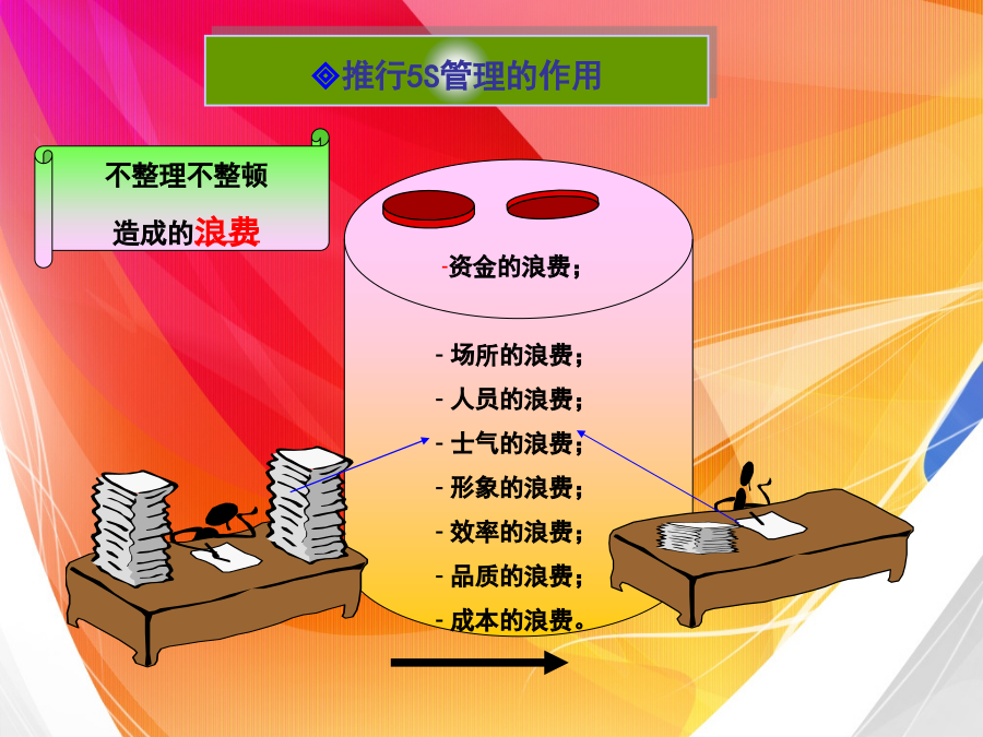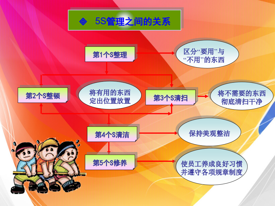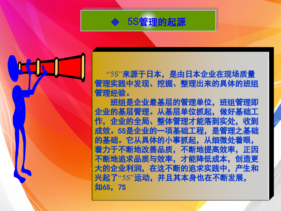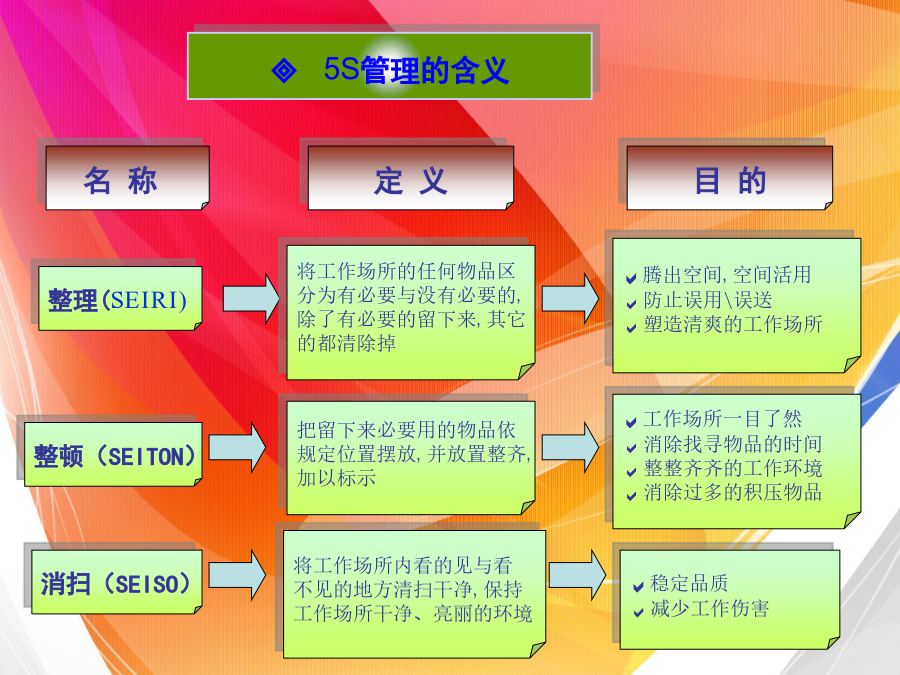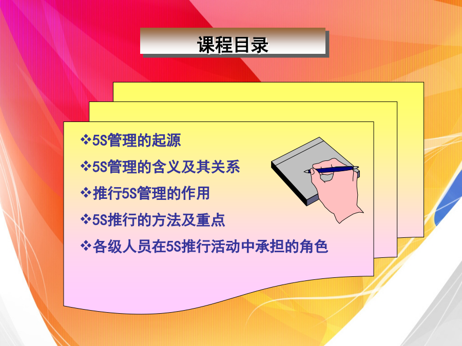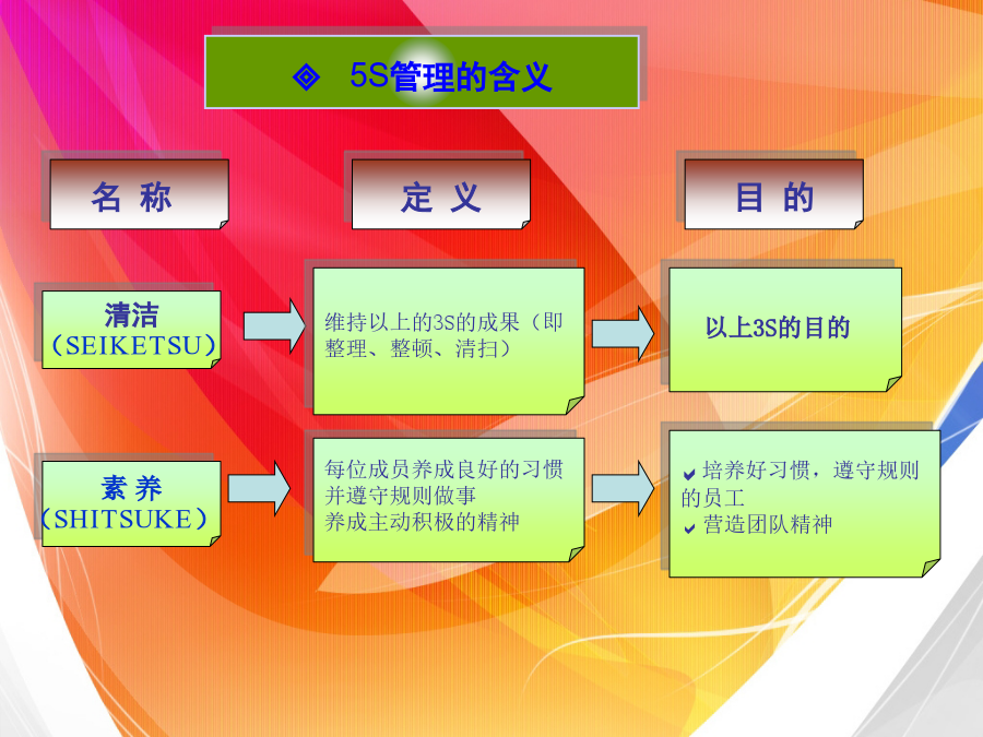 5S现场管理培训教程课程目的课程目录5S管理的起源5S管理的含义5S管理的含义5S管理之间的关系推行5S管理的作用推行5S管理的作用推行5S管理的作用推行5S管理的作用5S推行的方法及重点物品整备5W2H方法的运用员工及管理人员在5S活动中的责任员工及管理人员在5S活动中的责任总结总结谢谢大家!
