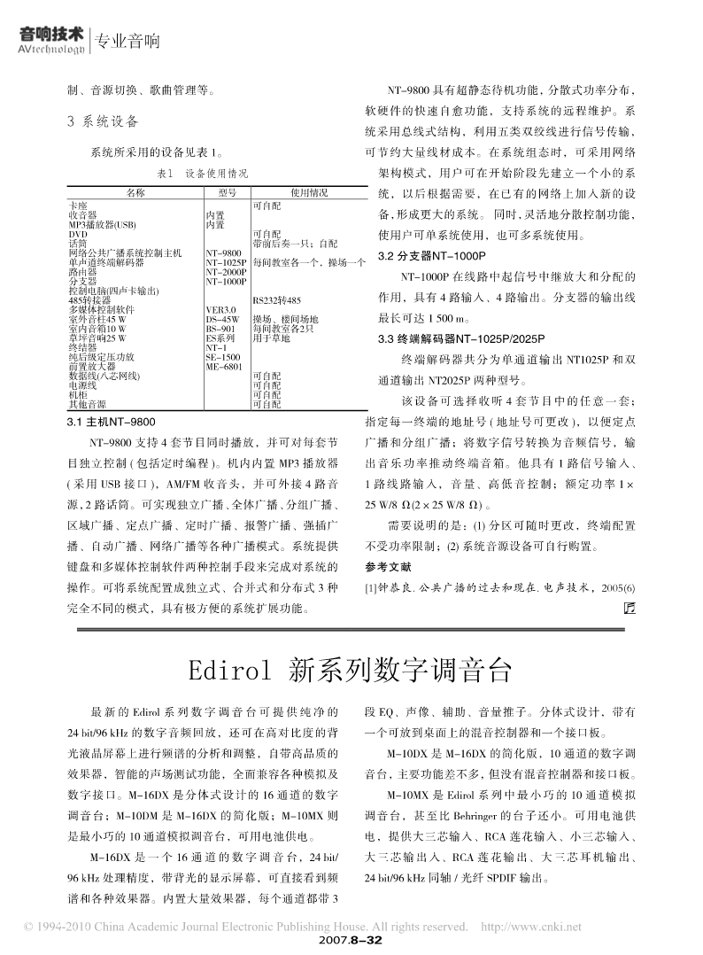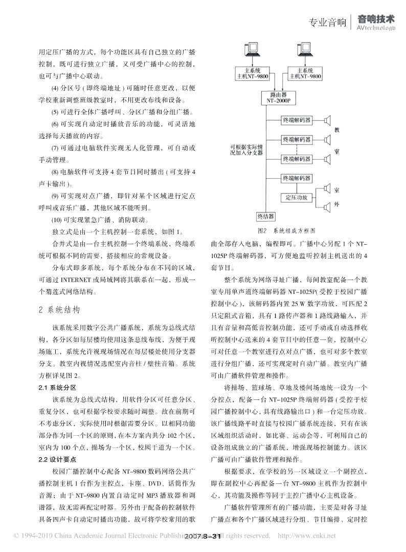 专业音响专业音响可寻址的数字公共广播系统[摘要]将公共广播系统置于智能化管理有多种类型。文中以一实例介绍可寻址的数字公共广播系统,从系统工程要求、系统结构、系统设备几方面具体介绍系统的智能化管理。[关键词]公共广播系统寻址终端分区马洪斌公共广播系统从小规模简单化到现在的数字化,终端解码器组成。当需要多主机和多系统时,使用专目前具有智能化管理、分区控制、分区强插、报警矩用路由器组成网络,可在网络内的任何位置实现对系阵、分区寻呼、电话接口及主/备功放切换、应急电统的广播和控制。源的功能。将整个公共广播系统置于智能化管理[1],如图1所示,公共广播系统中的每个终端由一台大致有以下几种类型。(1)由通用计算机管理。系统解码器和音箱组成,只要增加设备的数量就可方便地中的其他环节仍由常规设备组成,只是添加了计算机增大网络容量。同时,视系统的大小和对系统的具体接口,由“数据路由器”以其数据链接传统系统各环节,要求,可将其配置成独立式、合并式和分布式3种完建立起计算机对整个广播系统的监控通道。(2)由专全不同的模式。具有系统组成简单,可控性好,终端用计算机管理。由一台专用计算机主机虚拟了系统中扩展性强,线路简洁的优势,尤其性价比极高,非常除功放以外的所有环节,直接在主机屏幕上操作。(3)适合校园教学广播系统和智能化小区管理等用途。可寻址广播系统。所有广播终端都挂接在同一条广播1系统要求总线上,各终端的开通和关闭由寻址中心操作,可手动也可编程。系统总线可使用5类线或光纤,布线简(1)各区域(包括每间教室)都可同时播放4套不单,而且由于传输的不是模拟信号,传输损耗小,覆同的音乐内容,以方便学校不同的年级同时进行英语盖范围大。(4)网络化广播系统,又分为使用CobraNet听力考试。协议的媒体矩阵和可同TCP/IP协议兼容的公共广播(2)每间教室可组成一个小的独立扩音系统,并网[1]两种方式。且可和整个大系统联动,以方便老师使用传声器和线这里介绍的公共广播系统属于“可寻址广播系路输入讲课。统”。系统由数字网络公共广播系统控制主机、分支器、(3)将操场、校园干道分别设为两个分控点,采图1可寻址的公共广播系统2007.2007.8-308-31专业音响专业音响专业音响用定压广播的方式,每个功能区具有自己独立的广播控制,既可进行独立广播,又可受广播中心的控制,也可与广播中心联动。(4)分区号(即终端地址)可随时任意更改,以便学校重新调整班级教室时,不用更改布线和设备。(5)可进行全体广播呼叫、分区广播和分组广播。(6)可实现自动定时播放音乐的功能,可灵活地选择每天播放的内容。(7)可通过电脑软件实现无人化管理,可自动或手动管理。(8)电脑软件可支持4套节目同时播出(可支持4声卡输出)。(9)可实现对点广播,即针对某个区域进行定点呼叫或音乐广播,其他区域不能听到。(10)可实现紧急广播、消防联动。图2系统组成方框图独立式是由一个主机控制一套系统,如图1。合并式是由一台主机控制一个终端系统,终端系曲全部存入电脑,编程即可。广播中心另配1个NT-统可根据不同的需要,搭接相应的常规设备。1025P终端解码器,可方便地监听控制主机送出的4分布式即多系统,每个系统分布在不同的区域,套节目。可通过INTERNET或局域网将其联系在一起,形成一整个系统为网络寻址广播,每间教室配备一个教个菊莲式网络结构。室专用单声道终端解码器NT-1025P(受控于校园广播控制中心),该解码器内置25 W数字功放,可匹配22系统结构只定阻式音箱,具有1路传声器和1路线路输入,并该系统采用数字公共广播系统,系统为总线式结且有音量和高低音控制功能,还可手动或自动选择收构,各分区如每层楼均使用这条总线布线,为便于现听控制中心送来的4套节目中的任意一套,控制中心场施工,系统允许视现场情况在每层楼处使用分支器可对任意一个教室进行点对点广播,也可对多个教室分支。教室内视情况选配室内音柱/壁挂音箱。系统进行分组广播,还可实现定时自动广播。教室内广播方框详见图2。可由广播软件管理和操作。2.1系统分区将操场、篮球场、草地及楼间场地统一设为一个该系统为总线式结构,用软件分区可任意分区、分控点,配备一台NT-1025P终端解码器(受控于校重复分区,也可根据学校要求随时调整。故在前期可园广播控制中心,具有线路输出口)和一台定压功放。不考虑分区,实际使用时根据需要分区。以相同功能该广播线路平时直接与校园广播系统连接,只有在该部分作为同一个区的原则,在本方案内共分102个区,区域组织活动时,如比赛、运动会等,可利用自己的室内为100个点,操场为一个区,校园干道为一个