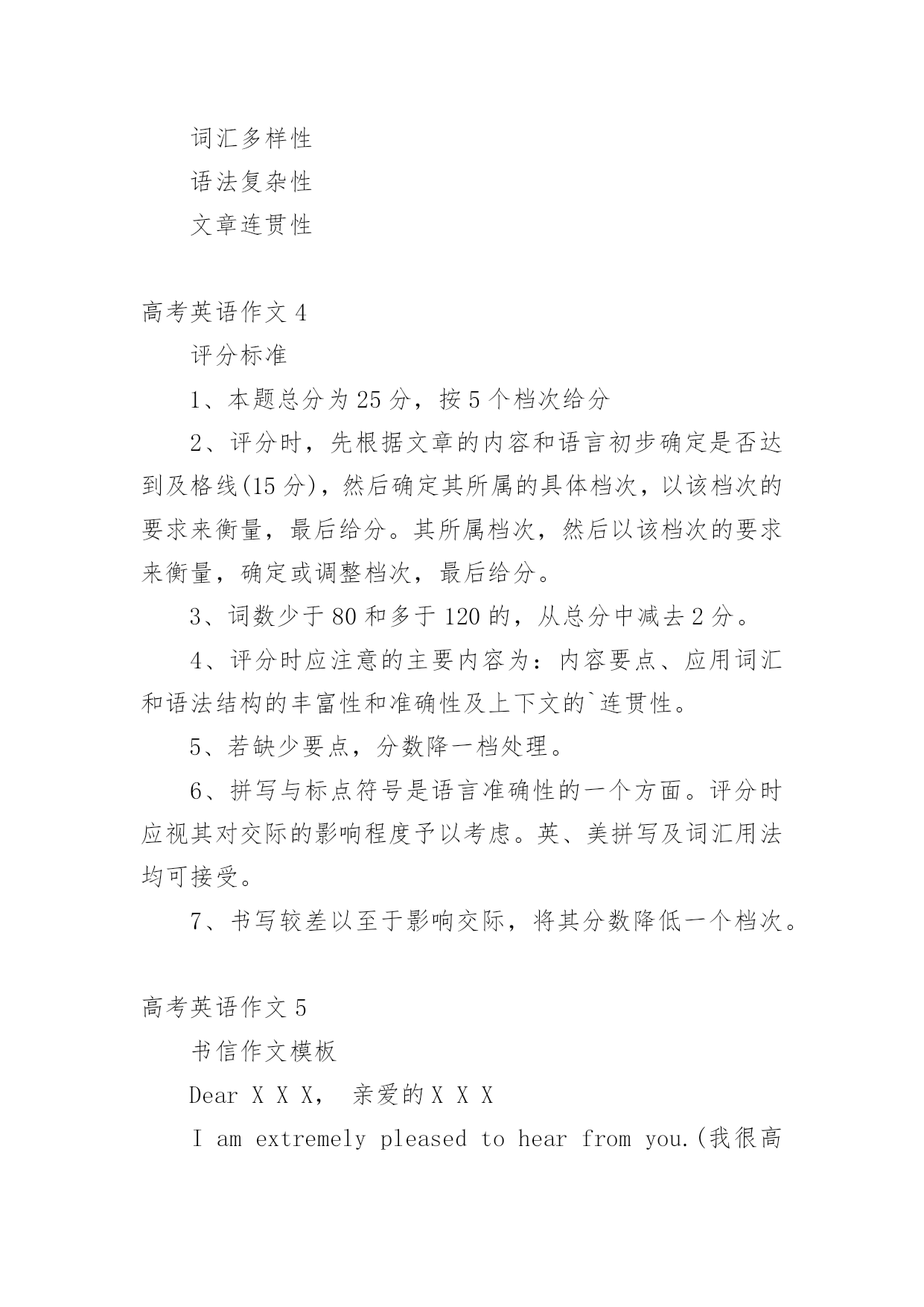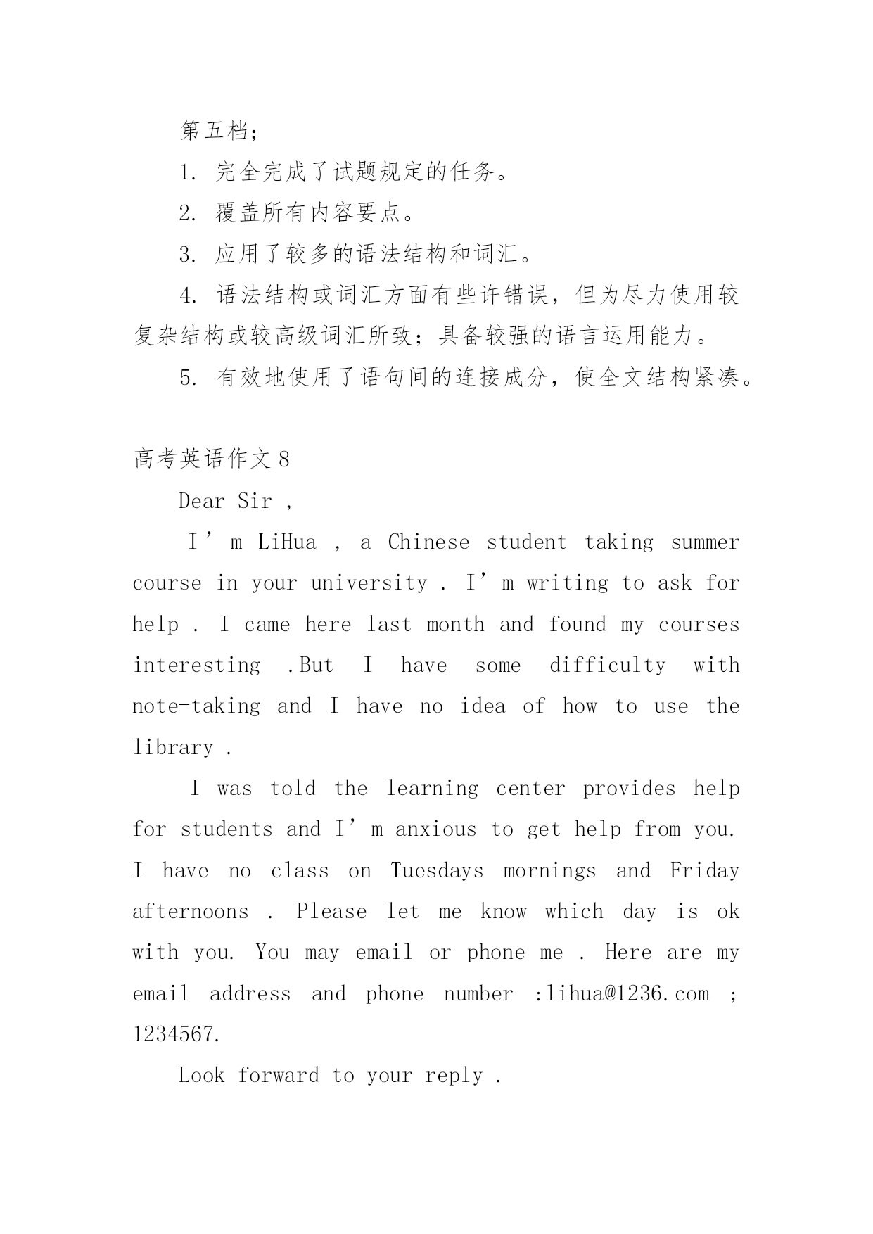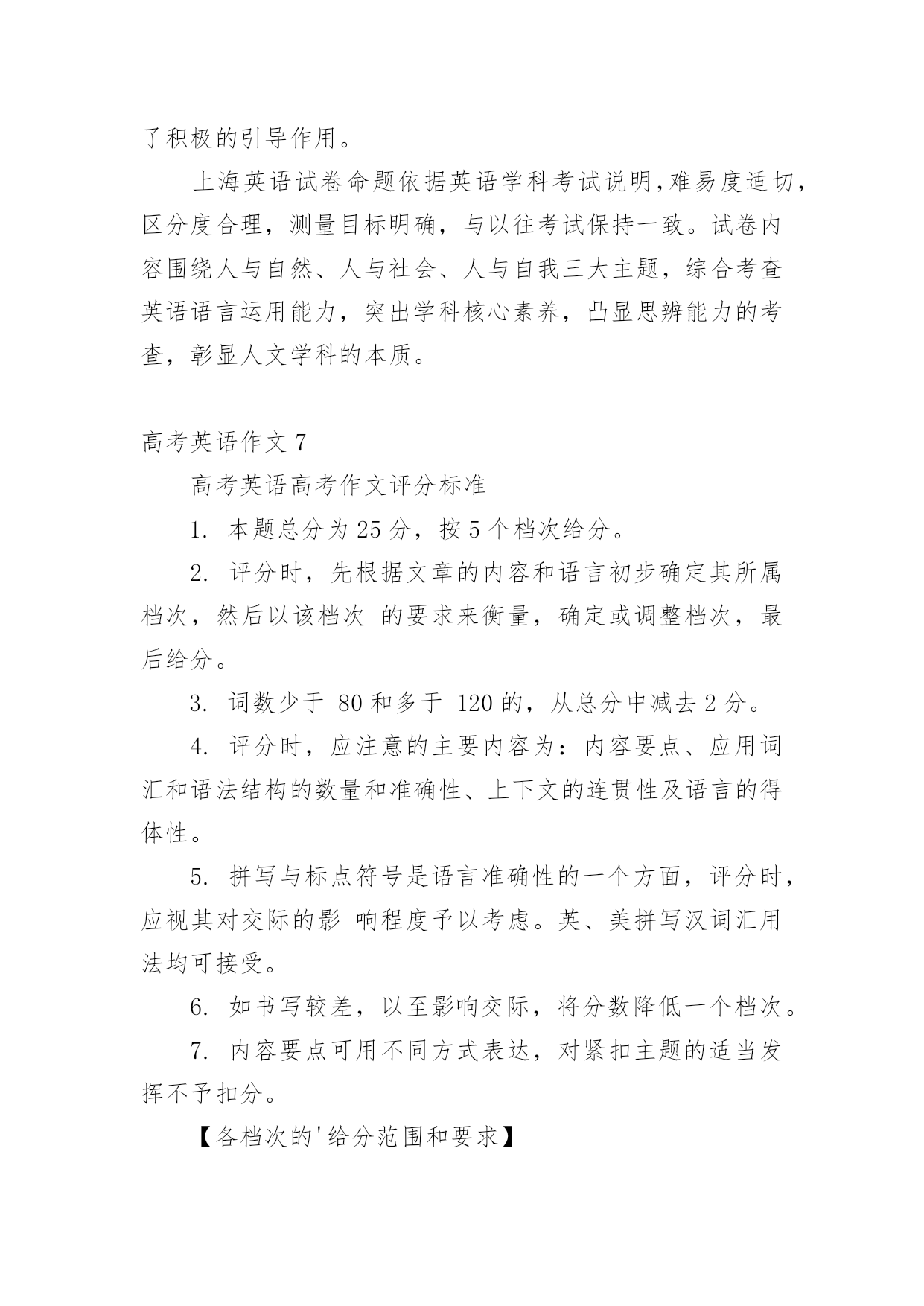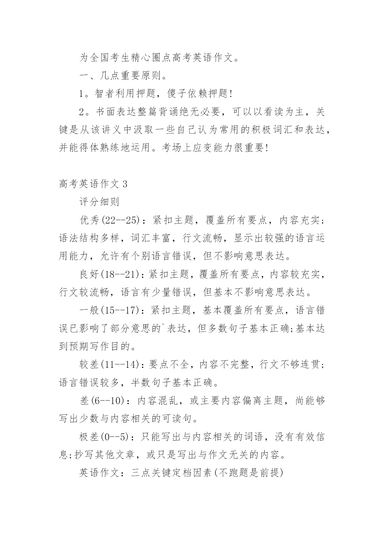 高考英语作文高考英语作文10篇无论是在学校还是在社会中,大家都有写作文的经历,对作文很是熟悉吧,根据写作命题的特点,作文可以分为命题作文和非命题作文。怎么写作文才能避免踩雷呢?以下是小编整理的高考英语作文,仅供参考,欢迎大家阅读。高考英语作文1每个星期二和星期五晚上看到李小姐,一天的辛苦工作之后,我的邻居,在一个公司赶回家,一个秘书,吞下她吃饭然后赶紧去车上她的英语课。李小姐的情况并非独特,现在越来越多的城市成年人度过他们的业余时间,试图提高自己在学校或学院。有很多理由可以为他们的教育。有些人,如李小姐,都在做这件事来获得另一个学位或文凭来给社会留下深刻印象。对他们更多的知识,或者说,更多的证书意味着更多的机会,更好的工作和更快的晋升。其他人,特别是下岗或失业的人去职业学校,准备回到就业市场。他们渴望新的技能,使他们能够胜任在零售行业,管理,教育和其他服务类的工作,他们是奇怪的',因为他们大多是蓝领工人在工厂。也有人前来参加中国传统医学、绘画、书法、摄影等课程。当他们工作周的时候,人们开始有时间来满足他们对他们内心的渴望的梦想。出于必要或出于兴趣,人们为了共同的目标去上学,为了提高自己,而这一热潮在成人教育,反过来,有助于提高整个国家的智力水平。高考英语作文2综观全国各地试卷结构,高考英语作文是分值仅次于阅读,是英语考试的`重头戏之一,而且非常适合考前集中突破。高考英语作文题目历来都是情理之中,意料之外。情理之中,是说高考英语写作永远都是学生话题、现实生活话题,也就是全体考生不论理科文科、男生女生、城市农村、应届往届,都会同样地有话可讲。意料之外,是说高考英语作文题目经常与考生直接关心的社会热点话题无直接联系,但仔细琢磨,又会发现一些联系,就是说热点归热点,关键找角度。例如,经济危机是当前热点,温总理也总在讲信心比黄金更重要,可是怎样变成高考英语作文题?命题专家完全可以根据如下要点提纲命制这样一个题目:1、生活中困难不可避免,面对困难需要信心2、试举一例说明信心在学习方面的作用3、你对困难的态度根据这种思路,五位高考英语学科专家结合六个话题,在高考最后时刻,为全国考生精心圈点高考英语作文。一、几点重要原则。1。智者利用押题,傻子依赖押题!2。书面表达整篇背诵绝无必要,可以以看读为主,关键是从该讲义中汲取一些自己认为常用的积极词汇和表达,并能得体熟练地运用。考场上应变能力很重要!高考英语作文3评分细则优秀(22--25):紧扣主题,覆盖所有要点,内容充实;语法结构多样,词汇丰富,行文流畅,显示出较强的语言运用能力,允许有个别语言错误,但不影响意思表达。良好(18--21):紧扣主题,覆盖所有要点,内容较充实,行文较流畅,语言有少量错误,但基本不影响意思表达。一般(15--17):紧扣主题,基本覆盖所有要点,语言错误已影响了部分意思的`表达,但多数句子基本正确;基本达到预期写作目的。较差(11--14):要点不全,内容不完整,行文不够连贯;语言错误较多,半数句子基本正确。差(6--10):内容混乱,或主要内容偏离主题,尚能够写出少数与内容相关的可读句。极差(0--5):只能写出与内容相关的词语,没有有效信息;抄写其他文章,或只是写出与作文无关的内容。英语作文:三点关键定档因素(不跑题是前提)词汇多样性语法复杂性文章连贯性高考英语作文4评分标准1、本题总分为25分,按5个档次给分2、评分时,先根据文章的内容和语言初步确定是否达到及格线(15分),然后确定其所属的具体档次,以该档次的要求来衡量,最后给分。其所属档次,然后以该档次的要求来衡量,确定或调整档次,最后给分。3、词数少于80和多于120的,从总分中减去2分。4、评分时应注意的主要内容为:内容要点、应用词汇和语法结构的丰富性和准确性及上下文的`连贯性。5、若缺少要点,分数降一档处理。6、拼写与标点符号是语言准确性的一个方面。评分时应视其对交际的影响程度予以考虑。英、美拼写及词汇用法均可接受。7、书写较差以至于影响交际,将其分数降低一个档次。高考英语作文5书信作文模板DearXXX,亲爱的XXXIamextremelypleasedtohearfromyou.(我很高兴收到你的`来信)AndIwouldliketowritealettertotellyouthat_____.(我很高兴写封信告诉你。。。)Iwillgreatlyappreciatearesponsefromyouatyourearliestconvenience/Iamlookingf0rwardtoyourrepliesatyourearliestconvenience.(我希望你可以在空闲的时候尽快给我回信)Bestregardsforyourhealthandsuccess.祝你身体健康万事如意Sinc