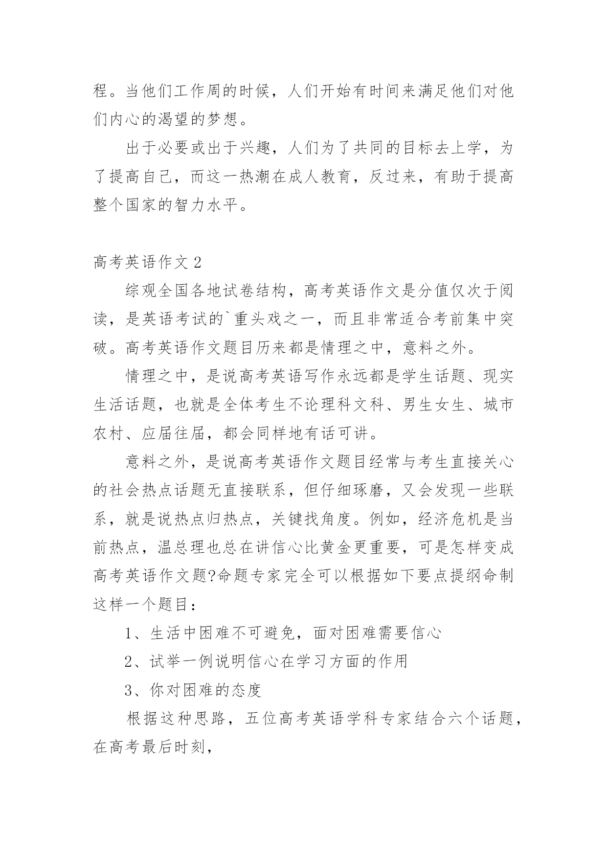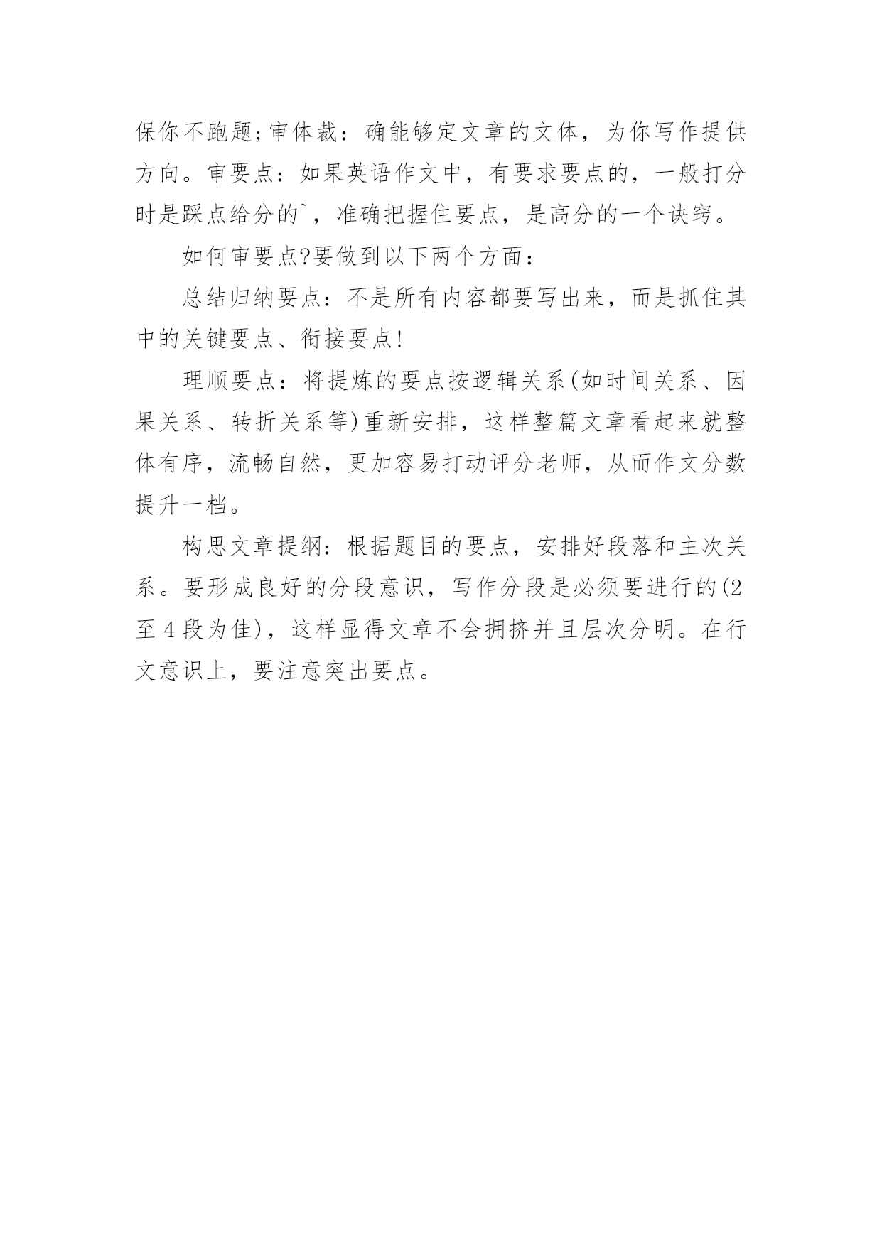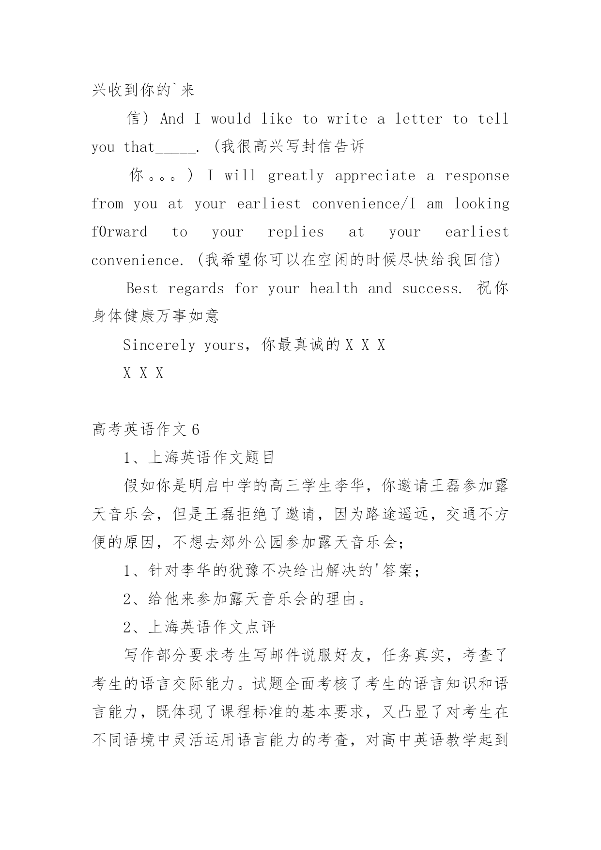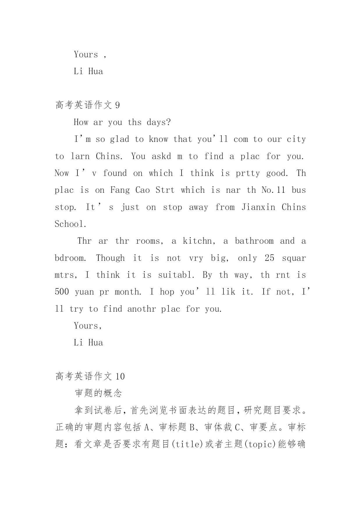 高考英语作文高考英语作文10篇无论是在学校还是在社会中,大家都有写作文的经历,对作文很是熟悉吧,根据写作命题的特点,作文可以分为命题作文和非命题作文。怎么写作文才能避免踩雷呢?以下是小编整理的高考英语作文,仅供参考,欢迎大家阅读。高考英语作文1每个星期二和星期五晚上看到李小姐,一天的辛苦工作之后,我的邻居,在一个公司赶回家,一个秘书,吞下她吃饭然后赶紧去车上她的英语课。李小姐的情况并非独特,现在越来越多的城市成年人度过他们的业余时间,试图提高自己在学校或学院。有很多理由可以为他们的教育。有些人,如李小姐,都在做这件事来获得另一个学位或文凭来给社会留下深刻印象。对他们更多的知识,或者说,更多的证书意味着更多的机会,更好的工作和更快的晋升。其他人,特别是下岗或失业的人去职业学校,准备回到就业市场。他们渴望新的技能,使他们能够胜任在零售行业,管理,教育和其他服务类的工作,他们是奇怪的',因为他们大多是蓝领工人在工厂。也有人前来参加中国传统医学、绘画、书法、摄影等课程。当他们工作周的时候,人们开始有时间来满足他们对他们内心的渴望的梦想。出于必要或出于兴趣,人们为了共同的目标去上学,为了提高自己,而这一热潮在成人教育,反过来,有助于提高整个国家的智力水平。高考英语作文2综观全国各地试卷结构,高考英语作文是分值仅次于阅读,是英语考试的`重头戏之一,而且非常适合考前集中突破。高考英语作文题目历来都是情理之中,意料之外。情理之中,是说高考英语写作永远都是学生话题、现实生活话题,也就是全体考生不论理科文科、男生女生、城市农村、应届往届,都会同样地有话可讲。意料之外,是说高考英语作文题目经常与考生直接关心的社会热点话题无直接联系,但仔细琢磨,又会发现一些联系,就是说热点归热点,关键找角度。例如,经济危机是当前热点,温总理也总在讲信心比黄金更重要,可是怎样变成高考英语作文题?命题专家完全可以根据如下要点提纲命制这样一个题目:1、生活中困难不可避免,面对困难需要信心2、试举一例说明信心在学习方面的作用3、你对困难的态度根据这种思路,五位高考英语学科专家结合六个话题,在高考最后时刻,为全国考生精心圈点高考英语作文。一、几点重要原则。1。智者利用押题,傻子依赖押题!2。书面表达整篇背诵绝无必要,可以以看读为主,关键是从该讲义中汲取一些自己认为常用的积极词汇和表达,并能得体熟练地运用。考场上应变能力很重要!高考英语作文3评分细则优秀(22--25):紧扣主题,覆盖所有要点,内容充实;语法结构多样,词汇丰富,行文流畅,显示出较强的语言运用能力,允许有个别语言错误,但不影响意思表达。良好(18--21):紧扣主题,覆盖所有要点,内容较充实,行文较流畅,语言有少量错误,但基本不影响意思表达。一般(15--17):紧扣主题,基本覆盖所有要点,语言错误已影响了部分意思的`表达,但多数句子基本正确;基本达到预期写作目的。较差(11--14):要点不全,内容不完整,行文不够连贯;语言错误较多,半数句子基本正确。差(6--10):内容混乱,或主要内容偏离主题,尚能够写出少数与内容相关的可读句。极差(0--5):只能写出与内容相关的词语,没有有效信息;抄写其他文章,或只是写出与作文无关的内容。英语作文:三点关键定档因素(不跑题是前提)词汇多样性语法复杂性文章连贯性高考英语作文4评分标准1、本题总分为25分,按5个档次给分2、评分时,先根据文章的内容和语言初步确定是否达到及格线(15分),然后确定其所属的具体档次,以该档次的要求来衡量,最后给分。其所属档次,然后以该档次的要求来衡量,确定或调整档次,最后给分。3、词数少于80和多于120的,从总分中减去2分。4、评分时应注意的主要内容为:内容要点、应用词汇和语法结构的丰富性和准确性及上下文的`连贯性。5、若缺少要点,分数降一档处理。6、拼写与标点符号是语言准确性的一个方面。评分时应视其对交际的影响程度予以考虑。英、美拼写及词汇用法均可接受。7、书写较差以至于影响交际,将其分数降低一个档次。高考英语作文5书信作文模板DearXXX,亲爱的XXXIamextremelypleasedtohearfromyou.(我很高兴收到你的`来信)AndIwouldliketowritealettertotellyouthat_____.(我很高兴写封信告诉你。。。)Iwillgreatlyappreciatearesponsefromyouatyourearliestconvenience/Iamlookingf0rwardtoyourrepliesatyourearliestconvenience.(我希望你可以在空闲的时候尽快给我回信)Bestregardsforyourhealthandsuccess.祝你身体健康万事如意Sinc