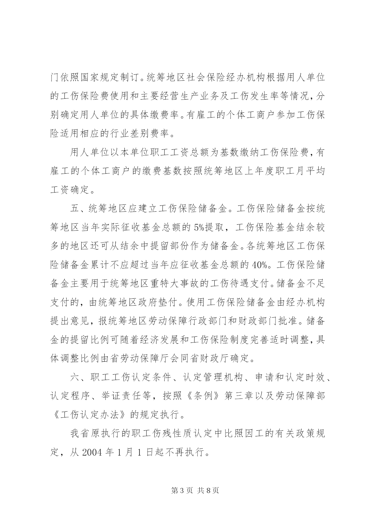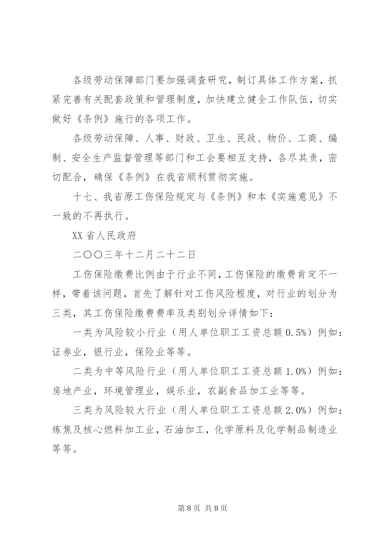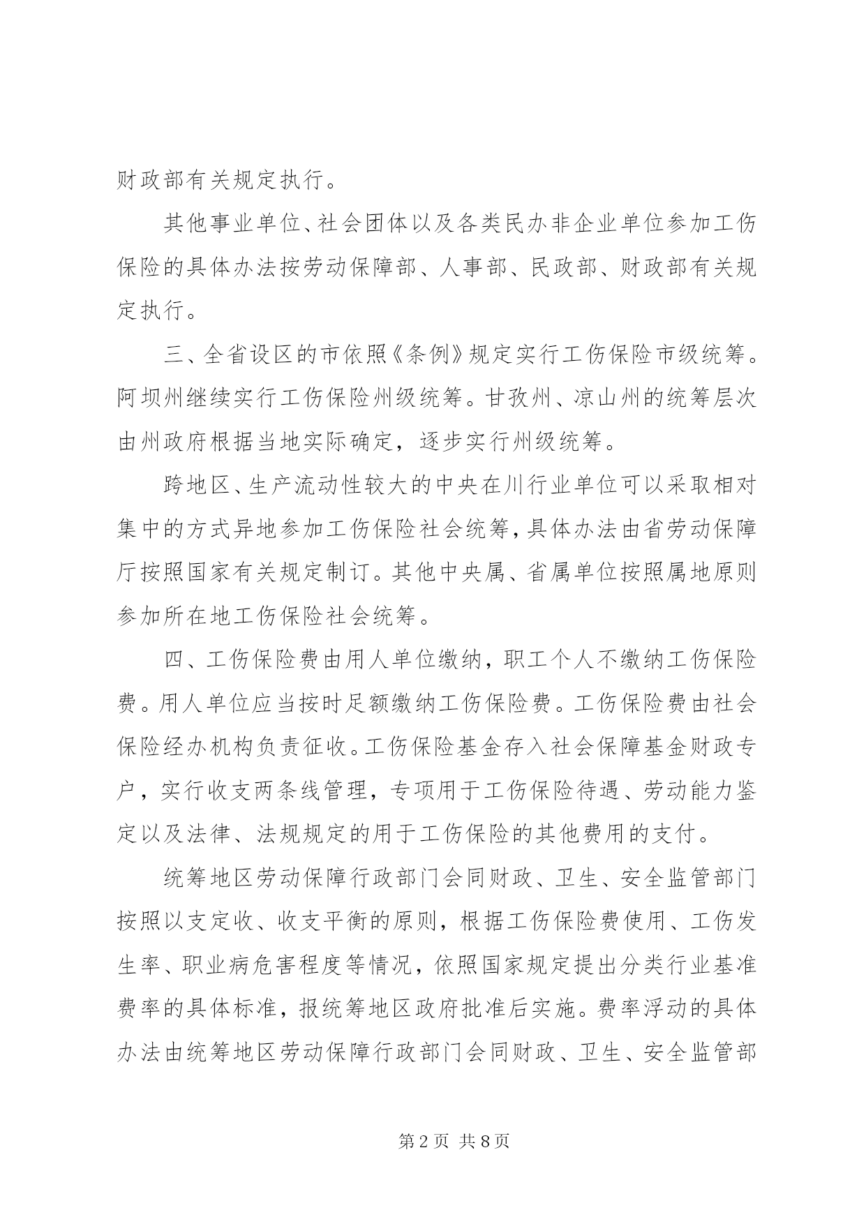 第PAGE\*Arabic\*MERGEFORMAT8页共NUMPAGES\*MERGEFORMAT8页四川工伤保险条例《工伤保险条例》(国务院令第375号,以下简称《条例》)自2004年1月1日实施,这是完善我国社会保障体系的重大举措,对切实保障工伤职工的合法权益,分散用人单位事故风险,维护社会稳定起着重要作用。下文是XX省工伤保险条例,欢迎阅读。XX省工伤保险条例最新版各市、州人民政府,省级各部门:《工伤保险条例》(国务院令第375号,以下简称《条例》)自2004年1月1日实施。这是完善我国社会保障体系的重大举措,对切实保障工伤职工的合法权益,分散用人单位事故风险,维护社会稳定起着重要作用。为确保《条例》的贯彻落实,依据《条例》规定,结合我省实际提出如下实施意见,请认真贯彻执行。一、各类企业(含国有企业、集体企业、外商投资企业、股份制企业、私营企业、乡镇企业)、有雇工的个体工商户(以下简称用人单位)均应依法参加工伤保险,为本单位全部职工或者雇工(以下简称职工)缴纳工伤保险费,其职工依照《条例》享受工伤保险待遇。二、国家机关和依照或者参照国家公务员制度进行人事管理的事业单位、社会团体的工作人员因工作遭受事故伤害或者患职业病的,由所在单位支付费用。具体办法按劳动保障部、人事部、财政部有关规定执行。其他事业单位、社会团体以及各类民办非企业单位参加工伤保险的具体办法按劳动保障部、人事部、民政部、财政部有关规定执行。三、全省设区的市依照《条例》规定实行工伤保险市级统筹。阿坝州继续实行工伤保险州级统筹。甘孜州、凉山州的统筹层次由州政府根据当地实际确定,逐步实行州级统筹。跨地区、生产流动性较大的中央在川行业单位可以采取相对集中的方式异地参加工伤保险社会统筹,具体办法由省劳动保障厅按照国家有关规定制订。其他中央属、省属单位按照属地原则参加所在地工伤保险社会统筹。四、工伤保险费由用人单位缴纳,职工个人不缴纳工伤保险费。用人单位应当按时足额缴纳工伤保险费。工伤保险费由社会保险经办机构负责征收。工伤保险基金存入社会保障基金财政专户,实行收支两条线管理,专项用于工伤保险待遇、劳动能力鉴定以及法律、法规规定的用于工伤保险的其他费用的支付。统筹地区劳动保障行政部门会同财政、卫生、安全监管部门按照以支定收、收支平衡的原则,根据工伤保险费使用、工伤发生率、职业病危害程度等情况,依照国家规定提出分类行业基准费率的具体标准,报统筹地区政府批准后实施。费率浮动的具体办法由统筹地区劳动保障行政部门会同财政、卫生、安全监管部门依照国家规定制订。统筹地区社会保险经办机构根据用人单位的工伤保险费使用和主要经营生产业务及工伤发生率等情况,分别确定用人单位的具体缴费率。有雇工的个体工商户参加工伤保险适用相应的行业差别费率。用人单位以本单位职工工资总额为基数缴纳工伤保险费,有雇工的个体工商户的缴费基数按照统筹地区上年度职工月平均工资确定。五、统筹地区应建立工伤保险储备金。工伤保险储备金按统筹地区当年实际征收基金总额的5%提取,工伤保险基金结余较多的地区还可从结余中提留部份作为储备金。各统筹地区工伤保险储备金累计不应超过当年应征收基金总额的40%。工伤保险储备金主要用于统筹地区重特大事故的工伤待遇支付。储备金不足支付的,由统筹地区政府垫付。使用工伤保险储备金由经办机构提出意见,报统筹地区劳动保障行政部门和财政部门批准。储备金的提留比例可随着经济发展和工伤保险制度完善适时调整,具体调整比例由省劳动保障厅会同省财政厅确定。六、职工工伤认定条件、认定管理机构、申请和认定时效、认定程序、举证责任等,按照《条例》第三章以及劳动保障部《工伤认定办法》的规定执行。我省原执行的职工伤残性质认定中比照因工的有关政策规定,从2004年1月1日起不再执行。七、劳动能力鉴定机构、鉴定标准、申请和鉴定时限、鉴定程序等,依照《条例》第四章的规定执行。省、市(州)劳动能力鉴定委员会由同级劳动保障行政部门、人事行政部门、卫生行政部门、工会组织、经办机构代表以及用人单位代表组成,劳动能力鉴定委员会下设专门办事机构并建立医疗卫生专家库。劳动能力鉴定委员会办事机构由同级劳动保障行政部门负责管理。XX省劳动能力鉴定工作规程由省劳动保障厅会同有关部门制订,劳动能力鉴定收费标准由省物价局、省财政厅按照国家有关规定制订。省、市(州)劳动能力鉴定委员会同时负责职工因病(含非因工负伤)的劳动能力鉴定工作。八、工伤职工依照《条例》第五章规定享受工伤保险待遇。职工因工致残被鉴定为五级、六级伤残,工伤职工本人提出与用人单位解除或者终止劳动关系的,由用人单位支付一次性工伤医疗补助金和伤残就业补助金。其标准以统筹地区上年度职工月平均工资为基数计算:一次性工伤医疗补助金标准为五级伤残14个月,六级伤残12个月。