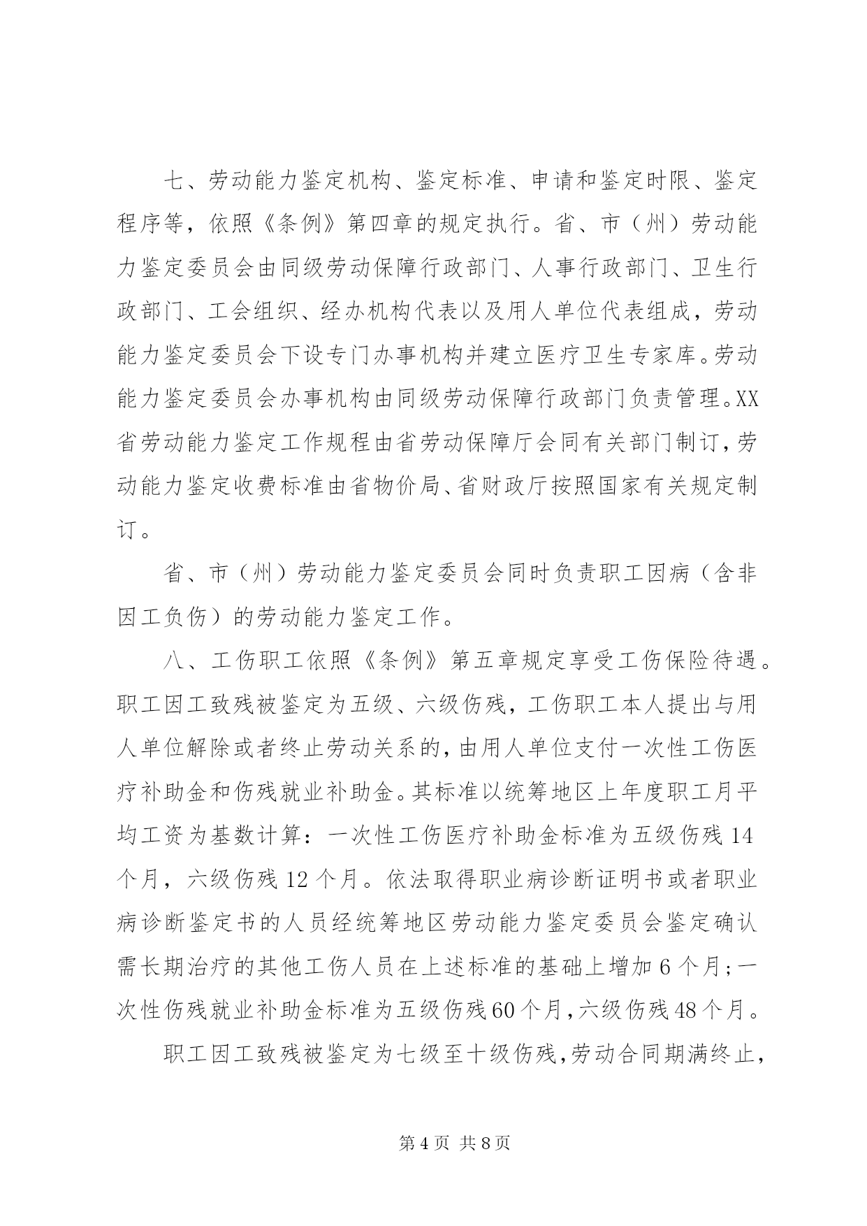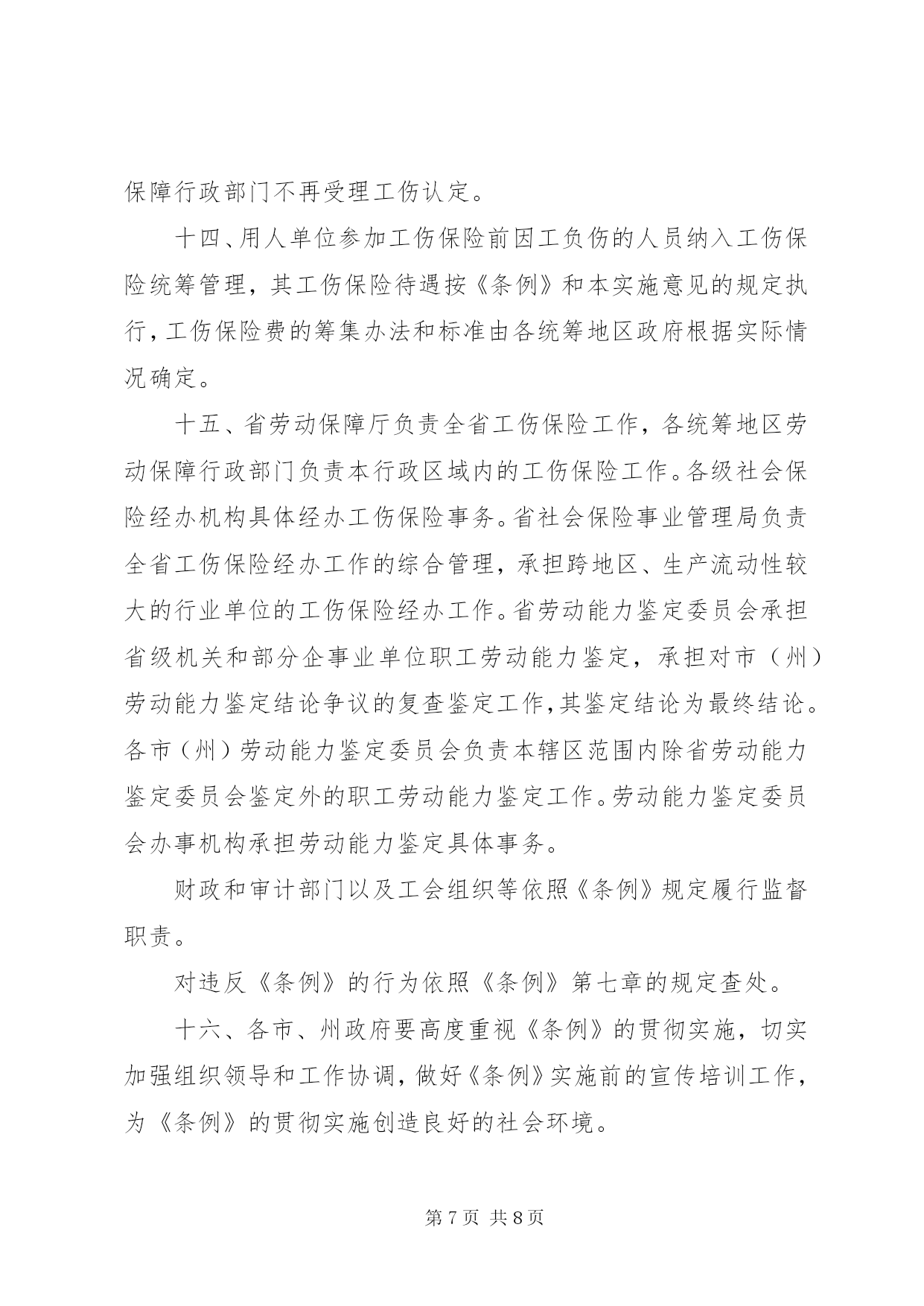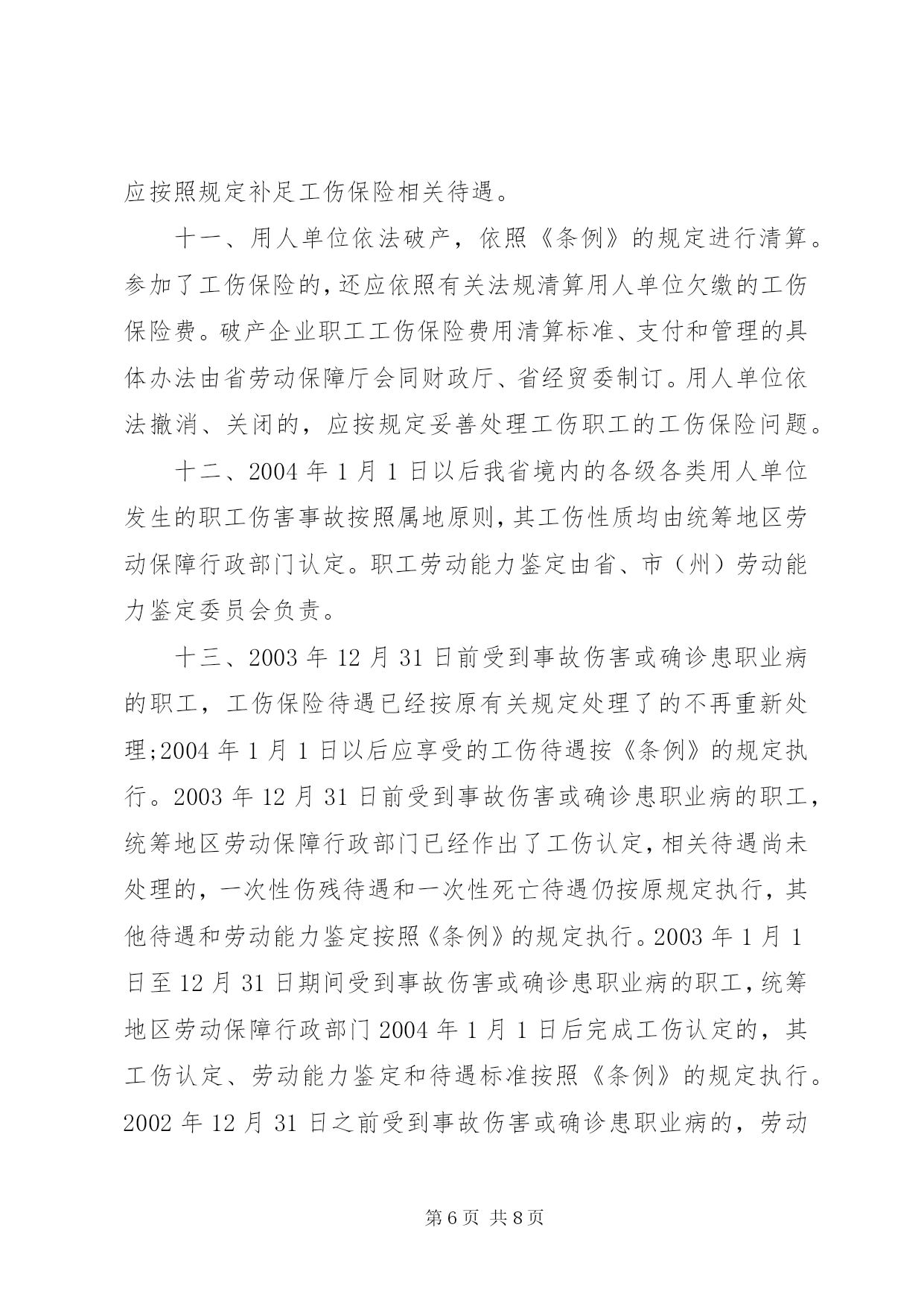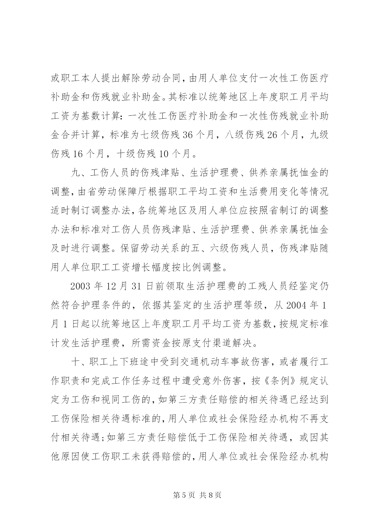 第PAGE\*Arabic\*MERGEFORMAT8页共NUMPAGES\*MERGEFORMAT8页四川工伤保险条例《工伤保险条例》(国务院令第375号,以下简称《条例》)自2004年1月1日实施,这是完善我国社会保障体系的重大举措,对切实保障工伤职工的合法权益,分散用人单位事故风险,维护社会稳定起着重要作用。下文是XX省工伤保险条例,欢迎阅读。XX省工伤保险条例最新版各市、州人民政府,省级各部门:《工伤保险条例》(国务院令第375号,以下简称《条例》)自2004年1月1日实施。这是完善我国社会保障体系的重大举措,对切实保障工伤职工的合法权益,分散用人单位事故风险,维护社会稳定起着重要作用。为确保《条例》的贯彻落实,依据《条例》规定,结合我省实际提出如下实施意见,请认真贯彻执行。一、各类企业(含国有企业、集体企业、外商投资企业、股份制企业、私营企业、乡镇企业)、有雇工的个体工商户(以下简称用人单位)均应依法参加工伤保险,为本单位全部职工或者雇工(以下简称职工)缴纳工伤保险费,其职工依照《条例》享受工伤保险待遇。二、国家机关和依照或者参照国家公务员制度进行人事管理的事业单位、社会团体的工作人员因工作遭受事故伤害或者患职业病的,由所在单位支付费用。具体办法按劳动保障部、人事部、财政部有关规定执行。其他事业单位、社会团体以及各类民办非企业单位参加工伤保险的具体办法按劳动保障部、人事部、民政部、财政部有关规定执行。三、全省设区的市依照《条例》规定实行工伤保险市级统筹。阿坝州继续实行工伤保险州级统筹。甘孜州、凉山州的统筹层次由州政府根据当地实际确定,逐步实行州级统筹。跨地区、生产流动性较大的中央在川行业单位可以采取相对集中的方式异地参加工伤保险社会统筹,具体办法由省劳动保障厅按照国家有关规定制订。其他中央属、省属单位按照属地原则参加所在地工伤保险社会统筹。四、工伤保险费由用人单位缴纳,职工个人不缴纳工伤保险费。用人单位应当按时足额缴纳工伤保险费。工伤保险费由社会保险经办机构负责征收。工伤保险基金存入社会保障基金财政专户,实行收支两条线管理,专项用于工伤保险待遇、劳动能力鉴定以及法律、法规规定的用于工伤保险的其他费用的支付。统筹地区劳动保障行政部门会同财政、卫生、安全监管部门按照以支定收、收支平衡的原则,根据工伤保险费使用、工伤发生率、职业病危害程度等情况,依照国家规定提出分类行业基准费率的具体标准,报统筹地区政府批准后实施。费率浮动的具体办法由统筹地区劳动保障行政部门会同财政、卫生、安全监管部门依照国家规定制订。统筹地区社会保险经办机构根据用人单位的工伤保险费使用和主要经营生产业务及工伤发生率等情况,分别确定用人单位的具体缴费率。有雇工的个体工商户参加工伤保险适用相应的行业差别费率。用人单位以本单位职工工资总额为基数缴纳工伤保险费,有雇工的个体工商户的缴费基数按照统筹地区上年度职工月平均工资确定。五、统筹地区应建立工伤保险储备金。工伤保险储备金按统筹地区当年实际征收基金总额的5%提取,工伤保险基金结余较多的地区还可从结余中提留部份作为储备金。各统筹地区工伤保险储备金累计不应超过当年应征收基金总额的40%。工伤保险储备金主要用于统筹地区重特大事故的工伤待遇支付。储备金不足支付的,由统筹地区政府垫付。使用工伤保险储备金由经办机构提出意见,报统筹地区劳动保障行政部门和财政部门批准。储备金的提留比例可随着经济发展和工伤保险制度完善适时调整,具体调整比例由省劳动保障厅会同省财政厅确定。六、职工工伤认定条件、认定管理机构、申请和认定时效、认定程序、举证责任等,按照《条例》第三章以及劳动保障部《工伤认定办法》的规定执行。我省原执行的职工伤残性质认定中比照因工的有关政策规定,从2004年1月1日起不再执行。七、劳动能力鉴定机构、鉴定标准、申请和鉴定时限、鉴定程序等,依照《条例》第四章的规定执行。省、市(州)劳动能力鉴定委员会由同级劳动保障行政部门、人事行政部门、卫生行政部门、工会组织、经办机构代表以及用人单位代表组成,劳动能力鉴定委员会下设专门办事机构并建立医疗卫生专家库。劳动能力鉴定委员会办事机构由同级劳动保障行政部门负责管理。XX省劳动能力鉴定工作规程由省劳动保障厅会同有关部门制订,劳动能力鉴定收费标准由省物价局、省财政厅按照国家有关规定制订。省、市(州)劳动能力鉴定委员会同时负责职工因病(含非因工负伤)的劳动能力鉴定工作。八、工伤职工依照《条例》第五章规定享受工伤保险待遇。职工因工致残被鉴定为五级、六级伤残,工伤职工本人提出与用人单位解除或者终止劳动关系的,由用人单位支付一次性工伤医疗补助金和伤残就业补助金。其标准以统筹地区上年度职工月平均工资为基数计算:一次性工伤医疗补助金标准为五级伤残14个月,六级伤残12个月。