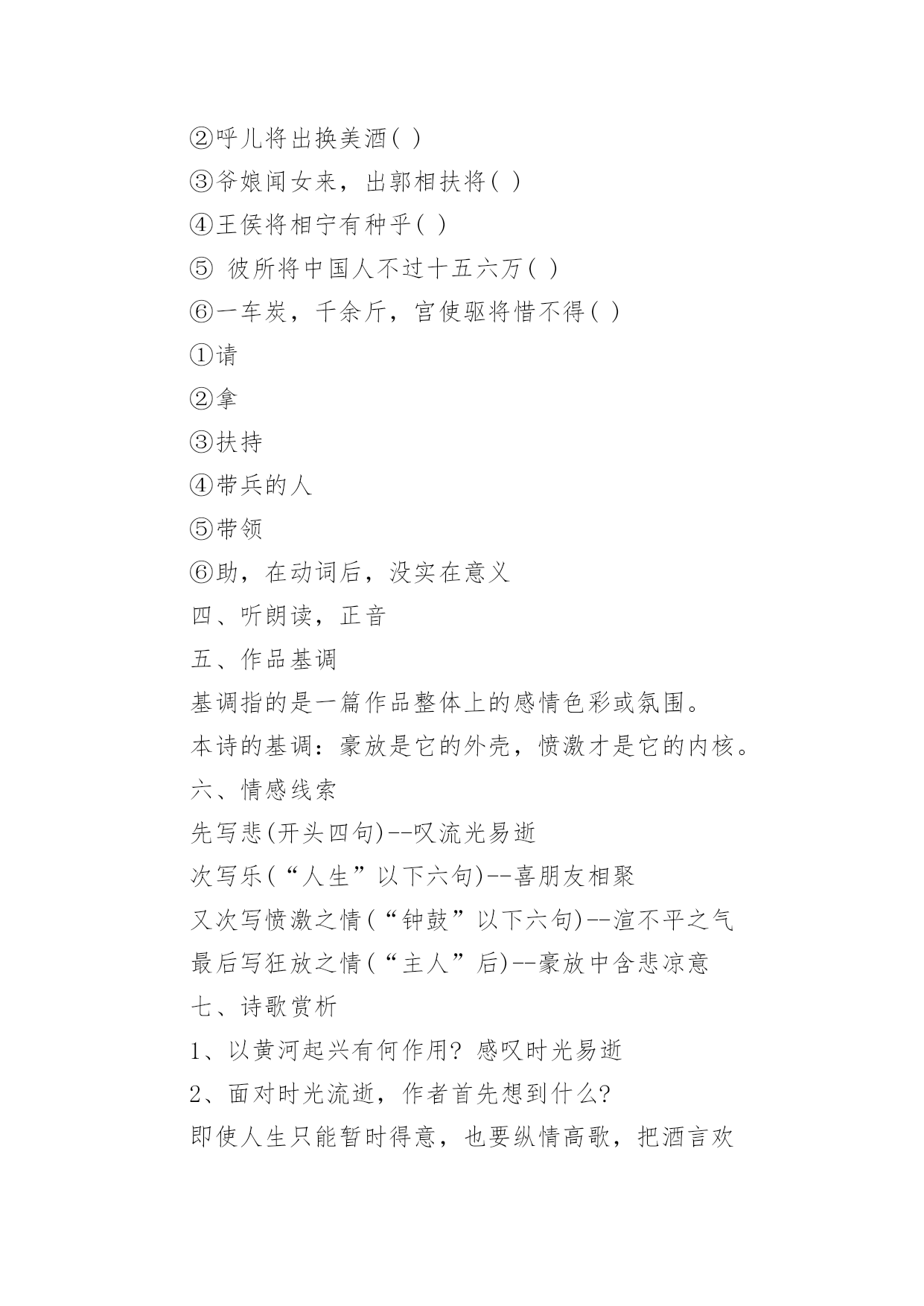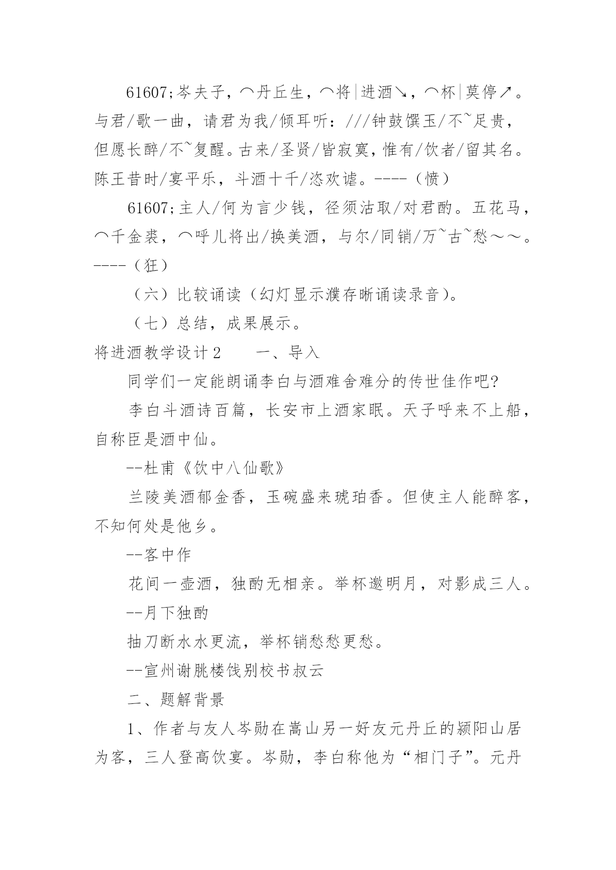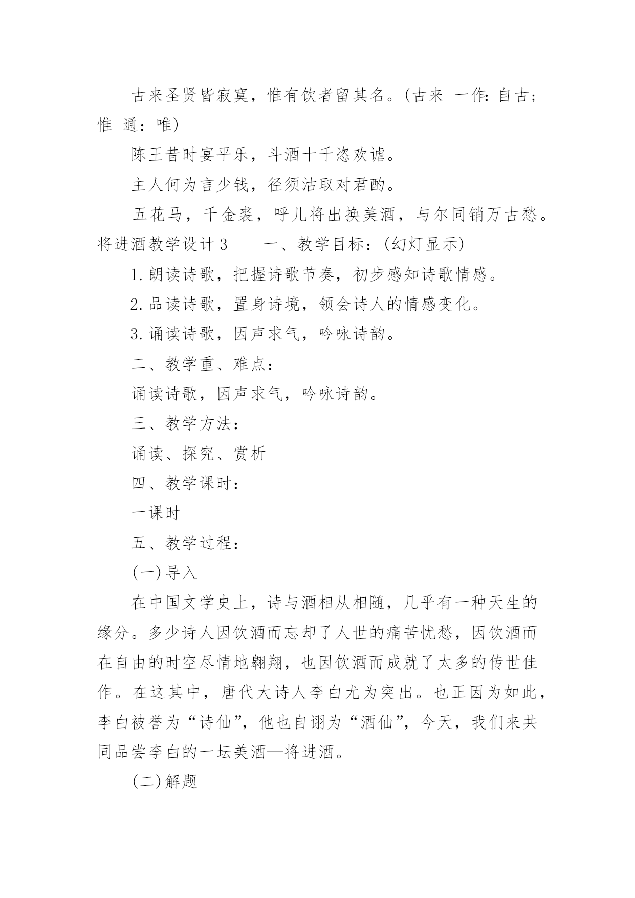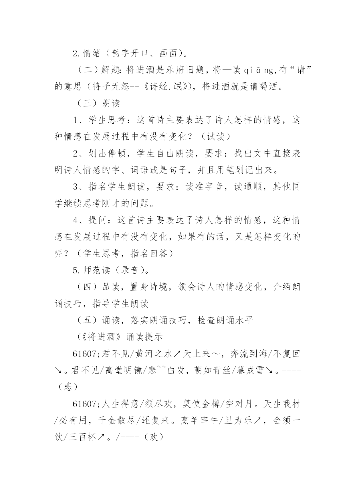 将进酒教学设计将进酒教学设计作为一位杰出的老师,时常要开展教学设计的准备工作,教学设计是教育技术的组成部分,它的功能在于运用系统方法设计教学过程,使之成为一种具有操作性的程序。我们该怎么去写教学设计呢?以下是小编为大家整理的将进酒教学设计,欢迎大家借鉴与参考,希望对大家有所帮助。将进酒教学设计1一、教学目标:(幻灯显示)1.朗读诗歌,把握诗歌节奏,初步感知诗歌情感。2.品读诗歌,置身诗境,领会诗人的情感变化。3.诵读诗歌,因声求气,吟咏诗韵。二、教学重、难点:诵读诗歌,因声求气,吟咏诗韵。三、教学方法:诵读、探究、赏析四、教学课时:一课时五、教学过程:(一)导入:上节课,让同学们预习了“因声求气吟咏诗韵”,提问预习效果。归纳知识点:1.节奏(近体诗平仄、词牌)。2.情绪(韵字开口、画面)。(二)解题:将进酒是乐府旧题,将—读qiāng,有“请”的意思(将子无怒--《诗经.氓》),将进酒就是请喝酒。(三)朗读1、学生思考:这首诗主要表达了诗人怎样的情感,这种情感在发展过程中有没有变化?(试读)2、划出停顿,学生自由朗读,要求:找出文中直接表明诗人情感的字、词语或是句子,并且用笔划记出来。3、指名学生朗读,要求:读准字音,读通顺,其他同学继续思考刚才的问题。4、提问:这首诗主要表达了诗人怎样的情感,这种情感在发展过程中有没有变化,如果有的话,又是怎样变化的呢?(学生思考,指名回答)5.师范读(录音)。(四)品读,置身诗境,领会诗人的情感变化,介绍朗诵技巧,指导学生朗读(五)诵读,落实朗诵技巧,检查朗诵水平(《将进酒》诵读提示61607;君不见/黄河之水↗天上来~,奔流到海/不复回↘。君不见/高堂明镜/悲~~白发,朝如青丝/暮成雪↘。----(悲)61607;人生得意/须尽欢,莫使金樽/空对月。天生我材/必有用,千金散尽/还复来。烹羊宰牛/且为乐↗,会须一饮/三百杯↗。/----(欢)61607;岑夫子,⌒丹丘生,⌒将|进酒↘,⌒杯|莫停↗。与君/歌一曲,请君为我/倾耳听:///钟鼓馔玉/不~足贵,但愿长醉/不~复醒。古来/圣贤/皆寂寞,惟有/饮者/留其名。陈王昔时/宴平乐,斗酒十千/恣欢谑。----(愤)61607;主人/何为言少钱,径须沽取/对君酌。五花马,⌒千金裘,⌒呼儿将出/换美酒,与尔/同销/万~古~愁~~。----(狂)(六)比较诵读(幻灯显示濮存晰诵读录音)。(七)总结,成果展示。将进酒教学设计2一、导入同学们一定能朗诵李白与酒难舍难分的传世佳作吧?李白斗酒诗百篇,长安市上酒家眠。天子呼来不上船,自称臣是酒中仙。--杜甫《饮中八仙歌》兰陵美酒郁金香,玉碗盛来琥珀香。但使主人能醉客,不知何处是他乡。--客中作花间一壶酒,独酌无相亲。举杯邀明月,对影成三人。--月下独酌抽刀断水水更流,举杯销愁愁更愁。--宣州谢朓楼饯别校书叔云二、题解背景1、作者与友人岑勋在嵩山另一好友元丹丘的颍阳山居为客,三人登高饮宴。岑勋,李白称他为“相门子”。元丹丘是当时著名的隐士,主要隐居地在嵩阳。2、《将进酒》原为汉乐府的曲调,意即“劝酒歌”,多以饮酒放歌为内容。将,请、愿之意,《诗经卫风氓》中有“将子无怒”句。这个“将”与诗句“呼儿将出换美酒”的“将”音义不同。李白这首诗虽用了旧题,却能跳出前人窠臼,自创新意,把饮酒和对黑暗现实的批判结合起来。这首诗是一首劝酒歌,大约作于唐玄宗天宝十一年,即安史之乱前四五年光景。当时唐玄宗沉于女色,先后将政事交给奸相李林甫和杨国忠,官场一片黑暗,豪门贵族只顾寻欢作乐,不以国事为念,社会腐败到了无以复加的地步。诗人对此极为不满,但他又无力改变这种状况,只能用消极的办法进行反抗,借酒销愁,“但愿长醉不复醒。”诗人借题发挥,尽吐郁积在胸中的不平之气,这种反抗方式,跟《梦游天姥吟留别》中借寻仙表现不事权贵的意志的写法颇为相似。三、自学检查:1、指出下面加线字的读音有错的一项:CA、馔玉(zhuàn)B、恣意(zì)C、将进酒(jiāng)D、欢谑(xuè)2、下面通假字中有错的一项:CA、径须沽取(沽:酤)B、所守或匪亲(匪:非)C、与尔同消万古愁(尔:你)D、卒廷见相如(廷:庭)3、解释下面“将”的意义:①将进酒()②呼儿将出换美酒()③爷娘闻女来,出郭相扶将()④王侯将相宁有种乎()⑤彼所将中国人不过十五六万()⑥一车炭,千余斤,宫使驱将惜不得()①请②拿③扶持④带兵的人⑤带领⑥助,在动词后,没实在意义四、听朗读,正音五、作品基调基调指的是一篇作品整体上的感情色彩或氛围。本诗的基调:豪放是它的外壳,愤激才是它的内核。六、情感线索先写悲(开头四句)--叹流光易逝次写乐(“人生”以下六句)--喜朋友相聚又次写愤激之情(“钟鼓”以下六句)--渲不平之气最后写狂放之情(“主人”后)--豪放中含悲凉意七、诗歌赏析1、以黄