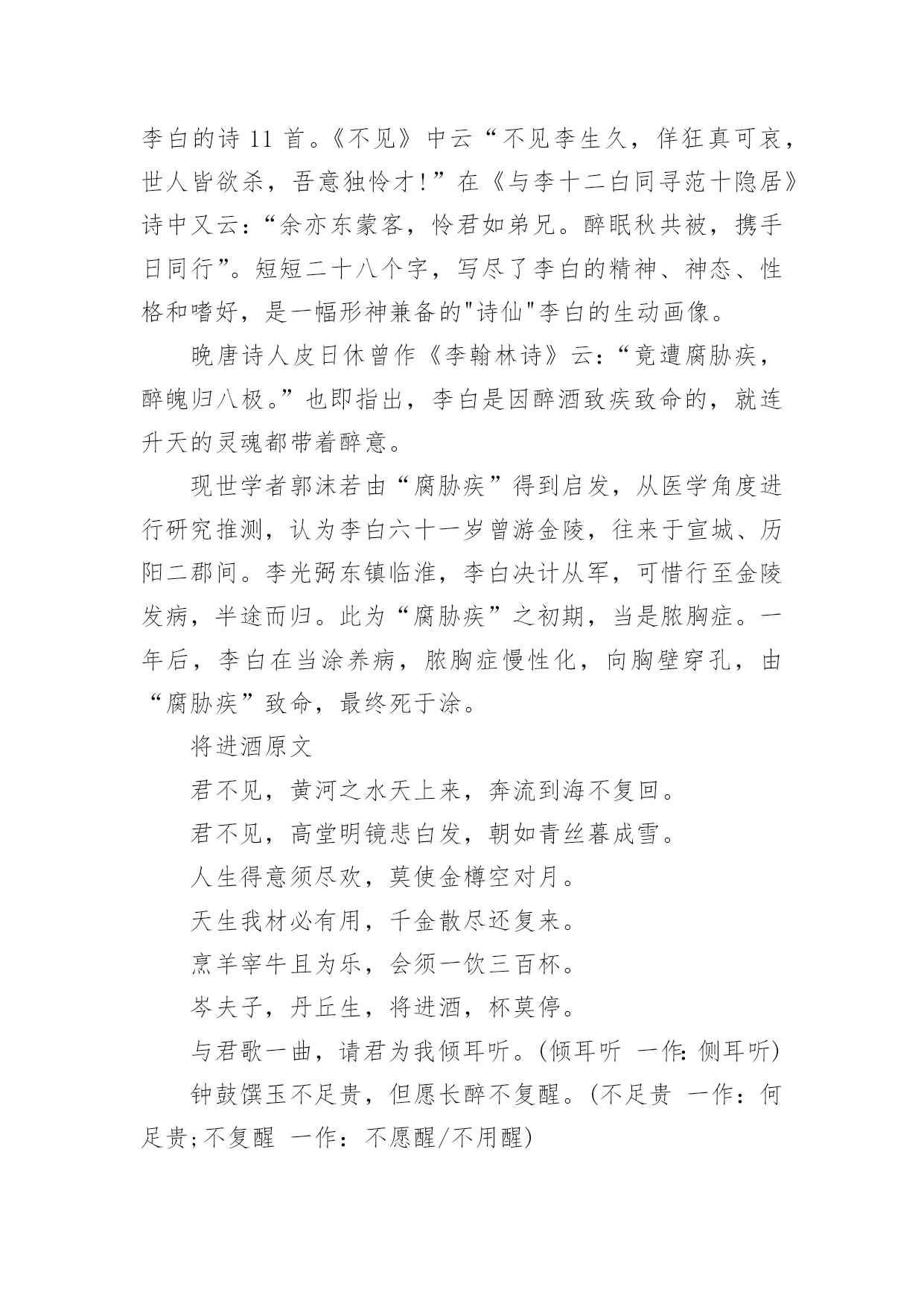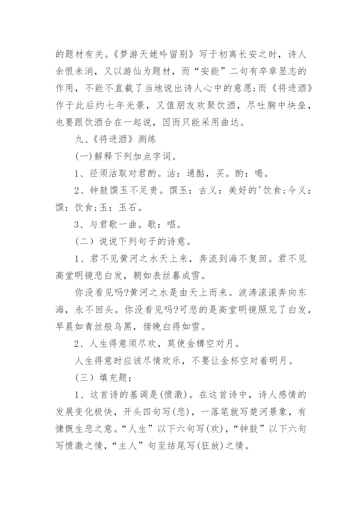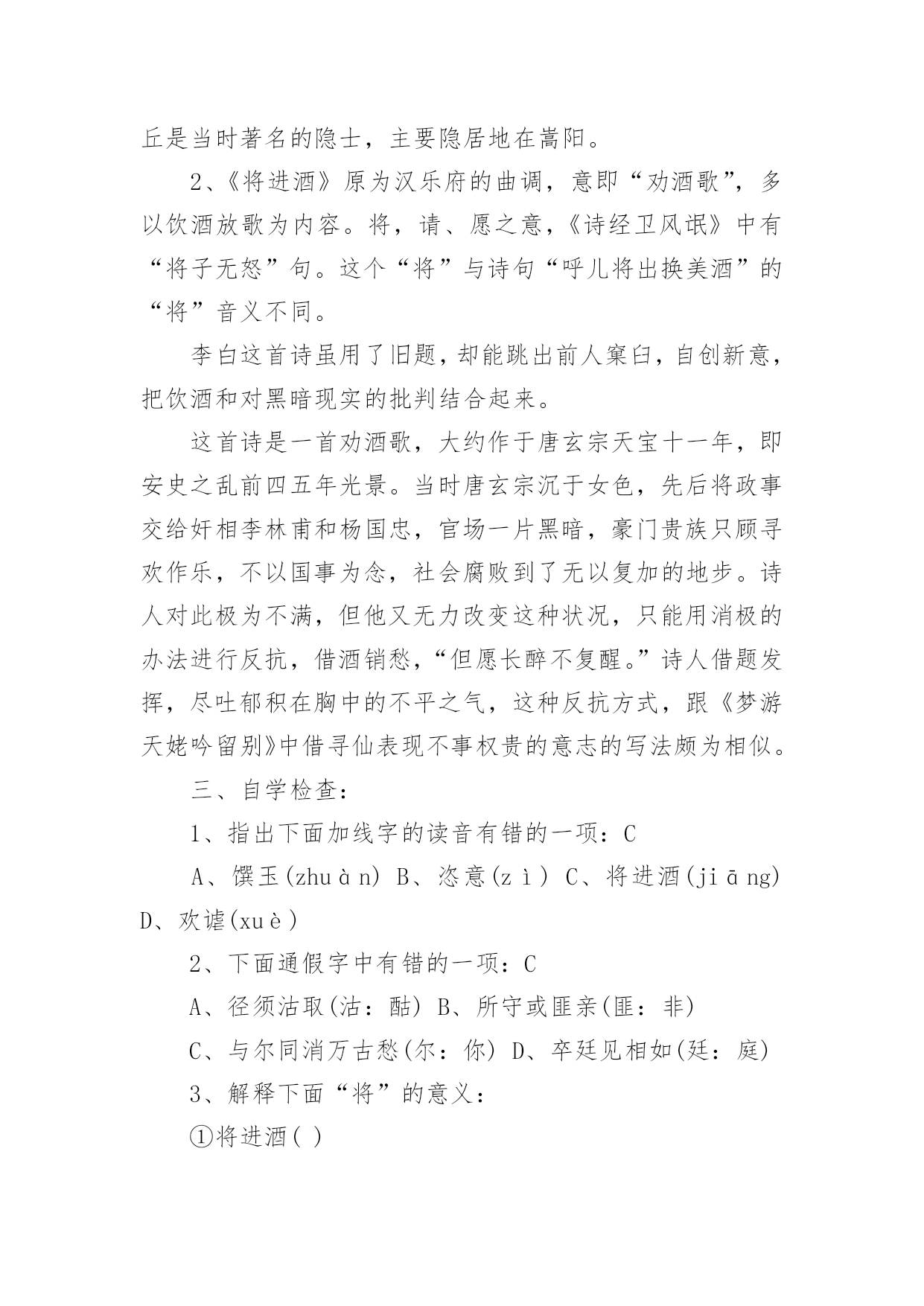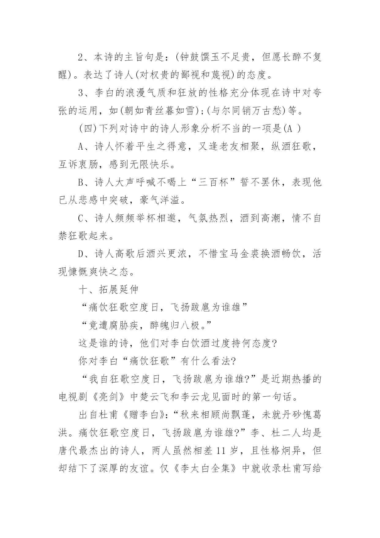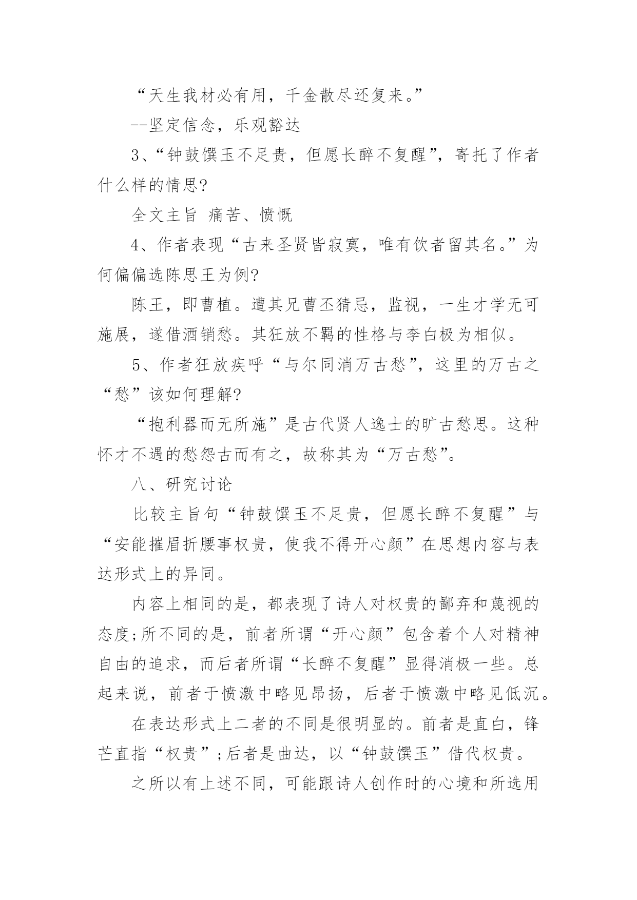 将进酒教学设计将进酒教学设计作为一位杰出的老师,时常要开展教学设计的准备工作,教学设计是教育技术的组成部分,它的功能在于运用系统方法设计教学过程,使之成为一种具有操作性的程序。我们该怎么去写教学设计呢?以下是小编为大家整理的将进酒教学设计,欢迎大家借鉴与参考,希望对大家有所帮助。将进酒教学设计1一、教学目标:(幻灯显示)1.朗读诗歌,把握诗歌节奏,初步感知诗歌情感。2.品读诗歌,置身诗境,领会诗人的情感变化。3.诵读诗歌,因声求气,吟咏诗韵。二、教学重、难点:诵读诗歌,因声求气,吟咏诗韵。三、教学方法:诵读、探究、赏析四、教学课时:一课时五、教学过程:(一)导入:上节课,让同学们预习了“因声求气吟咏诗韵”,提问预习效果。归纳知识点:1.节奏(近体诗平仄、词牌)。2.情绪(韵字开口、画面)。(二)解题:将进酒是乐府旧题,将—读qiāng,有“请”的意思(将子无怒--《诗经.氓》),将进酒就是请喝酒。(三)朗读1、学生思考:这首诗主要表达了诗人怎样的情感,这种情感在发展过程中有没有变化?(试读)2、划出停顿,学生自由朗读,要求:找出文中直接表明诗人情感的字、词语或是句子,并且用笔划记出来。3、指名学生朗读,要求:读准字音,读通顺,其他同学继续思考刚才的问题。4、提问:这首诗主要表达了诗人怎样的情感,这种情感在发展过程中有没有变化,如果有的话,又是怎样变化的呢?(学生思考,指名回答)5.师范读(录音)。(四)品读,置身诗境,领会诗人的情感变化,介绍朗诵技巧,指导学生朗读(五)诵读,落实朗诵技巧,检查朗诵水平(《将进酒》诵读提示61607;君不见/黄河之水↗天上来~,奔流到海/不复回↘。君不见/高堂明镜/悲~~白发,朝如青丝/暮成雪↘。----(悲)61607;人生得意/须尽欢,莫使金樽/空对月。天生我材/必有用,千金散尽/还复来。烹羊宰牛/且为乐↗,会须一饮/三百杯↗。/----(欢)61607;岑夫子,⌒丹丘生,⌒将|进酒↘,⌒杯|莫停↗。与君/歌一曲,请君为我/倾耳听:///钟鼓馔玉/不~足贵,但愿长醉/不~复醒。古来/圣贤/皆寂寞,惟有/饮者/留其名。陈王昔时/宴平乐,斗酒十千/恣欢谑。----(愤)61607;主人/何为言少钱,径须沽取/对君酌。五花马,⌒千金裘,⌒呼儿将出/换美酒,与尔/同销/万~古~愁~~。----(狂)(六)比较诵读(幻灯显示濮存晰诵读录音)。(七)总结,成果展示。将进酒教学设计2一、导入同学们一定能朗诵李白与酒难舍难分的传世佳作吧?李白斗酒诗百篇,长安市上酒家眠。天子呼来不上船,自称臣是酒中仙。--杜甫《饮中八仙歌》兰陵美酒郁金香,玉碗盛来琥珀香。但使主人能醉客,不知何处是他乡。--客中作花间一壶酒,独酌无相亲。举杯邀明月,对影成三人。--月下独酌抽刀断水水更流,举杯销愁愁更愁。--宣州谢朓楼饯别校书叔云二、题解背景1、作者与友人岑勋在嵩山另一好友元丹丘的颍阳山居为客,三人登高饮宴。岑勋,李白称他为“相门子”。元丹丘是当时著名的隐士,主要隐居地在嵩阳。2、《将进酒》原为汉乐府的曲调,意即“劝酒歌”,多以饮酒放歌为内容。将,请、愿之意,《诗经卫风氓》中有“将子无怒”句。这个“将”与诗句“呼儿将出换美酒”的“将”音义不同。李白这首诗虽用了旧题,却能跳出前人窠臼,自创新意,把饮酒和对黑暗现实的批判结合起来。这首诗是一首劝酒歌,大约作于唐玄宗天宝十一年,即安史之乱前四五年光景。当时唐玄宗沉于女色,先后将政事交给奸相李林甫和杨国忠,官场一片黑暗,豪门贵族只顾寻欢作乐,不以国事为念,社会腐败到了无以复加的地步。诗人对此极为不满,但他又无力改变这种状况,只能用消极的办法进行反抗,借酒销愁,“但愿长醉不复醒。”诗人借题发挥,尽吐郁积在胸中的不平之气,这种反抗方式,跟《梦游天姥吟留别》中借寻仙表现不事权贵的意志的写法颇为相似。三、自学检查:1、指出下面加线字的读音有错的一项:CA、馔玉(zhuàn)B、恣意(zì)C、将进酒(jiāng)D、欢谑(xuè)2、下面通假字中有错的一项:CA、径须沽取(沽:酤)B、所守或匪亲(匪:非)C、与尔同消万古愁(尔:你)D、卒廷见相如(廷:庭)3、解释下面“将”的意义:①将进酒()②呼儿将出换美酒()③爷娘闻女来,出郭相扶将()④王侯将相宁有种乎()⑤彼所将中国人不过十五六万()⑥一车炭,千余斤,宫使驱将惜不得()①请②拿③扶持④带兵的人⑤带领⑥助,在动词后,没实在意义四、听朗读,正音五、作品基调基调指的是一篇作品整体上的感情色彩或氛围。本诗的基调:豪放是它的外壳,愤激才是它的内核。六、情感线索先写悲(开头四句)--叹流光易逝次写乐(“人生”以下六句)--喜朋友相聚又次写愤激之情(“钟鼓”以下六句)--渲不平之气最后写狂放之情(“主人”后)--豪放中含悲凉意七、诗歌赏析1、以黄