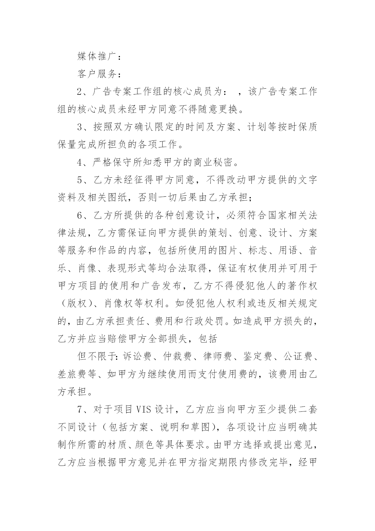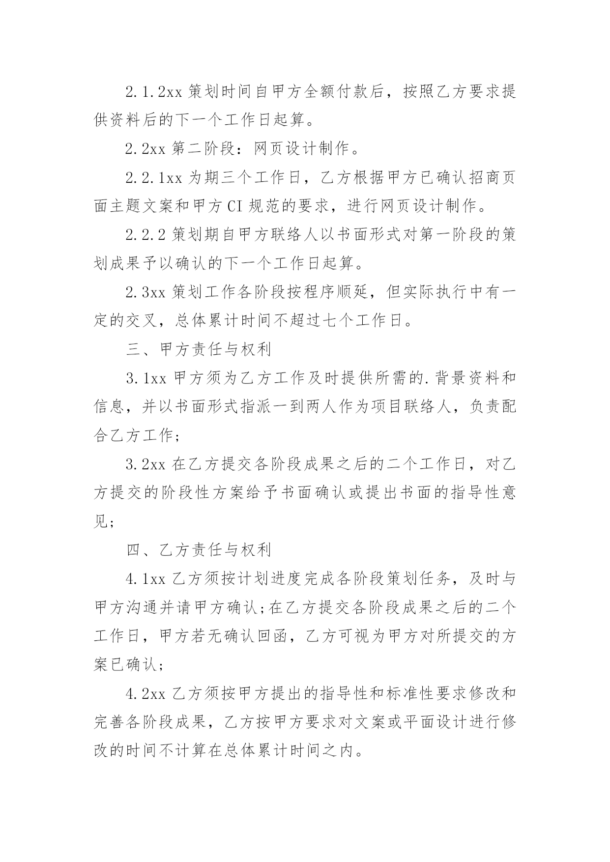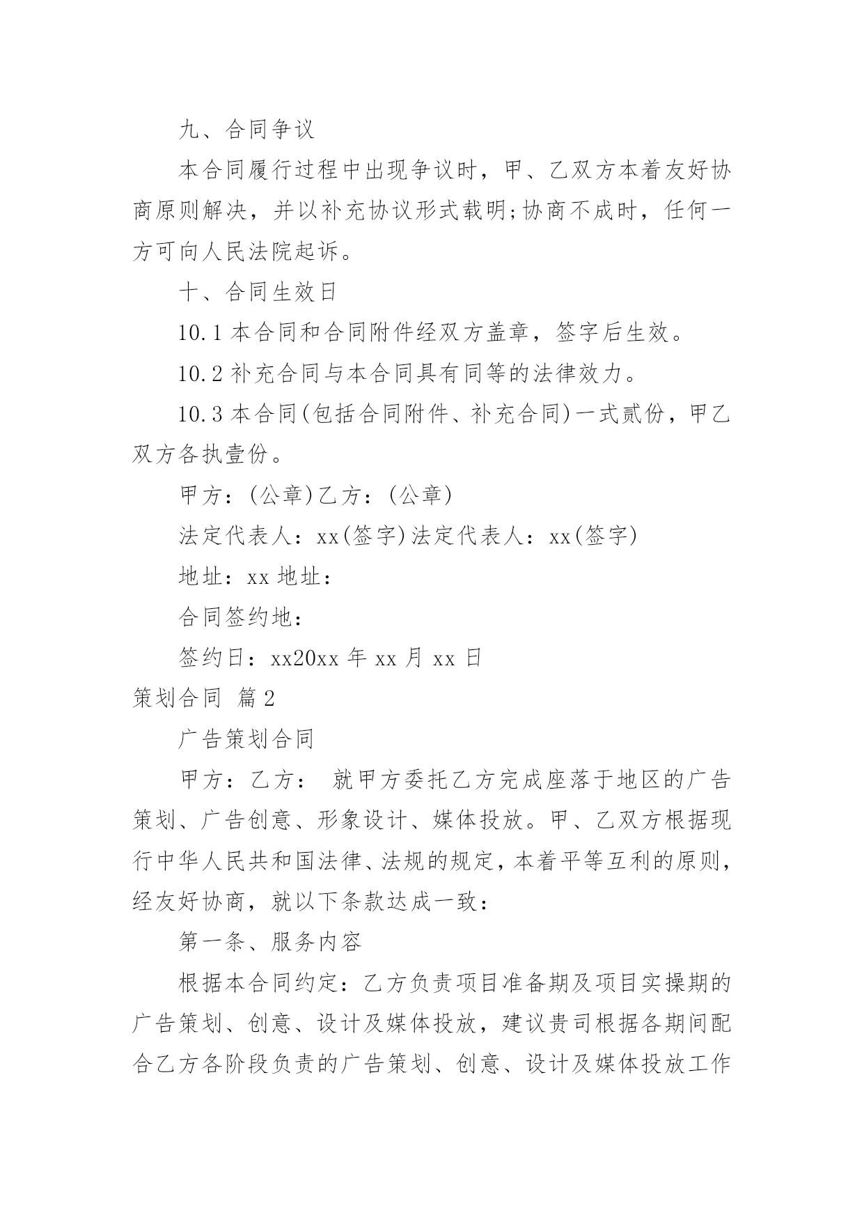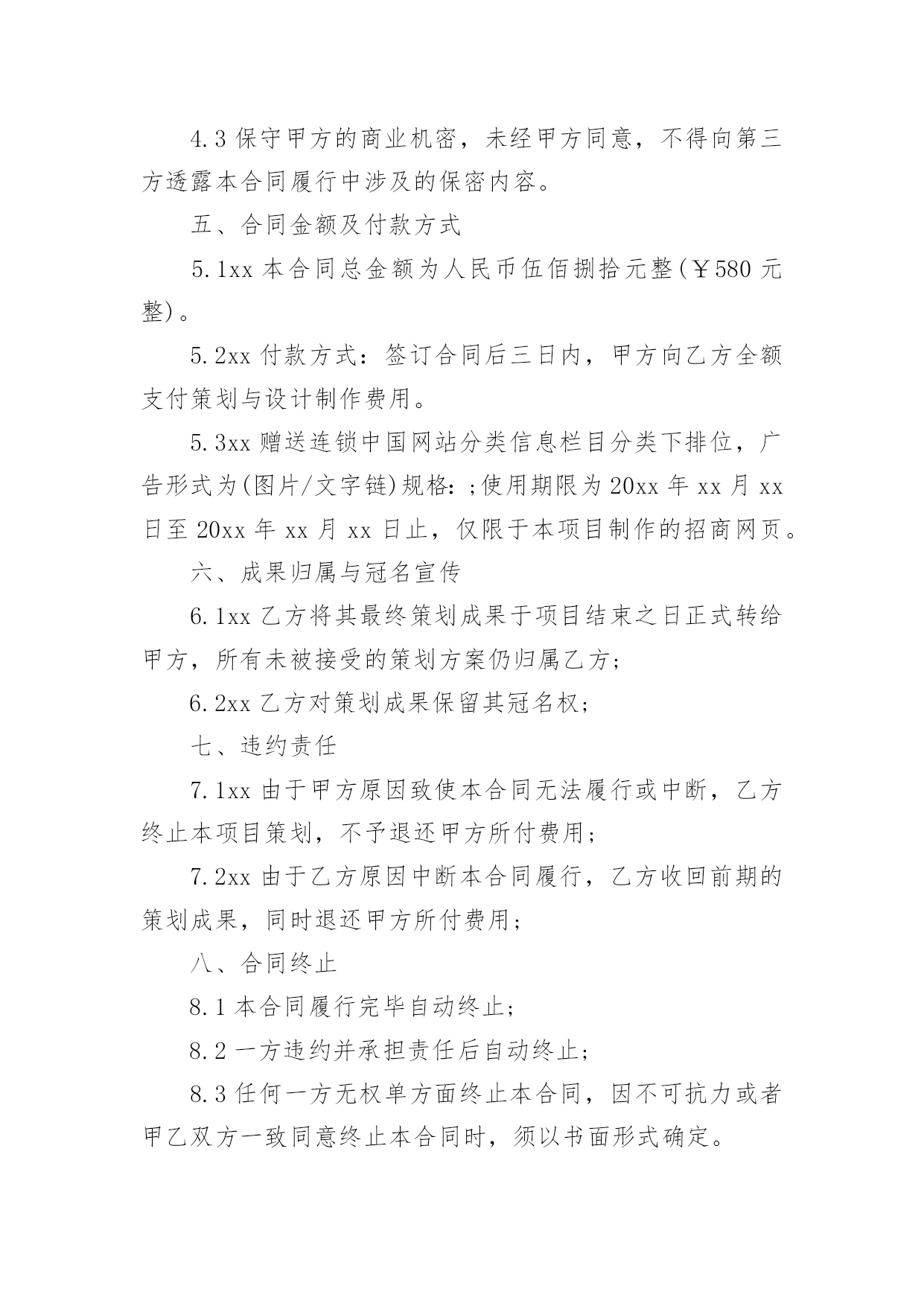 策划合同有关策划合同模板汇总6篇随着广大人民群众法律意识的普遍提高,越来越多事情需要用到合同,签订合同是减少和防止发生争议的重要措施。那么合同要怎么拟定?想必这让大家都很苦恼吧,以下是小编帮大家整理的策划合同6篇,希望对大家有所帮助。策划合同篇1甲方(委托方):乙方(受托方):xx公司甲、乙双方经友好洽谈和协商,甲方决定委托乙方进行网络招商页面策划。为保证项目顺利进行,根据国家有关法律规定,特签订本合同。一、项目任务1.1xx任务一:乙方对甲方xx网络招商开展专项策划,编写招商页面主题文案;1.2任务二:乙方根据甲方已确认招商页面主题文案,进行网页设计制作。二、委托项目进度2.1xx第一阶段:编写策划文案2.1.1xx为期四个工作日,乙方通过对甲方提供的资料进行整理和分析,根据甲方市场推广需要,编写招商页面主题文案。2.1.2xx策划时间自甲方全额付款后,按照乙方要求提供资料后的下一个工作日起算。2.2xx第二阶段:网页设计制作。2.2.1xx为期三个工作日,乙方根据甲方已确认招商页面主题文案和甲方CI规范的要求,进行网页设计制作。2.2.2策划期自甲方联络人以书面形式对第一阶段的策划成果予以确认的下一个工作日起算。2.3xx策划工作各阶段按程序顺延,但实际执行中有一定的交叉,总体累计时间不超过七个工作日。三、甲方责任与权利3.1xx甲方须为乙方工作及时提供所需的.背景资料和信息,并以书面形式指派一到两人作为项目联络人,负责配合乙方工作;3.2xx在乙方提交各阶段成果之后的二个工作日,对乙方提交的阶段性方案给予书面确认或提出书面的指导性意见;四、乙方责任与权利4.1xx乙方须按计划进度完成各阶段策划任务,及时与甲方沟通并请甲方确认;在乙方提交各阶段成果之后的二个工作日,甲方若无确认回函,乙方可视为甲方对所提交的方案已确认;4.2xx乙方须按甲方提出的指导性和标准性要求修改和完善各阶段成果,乙方按甲方要求对文案或平面设计进行修改的时间不计算在总体累计时间之内。4.3保守甲方的商业机密,未经甲方同意,不得向第三方透露本合同履行中涉及的保密内容。五、合同金额及付款方式5.1xx本合同总金额为人民币伍佰捌拾元整(¥580元整)。5.2xx付款方式:签订合同后三日内,甲方向乙方全额支付策划与设计制作费用。5.3xx赠送连锁中国网站分类信息栏目分类下排位,广告形式为(图片/文字链)规格:;使用期限为20xx年xx月xx日至20xx年xx月xx日止,仅限于本项目制作的招商网页。六、成果归属与冠名宣传6.1xx乙方将其最终策划成果于项目结束之日正式转给甲方,所有未被接受的策划方案仍归属乙方;6.2xx乙方对策划成果保留其冠名权;七、违约责任7.1xx由于甲方原因致使本合同无法履行或中断,乙方终止本项目策划,不予退还甲方所付费用;7.2xx由于乙方原因中断本合同履行,乙方收回前期的策划成果,同时退还甲方所付费用;八、合同终止8.1本合同履行完毕自动终止;8.2一方违约并承担责任后自动终止;8.3任何一方无权单方面终止本合同,因不可抗力或者甲乙双方一致同意终止本合同时,须以书面形式确定。九、合同争议本合同履行过程中出现争议时,甲、乙双方本着友好协商原则解决,并以补充协议形式载明;协商不成时,任何一方可向人民法院起诉。十、合同生效日10.1本合同和合同附件经双方盖章,签字后生效。10.2补充合同与本合同具有同等的法律效力。10.3本合同(包括合同附件、补充合同)一式贰份,甲乙双方各执壹份。甲方:(公章)乙方:(公章)法定代表人:xx(签字)法定代表人:xx(签字)地址:xx地址:合同签约地:签约日:xx20xx年xx月xx日策划合同篇2广告策划合同甲方:乙方:就甲方委托乙方完成座落于地区的广告策划、广告创意、形象设计、媒体投放。甲、乙双方根据现行中华人民共和国法律、法规的规定,本着平等互利的原则,经友好协商,就以下条款达成一致:第一条、服务内容根据本合同约定:乙方负责项目准备期及项目实操期的广告策划、创意、设计及媒体投放,建议贵司根据各期间配合乙方各阶段负责的广告策划、创意、设计及媒体投放工作内容。1、推广策略拟定:1)案名及SLOGAN;2)全案推广策略建议书;3)阶段性推广策略建议书;2、VI系统建设:1)标识、标准字、标准色、标准组合形式及延展、变异等设计;2)VI延展(手袋、名片、信封、信纸、传真等)。3、项目现场的平面设计方案:1)招牌、看板;2)指引系统;3)项目现场围档。4、广告设计(含创意、文案、设计):1)项目书;2)单页;3)折页、DM;4)户外广告;5)报纸、杂志等平面媒体广告;6)电视、影视宣传创意推广;7)网站平面设计框架及网络媒体平面设计;第二条、服务形式1、乙方应于本合同签订之日起七个工作日内,向甲方提供具体的实施