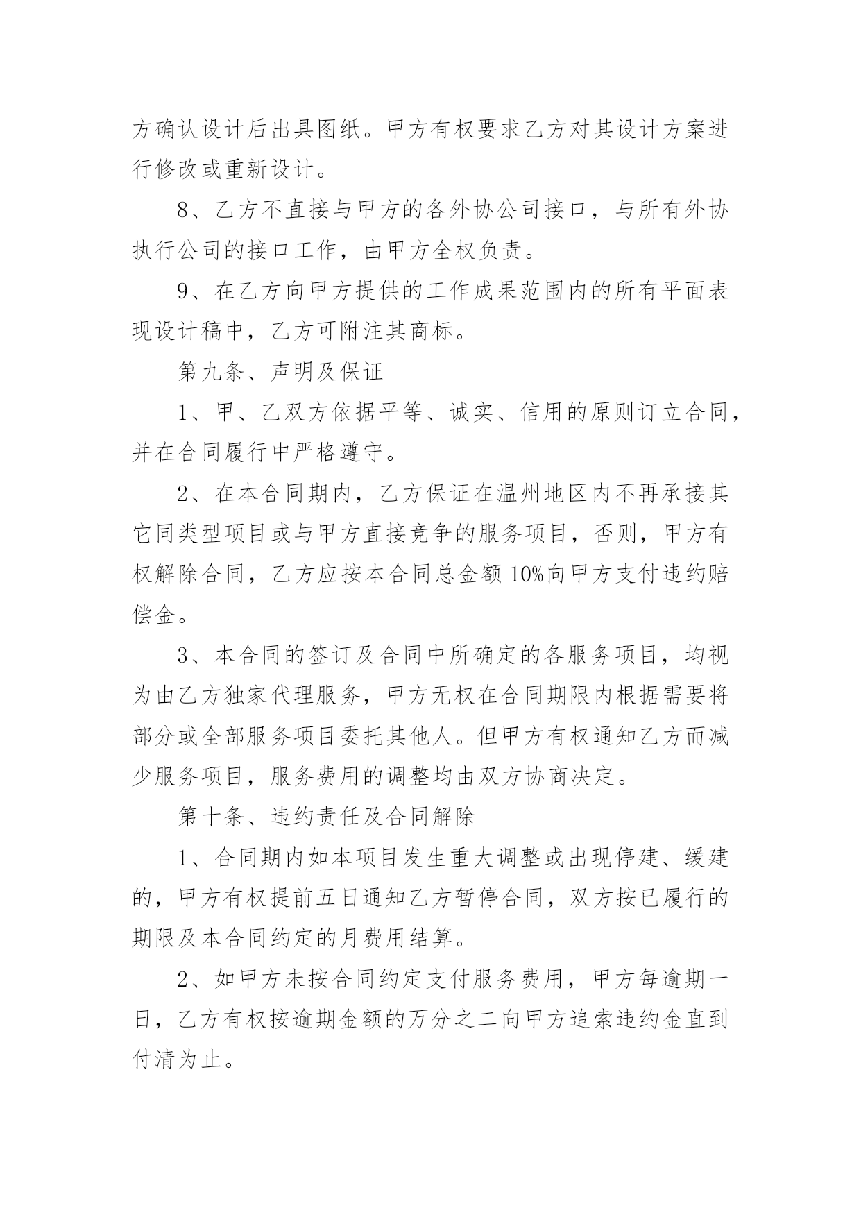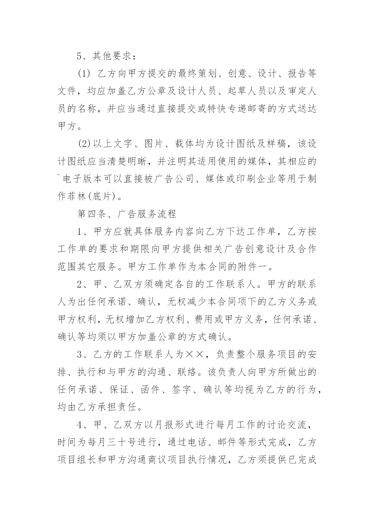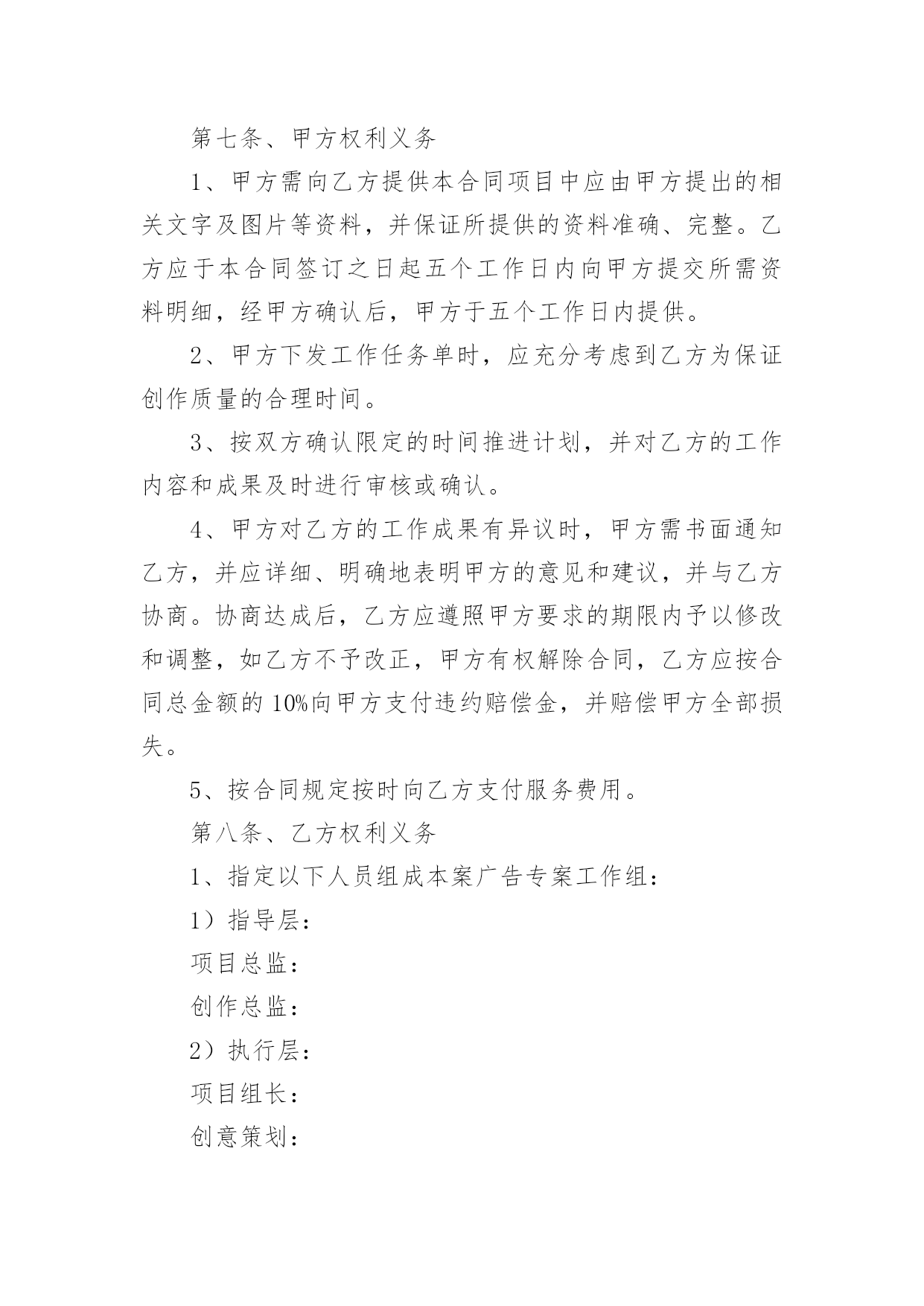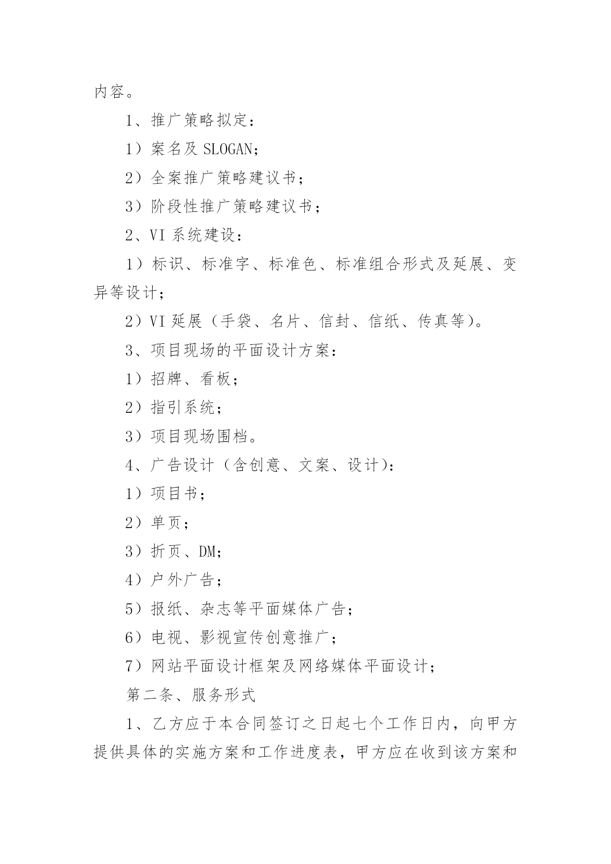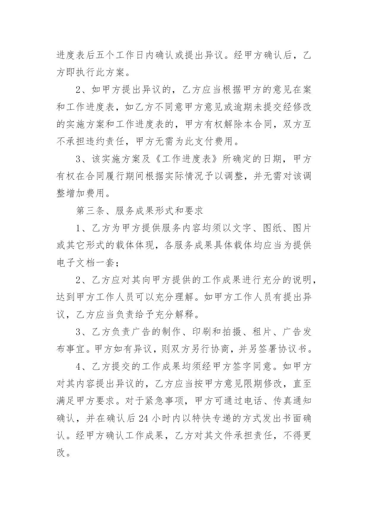 策划合同有关策划合同模板汇总6篇随着广大人民群众法律意识的普遍提高,越来越多事情需要用到合同,签订合同是减少和防止发生争议的重要措施。那么合同要怎么拟定?想必这让大家都很苦恼吧,以下是小编帮大家整理的策划合同6篇,希望对大家有所帮助。策划合同篇1甲方(委托方):乙方(受托方):xx公司甲、乙双方经友好洽谈和协商,甲方决定委托乙方进行网络招商页面策划。为保证项目顺利进行,根据国家有关法律规定,特签订本合同。一、项目任务1.1xx任务一:乙方对甲方xx网络招商开展专项策划,编写招商页面主题文案;1.2任务二:乙方根据甲方已确认招商页面主题文案,进行网页设计制作。二、委托项目进度2.1xx第一阶段:编写策划文案2.1.1xx为期四个工作日,乙方通过对甲方提供的资料进行整理和分析,根据甲方市场推广需要,编写招商页面主题文案。2.1.2xx策划时间自甲方全额付款后,按照乙方要求提供资料后的下一个工作日起算。2.2xx第二阶段:网页设计制作。2.2.1xx为期三个工作日,乙方根据甲方已确认招商页面主题文案和甲方CI规范的要求,进行网页设计制作。2.2.2策划期自甲方联络人以书面形式对第一阶段的策划成果予以确认的下一个工作日起算。2.3xx策划工作各阶段按程序顺延,但实际执行中有一定的交叉,总体累计时间不超过七个工作日。三、甲方责任与权利3.1xx甲方须为乙方工作及时提供所需的.背景资料和信息,并以书面形式指派一到两人作为项目联络人,负责配合乙方工作;3.2xx在乙方提交各阶段成果之后的二个工作日,对乙方提交的阶段性方案给予书面确认或提出书面的指导性意见;四、乙方责任与权利4.1xx乙方须按计划进度完成各阶段策划任务,及时与甲方沟通并请甲方确认;在乙方提交各阶段成果之后的二个工作日,甲方若无确认回函,乙方可视为甲方对所提交的方案已确认;4.2xx乙方须按甲方提出的指导性和标准性要求修改和完善各阶段成果,乙方按甲方要求对文案或平面设计进行修改的时间不计算在总体累计时间之内。4.3保守甲方的商业机密,未经甲方同意,不得向第三方透露本合同履行中涉及的保密内容。五、合同金额及付款方式5.1xx本合同总金额为人民币伍佰捌拾元整(¥580元整)。5.2xx付款方式:签订合同后三日内,甲方向乙方全额支付策划与设计制作费用。5.3xx赠送连锁中国网站分类信息栏目分类下排位,广告形式为(图片/文字链)规格:;使用期限为20xx年xx月xx日至20xx年xx月xx日止,仅限于本项目制作的招商网页。六、成果归属与冠名宣传6.1xx乙方将其最终策划成果于项目结束之日正式转给甲方,所有未被接受的策划方案仍归属乙方;6.2xx乙方对策划成果保留其冠名权;七、违约责任7.1xx由于甲方原因致使本合同无法履行或中断,乙方终止本项目策划,不予退还甲方所付费用;7.2xx由于乙方原因中断本合同履行,乙方收回前期的策划成果,同时退还甲方所付费用;八、合同终止8.1本合同履行完毕自动终止;8.2一方违约并承担责任后自动终止;8.3任何一方无权单方面终止本合同,因不可抗力或者甲乙双方一致同意终止本合同时,须以书面形式确定。九、合同争议本合同履行过程中出现争议时,甲、乙双方本着友好协商原则解决,并以补充协议形式载明;协商不成时,任何一方可向人民法院起诉。十、合同生效日10.1本合同和合同附件经双方盖章,签字后生效。10.2补充合同与本合同具有同等的法律效力。10.3本合同(包括合同附件、补充合同)一式贰份,甲乙双方各执壹份。甲方:(公章)乙方:(公章)法定代表人:xx(签字)法定代表人:xx(签字)地址:xx地址:合同签约地:签约日:xx20xx年xx月xx日策划合同篇2广告策划合同甲方:乙方:就甲方委托乙方完成座落于地区的广告策划、广告创意、形象设计、媒体投放。甲、乙双方根据现行中华人民共和国法律、法规的规定,本着平等互利的原则,经友好协商,就以下条款达成一致:第一条、服务内容根据本合同约定:乙方负责项目准备期及项目实操期的广告策划、创意、设计及媒体投放,建议贵司根据各期间配合乙方各阶段负责的广告策划、创意、设计及媒体投放工作内容。1、推广策略拟定:1)案名及SLOGAN;2)全案推广策略建议书;3)阶段性推广策略建议书;2、VI系统建设:1)标识、标准字、标准色、标准组合形式及延展、变异等设计;2)VI延展(手袋、名片、信封、信纸、传真等)。3、项目现场的平面设计方案:1)招牌、看板;2)指引系统;3)项目现场围档。4、广告设计(含创意、文案、设计):1)项目书;2)单页;3)折页、DM;4)户外广告;5)报纸、杂志等平面媒体广告;6)电视、影视宣传创意推广;7)网站平面设计框架及网络媒体平面设计;第二条、服务形式1、乙方应于本合同签订之日起七个工作日内,向甲方提供具体的实施