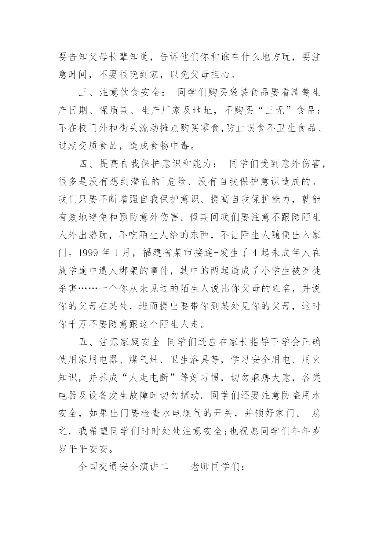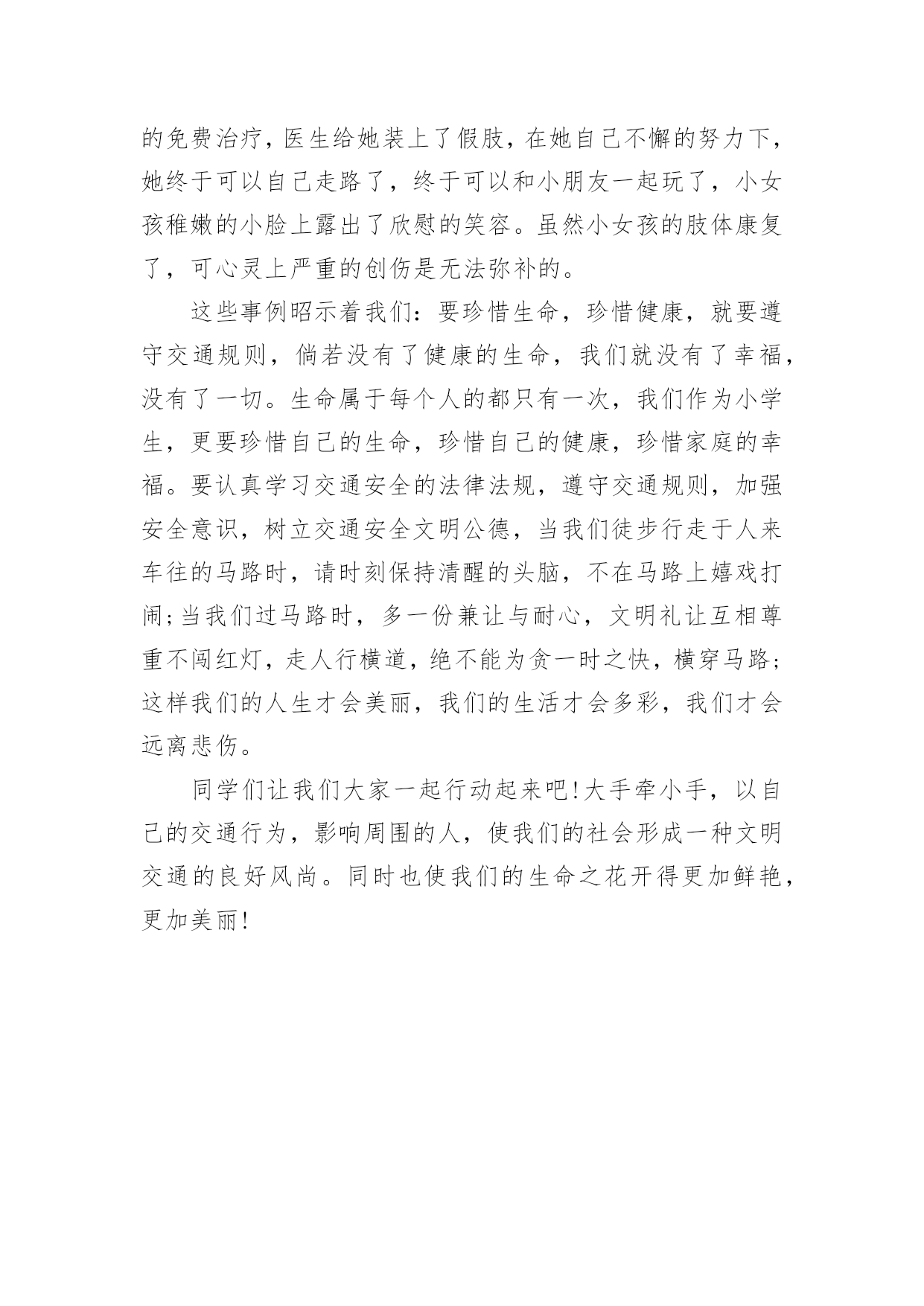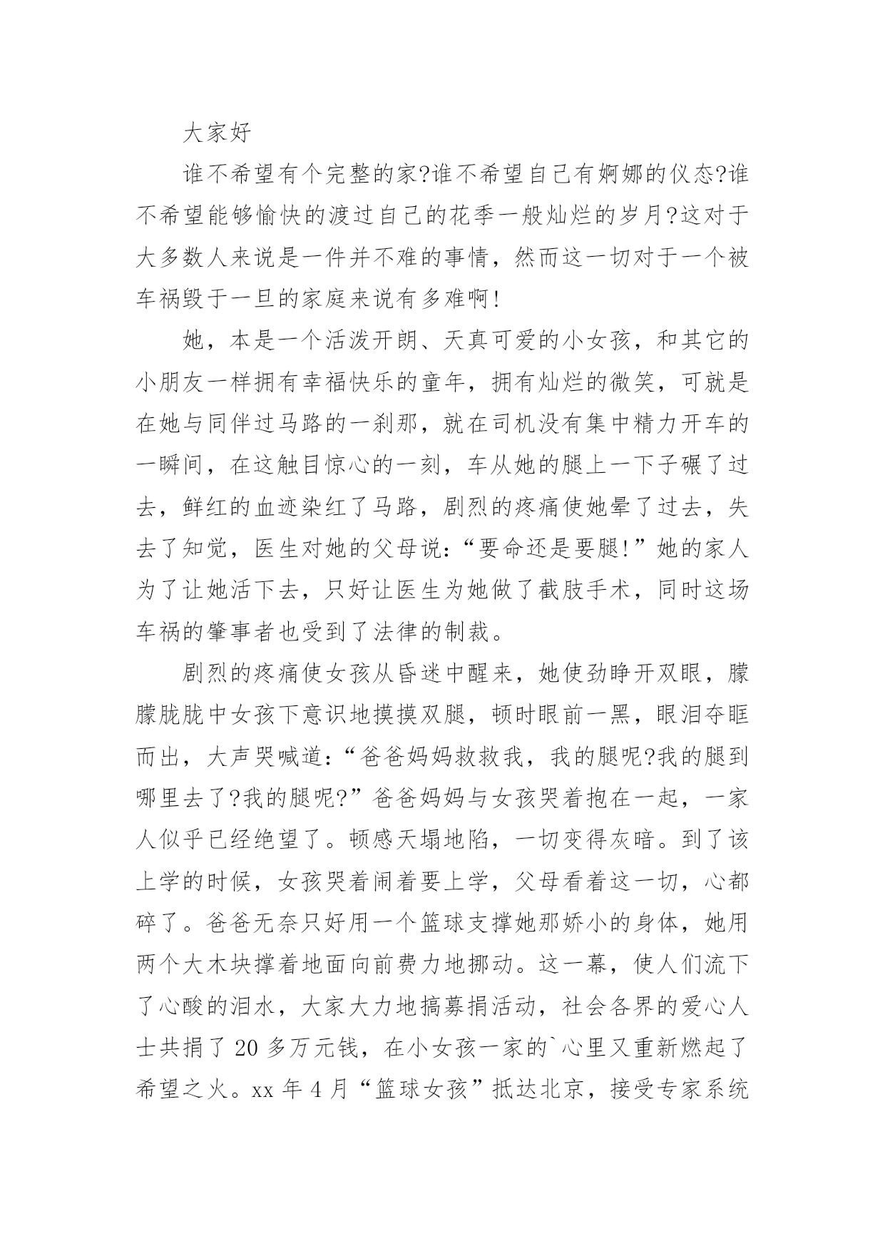 全国交通安全演讲全国交通安全演讲当你行车在路上时,别忘了生命也在赶路。系好安全带,注意交通安全,让每一位关心你的人安心。下面是小编整理的全国交通安全演讲,欢迎来参考!全国交通安全演讲一同学们,4月是安全教育月,今天在这里再次提醒同学们注意以下几个方面的安全问题。一、注意交通安全:现在的交通发展比较快,马路上车辆来来往往非常多,我们更有必要提醒同学们在上放学途中要注意交通安全,也要做好宣传工作,提醒爸爸妈妈注意交通安全。我们提倡同学们做到以下几点:不在马路上踢球;不在马路中间行走,要走马路两旁人行道;过马路不得翻越栏杆和隔离墩,要走人行横道线,还要注意来往车辆;在十字路口,要做到红灯停、绿灯行;不足年岁不骑车上街、骑车不带人、不在公路上骑飞车、不扒车、不拦截撞打车辆;乘车时不向窗外招手探头、乘车须抓紧扶手、车上拥挤时注意锐利物品、车停稳后再下车。二、注意活动安全:在月休假期间要注意安全。特别是父母不在的时候,活动要远离建筑工地、道路等存在安全隐患的场所,比如现在旧道路都在挖掘铺设管道,我们要小心;不到坑、池、塘、沟、河流、施工重地等不安全的地方玩耍;不玩火,不燃放烟花爆竹,防止意外伤害。不进入网吧、电子游戏厅等未成年人禁止活动的场所。如果出门一定要告知父母长辈知道,告诉他们你和谁在什么地方玩,要注意时间,不要很晚到家,以免父母担心。三、注意饮食安全:同学们购买袋装食品要看清楚生产日期、保质期、生产厂家及地址,不购买“三无”食品;不在校门外和街头流动摊点购买零食,防止误食不卫生食品、过期变质食品,造成食物中毒。四、提高自我保护意识和能力:同学们受到意外伤害,很多是没有想到潜在的`危险、没有自我保护意识造成的。我们只要不断增强自我保护意识、提高自我保护能力,就能有效地避免和预防意外伤害。假期间我们要注意不跟随陌生人外出游玩,不吃陌生人给的东西,不让陌生人随便出入家门。1999年1月,福建省某市接连-发生了4起未成年人在放学途中遭人绑架的事件,其中的两起造成了小学生被歹徒杀害……一个你从未见过的陌生人说出你父母的姓名,并说你的父母在某处,进而提出要带你到某处见你的父母,这时你千万不要随意跟这个陌生人走。五、注意家庭安全同学们还应在家长指导下学会正确使用家用电器、煤气灶、卫生浴具等,学习安全用电、用火知识,并养成“人走电断”等好习惯,切勿麻痹大意,各类电器及设备发生故障时切勿擅动。同学们还要注意防盗用水安全,如果出门要检查水电煤气的开关,并锁好家门。总之,我希望同学们时时处处注意安全;也祝愿同学们年年岁岁平平安安。全国交通安全演讲二老师同学们:大家好谁不希望有个完整的家?谁不希望自己有婀娜的仪态?谁不希望能够愉快的渡过自己的花季一般灿烂的岁月?这对于大多数人来说是一件并不难的事情,然而这一切对于一个被车祸毁于一旦的家庭来说有多难啊!她,本是一个活泼开朗、天真可爱的小女孩,和其它的小朋友一样拥有幸福快乐的童年,拥有灿烂的微笑,可就是在她与同伴过马路的一刹那,就在司机没有集中精力开车的一瞬间,在这触目惊心的一刻,车从她的腿上一下子碾了过去,鲜红的血迹染红了马路,剧烈的疼痛使她晕了过去,失去了知觉,医生对她的父母说:“要命还是要腿!”她的家人为了让她活下去,只好让医生为她做了截肢手术,同时这场车祸的肇事者也受到了法律的制裁。剧烈的疼痛使女孩从昏迷中醒来,她使劲睁开双眼,朦朦胧胧中女孩下意识地摸摸双腿,顿时眼前一黑,眼泪夺眶而出,大声哭喊道:“爸爸妈妈救救我,我的腿呢?我的腿到哪里去了?我的腿呢?”爸爸妈妈与女孩哭着抱在一起,一家人似乎已经绝望了。顿感天塌地陷,一切变得灰暗。到了该上学的时候,女孩哭着闹着要上学,父母看着这一切,心都碎了。爸爸无奈只好用一个篮球支撑她那娇小的身体,她用两个大木块撑着地面向前费力地挪动。这一幕,使人们流下了心酸的泪水,大家大力地搞募捐活动,社会各界的爱心人士共捐了20多万元钱,在小女孩一家的`心里又重新燃起了希望之火。xx年4月“篮球女孩”抵达北京,接受专家系统的免费治疗,医生给她装上了假肢,在她自己不懈的努力下,她终于可以自己走路了,终于可以和小朋友一起玩了,小女孩稚嫩的小脸上露出了欣慰的笑容。虽然小女孩的肢体康复了,可心灵上严重的创伤是无法弥补的。这些事例昭示着我们:要珍惜生命,珍惜健康,就要遵守交通规则,倘若没有了健康的生命,我们就没有了幸福,没有了一切。生命属于每个人的都只有一次,我们作为小学生,更要珍惜自己的生命,珍惜自己的健康,珍惜家庭的幸福。要认真学习交通安全的法律法规,遵守交通规则,加强安全意识,树立交通安全文明公德,当我们徒步行走于人来车往的马路时,请时刻保持清醒的头脑,不在马路上嬉戏打闹;当我们过马路时,多一份兼让与耐心,文明礼让互相尊重不闯红灯,走人行横道,绝不能为贪一时之快,横穿马路;这