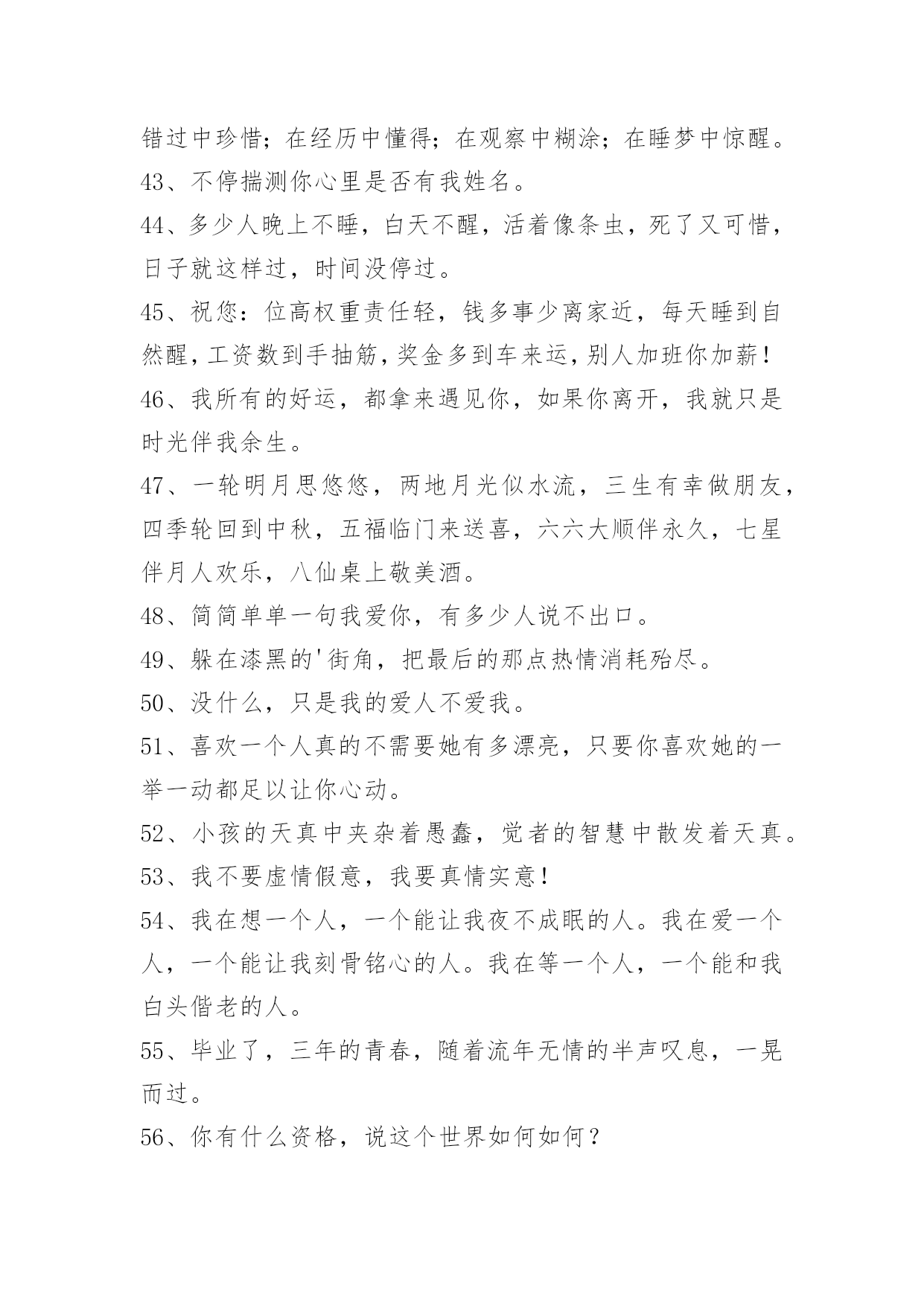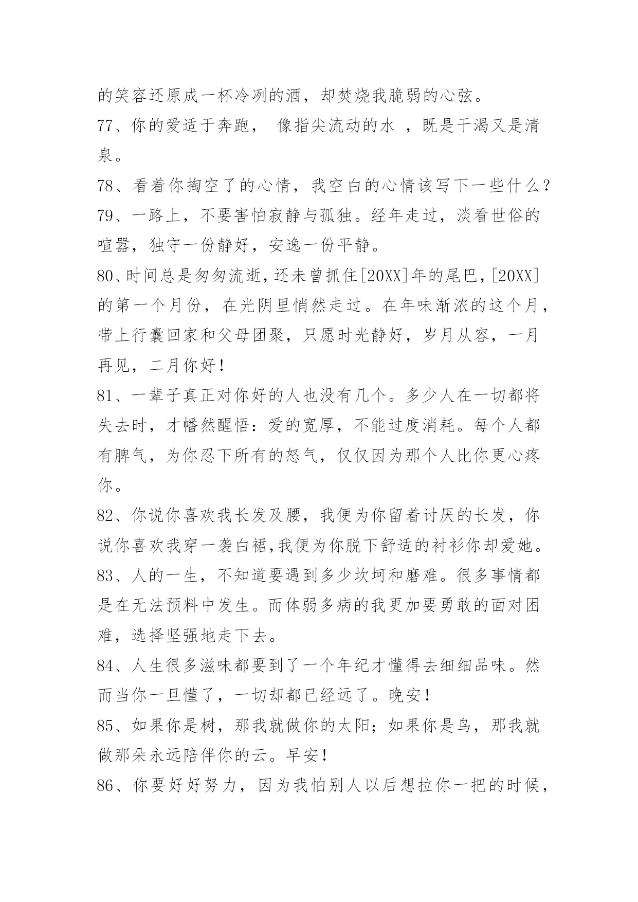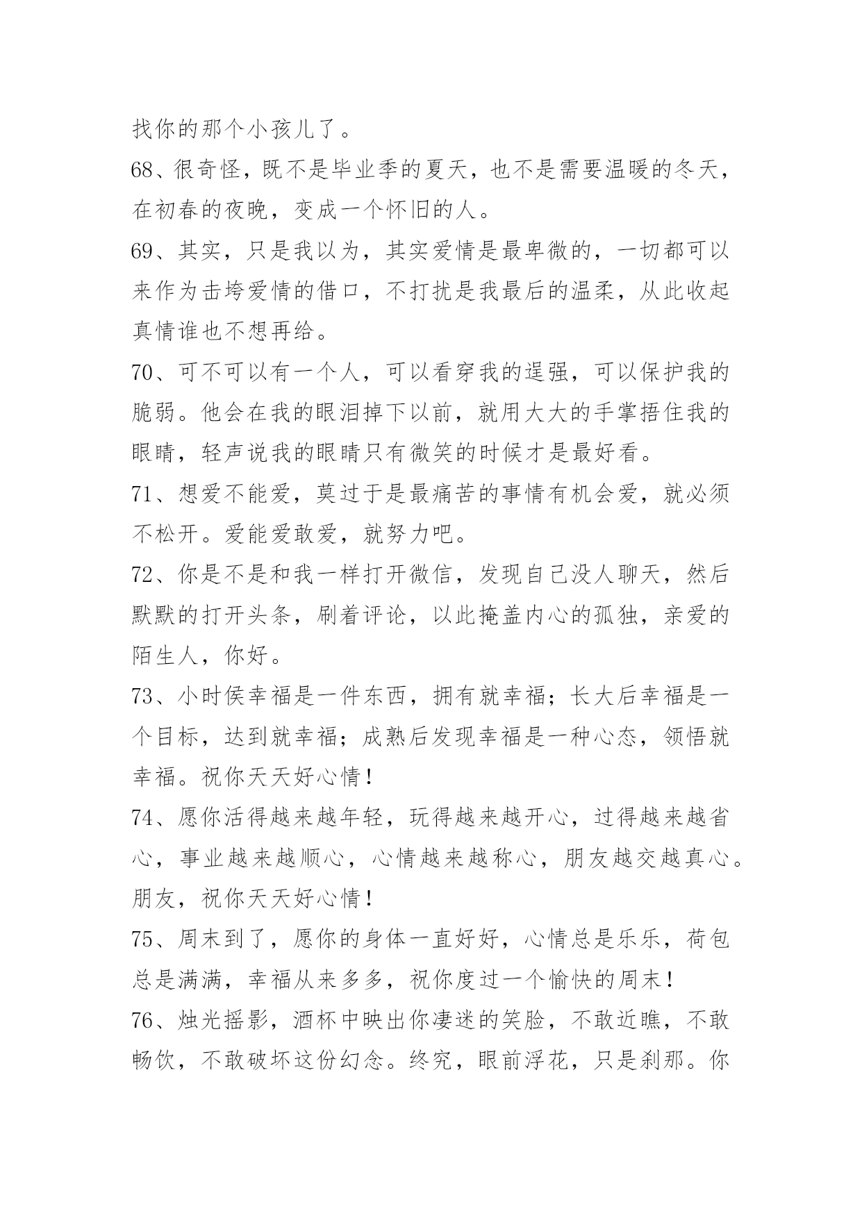 人生的心情语录89条【精华】人生的心情语录大集合89条有些事情,尽管心知肚明,为何还是咫尺天涯。下面是小编给各位读者分享的人生的心情语录89条,一起来欣赏吧。1、如果阴天和晴天交织了,那是因为我想你想得癫狂了。2、相识相知相爱,一路走来是多么的难得,人们常说,风雨后现彩虹。经历过风雨磨练的爱情才会耐得住的时光的打磨。祝愿你俩相爱年年岁岁,成为一对人人羡慕的神仙眷侣。3、我好想你能把我深拥,好想能在你怀里老去。4、我一直就在你身后,可你就是不肯回头。5、我是心甘情愿的,所以没有为什么,只有自己知道那是骗人的。6、我不喜欢写下真实的自己,因为写下的东西太沉重。我喜欢自由放逐,无忧无虑,我喜欢回归从本质上去探索。离高考时间不多了,之后的一笔一划都刻定着部分人生。如果说这里是战场,我却是之中的一个另类,出奇可怕。7、人并非生来就坚强,没人替自己擦泪,就只能变得坚强。8、宁愿坐在摩托车后面紧紧想拥,也不愿坐在小车里相互沉默。9、这个城市,每个人似乎都喝着称作悲伤的饮料,沉淀着浓郁的寂寞。10、我为我所犯的错付出了应有的代价。你的劫难,还未到。等待,并不漫长。11、故事的后来,说过的话可以不算,爱过的人可以再换。12、执着其实是一种负担,甚至是一种苦楚,计较得太多就成了一种羁绊,迷失太久便成了一种痛苦。放弃,不是放弃追求,而是让我们以豁达的心去面对生活。13、新的一天一定要过得比昨天开心。14、所有辛酸与不甘最后都要笑着接受。15、就算你不爱我了,但是我的心里永远有你。16、狂风怒吼,白雪飘飘,我立于原地,等了很久,等到全身沾满了白雪,等到双脚完全冻僵,等到寒风吹痛了脸庞,可你还没来找我,我不敢离开,我害怕你回来之后看不到我,再等等吧,再坚持一下,强忍自语着:不来我再走,不来我再走……雪地中的几滴泪完全与冰雪凝结到一起,最后留下一深一浅的脚印,一步三回头。17、其实我只是想找个爱我的人,狠幸福狠幸福的生活下去。18、不管押韵得有多漂亮,我还是敌不过这旋律的忧伤,音符跳动着我心里不安的倔强。19、不曾落下对你的爱,不曾对你有过半分的敷衍。20、只想自私的拥有着你,可不可以陪着我一切自私。21、要抱着一颗保卫自己的心最大限度的去相信爱情,可以经历伤心的事,但不要伤了心。22、你没事时,给你爸爸打个电话,昨天,再和你爸谈话时,他哭了好几次,我也跟着哭。23、外面的阳光太刺眼,那不是属于我的世界,我只是一个躲在角落独自演绎悲伤的小丑。24、有些伤口可以说出来释怀,就已经平复,但那些哽咽在喉的,一旦触碰,直达心底。25、请来让我们从长计议一个权宜之计。我是说如果你也喜欢碎了之后晶莹剔透的骨头。26、人没办法把自己的手砍掉,人没办法掐住自己的喉咙让自己窒息。你已成为我身体的一部分,我没有办法伤害你。27、忽然发现人在难过的时候,文采都特别好。28、你不爱我那又怎样,我将来找个比你优秀千百倍的,让你眼红。29、我想给我喜欢的人织一条围巾,我希望他每天都可以带着它。30、自从遇见了你,我的心里再也装不下任何人了。31、生活中,很多微笑,明知道虚伪却还强挤着笑容;很多回忆,明知道痛心却还是无法释怀;很多时候,明知道厌倦却始终一成不变;很多放弃,明知道美好却始终不甘离去;很多渴望,明知道无用却始终想得到理解;很多束缚,明知道拉扯,却还是摆脱不了;很多事情,明知道结局却还是想停也停不下。32、我给你的一切,你将永怀占有。33、我不会再轻易的对你许下承诺,许下越多,奢望越大。实现诺言,更小。34、有些人也就是过往,只是允许在记忆里反复放映。不了解自己的另一个表现是,也就是不知道如何的正确的对待自己。或是溺爱放纵,或是自责苛求,总之就是不能以一种平和的方式与自己相处。35、没有家庭的和谐,就没有社会的和谐,没有家庭的平安,就没有整个社会的安宁有序,家和万事兴。36、正所谓:"百年修得同舟,千年修得共枕。"夫妻就是两个半球,"半个球无法滚动,要有另一个半球。"那么夫妻之间如何相处才能使家庭和谐呢?夫妻之间相处要理解、信任、尊重、宽容。它就象握一把沙子,松松地握着,它一点也不会漏,你握得越紧,它漏的就越多。37、别把奢望当梦想,已伸不出想牵的手……38、在游玩的时光中,瞩目一切都是那么美好,天蓝水美,阳光明媚,清风习习,微波荡漾。平日里,社区道旁的花儿也是那么芬芳,草而业是那么青靓。可是,来去匆匆,无心观赏。把心中的审美愿望都寄托于假日旅游上,在旅游中体验生活里少有的美,人们都会十分珍惜旅游时愉悦的心情,犹如沙漠中行走的人珍惜水袋里的一点水一样。39、有人把朋友都留给了我,然后就自顾自的消失了,我可以理解成他不想与我有任何关系吗?40、与所有的人以诚相待,同多数人和睦相处,和少数人常来常往,只跟一个人亲密无间。41、像个孩子一样守在角落,想象你会突然的回过头。42