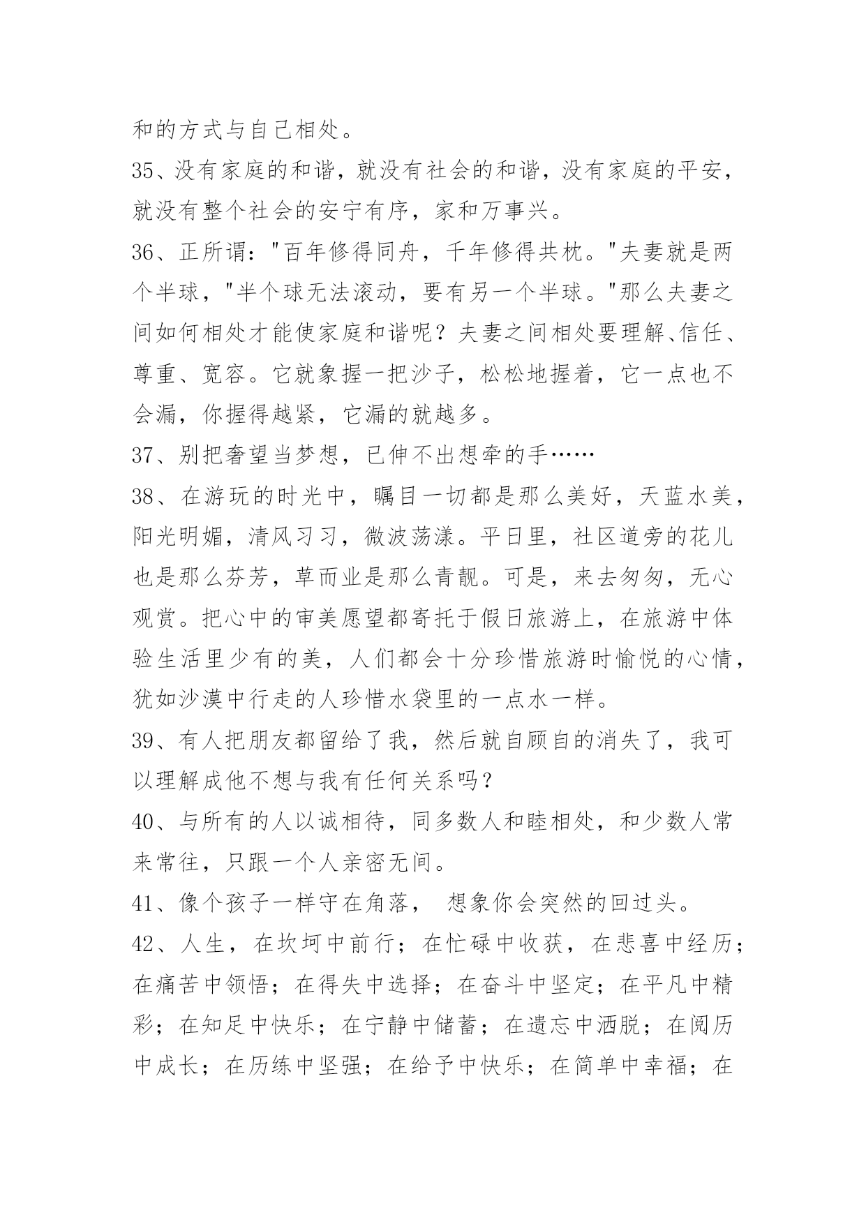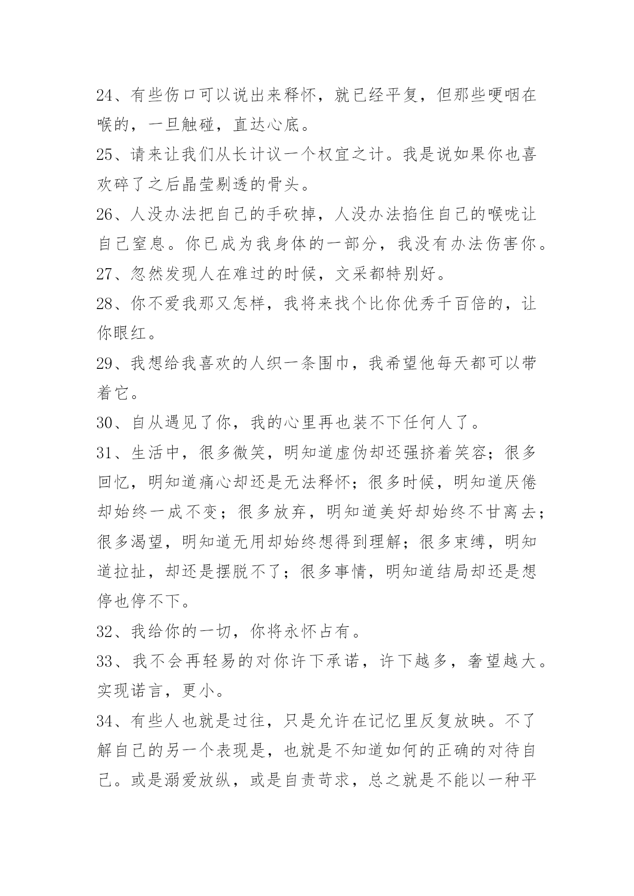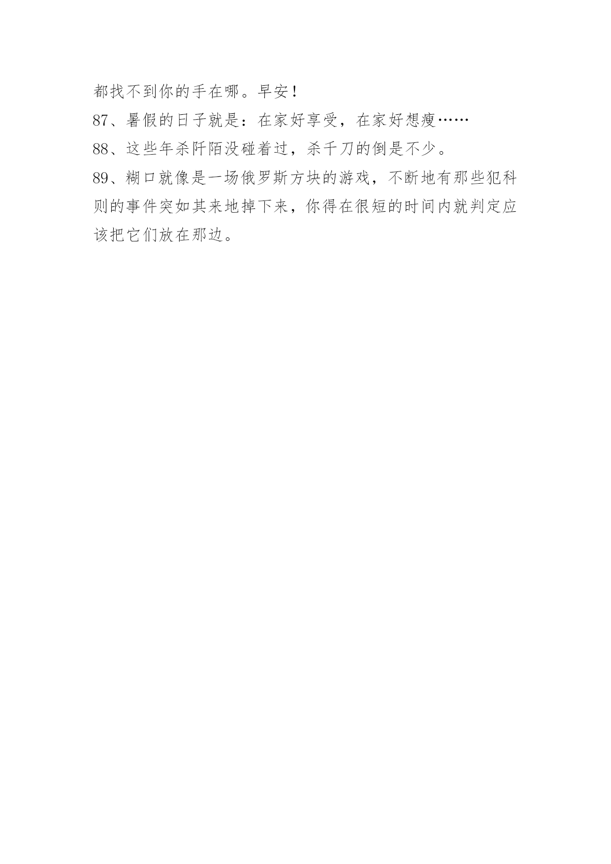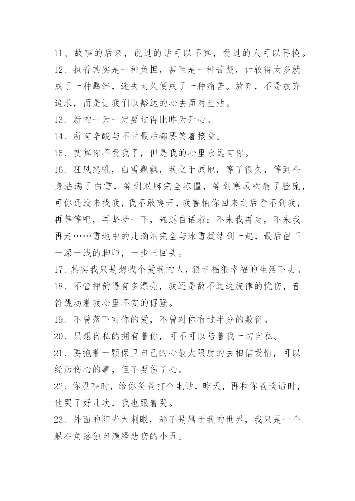 人生的心情语录89条【精华】人生的心情语录大集合89条有些事情,尽管心知肚明,为何还是咫尺天涯。下面是小编给各位读者分享的人生的心情语录89条,一起来欣赏吧。1、如果阴天和晴天交织了,那是因为我想你想得癫狂了。2、相识相知相爱,一路走来是多么的难得,人们常说,风雨后现彩虹。经历过风雨磨练的爱情才会耐得住的时光的打磨。祝愿你俩相爱年年岁岁,成为一对人人羡慕的神仙眷侣。3、我好想你能把我深拥,好想能在你怀里老去。4、我一直就在你身后,可你就是不肯回头。5、我是心甘情愿的,所以没有为什么,只有自己知道那是骗人的。6、我不喜欢写下真实的自己,因为写下的东西太沉重。我喜欢自由放逐,无忧无虑,我喜欢回归从本质上去探索。离高考时间不多了,之后的一笔一划都刻定着部分人生。如果说这里是战场,我却是之中的一个另类,出奇可怕。7、人并非生来就坚强,没人替自己擦泪,就只能变得坚强。8、宁愿坐在摩托车后面紧紧想拥,也不愿坐在小车里相互沉默。9、这个城市,每个人似乎都喝着称作悲伤的饮料,沉淀着浓郁的寂寞。10、我为我所犯的错付出了应有的代价。你的劫难,还未到。等待,并不漫长。11、故事的后来,说过的话可以不算,爱过的人可以再换。12、执着其实是一种负担,甚至是一种苦楚,计较得太多就成了一种羁绊,迷失太久便成了一种痛苦。放弃,不是放弃追求,而是让我们以豁达的心去面对生活。13、新的一天一定要过得比昨天开心。14、所有辛酸与不甘最后都要笑着接受。15、就算你不爱我了,但是我的心里永远有你。16、狂风怒吼,白雪飘飘,我立于原地,等了很久,等到全身沾满了白雪,等到双脚完全冻僵,等到寒风吹痛了脸庞,可你还没来找我,我不敢离开,我害怕你回来之后看不到我,再等等吧,再坚持一下,强忍自语着:不来我再走,不来我再走……雪地中的几滴泪完全与冰雪凝结到一起,最后留下一深一浅的脚印,一步三回头。17、其实我只是想找个爱我的人,狠幸福狠幸福的生活下去。18、不管押韵得有多漂亮,我还是敌不过这旋律的忧伤,音符跳动着我心里不安的倔强。19、不曾落下对你的爱,不曾对你有过半分的敷衍。20、只想自私的拥有着你,可不可以陪着我一切自私。21、要抱着一颗保卫自己的心最大限度的去相信爱情,可以经历伤心的事,但不要伤了心。22、你没事时,给你爸爸打个电话,昨天,再和你爸谈话时,他哭了好几次,我也跟着哭。23、外面的阳光太刺眼,那不是属于我的世界,我只是一个躲在角落独自演绎悲伤的小丑。24、有些伤口可以说出来释怀,就已经平复,但那些哽咽在喉的,一旦触碰,直达心底。25、请来让我们从长计议一个权宜之计。我是说如果你也喜欢碎了之后晶莹剔透的骨头。26、人没办法把自己的手砍掉,人没办法掐住自己的喉咙让自己窒息。你已成为我身体的一部分,我没有办法伤害你。27、忽然发现人在难过的时候,文采都特别好。28、你不爱我那又怎样,我将来找个比你优秀千百倍的,让你眼红。29、我想给我喜欢的人织一条围巾,我希望他每天都可以带着它。30、自从遇见了你,我的心里再也装不下任何人了。31、生活中,很多微笑,明知道虚伪却还强挤着笑容;很多回忆,明知道痛心却还是无法释怀;很多时候,明知道厌倦却始终一成不变;很多放弃,明知道美好却始终不甘离去;很多渴望,明知道无用却始终想得到理解;很多束缚,明知道拉扯,却还是摆脱不了;很多事情,明知道结局却还是想停也停不下。32、我给你的一切,你将永怀占有。33、我不会再轻易的对你许下承诺,许下越多,奢望越大。实现诺言,更小。34、有些人也就是过往,只是允许在记忆里反复放映。不了解自己的另一个表现是,也就是不知道如何的正确的对待自己。或是溺爱放纵,或是自责苛求,总之就是不能以一种平和的方式与自己相处。35、没有家庭的和谐,就没有社会的和谐,没有家庭的平安,就没有整个社会的安宁有序,家和万事兴。36、正所谓:"百年修得同舟,千年修得共枕。"夫妻就是两个半球,"半个球无法滚动,要有另一个半球。"那么夫妻之间如何相处才能使家庭和谐呢?夫妻之间相处要理解、信任、尊重、宽容。它就象握一把沙子,松松地握着,它一点也不会漏,你握得越紧,它漏的就越多。37、别把奢望当梦想,已伸不出想牵的手……38、在游玩的时光中,瞩目一切都是那么美好,天蓝水美,阳光明媚,清风习习,微波荡漾。平日里,社区道旁的花儿也是那么芬芳,草而业是那么青靓。可是,来去匆匆,无心观赏。把心中的审美愿望都寄托于假日旅游上,在旅游中体验生活里少有的美,人们都会十分珍惜旅游时愉悦的心情,犹如沙漠中行走的人珍惜水袋里的一点水一样。39、有人把朋友都留给了我,然后就自顾自的消失了,我可以理解成他不想与我有任何关系吗?40、与所有的人以诚相待,同多数人和睦相处,和少数人常来常往,只跟一个人亲密无间。41、像个孩子一样守在角落,想象你会突然的回过头。42