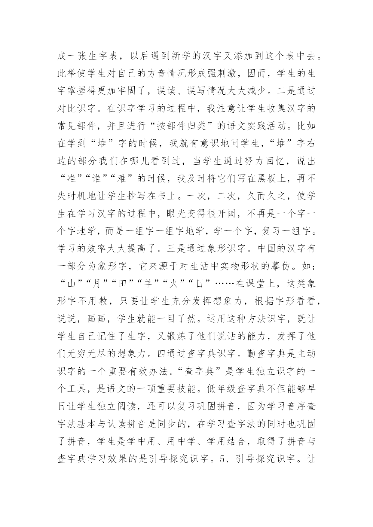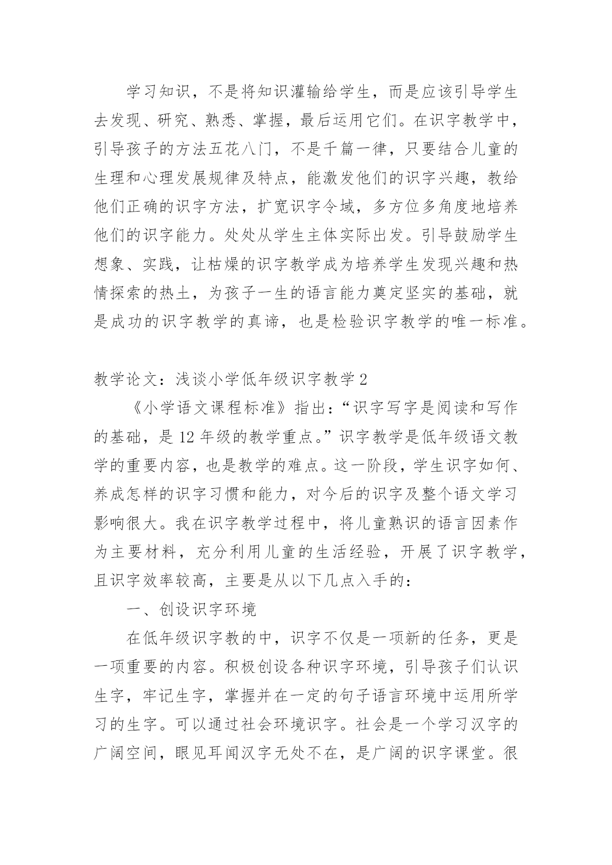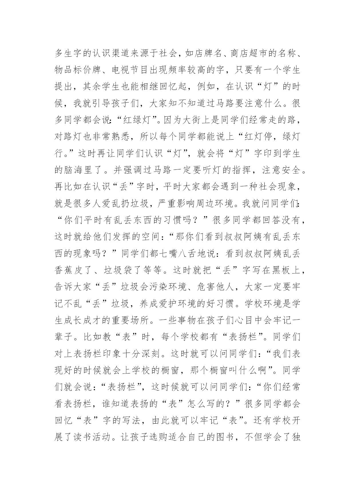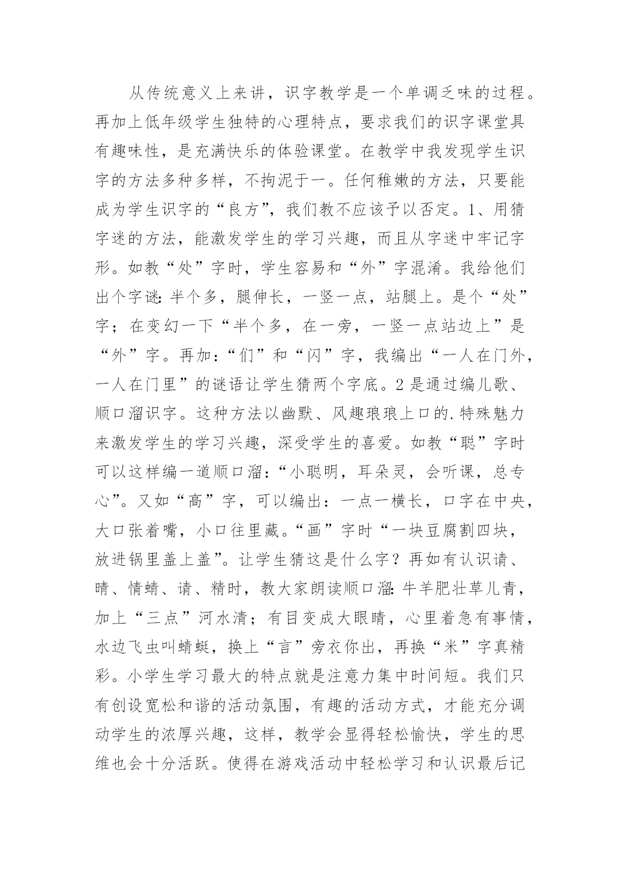 教学论文:浅谈小学低年级识字教学教学论文:浅谈小学低年级识字教学2篇在学习和工作中,大家都有写论文的经历,对论文很是熟悉吧,论文的类型很多,包括学年论文、毕业论文、学位论文、科技论文、成果论文等。相信许多人会觉得论文很难写吧,下面是小编为大家收集的教学论文:浅谈小学低年级识字教学,仅供参考,大家一起来看看吧。教学论文:浅谈小学低年级识字教学1语文是一门基础学科,具人文性和工具性相统一的特点,学习语言,发展思维,陶冶思想情操是它的任务。培养学生正确理解和运用祖国语言文字的能力是它最大的使命,是其它学科无法替代的,因此,在小学语文教学中加强语言文字训练有着极为重要的意义。“万丈高楼平地起”低年级是学习语言的黄金时代,是打好语言基础的关键,科学研究证明,儿童年龄越小,语言发展能力越强。而对于刚走进校园的孩子来说,识字不仅是一项新的任务,更是一项重要任务。所以这一阶段,学生识字如何,养成怎样的识字习惯和能力,对今后的识字及整个语文学习影响很大。因此,如何寻找有效的方法,开展低年级识字教学?就需要我们在教学实践中去研究和探索,对此,我谈谈在教学实践中的几点思考。一、注重识字兴趣的培养。从传统意义上来讲,识字教学是一个单调乏味的过程。再加上低年级学生独特的心理特点,要求我们的识字课堂具有趣味性,是充满快乐的体验课堂。在教学中我发现学生识字的方法多种多样,不拘泥于一。任何稚嫩的方法,只要能成为学生识字的“良方”,我们教不应该予以否定。1、用猜字迷的方法,能激发学生的学习兴趣,而且从字迷中牢记字形。如教“处”字时,学生容易和“外”字混淆。我给他们出个字谜:半个多,腿伸长,一竖一点,站腿上。是个“处”字;在变幻一下“半个多,在一旁,一竖一点站边上”是“外”字。再加:“们”和“闪”字,我编出“一人在门外,一人在门里”的谜语让学生猜两个字底。2是通过编儿歌、顺口溜识字。这种方法以幽默、风趣琅琅上口的.特殊魅力来激发学生的学习兴趣,深受学生的喜爱。如教“聪”字时可以这样编一道顺口溜:“小聪明,耳朵灵,会听课,总专心”。又如“高”字,可以编出:一点一横长,口字在中央,大口张着嘴,小口往里藏。“画”字时“一块豆腐割四块,放进锅里盖上盖”。让学生猜这是什么字?再如有认识请、晴、情蜻、请、精时,教大家朗读顺口溜:牛羊肥壮草儿青,加上“三点”河水清;有目变成大眼睛,心里着急有事情,水边飞虫叫蜻蜓,换上“言”旁衣你出,再换“米”字真精彩。小学生学习最大的特点就是注意力集中时间短。我们只有创设宽松和谐的活动氛围,有趣的活动方式,才能充分调动学生的浓厚兴趣,这样,教学会显得轻松愉快,学生的思维也会十分活跃。使得在游戏活动中轻松学习和认识最后记住“汉字”。3是通过开展丰富多彩的活动,为学生创造展示的机会以激发识字兴趣。让学生进入“游戏乐园”使学生在轻松的氛围中记住汉字并能有效地防止生字回生。如“拼字游戏”“词语接龙”“找朋友”等等。二、是拓宽识字环境,教学课堂无限延伸(一)识字教学不能局限于课堂短短几十分钟有限的空间,而应该利用一有利的空间。例如社会环境识字。在学生的生活环境中,其实是一个学习汉字更为广阔的大环境,为孩子学习汉字方面提供了更为宽广的课堂。例如街道上的“路牌名”、“商店招牌”、“商场”以及各种宣传标语,电视屏幕中经常出现的字,“新闻联播”、“中央电视台”等等,学生都会在无形中通过听、看、问、记。牢记这些字词。(二)是营造良好的校园环境。学校,是学生学习成长成才最重要的场所。在校园里,经常让学生熟悉的“表扬栏”、“宣传栏”、“光荣榜”等等。营造书香环境,享受知识环境的无限乐趣,同时在班级里开展各种知识竞赛。每周、月、期等开展各种“识字明星”、“识字天才”、“字拥大王”等评比活动,并给予精神或者特质奖励,来激起学生识字的渴望和浓厚兴趣。使学生养成自主,自觉识字的习惯。三、是通过多媒体课件制作,调动学习积极性教师可以充分利用现代教学设备,制作生活的教学课件,使原本单一、枯燥的识字教学,配以生动的图画,用生动有趣的画面使学生产生神秘好奇的感觉,来调动学生的多种感观参与识字活动。激起学习去探索这蕴含无穷奥秘的汉字世界的欲望。“字”配“画”恰当地结合,让原本静止不动的汉字活动起来,丰富学生的想象,深刻的记忆,有效地提高学习效率。四、是注重培养识字技巧我国人口众多,方言现象也比较繁多,有许多的方言和通用的普通话差异很突出。这时,如何引导帮助学生学习掌握正确的普通话的读音,是教学的一个难点。(一)在学习一段时间后,掌握了一定量的生字后,可以指导他们按音序排列来把方言音影响严重的音节归类整理出来,反复带学生去区分,多读多练,日积月累,时间长了,就减少了学生读错音,写错神出鬼没现象。(二)是帮助学生通过汉字的部件,偏旁的对比的收集整理、归类,反复把容易混淆,写错的字加以