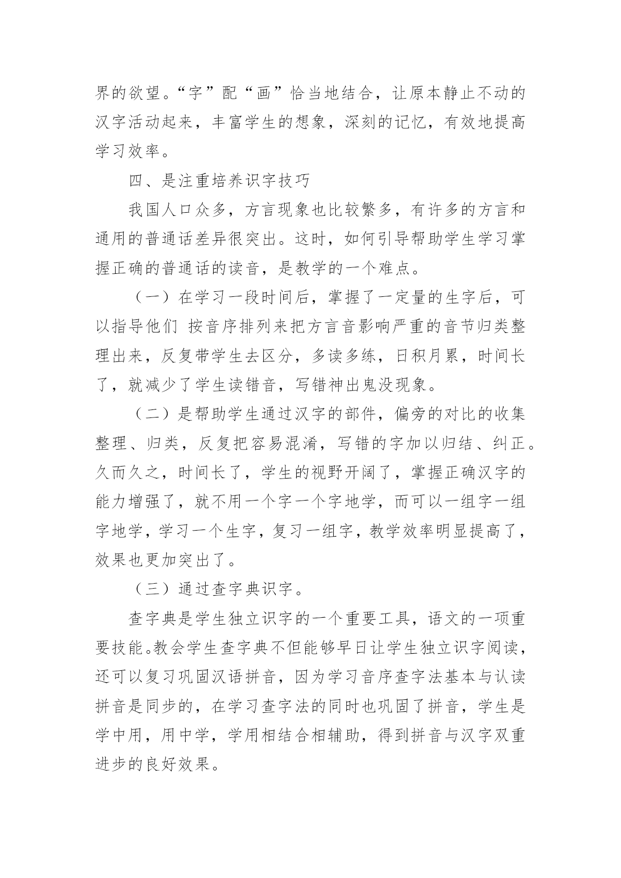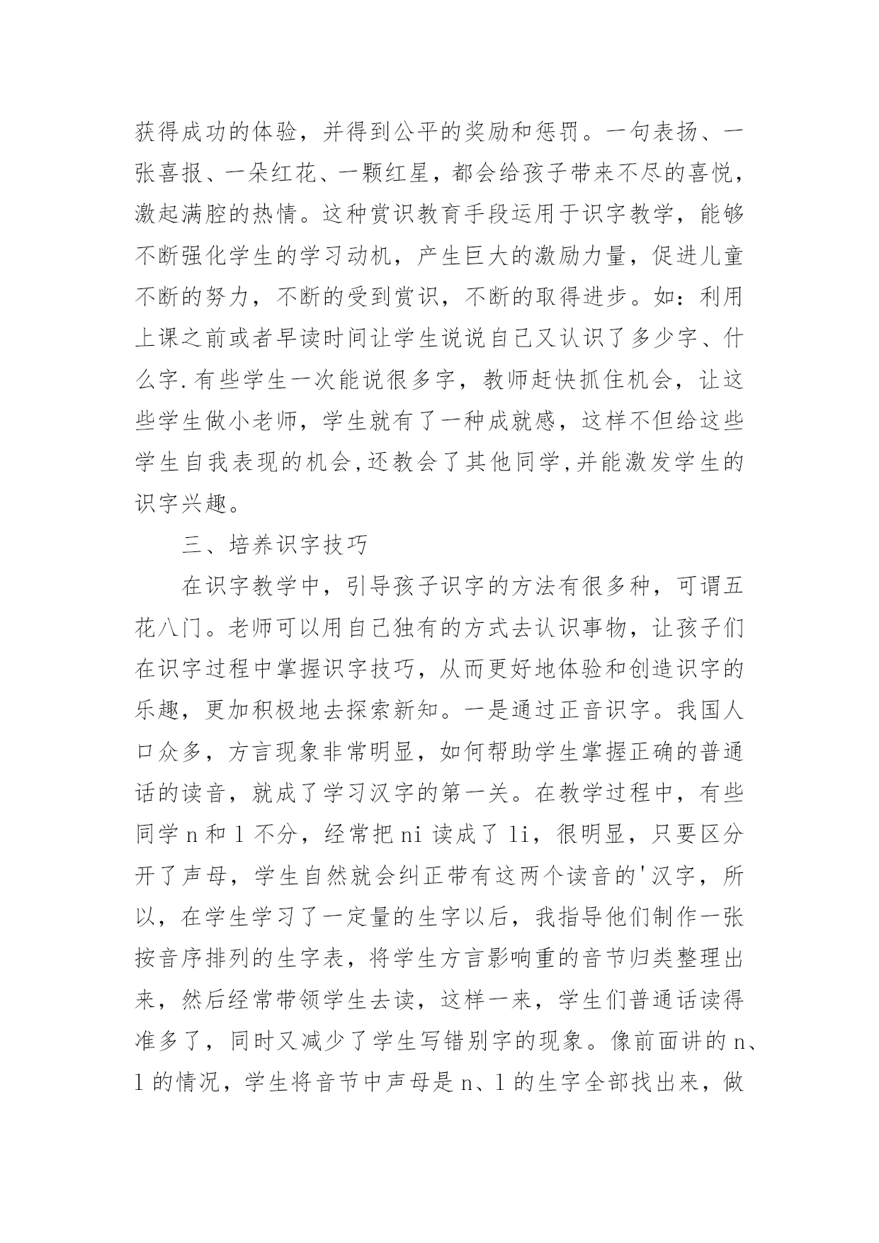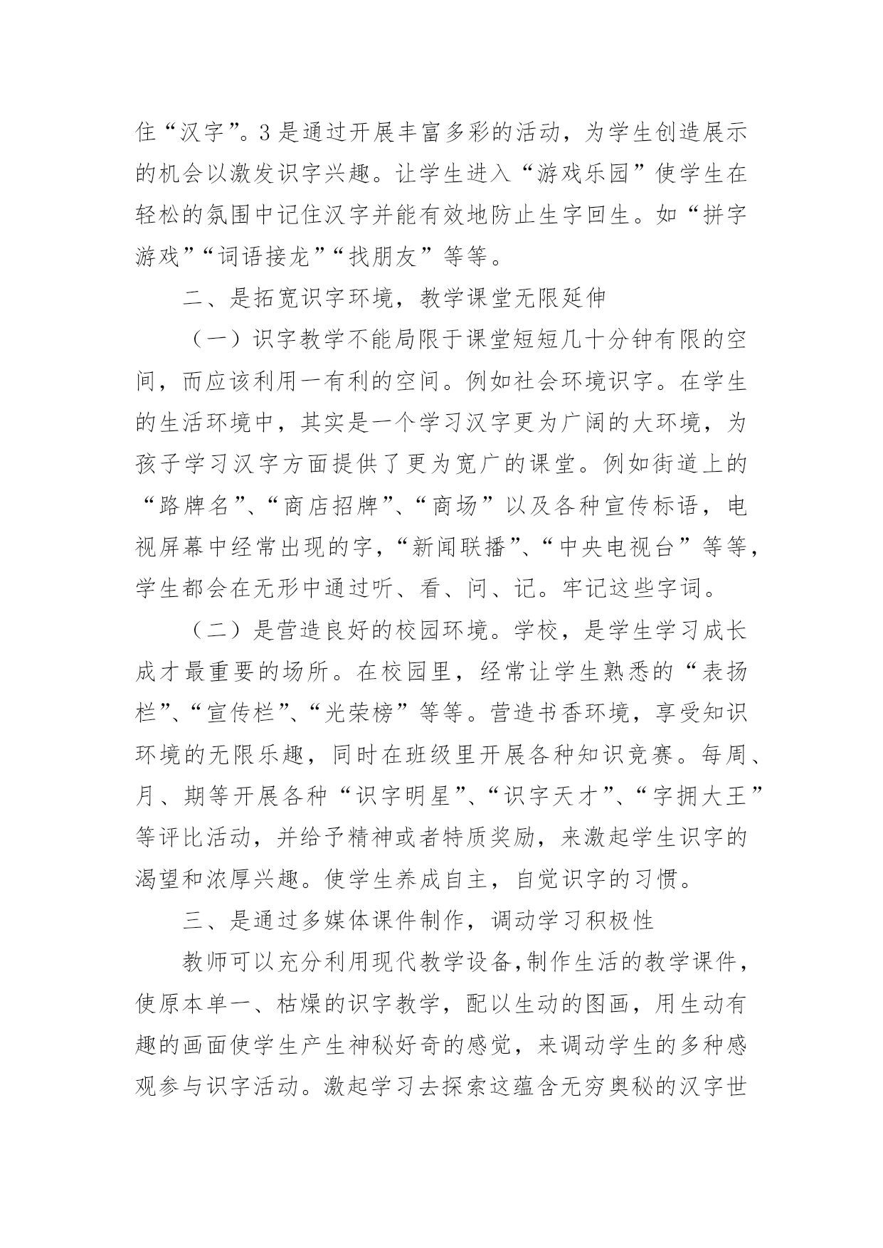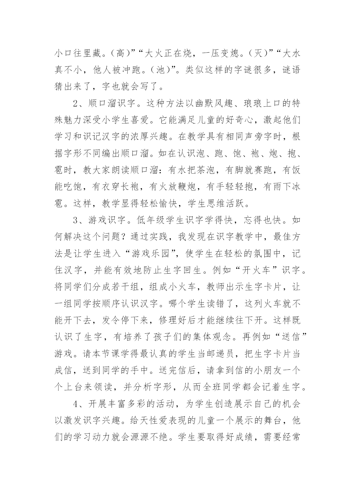 教学论文:浅谈小学低年级识字教学教学论文:浅谈小学低年级识字教学2篇在学习和工作中,大家都有写论文的经历,对论文很是熟悉吧,论文的类型很多,包括学年论文、毕业论文、学位论文、科技论文、成果论文等。相信许多人会觉得论文很难写吧,下面是小编为大家收集的教学论文:浅谈小学低年级识字教学,仅供参考,大家一起来看看吧。教学论文:浅谈小学低年级识字教学1语文是一门基础学科,具人文性和工具性相统一的特点,学习语言,发展思维,陶冶思想情操是它的任务。培养学生正确理解和运用祖国语言文字的能力是它最大的使命,是其它学科无法替代的,因此,在小学语文教学中加强语言文字训练有着极为重要的意义。“万丈高楼平地起”低年级是学习语言的黄金时代,是打好语言基础的关键,科学研究证明,儿童年龄越小,语言发展能力越强。而对于刚走进校园的孩子来说,识字不仅是一项新的任务,更是一项重要任务。所以这一阶段,学生识字如何,养成怎样的识字习惯和能力,对今后的识字及整个语文学习影响很大。因此,如何寻找有效的方法,开展低年级识字教学?就需要我们在教学实践中去研究和探索,对此,我谈谈在教学实践中的几点思考。一、注重识字兴趣的培养。从传统意义上来讲,识字教学是一个单调乏味的过程。再加上低年级学生独特的心理特点,要求我们的识字课堂具有趣味性,是充满快乐的体验课堂。在教学中我发现学生识字的方法多种多样,不拘泥于一。任何稚嫩的方法,只要能成为学生识字的“良方”,我们教不应该予以否定。1、用猜字迷的方法,能激发学生的学习兴趣,而且从字迷中牢记字形。如教“处”字时,学生容易和“外”字混淆。我给他们出个字谜:半个多,腿伸长,一竖一点,站腿上。是个“处”字;在变幻一下“半个多,在一旁,一竖一点站边上”是“外”字。再加:“们”和“闪”字,我编出“一人在门外,一人在门里”的谜语让学生猜两个字底。2是通过编儿歌、顺口溜识字。这种方法以幽默、风趣琅琅上口的.特殊魅力来激发学生的学习兴趣,深受学生的喜爱。如教“聪”字时可以这样编一道顺口溜:“小聪明,耳朵灵,会听课,总专心”。又如“高”字,可以编出:一点一横长,口字在中央,大口张着嘴,小口往里藏。“画”字时“一块豆腐割四块,放进锅里盖上盖”。让学生猜这是什么字?再如有认识请、晴、情蜻、请、精时,教大家朗读顺口溜:牛羊肥壮草儿青,加上“三点”河水清;有目变成大眼睛,心里着急有事情,水边飞虫叫蜻蜓,换上“言”旁衣你出,再换“米”字真精彩。小学生学习最大的特点就是注意力集中时间短。我们只有创设宽松和谐的活动氛围,有趣的活动方式,才能充分调动学生的浓厚兴趣,这样,教学会显得轻松愉快,学生的思维也会十分活跃。使得在游戏活动中轻松学习和认识最后记住“汉字”。3是通过开展丰富多彩的活动,为学生创造展示的机会以激发识字兴趣。让学生进入“游戏乐园”使学生在轻松的氛围中记住汉字并能有效地防止生字回生。如“拼字游戏”“词语接龙”“找朋友”等等。二、是拓宽识字环境,教学课堂无限延伸(一)识字教学不能局限于课堂短短几十分钟有限的空间,而应该利用一有利的空间。例如社会环境识字。在学生的生活环境中,其实是一个学习汉字更为广阔的大环境,为孩子学习汉字方面提供了更为宽广的课堂。例如街道上的“路牌名”、“商店招牌”、“商场”以及各种宣传标语,电视屏幕中经常出现的字,“新闻联播”、“中央电视台”等等,学生都会在无形中通过听、看、问、记。牢记这些字词。(二)是营造良好的校园环境。学校,是学生学习成长成才最重要的场所。在校园里,经常让学生熟悉的“表扬栏”、“宣传栏”、“光荣榜”等等。营造书香环境,享受知识环境的无限乐趣,同时在班级里开展各种知识竞赛。每周、月、期等开展各种“识字明星”、“识字天才”、“字拥大王”等评比活动,并给予精神或者特质奖励,来激起学生识字的渴望和浓厚兴趣。使学生养成自主,自觉识字的习惯。三、是通过多媒体课件制作,调动学习积极性教师可以充分利用现代教学设备,制作生活的教学课件,使原本单一、枯燥的识字教学,配以生动的图画,用生动有趣的画面使学生产生神秘好奇的感觉,来调动学生的多种感观参与识字活动。激起学习去探索这蕴含无穷奥秘的汉字世界的欲望。“字”配“画”恰当地结合,让原本静止不动的汉字活动起来,丰富学生的想象,深刻的记忆,有效地提高学习效率。四、是注重培养识字技巧我国人口众多,方言现象也比较繁多,有许多的方言和通用的普通话差异很突出。这时,如何引导帮助学生学习掌握正确的普通话的读音,是教学的一个难点。(一)在学习一段时间后,掌握了一定量的生字后,可以指导他们按音序排列来把方言音影响严重的音节归类整理出来,反复带学生去区分,多读多练,日积月累,时间长了,就减少了学生读错音,写错神出鬼没现象。(二)是帮助学生通过汉字的部件,偏旁的对比的收集整理、归类,反复把容易混淆,写错的字加以