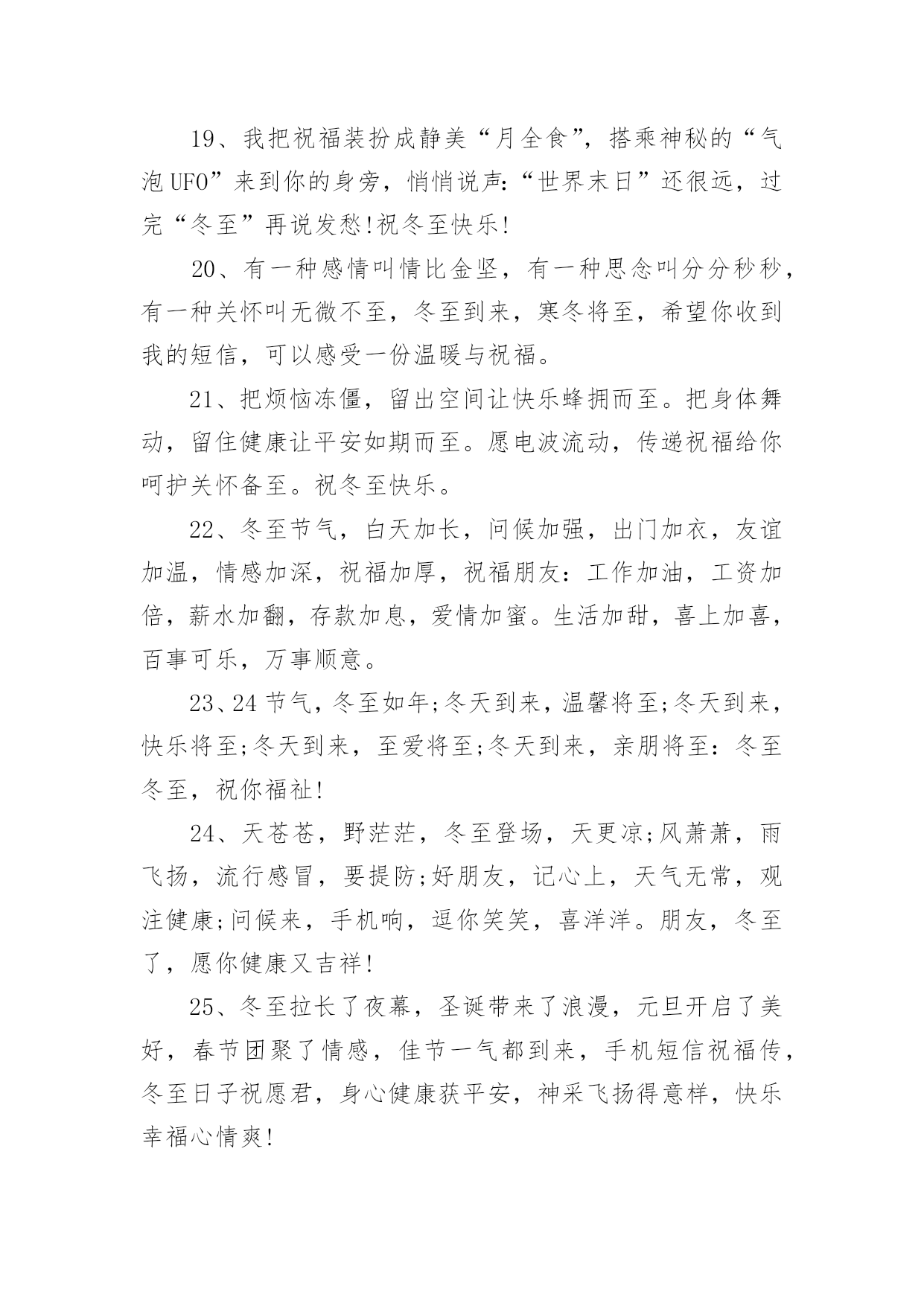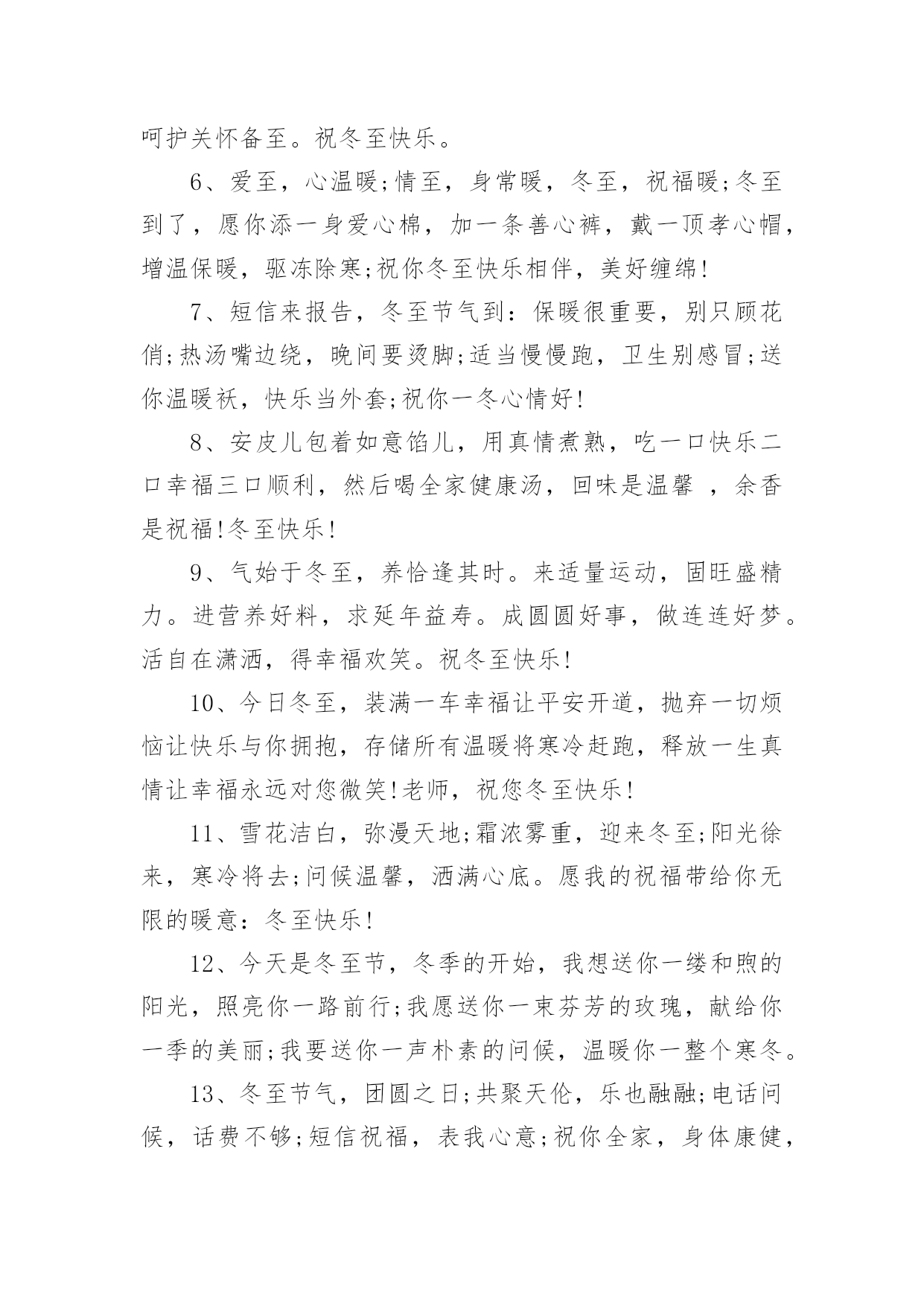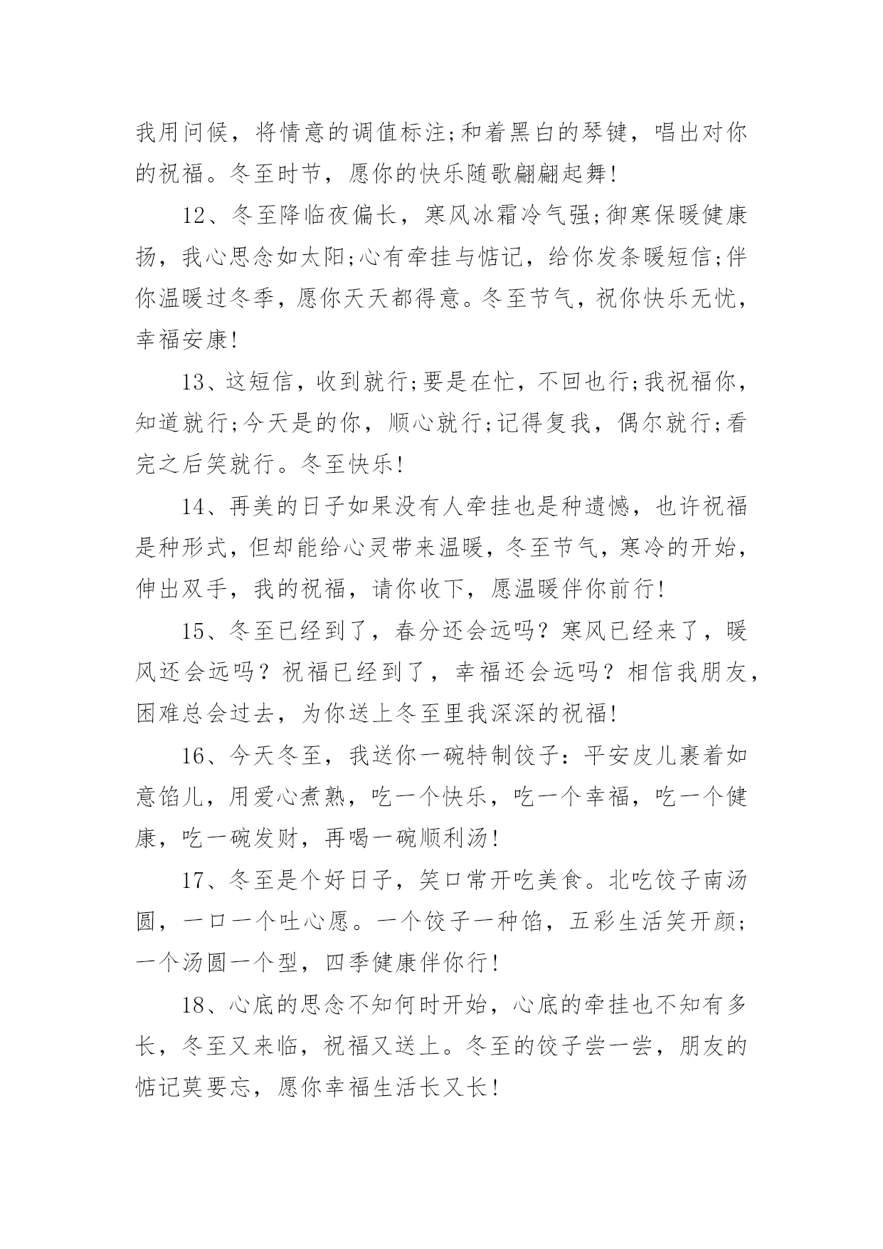冬至最火的走心文案冬至最火的走心文案在日常学习、工作抑或是生活中,越来越多人喜欢发表文案,文案用以展现自己对生活的热爱。什么样的文案才让人眼前一亮呢?下面是小编帮大家整理的冬至最火的走心文案,供大家参考借鉴,希望可以帮助到有需要的朋友。冬至最火的走心文案11、天上雪花飘,冬至已来到,信息送关怀,幸福没有边,悄悄告诉你,早上天气寒,添衣要保暖,运动常锻炼,开心似神仙,挂念记心间,友谊暖心田;愿你总如愿,不忘我挂念;短信传一传,福气冲上天。2、冬至到,夜最长,愿你的生活美荡漾;冬至来,送关怀,愿你的身体健康在;冬至节,传递爱,祝你整个冬季温暖舒适好运来。3、借冬至的东风,送去温暖,愿你无波无折,平安健康。借冬至的冻雪,埋葬烦恼,愿你无克无难,顺意吉祥。冬至到了,祝开心快乐,万事如意。4、冬天的相聚,是雪花和美丽,冬天的团聚,是温暖很给力,冬天的欢聚,是幸福和美丽,冬天的诗句,是祝你永远健康有活力,冬至快乐。5、把烦恼冻僵,留出空间让快乐蜂拥而至。把身体舞动,留住健康让平安如期而至。愿电波流动,传递祝福给你呵护关怀备至。祝冬至快乐。6、爱至,心温暖;情至,身常暖,冬至,祝福暖;冬至到了,愿你添一身爱心棉,加一条善心裤,戴一顶孝心帽,增温保暖,驱冻除寒;祝你冬至快乐相伴,美好缠绵!7、短信来报告,冬至节气到:保暖很重要,别只顾花俏;热汤嘴边绕,晚间要烫脚;适当慢慢跑,卫生别感冒;送你温暖袄,快乐当外套;祝你一冬心情好!8、安皮儿包着如意馅儿,用真情煮熟,吃一口快乐二口幸福三口顺利,然后喝全家健康汤,回味是温馨,余香是祝福!冬至快乐!9、气始于冬至,养恰逢其时。来适量运动,固旺盛精力。进营养好料,求延年益寿。成圆圆好事,做连连好梦。活自在潇洒,得幸福欢笑。祝冬至快乐!10、今日冬至,装满一车幸福让平安开道,抛弃一切烦恼让快乐与你拥抱,存储所有温暖将寒冷赶跑,释放一生真情让幸福永远对您微笑!老师,祝您冬至快乐!11、雪花洁白,弥漫天地;霜浓雾重,迎来冬至;阳光徐来,寒冷将去;问候温馨,洒满心底。愿我的祝福带给你无限的暖意:冬至快乐!12、今天是冬至节,冬季的开始,我想送你一缕和煦的阳光,照亮你一路前行;我愿送你一束芬芳的玫瑰,献给你一季的美丽;我要送你一声朴素的问候,温暖你一整个寒冬。13、冬至节气,团圆之日;共聚天伦,乐也融融;电话问候,话费不够;短信祝福,表我心意;祝你全家,身体康健,生活幸福,合家欢乐;提早祝福,免得占线!14、窗外雪花满天飞,我的祝福随风飞;刺骨寒风使劲吹,我的祝愿积成堆。成堆的祝福和祝愿,全在冬至送给你。祝愿朋友冬至快乐,万事如意,心想事成。15、雪花飘,冬至到,快乐的心情真美妙;吃水饺,吃汤圆,沸气腾腾暖洋洋;短信发,祝福到,祝福的人儿最美丽;祝你暖意洋洋过冬季,平平安安度一生。16、天上雪花飘,冬至已来到,信息送关怀,幸福没有边,悄悄告诉你,早上天气寒,添衣要保暖,运动常锻炼,开心似神仙,挂念记心间,友谊暖心田;愿你总如愿,不忘我挂念;短信传一传,福气冲上天。祝你冬至快乐!17、雪花在天空中飘荡,问候在电波里飞扬,祝福在短信里满装,牵挂在我心头荡漾,汤圆水饺陪伴冬至,快乐幸福环绕心田,愿你健康平安一生。冬至快乐!18、冬至到来鞭炮响,袅袅炊烟雾茫茫。要问何事如此闹,农家冬至祭祖忙。喝水不忘挖井人,龙的'传人不忘根。一年一度祭祖日,焚烧香火报德恩。节哀顺变!19、愿摘下彩色的花,扣上思念许下祝福,愿平安绕你身旁喜悦与你同行,让好运永相随……冬至快乐!20、冬至到了,雪花在空中飞舞,舞出一幅美丽的图画请你欣赏。问候在风中传送,送出一段温馨的话语请你聆听。祝你幸福安康。冬至快乐。21、冬至到,为你送上暖胃煲汤。一碗羊肉汤,洋洋得意喜洋洋。一碗排骨汤,强筋健骨身体壮。一碗狗肉汤,营养滋补更健康。一碗幸运汤,幸福如意添吉祥!查看详情冬至到,为你送上幸运煲汤。送上羊肉汤,祝你:事顺气顺万事顺,洋洋得意无人能挡!送上排骨汤,祝你:缘好财好运气好,排山倒海无人能比!冬至快乐!22、这是冬的尽头,也是春的开头,虽然你在那头,我在这头,还是把你记在心头。在这寒冷的关头,愿我的祝福温暖你的手头,直达你的心头。冬至快乐!23、冬至吉日,阳气回升,白天渐长,夜晚渐短,祝你幸福回升,快乐渐多,烦恼渐少;祝你健康回升,身体渐壮,疾病渐少;祝你友情回升,朋友渐多,敌人减少。冬至快乐!24、冬至之风吹去内心的疲惫,冬至之雪带来亮丽的世界,冬至之阳带来寒冬的温暖,冬至到来象征春天将至的前状。冬至了,真心祝福朋友平安健康,幸福久长!25、冬至到了,节日祝福来了,一句祝福表达我对你真诚的眷恋;一声问候表达我对你无限的挂念;祝你冬至快乐无忧、幸福安康。26、转眼冬至到,养生最重要,养肾防体寒,无忧平阴阳,温食益脾胃,少咸益心脏,早睡早起精神好,多