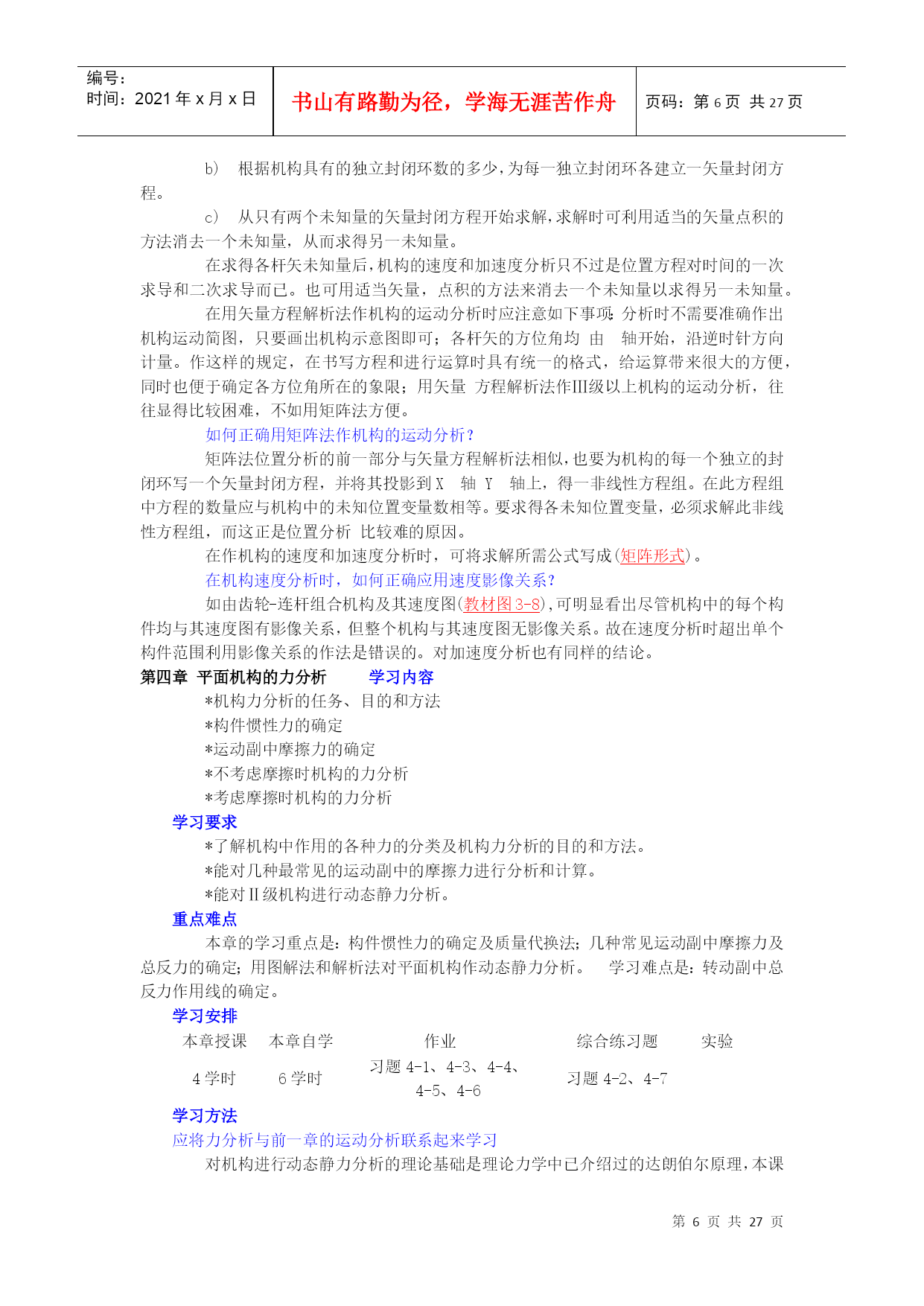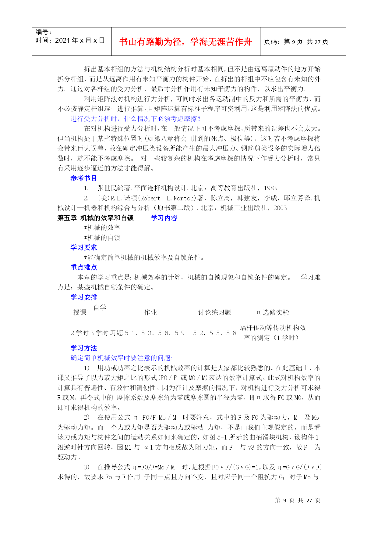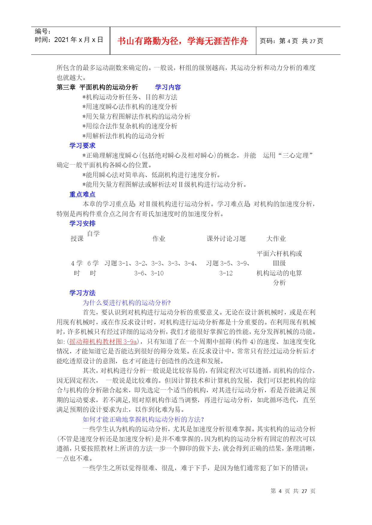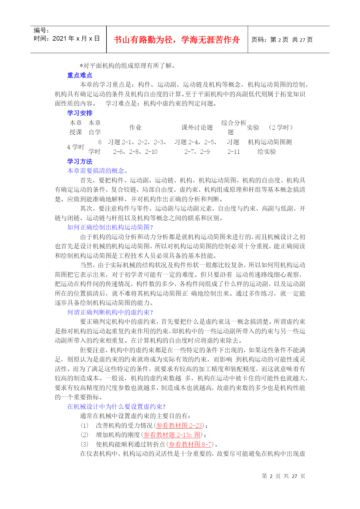 编号:时间:2021年x月x日书山有路勤为径,学海无涯苦作舟页码:第PAGE27页共NUMPAGES27页第PAGE\*MERGEFORMAT27页共NUMPAGES\*MERGEFORMAT27页第一章绪论教学内容*本课程研究的对象和内容*本课程的性质、任务及作用*机械原理学科的发展现状学习要求*明确本课程研究的对象和内容,及其在培养机械类高级工程技术人才全局中的地位、任务和作用。*对机械原理学科的发展现状有所了解。重点难点本章的学习重点是:本课程研究的对象及内容。本章介绍了机器、机构、机械等名词,并通过实例说明各种机器的主要组成部分是各种机构,从而明确了机构是本课程研究的主要对象。当然,由于此时尚未具体学习这些内容,故只能是一个概括的了解。学习安排授课自学观看机械原理电教片1学时1.5学时《中国古代机械》、《工业机器人及其应用》学习方法如何学好本课程。要学好本课程,首先必须对机械在一个国家中的重要作用有明确的认识,机械现在是、将来仍是人类利用和改造自然界的直接执行工具,没有机械的支持,一切现代工程(宇航工程、深海工程、生物工程、通信工程、跨江大桥、过海隧道、摩天大楼、……)都将无法实现。了解机械原理学科发展现状和趋势,既有助于对机械原理课程的深入学习,也有助于让我们深信机械工业将永不停歇地日新月异地迅猛发展。第二章机构的结构分析学习内容*机构的组成(构件、运动副、运动链及机构)*机构运动简图及其绘制*机构具有确定运动的条件*机构自由度的计算*计算平面机构的自由度时应注意的事项*虚约束对机构工作性能的影响及机构结构的合理设计*平面机构的组成原理、结构分类及结构分析*平面机构中的高副低副学习要求*搞清构件、运动副、约束、自由度、运动链及机构等重要概念。*能绘制比较简单的机械机构运动简图。*能正确计算平面机构的自由度并能判断其是否具有确定的运动;对空间机构自由度的计算有所了解。*对虚约束对机构工作性能的影响及机构结构合理设计问题的重要性有所认识。*对平面机构的组成原理有所了解。重点难点本章的学习重点是:构件、运动副、运动链及机构等概念,机构运动简图的绘制,机构具有确定运动的条件及机构自由度的计算。至于平面机构中的高副低代则属于拓宽知识面性质的内容。学习难点是:机构中虚约束的判定问题。学习安排本章授课本章自学作业课外讨论题综合分析题实验(2学时)4学时6学时习题2-1、2-2、2-3、2-6、2-8、2-10习题2-4、2-5、2-7、2-9习题2-11机构运动简图测绘实验学习方法本章需要搞清的概念。首先,要把构件、运动副、运动链、机构、机构运动简图、机构的自由度、机构具有确定运动的条件、复合铰链、局部自由度、虚约束、机构组成原理和杆组等基本概念搞清楚。应做到能准确地解释,并对机构作出正确的分析和判断。其次,要注意构件与零件、运动副与运动副元素、自由度与约束、高副与低副、开链与闭链、运动链与杆组以及机构等概念之间的联系和区别。如何正确绘制出机构运动简图?由于机构的运动分析和动力分析都是就机构运动简图来进行的,而且机械设计之初也首先是设计机械的机构运动简图,所以对机构运动简图的绘制必须十分重视,能正确阅读和绘制机构运动简图是工程技术人员必须具备的基本技能。当然,由于实际机械的结构状况及构件形状一般都比较复杂,所以如何用机构运动简图把它表示出来,对于初学者可能有一定的难度。但只要沿着运动传递路线细心观察,把运动在构件间的传递情况,构件数的多少,各构件间组成了什么样的运动副,以及运动副所在的位置搞清后,就不难将其机构运动简图正确地绘制出来。通过多作练习,就一定能逐步具备绘制机构运动简图的能力。何谓正确判断机构中的虚约束?要正确判定机构中的虚约束,首先要把什么是虚约束这一概念搞清楚。所谓虚约束是指对机构的运动起重复约束作用的约束,即机构中的一些运动副所带入的约束与另一些运动副所带入的约束相重复。在计算机构的自由度时应将虚约束除去。但要注意,机构中的虚约束都是在一些特定的条件下出现的,如果这些条件不能满足,则原认为是虚约束的约束就将成为实际有效的约束,而影响到机构运动的可能性或灵活性。而为了满足这些特定的条件,就要求有较高的加工精度和装配精度,而这就意味着有较高的制造成本。一般说,机构的虚约束数越多,机构在运动中被卡住的可能性也就越大,要求有较高精度的尺度参数也就越多,制造成本也就越高,故虚约束数的多少也是机构性能的一个重要指标。在机械设计中为什么要设置虚约束?通常在机械中设置虚约束的主要目的有:(1)改善机构的受力情况(HYPERLINK"http://222.90.211.66:8002/cms/elite_courses/jixie/kcyuxi/02/2-1.swf"\t"_blank"