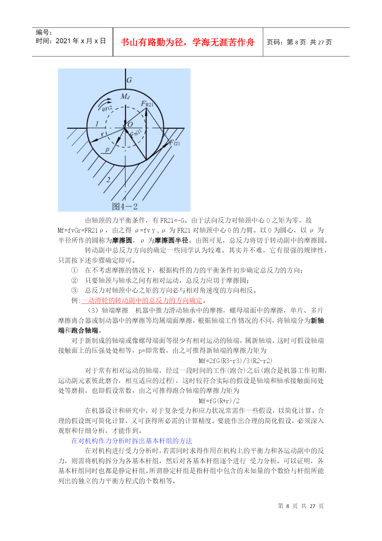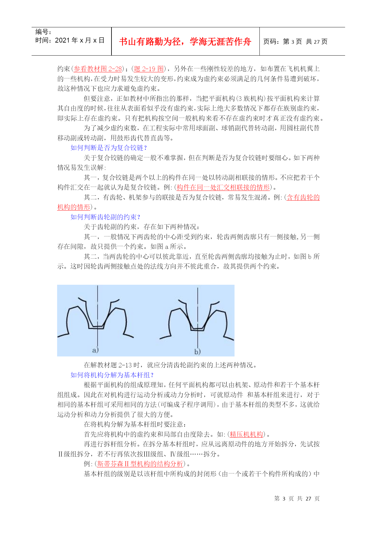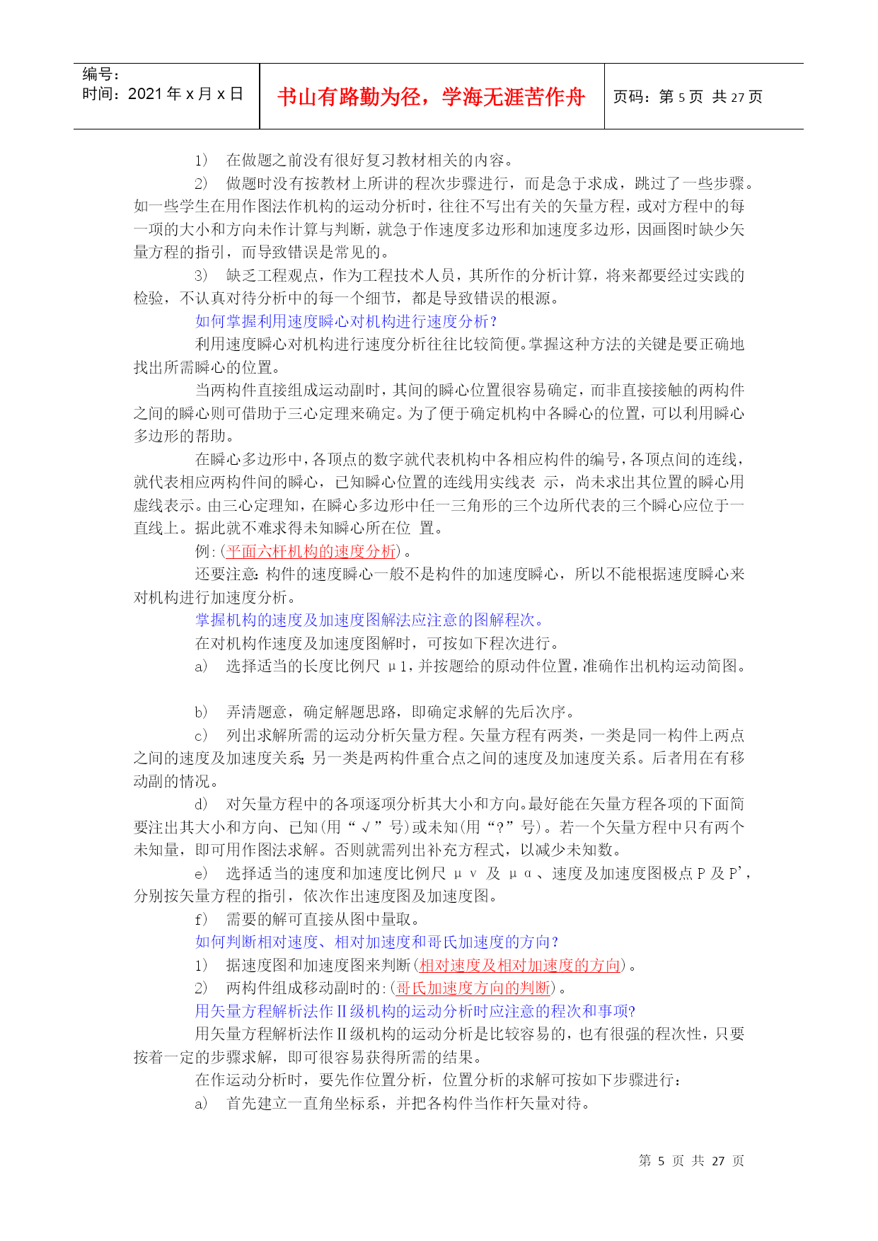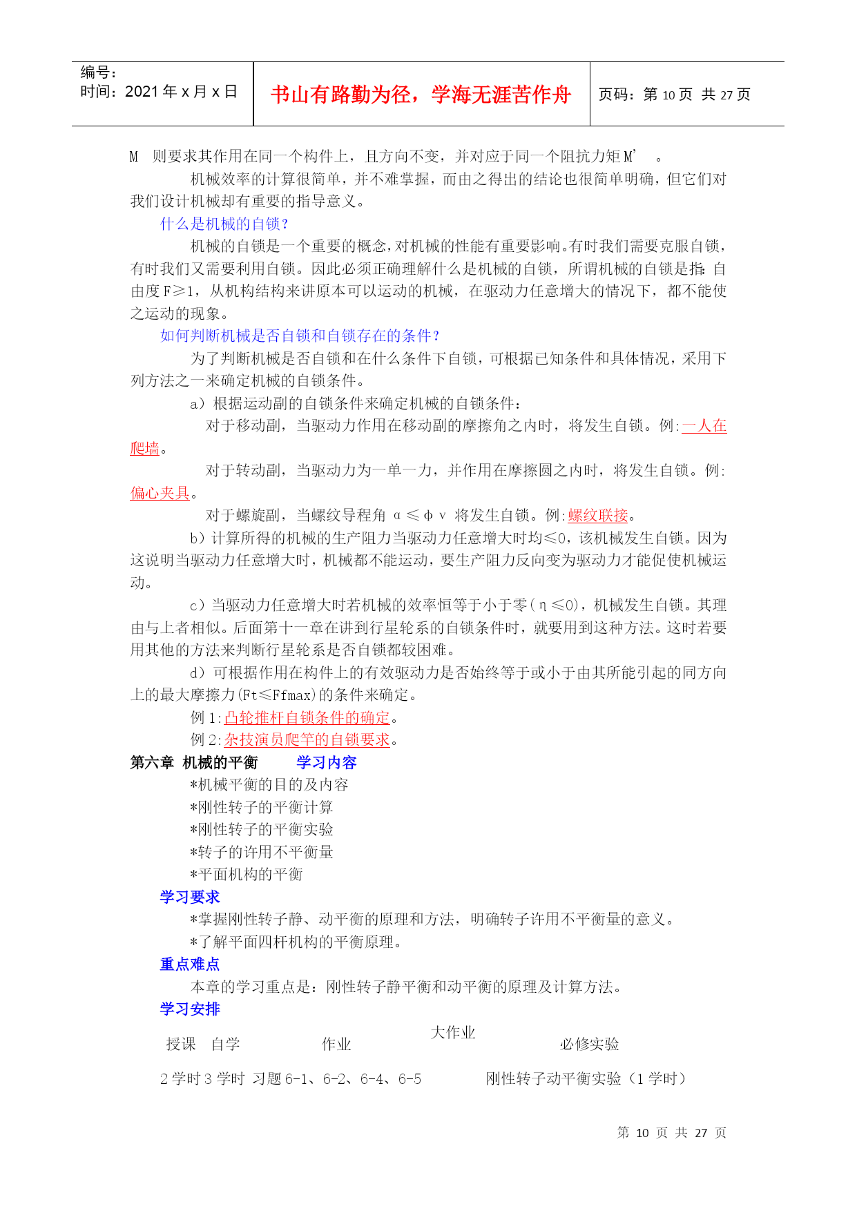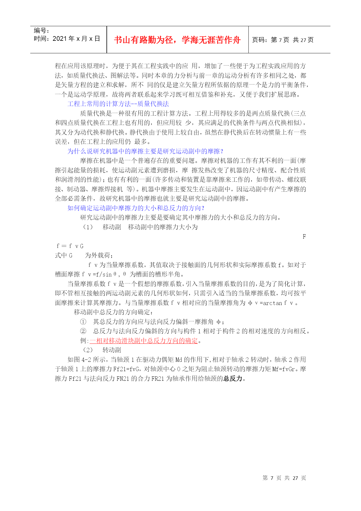 编号:时间:2021年x月x日书山有路勤为径,学海无涯苦作舟页码:第PAGE27页共NUMPAGES27页第PAGE\*MERGEFORMAT27页共NUMPAGES\*MERGEFORMAT27页第一章绪论教学内容*本课程研究的对象和内容*本课程的性质、任务及作用*机械原理学科的发展现状学习要求*明确本课程研究的对象和内容,及其在培养机械类高级工程技术人才全局中的地位、任务和作用。*对机械原理学科的发展现状有所了解。重点难点本章的学习重点是:本课程研究的对象及内容。本章介绍了机器、机构、机械等名词,并通过实例说明各种机器的主要组成部分是各种机构,从而明确了机构是本课程研究的主要对象。当然,由于此时尚未具体学习这些内容,故只能是一个概括的了解。学习安排授课自学观看机械原理电教片1学时1.5学时《中国古代机械》、《工业机器人及其应用》学习方法如何学好本课程。要学好本课程,首先必须对机械在一个国家中的重要作用有明确的认识,机械现在是、将来仍是人类利用和改造自然界的直接执行工具,没有机械的支持,一切现代工程(宇航工程、深海工程、生物工程、通信工程、跨江大桥、过海隧道、摩天大楼、……)都将无法实现。了解机械原理学科发展现状和趋势,既有助于对机械原理课程的深入学习,也有助于让我们深信机械工业将永不停歇地日新月异地迅猛发展。第二章机构的结构分析学习内容*机构的组成(构件、运动副、运动链及机构)*机构运动简图及其绘制*机构具有确定运动的条件*机构自由度的计算*计算平面机构的自由度时应注意的事项*虚约束对机构工作性能的影响及机构结构的合理设计*平面机构的组成原理、结构分类及结构分析*平面机构中的高副低副学习要求*搞清构件、运动副、约束、自由度、运动链及机构等重要概念。*能绘制比较简单的机械机构运动简图。*能正确计算平面机构的自由度并能判断其是否具有确定的运动;对空间机构自由度的计算有所了解。*对虚约束对机构工作性能的影响及机构结构合理设计问题的重要性有所认识。*对平面机构的组成原理有所了解。重点难点本章的学习重点是:构件、运动副、运动链及机构等概念,机构运动简图的绘制,机构具有确定运动的条件及机构自由度的计算。至于平面机构中的高副低代则属于拓宽知识面性质的内容。学习难点是:机构中虚约束的判定问题。学习安排本章授课本章自学作业课外讨论题综合分析题实验(2学时)4学时6学时习题2-1、2-2、2-3、2-6、2-8、2-10习题2-4、2-5、2-7、2-9习题2-11机构运动简图测绘实验学习方法本章需要搞清的概念。首先,要把构件、运动副、运动链、机构、机构运动简图、机构的自由度、机构具有确定运动的条件、复合铰链、局部自由度、虚约束、机构组成原理和杆组等基本概念搞清楚。应做到能准确地解释,并对机构作出正确的分析和判断。其次,要注意构件与零件、运动副与运动副元素、自由度与约束、高副与低副、开链与闭链、运动链与杆组以及机构等概念之间的联系和区别。如何正确绘制出机构运动简图?由于机构的运动分析和动力分析都是就机构运动简图来进行的,而且机械设计之初也首先是设计机械的机构运动简图,所以对机构运动简图的绘制必须十分重视,能正确阅读和绘制机构运动简图是工程技术人员必须具备的基本技能。当然,由于实际机械的结构状况及构件形状一般都比较复杂,所以如何用机构运动简图把它表示出来,对于初学者可能有一定的难度。但只要沿着运动传递路线细心观察,把运动在构件间的传递情况,构件数的多少,各构件间组成了什么样的运动副,以及运动副所在的位置搞清后,就不难将其机构运动简图正确地绘制出来。通过多作练习,就一定能逐步具备绘制机构运动简图的能力。何谓正确判断机构中的虚约束?要正确判定机构中的虚约束,首先要把什么是虚约束这一概念搞清楚。所谓虚约束是指对机构的运动起重复约束作用的约束,即机构中的一些运动副所带入的约束与另一些运动副所带入的约束相重复。在计算机构的自由度时应将虚约束除去。但要注意,机构中的虚约束都是在一些特定的条件下出现的,如果这些条件不能满足,则原认为是虚约束的约束就将成为实际有效的约束,而影响到机构运动的可能性或灵活性。而为了满足这些特定的条件,就要求有较高的加工精度和装配精度,而这就意味着有较高的制造成本。一般说,机构的虚约束数越多,机构在运动中被卡住的可能性也就越大,要求有较高精度的尺度参数也就越多,制造成本也就越高,故虚约束数的多少也是机构性能的一个重要指标。在机械设计中为什么要设置虚约束?通常在机械中设置虚约束的主要目的有:(1)改善机构的受力情况(HYPERLINK"http://222.90.211.66:8002/cms/elite_courses/jixie/kcyuxi/02/2-1.swf"\t"_blank"