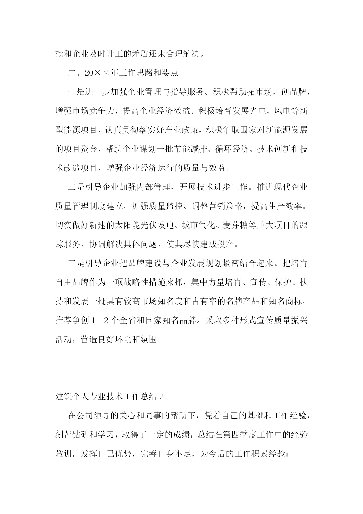 建筑个人专业技术工作总结23篇建筑个人专业技术工作总结1一、质量振兴工作及取得的成效(一)加强组织领导,健全完善机构。及时调整成立了一把手任组长的质量振兴工作领导小组,领导小组下设办公室,负责质量振兴工作的组织协调、指导监督和考核检查等工作。并安排专人处理日常工作。把质量工作纳入局干部工作目标管理责任书考核。据内部召开会议定期研究质量工作并及时解决疑难问题。同时,结合工业企业实际,制定下发了《高台县工业和信息化局关于印发xxxx年质量振兴工作计划》(高工信发[xxxx]35号),明确了指导思想、主要目标、工作重点、主要措施。(二)强化工作措施,工作落实到位。1、强化监管抓效益,运行质量稳步提升。狠抓企业运行调控和协调服务,加大对企业运行的监测和调控,通过深入企业调研、召开企业现场办公会议等措施,加强对重点行业和龙头企业的跟踪监测和走访调研,对全县主要工业产品产量、销售动态、价格变动等经济运行情况进行全面的监测和汇总分析,积极协调解决生产经营中涉及的电力供应、原材料供应等一些困难和问题。充分利用“政企信息化平台”,加强对企业的指导联系,及时传达落实上级有关政策,对水、电、煤、油、气、运输、用工等生产要素进行协调调度,有力的促进了工业企业健康快速发展。立足现有企业,认真抓好企业成长工程,通过技术改造、质量提升、品牌战略和资金扶持等措施,帮助企业扩大生产规模,提升经济效益,推动企业跨入规上企业行列。目前,博峰肥牛公司、方正塑业公司、恒泰新型节能建材公司3户企业已成长为规模以上企业,并纳入国家规模以上企业名库,使我县的规模以上工业企业达到24户,实现了工业经济总量扩张和质量提高。元至8月份,全县工业企业完成增加值6.9亿元,同比增长18.7%。其中:24户规模以上工业企业完成增加值xxx元,同比增长21.9%。预计12月,预计完成工业增加值12.89亿元,同比增长23%;规模以上工业增加值9亿元,同比增长25%。2、加强企业服务,挖潜改造增活力。切实做好企业质量振兴工作,把工作落到实处,每月对重点工业企业经济指标和工业产品进行统计,加强企业经济运行和产品质量管理,建立企业质量档案,做好分类指导,有的放矢的开展好服务企业工作。重点企业产品质量合格率达到100%,中小企业产品质量合格率达到85%以上,产品执行标准覆盖率达到98%以上。并大力引导企业开展iSo9000、iSo9001、iSo14000质量认证工作,进一步加强企业质量体系建设,增强产品在国内和国际市场上的竞争力。同时,加强对企业的政策扶持、产业引导和信贷支持,引导企业进行技术创新和技术引进,加快企业技术改造步伐,狠抓产业产品巩固提高和升级换代,实现工业经济的总量扩张和质量提高,不断提高企业的经济效益。安泰硅塑复合材料有限责任公司生产的农田废旧地膜回收再利用技术系列产业化新技术,已申请相关部门的鉴定,其中的模压组合式立体花柱、已申请专利。3、优化环境抓项目,发展基础不断夯实。为了严格市场监管体系,深入推进行政审批制度改革,在政务大厅设立办公窗口,建立完善了重点工作项目审批服务体系,实行“一条龙”、“一站式”服务,方便群众办事。大力推进诚信体系建设,着力营造优质高效服务环境,保证现有企业的正常生产。年初筛选确定各类工业项目39个(亿元以上项目18个,千万元以上项目21个),计划总投资138亿元,当年计划投资66.2亿元。其中:新建工业项目21个,总投资78.5亿元,当年计划投资48。5亿元。预计完成工业固定资产投资16.5亿元,同比增长45%。新建工业项目11项,已完成工业固定资产投资3亿元,预计年底完成工业固定资产投资3.5亿元。续建项目完成工业固定资产投资12.4亿元,预计年底完成工业固定资产投资13亿元。金苹果种业公司种子加工厂建设、会海矿业公司砂铁磁选、澳泰商品混凝土有限公司年产40万立方米商品混凝土搅拌站建设、旺达绿禾肥业公司15万吨肥料4个项目已建成。华浩环保能源公司20兆瓦光伏发电、知非实业公司年产300万平方米新型节能环保建筑材料、甘肃金明生物科技公司食品精深加工等11个项目已开工建设。汇能公司50兆瓦光伏发电、高山新能源公司40兆瓦光伏发电、凯迪绿色能源开发公司生物质能发电等6个项目正在做开工前的准备工作;续建项目12个,总投资32.5亿元,当年计划投资17.6亿元,其中:聚合热力公司城市气化工程、润民生物公司10万吨高麦芽糖浆循环利用、天鸿生化公司4.2亿毫升免疫马血清生产等8个项目已开工建设;目前正在开展前期工作或对接洽谈的项目6个,计划总投资26.9亿元。分别是:陕西春秋庄园农业科技有限公司葡萄酒庄及基地建设项目、江苏中海集团铁砂精选铸造项目、晋昌源煤业有限公司lnG焦炉煤气保卡利用制取天然气项目、晋昌源煤业有限公司物流园建设一期项目、中盐