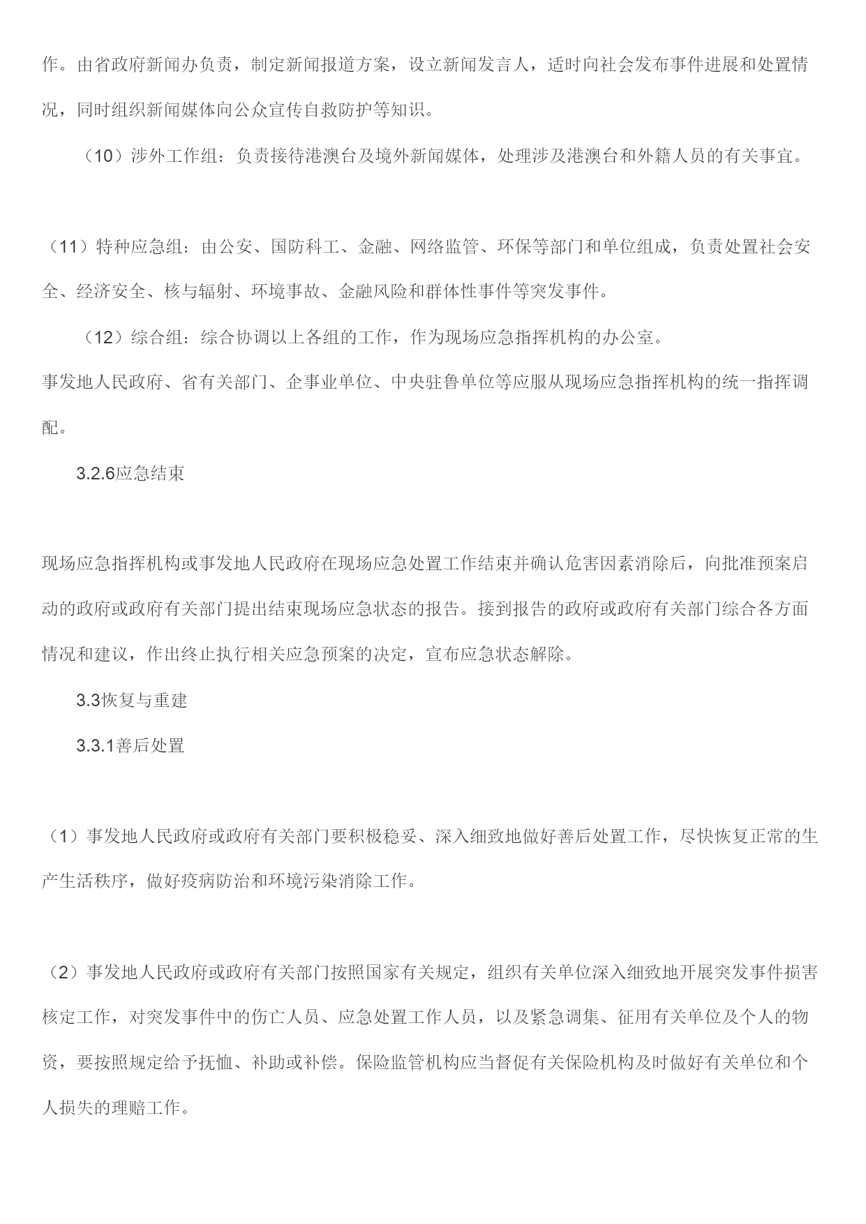 山东省突发公共事件总体应急预案1总则1.1编制目的提高政府保障公共安全和处置突发事件的能力,最大程度地预防和减轻突发事件引起的社会危害,保障公众的生命财产安全,维护国家安全和社会稳定,促进全省经济社会科学发展、和谐发展、率先发展,实现富民强省的新跨越。1.2编制依据依据《宪法》、《突发事件应对法》及《国家突发公共事件总体应急预案》,结合山东实际,制定本预案。1.3分类分级本预案所称突发事件,是指突然发生,造成或者可能造成严重社会危害,需要采取应急处置措施予以应对的自然灾害、事故灾难、公共卫生和社会安全事件。(1)自然灾害。主要包括水旱灾害,气象灾害,地震灾害,地质灾害,海洋灾害,生物灾害和森林火灾等。(2)事故灾难。主要包括工矿商贸等企业的各类安全事故,交通运输事故,公共设施和设备事故,核与辐射事故,环境污染和生态破坏事件等。(3)公共卫生事件。主要包括传染病疫情,群体性不明原因疾病,食品安全和职业危害,动物疫情以及其他严重影响公众健康和生命安全的事件。(4)社会安全事件。主要包括恐怖袭击事件,民族宗教事件,经济安全事件,涉外突发事件和群体性事件等。上述各类突发事件往往是相互交叉和关联的,某类突发事件可能和其他类别的事件同时发生,或引发次生、衍生事件,应当具体分析,统筹应对。各类突发事件按照其性质、严重程度、可控性和影响范围等因素,一般分为四级:I级(特别重大)、Ⅱ级(重大)、Ⅲ级(较大)和Ⅳ级(一般)。《特别重大、重大、较大、一般突发事件分级标准(试行)》作为突发事件信息报送和分级处置的依据。1.4适用范围本预案适用于涉及跨市级行政区划的,或超出事发地市级人民政府处置能力的,需要由省政府负责处置的特别重大、重大突发事件的应对工作。本预案指导全省的突发事件应对工作。1.5工作原则(1)以人为本,减少危害。切实履行政府的社会管理和公共服务职能,把保障公众健康和生命财产安全作为首要任务,充分依靠群众,采取有效措施,最大程度地减少突发事件及其造成的人员伤亡和危害。(2)居安思危,预防为主。高度重视公共安全工作,常抓不懈,防患于未然。增强忧患意识,坚持预防与应急并重,常态与非常态结合,做好应对突发事件的各项准备工作。(3)统一领导,分级负责。在省委、省政府的统一领导下,建立健全综合协调、分类管理、分级负责、属地管理为主的应急管理体制,在各级党委领导下,实行行政领导责任制,充分发挥专业应急指挥机构的作用。(4)依法规范,加强管理。依据有关法律和行政法规,加强应急管理,维护公众的合法权益,使应对突发事件的工作规范化、制度化、法制化。(5)快速反应,协同应对。加强以属地管理为主的应急处置队伍建设,建立联动协调制度,充分动员和发挥乡镇、社区、企事业单位、社会团体和志愿者队伍的作用,依靠公众力量,形成统一指挥、反应灵敏、协调有序、运转高效的应急管理机制。(6)依靠科技,提高素质。加强公共安全科学研究和技术开发,采用先进的监测、预测、预警、预防和应急处置技术及设施,充分发挥专家队伍和专业人员的作用,提高应对突发事件的科技水平和指挥能力,避免发生次生、衍生事件;加强宣传和培训教育工作,提高公众自救、互救和应对各类突发事件的综合素质。1.6应急预案体系全省突发事件应急预案体系包括:(1)突发事件总体应急预案。总体应急预案是全省应急预案体系的总纲,是省政府应对特别重大、重大突发事件的规范性文件,由省政府制定并公布实施。(2)突发事件专项应急预案。专项应急预案主要是省政府及其有关部门,为应对某一类型或某几种类型突发事件而制定的涉及数个部门职责的应急预案,由省政府有关部门牵头制定,报省政府批准后实施。(3)突发事件部门应急预案。部门应急预案是省政府有关部门根据总体应急预案、专项应急预案和部门职责为应对突发事件制定的预案,由省政府有关部门制定印发,报省政府备案。(4)突发事件地方应急预案。包括:各市人民政府的突发事件总体应急预案、专项应急预案和部门应急预案;各县(市、区)人民政府及其基层政权组织的突发事件应急预案。各市人民政府突发事件总体应急预案报省政府备案。(5)社区、乡村和各类企事业单位根据有关法律法规制定的应急预案。(6)举办大型会展和文化体育等重大活动,主办单位应当制定应急预案并报当地人民政府备案。各类预案应当根据实际需要和情况变化,由制定单位及时修订;专项预案和部门预案构成种类将不断补充、完善。2组织体系2.1领导机构省突发事件应急领导小组是负责全省范围内突发事件应急管理工作的最高领导机构。组长由省长担任,常务副组长由省委副书记和常务副省长担任,副组长由省委秘书长、政法委书记和副省长担任,成员由相关部门负责人组成。2.2办事机构省政府应急管理办公室(省政府总值班室,下同),是省突发事件应急领导小组的办事机构,承担省政府及省政府办公厅的日常值班工