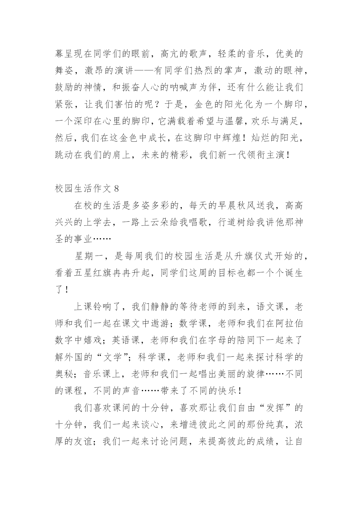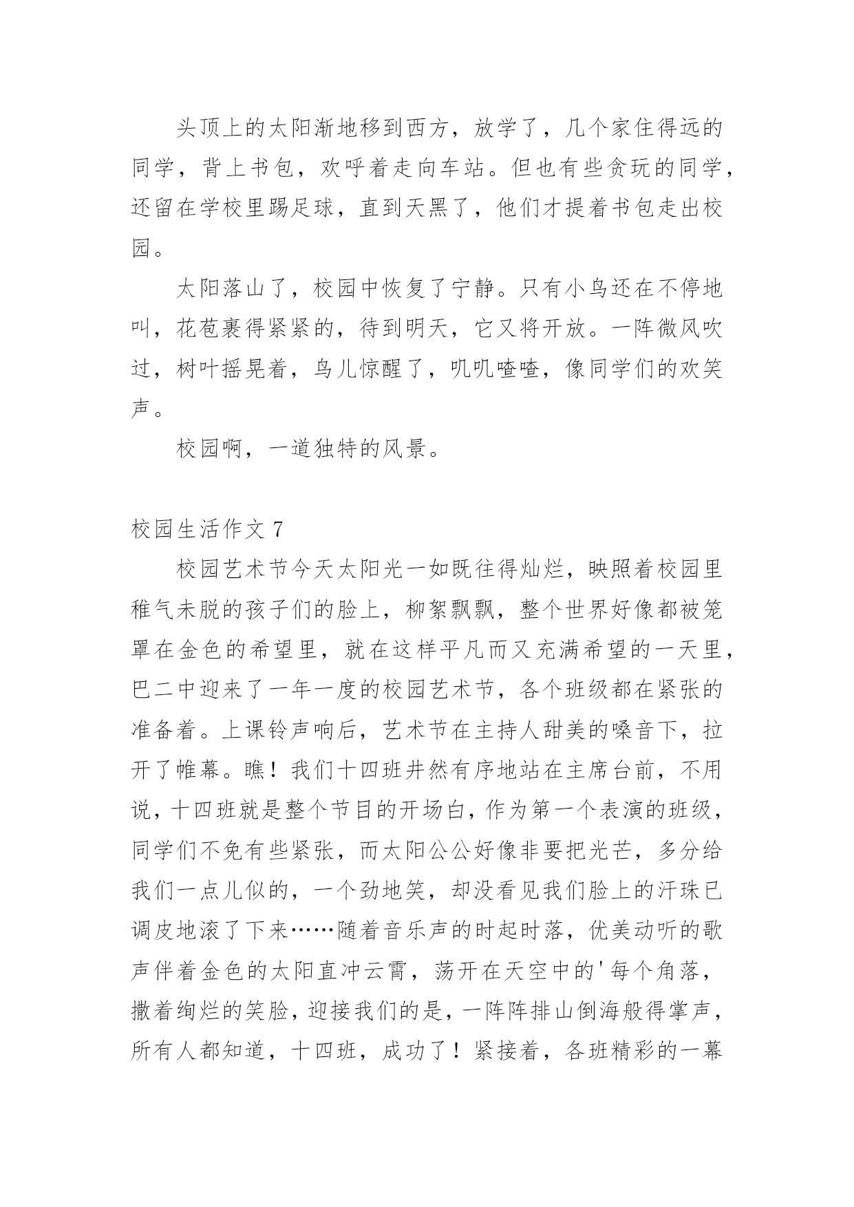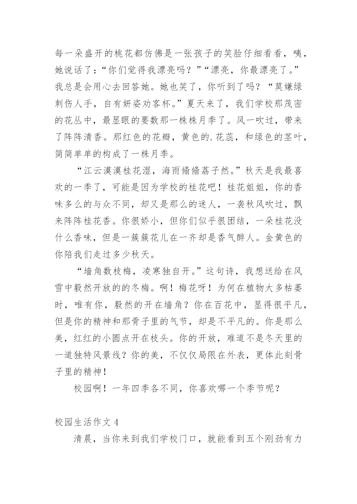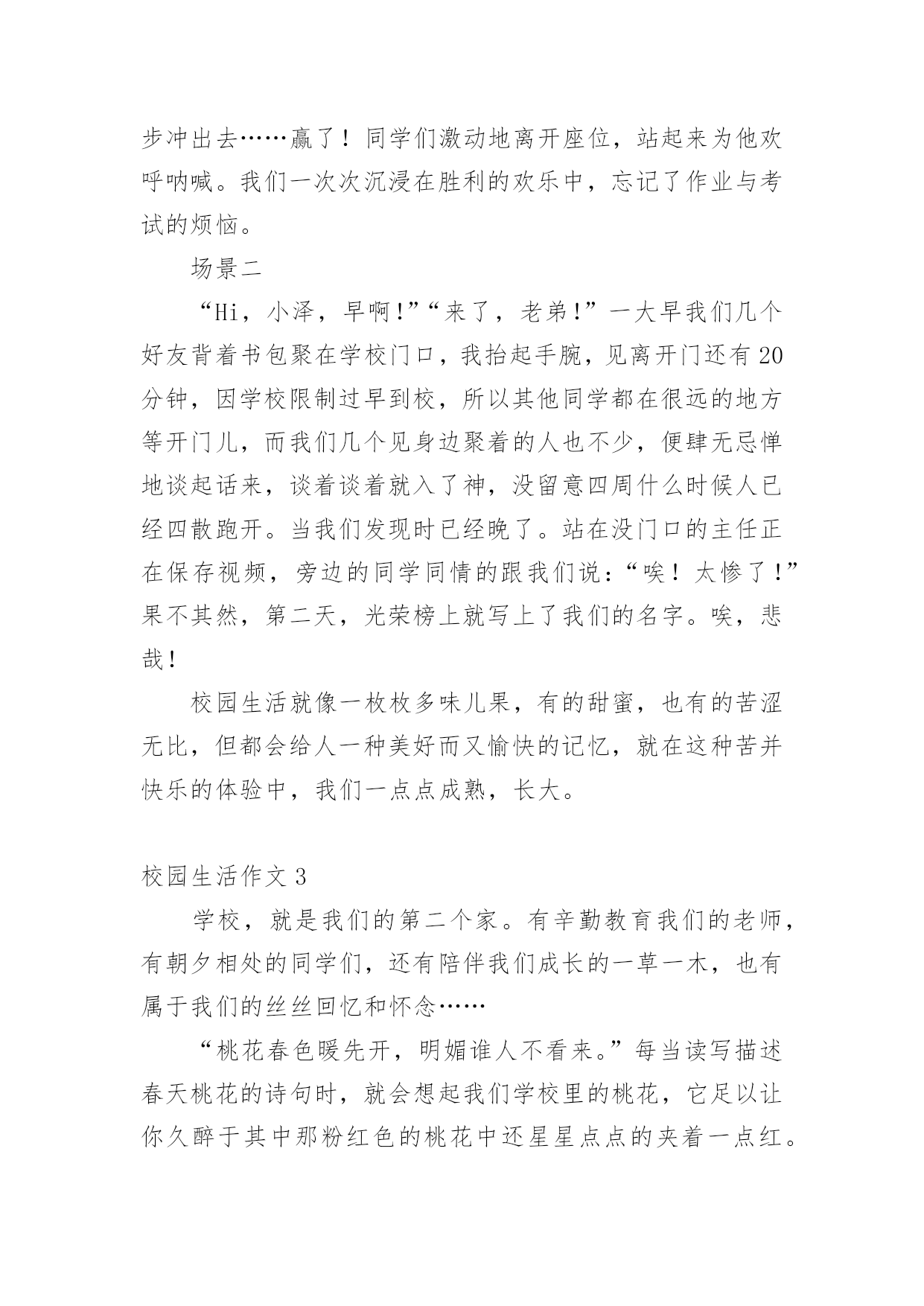 校园生活作文无论是在学校还是在社会中,大家总免不了要接触或使用作文吧,作文是人们把记忆中所存储的有关知识、经验和思想用书面形式表达出来的记叙方式。写起作文来就毫无头绪?下面是小编收集整理的校园生活作文,欢迎大家借鉴与参考,希望对大家有所帮助。校园生活作文1迎着金色的朝阳,踏着小鸟叽叽喳喳的歌声进入校园,一天的校园生活就将开始了。早读课的铃声响起,走过布置精美的走廊,你将听到朗朗读书声。第一节课,老师绘声绘色地讲着课,同学们专心致志地倾听着。每周一第一节课下,将举行神圣的升旗仪式。同学们排着整齐的队伍,踏着轻快的步伐进入操场。学校的国旗队举着鲜艳的五星红旗,伴着响亮的'国歌,敬礼!国旗下讲话开始了。都说胸前的红领巾是老一辈革命家的鲜血染成的,三角形的红领巾代表人民的利益高于一切。作为一名合格的少先队员,我们要做好自己的职责。下午,来到学校,少年号角广播台又响起了,伴随着一声声悦耳的歌声,和播音员优美的广播声进入教室。同学们拿着一把把扫帚和簸箕在各班包干区扫着。走在干净的地上,坐在干净的教室里上课,心情也变得十分舒畅。有时下午学校安排我们去阶梯教室听专家讲座,来给我们做心理辅导,树立远大的理想,好好学习,长大后好好报效祖国。前几天下午,我们还举行了广播操比赛,大家喊着坚定有力的口号,随着“七彩阳光”的音乐声响起,青春阳光的同学们律动着,摆动着。在主席台上观看,十分整齐。仿佛一朵朵太阳花绽放自己的笑脸,展现自己的风采。傍晚,伴着一抹绯红晚霞洒下的余晖,一张张红彤彤的脸出现在大家面前,这种感觉使我喜欢上了这座学校。我们胸前的红领巾迎风飘扬,期望未来高考的胜利。校园生活作文2在成长的旅途中,总会有一段五彩缤纷的难忘的校园生活,细细的去品味,就会发现,它是甜蜜的,幸福的,温馨的',还夹杂着一丝丝的苦涩。场景一瑟瑟的秋风吹拂着大地,金黄的叶子缓缓从树上飘落。操场上,却已是人声鼎沸,“加油,加油”等呐喊助威声此起彼伏。没错,我们正在举行了一年一度的秋季运动会。本次运动会的高潮——100米跑比赛即将到来,只见运动员们有的摩拳擦掌,有的则在摆pose,可我的注意力始终都在他身上———我们班的“运动之星”晓亮。发令枪响了,运动员们一个个如箭一般蹿了出去,他更是首当其中,因为是100米,所以没必要保留体力。他离终点越来越近。可就在这时,有一名同学慢慢的从后面追了上来,与他渐渐拉平。他见了并没有慌乱,而是一点点加速,加速。最后一刻,他一个箭步冲出去……赢了!同学们激动地离开座位,站起来为他欢呼呐喊。我们一次次沉浸在胜利的欢乐中,忘记了作业与考试的烦恼。场景二“Hi,小泽,早啊!”“来了,老弟!”一大早我们几个好友背着书包聚在学校门口,我抬起手腕,见离开门还有20分钟,因学校限制过早到校,所以其他同学都在很远的地方等开门儿,而我们几个见身边聚着的人也不少,便肆无忌惮地谈起话来,谈着谈着就入了神,没留意四周什么时候人已经四散跑开。当我们发现时已经晚了。站在没门口的主任正在保存视频,旁边的同学同情的跟我们说:“唉!太惨了!”果不其然,第二天,光荣榜上就写上了我们的名字。唉,悲哉!校园生活就像一枚枚多味儿果,有的甜蜜,也有的苦涩无比,但都会给人一种美好而又愉快的记忆,就在这种苦并快乐的体验中,我们一点点成熟,长大。校园生活作文3学校,就是我们的第二个家。有辛勤教育我们的老师,有朝夕相处的同学们,还有陪伴我们成长的一草一木,也有属于我们的丝丝回忆和怀念……“桃花春色暖先开,明媚谁人不看来。”每当读写描述春天桃花的诗句时,就会想起我们学校里的桃花,它足以让你久醉于其中那粉红色的桃花中还星星点点的夹着一点红。每一朵盛开的桃花都仿佛是一张孩子的笑脸仔细看看,咦,她说话了:“你们觉得我漂亮吗?”“漂亮,你最漂亮了。”我总是会用心去回答她。她也笑了,你听到了吗?“莫嫌绿刺伤人手,自有妍姿劝客杯。”夏天来了,我们学校那茂密的花丛中,最显眼的要数那一株株月季了。风一吹过,带来了阵阵清香。那红色的花瓣,黄色的.花蕊,和绿色的茎叶,简简单单的构成了一株月季。“江云漠漠桂花湿,海雨翛翛荔子然。”秋天是我最喜欢的一季了,可能是因为学校的桂花吧!桂花姐姐,你的香味多么的与众不同,却又是那么的迷人,一袭秋风吹过,飘来阵阵桂花香。你很娇小,但你们似乎很团结,一朵桂花没什么香味,但是一簇簇花儿在一齐却是香气醉人。金黄色的你陪我们走过多少秋天。“墙角数枝梅,凌寒独自开。”这句诗,我想送给在风雪中毅然开放的的冬梅。啊!梅花呀!为何在植物大多枯萎时,唯有你,毅然的开在墙角?你在百花中,显得很平凡,但是你的精神和那骨子里的气节,却是不平凡的。你是那么美,红红的小圆点开在枝头。你的开放,难道不是冬天里的一道独特风景线?你的美,不仅仅局限在外表,更体此刻骨子里的精神!校园啊!一年四季各不同,你喜欢哪