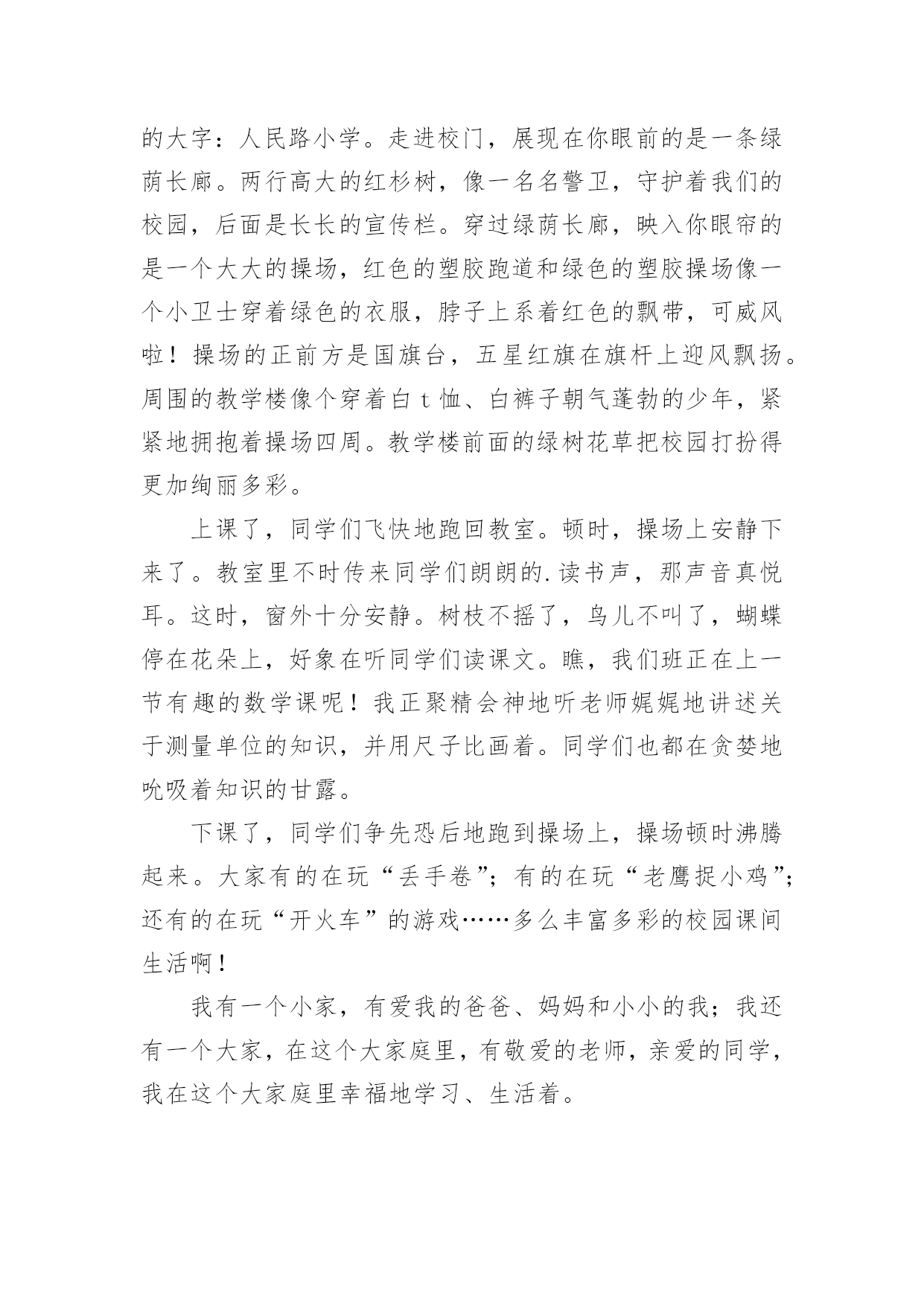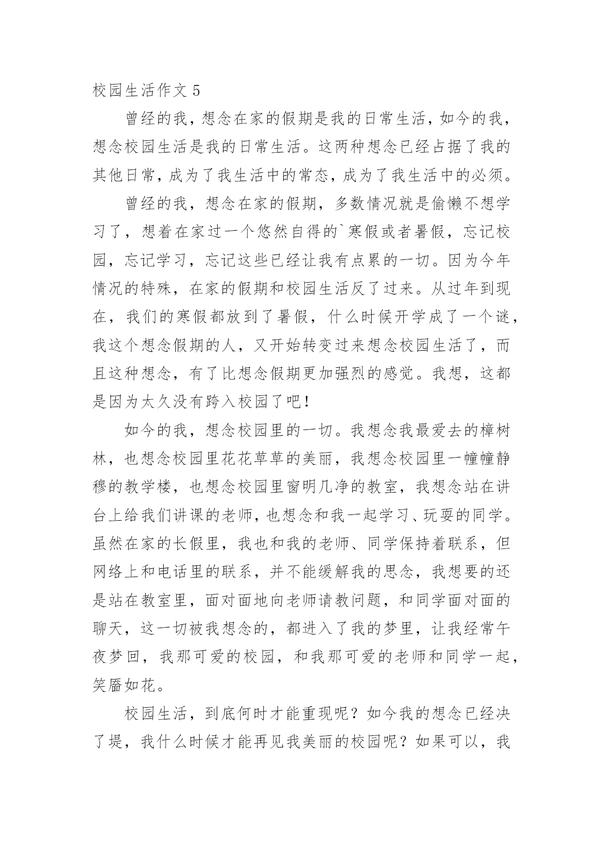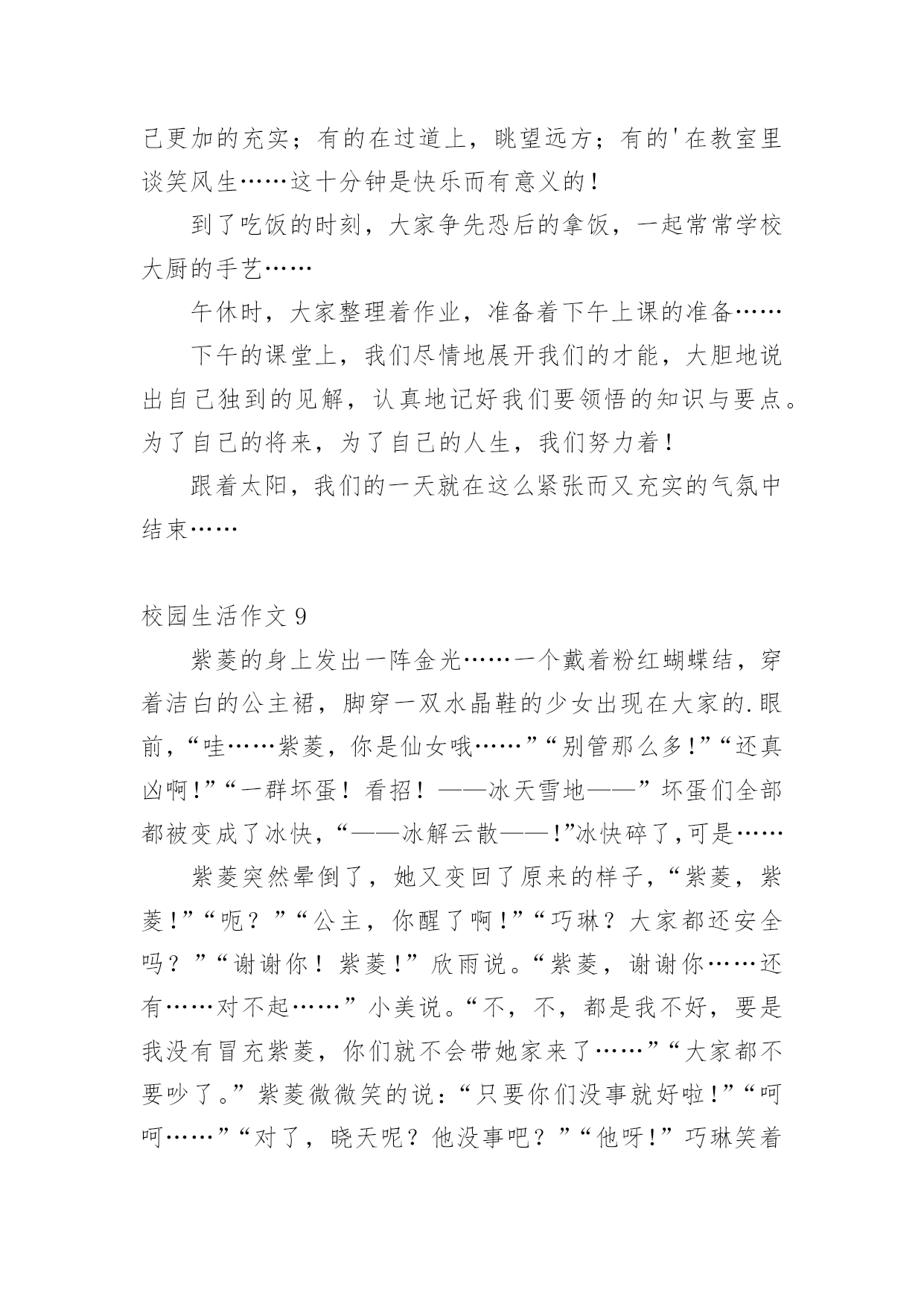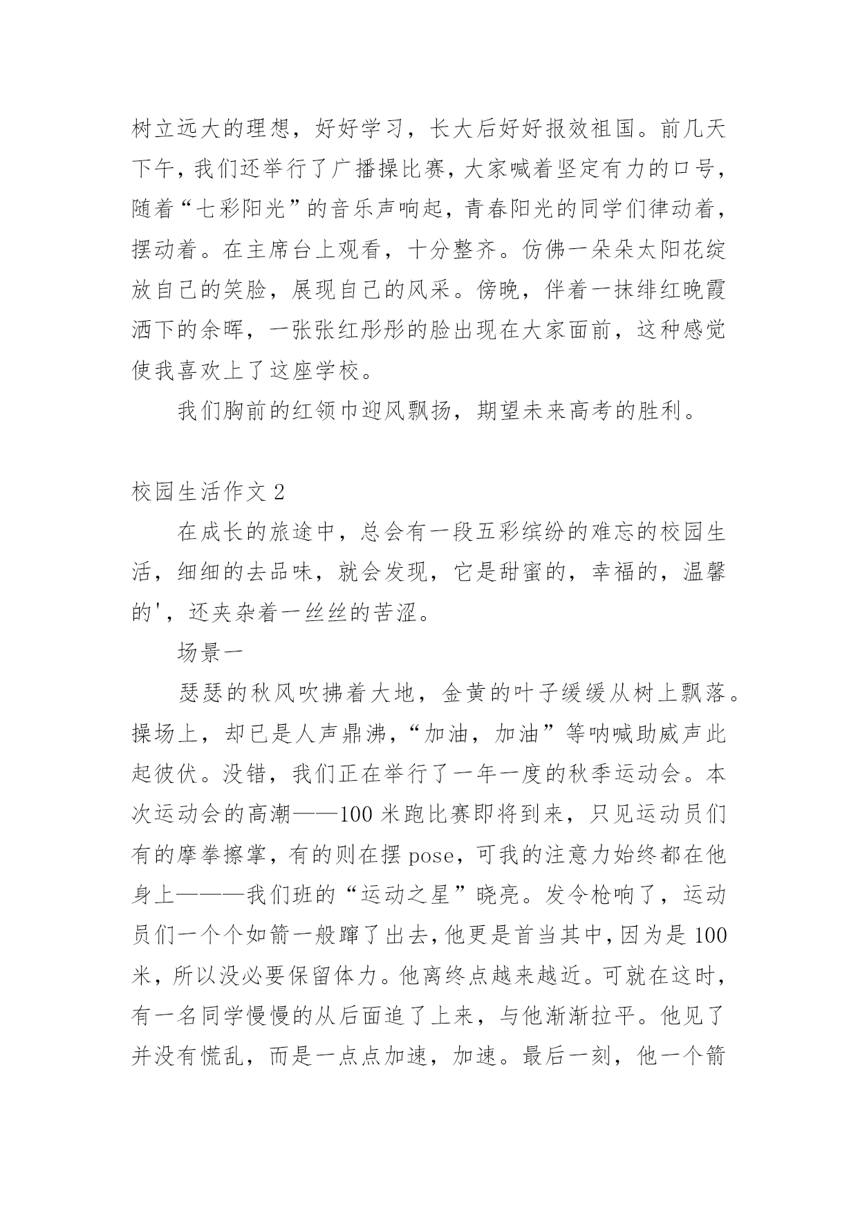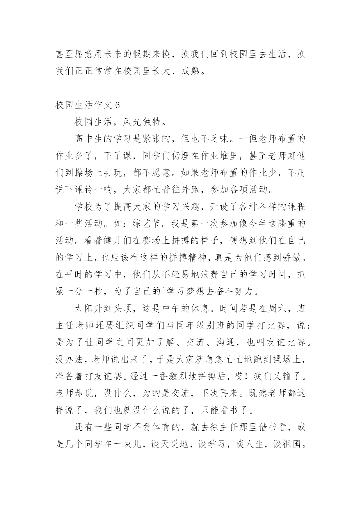 校园生活作文无论是在学校还是在社会中,大家总免不了要接触或使用作文吧,作文是人们把记忆中所存储的有关知识、经验和思想用书面形式表达出来的记叙方式。写起作文来就毫无头绪?下面是小编收集整理的校园生活作文,欢迎大家借鉴与参考,希望对大家有所帮助。校园生活作文1迎着金色的朝阳,踏着小鸟叽叽喳喳的歌声进入校园,一天的校园生活就将开始了。早读课的铃声响起,走过布置精美的走廊,你将听到朗朗读书声。第一节课,老师绘声绘色地讲着课,同学们专心致志地倾听着。每周一第一节课下,将举行神圣的升旗仪式。同学们排着整齐的队伍,踏着轻快的步伐进入操场。学校的国旗队举着鲜艳的五星红旗,伴着响亮的'国歌,敬礼!国旗下讲话开始了。都说胸前的红领巾是老一辈革命家的鲜血染成的,三角形的红领巾代表人民的利益高于一切。作为一名合格的少先队员,我们要做好自己的职责。下午,来到学校,少年号角广播台又响起了,伴随着一声声悦耳的歌声,和播音员优美的广播声进入教室。同学们拿着一把把扫帚和簸箕在各班包干区扫着。走在干净的地上,坐在干净的教室里上课,心情也变得十分舒畅。有时下午学校安排我们去阶梯教室听专家讲座,来给我们做心理辅导,树立远大的理想,好好学习,长大后好好报效祖国。前几天下午,我们还举行了广播操比赛,大家喊着坚定有力的口号,随着“七彩阳光”的音乐声响起,青春阳光的同学们律动着,摆动着。在主席台上观看,十分整齐。仿佛一朵朵太阳花绽放自己的笑脸,展现自己的风采。傍晚,伴着一抹绯红晚霞洒下的余晖,一张张红彤彤的脸出现在大家面前,这种感觉使我喜欢上了这座学校。我们胸前的红领巾迎风飘扬,期望未来高考的胜利。校园生活作文2在成长的旅途中,总会有一段五彩缤纷的难忘的校园生活,细细的去品味,就会发现,它是甜蜜的,幸福的,温馨的',还夹杂着一丝丝的苦涩。场景一瑟瑟的秋风吹拂着大地,金黄的叶子缓缓从树上飘落。操场上,却已是人声鼎沸,“加油,加油”等呐喊助威声此起彼伏。没错,我们正在举行了一年一度的秋季运动会。本次运动会的高潮——100米跑比赛即将到来,只见运动员们有的摩拳擦掌,有的则在摆pose,可我的注意力始终都在他身上———我们班的“运动之星”晓亮。发令枪响了,运动员们一个个如箭一般蹿了出去,他更是首当其中,因为是100米,所以没必要保留体力。他离终点越来越近。可就在这时,有一名同学慢慢的从后面追了上来,与他渐渐拉平。他见了并没有慌乱,而是一点点加速,加速。最后一刻,他一个箭步冲出去……赢了!同学们激动地离开座位,站起来为他欢呼呐喊。我们一次次沉浸在胜利的欢乐中,忘记了作业与考试的烦恼。场景二“Hi,小泽,早啊!”“来了,老弟!”一大早我们几个好友背着书包聚在学校门口,我抬起手腕,见离开门还有20分钟,因学校限制过早到校,所以其他同学都在很远的地方等开门儿,而我们几个见身边聚着的人也不少,便肆无忌惮地谈起话来,谈着谈着就入了神,没留意四周什么时候人已经四散跑开。当我们发现时已经晚了。站在没门口的主任正在保存视频,旁边的同学同情的跟我们说:“唉!太惨了!”果不其然,第二天,光荣榜上就写上了我们的名字。唉,悲哉!校园生活就像一枚枚多味儿果,有的甜蜜,也有的苦涩无比,但都会给人一种美好而又愉快的记忆,就在这种苦并快乐的体验中,我们一点点成熟,长大。校园生活作文3学校,就是我们的第二个家。有辛勤教育我们的老师,有朝夕相处的同学们,还有陪伴我们成长的一草一木,也有属于我们的丝丝回忆和怀念……“桃花春色暖先开,明媚谁人不看来。”每当读写描述春天桃花的诗句时,就会想起我们学校里的桃花,它足以让你久醉于其中那粉红色的桃花中还星星点点的夹着一点红。每一朵盛开的桃花都仿佛是一张孩子的笑脸仔细看看,咦,她说话了:“你们觉得我漂亮吗?”“漂亮,你最漂亮了。”我总是会用心去回答她。她也笑了,你听到了吗?“莫嫌绿刺伤人手,自有妍姿劝客杯。”夏天来了,我们学校那茂密的花丛中,最显眼的要数那一株株月季了。风一吹过,带来了阵阵清香。那红色的花瓣,黄色的.花蕊,和绿色的茎叶,简简单单的构成了一株月季。“江云漠漠桂花湿,海雨翛翛荔子然。”秋天是我最喜欢的一季了,可能是因为学校的桂花吧!桂花姐姐,你的香味多么的与众不同,却又是那么的迷人,一袭秋风吹过,飘来阵阵桂花香。你很娇小,但你们似乎很团结,一朵桂花没什么香味,但是一簇簇花儿在一齐却是香气醉人。金黄色的你陪我们走过多少秋天。“墙角数枝梅,凌寒独自开。”这句诗,我想送给在风雪中毅然开放的的冬梅。啊!梅花呀!为何在植物大多枯萎时,唯有你,毅然的开在墙角?你在百花中,显得很平凡,但是你的精神和那骨子里的气节,却是不平凡的。你是那么美,红红的小圆点开在枝头。你的开放,难道不是冬天里的一道独特风景线?你的美,不仅仅局限在外表,更体此刻骨子里的精神!校园啊!一年四季各不同,你喜欢哪