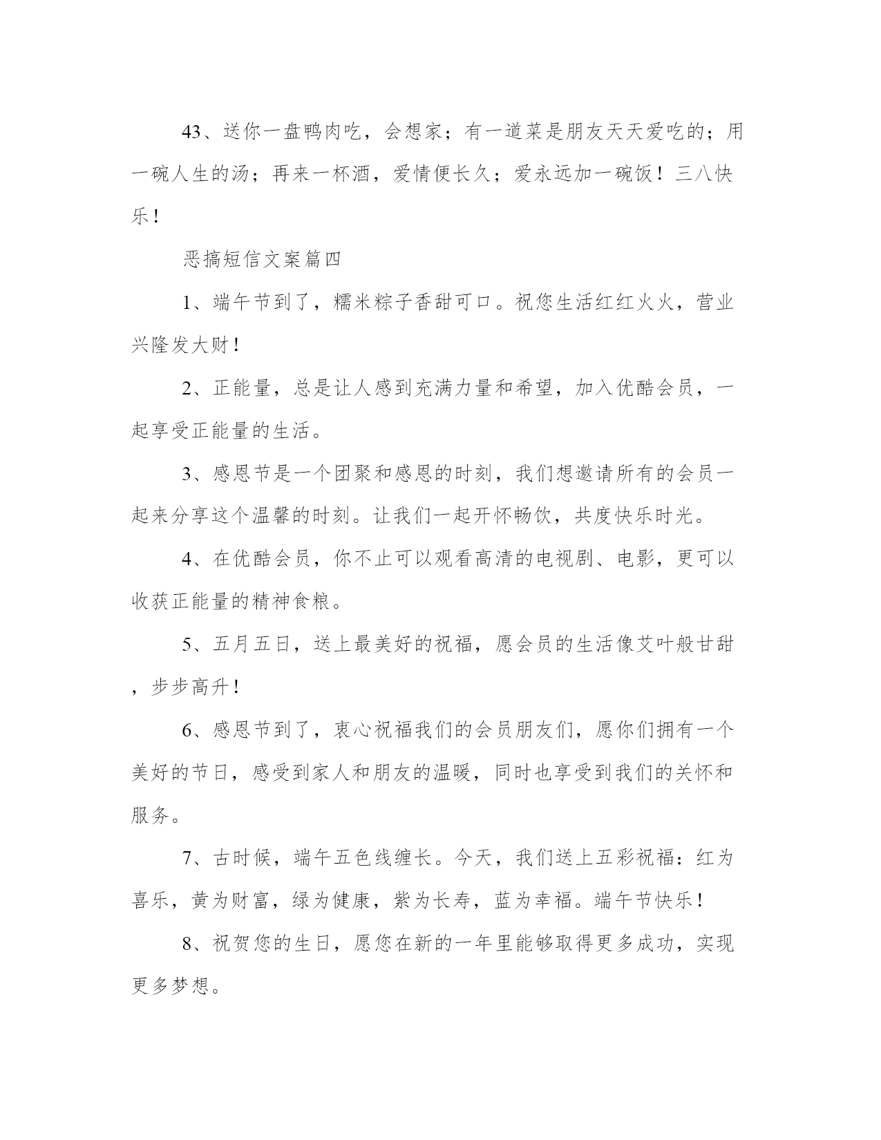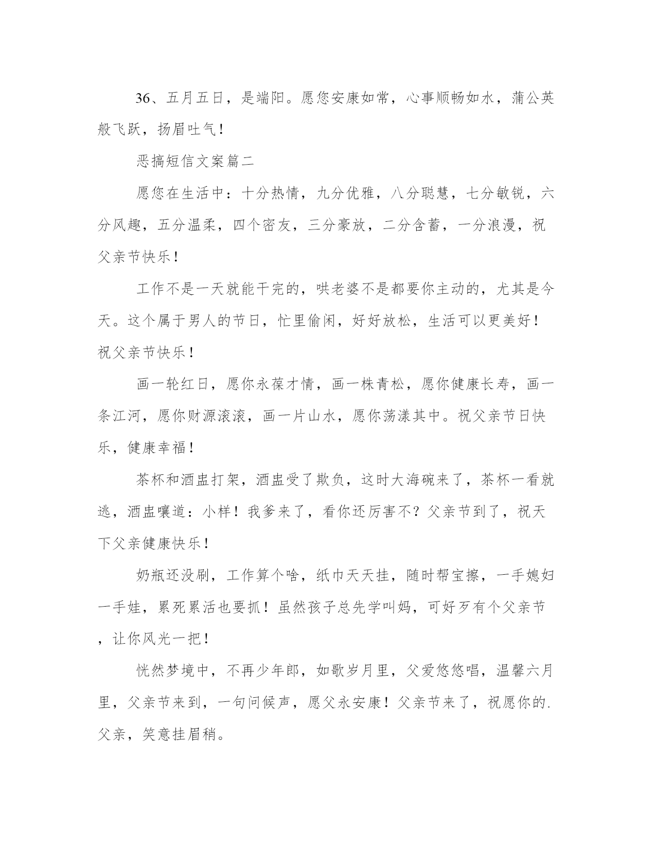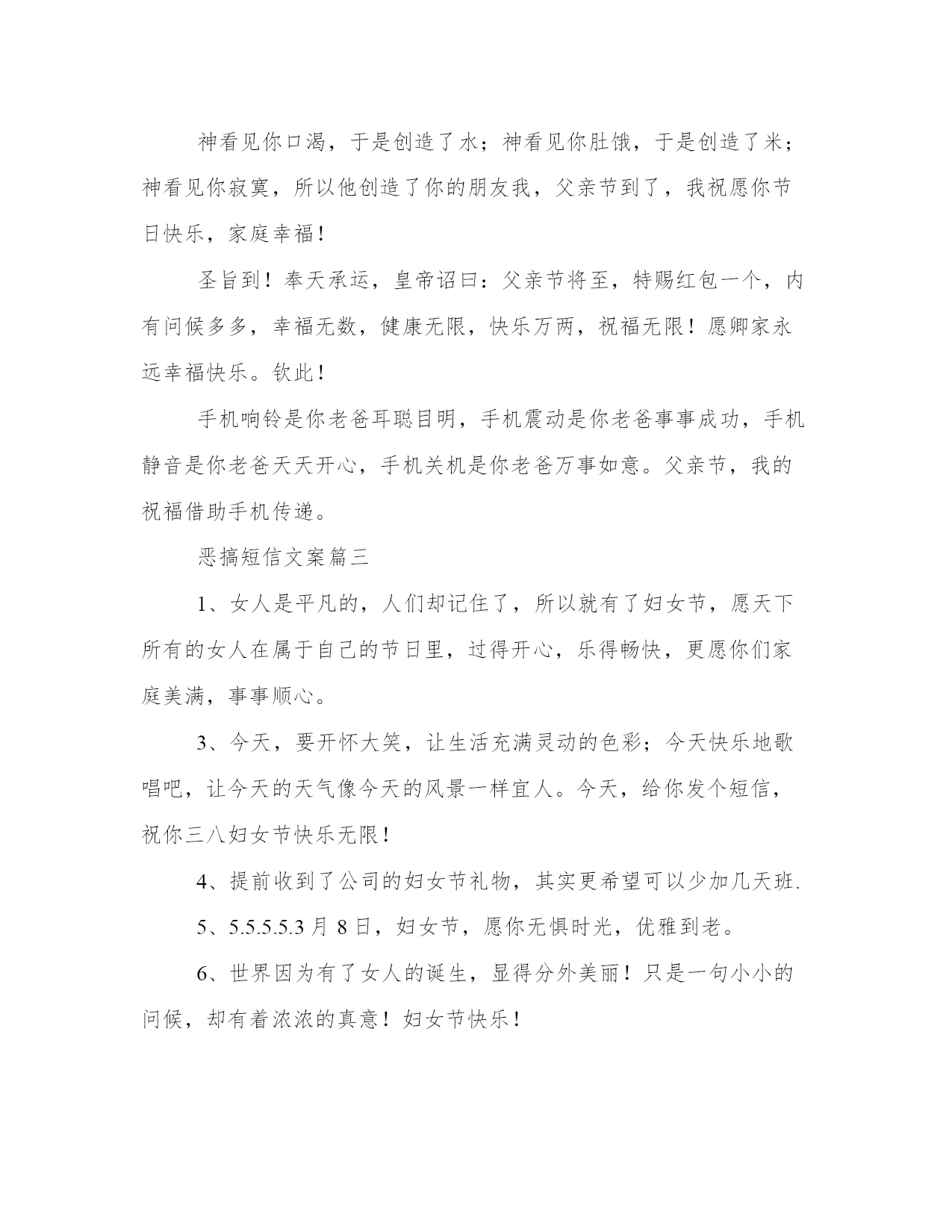 恶搞短信文案(通用10篇)无论是身处学校还是步入社会,大家都尝试过写作吧,借助写作也可以提高我们的语言组织能力。范文书写有哪些要求呢?我们怎样才能写好一篇范文呢?接下来小编就给大家介绍一下优秀的范文该怎么写,我们一起来看一看吧。恶搞短信文案篇一19、感恩节就像一盏明灯,照亮了我们前进的道路。感谢有您的陪伴,让我们一直走在正确的道路上。20、飘香菖蒲,香气袭人。愿您端午佳节能够和亲人一起分享这份美好。21、身心的平衡与和谐离不开愉悦的心情,让我们共同享受瑜伽带来的自然、舒适、理性、感性的充实生活。22、你值得拥有更好的影视娱乐体验,优酷会员为你提供。23、端午佳节,祝您健康长寿,事事顺心如意!24、加入我们的会员,终身受益,我们将一直用最好的服务和商品回报您对我们的信任。25、五月初五,粽叶飘香,愿您的生活充满诗意,健康安康!26、在这个传统的节日里,祝愿会员事业成功,家庭和睦,心想事成!27、感恩节即将来临,我们想把最美好的祝愿送给我们的会员朋友们。愿你们拥有一个温馨而快乐的家庭,同时也享受到我们无微不至的服务和关怀。28、五色缤纷的艾叶,爱的芳香永存。愿您和亲人一同感受端午的气氛,分享爱和温暖。29、在这个温暖的日子里,我们诚挚地祝福您,愿您的生日充满快乐与美好。希望您的未来岁月中,无论遇到什么困难或挫折,都能坚强面对,勇往直前。请记住,我们永远在您身旁,与您一同分享每一个喜怒哀乐。30、今天是您的生日,这天颇为特别。祝您开怀笑,开心乐,事业发达,家庭美满,幸福无限!31、订阅优酷会员,尊享多种特权服务,让你的生活更加有价值。32、祝福散满五湖四海,愿您端午节快乐,粽香共赏!33、青春不老,生日祝福。34、感恩节是一个感恩和回报的时刻。我们想对我们的会员朋友们表达我们的感谢之情。谢谢你们一直以来的支持和信任,让我们一起创造更美好的明天。35、五月五的这一天,祝福您身体健康、生活愉快、家庭和美。愿您在人生的龙舟中阔步前行,在事业的河流中披荆斩棘!36、五月五日,是端阳。愿您安康如常,心事顺畅如水,蒲公英般飞跃,扬眉吐气!恶搞短信文案篇二愿您在生活中:十分热情,九分优雅,八分聪慧,七分敏锐,六分风趣,五分温柔,四个密友,三分豪放,二分含蓄,一分浪漫,祝父亲节快乐!工作不是一天就能干完的,哄老婆不是都要你主动的,尤其是今天。这个属于男人的节日,忙里偷闲,好好放松,生活可以更美好!祝父亲节快乐!画一轮红日,愿你永葆才情,画一株青松,愿你健康长寿,画一条江河,愿你财源滚滚,画一片山水,愿你荡漾其中。祝父亲节日快乐,健康幸福!茶杯和酒盅打架,酒盅受了欺负,这时大海碗来了,茶杯一看就逃,酒盅嚷道:小样!我爹来了,看你还厉害不?父亲节到了,祝天下父亲健康快乐!奶瓶还没刷,工作算个啥,纸巾天天挂,随时帮宝擦,一手媳妇一手娃,累死累活也要抓!虽然孩子总先学叫妈,可好歹有个父亲节,让你风光一把!恍然梦境中,不再少年郎,如歌岁月里,父爱悠悠唱,温馨六月里,父亲节来到,一句问候声,愿父永安康!父亲节来了,祝愿你的.父亲,笑意挂眉稍。神看见你口渴,于是创造了水;神看见你肚饿,于是创造了米;神看见你寂寞,所以他创造了你的朋友我,父亲节到了,我祝愿你节日快乐,家庭幸福!圣旨到!奉天承运,皇帝诏曰:父亲节将至,特赐红包一个,内有问候多多,幸福无数,健康无限,快乐万两,祝福无限!愿卿家永远幸福快乐。钦此!手机响铃是你老爸耳聪目明,手机震动是你老爸事事成功,手机静音是你老爸天天开心,手机关机是你老爸万事如意。父亲节,我的祝福借助手机传递。恶搞短信文案篇三1、女人是平凡的,人们却记住了,所以就有了妇女节,愿天下所有的女人在属于自己的节日里,过得开心,乐得畅快,更愿你们家庭美满,事事顺心。3、今天,要开怀大笑,让生活充满灵动的色彩;今天快乐地歌唱吧,让今天的天气像今天的风景一样宜人。今天,给你发个短信,祝你三八妇女节快乐无限!4、提前收到了公司的妇女节礼物,其实更希望可以少加几天班.5、5.5.5.5.3月8日,妇女节,愿你无惧时光,优雅到老。6、世界因为有了女人的诞生,显得分外美丽!只是一句小小的问候,却有着浓浓的真意!妇女节快乐!7、我在网上订了三万元的首饰送给你,祝你三八节快乐!他们会把首饰和发票给你送去?哦忘了,这三万元是由你来掏的。8、妇女节快到了,想想和你无关,没给你准备祝福,但细细想来,你虽不是妇女,但你关爱女士,疼惜老婆,表现优秀,因此也预祝你节日快乐!9、一头短发,彰显了你的干练,家庭幸福,是你无私的奉献,你的外表柔情似水,手中的老茧是你的辛劳,妇女是天妇女是地,妇女是爱的发动机,三八妇女节祝天下的妇女朋友们节日快乐、合家欢乐。10、那是春天的时候,花儿都是黄色的,倒