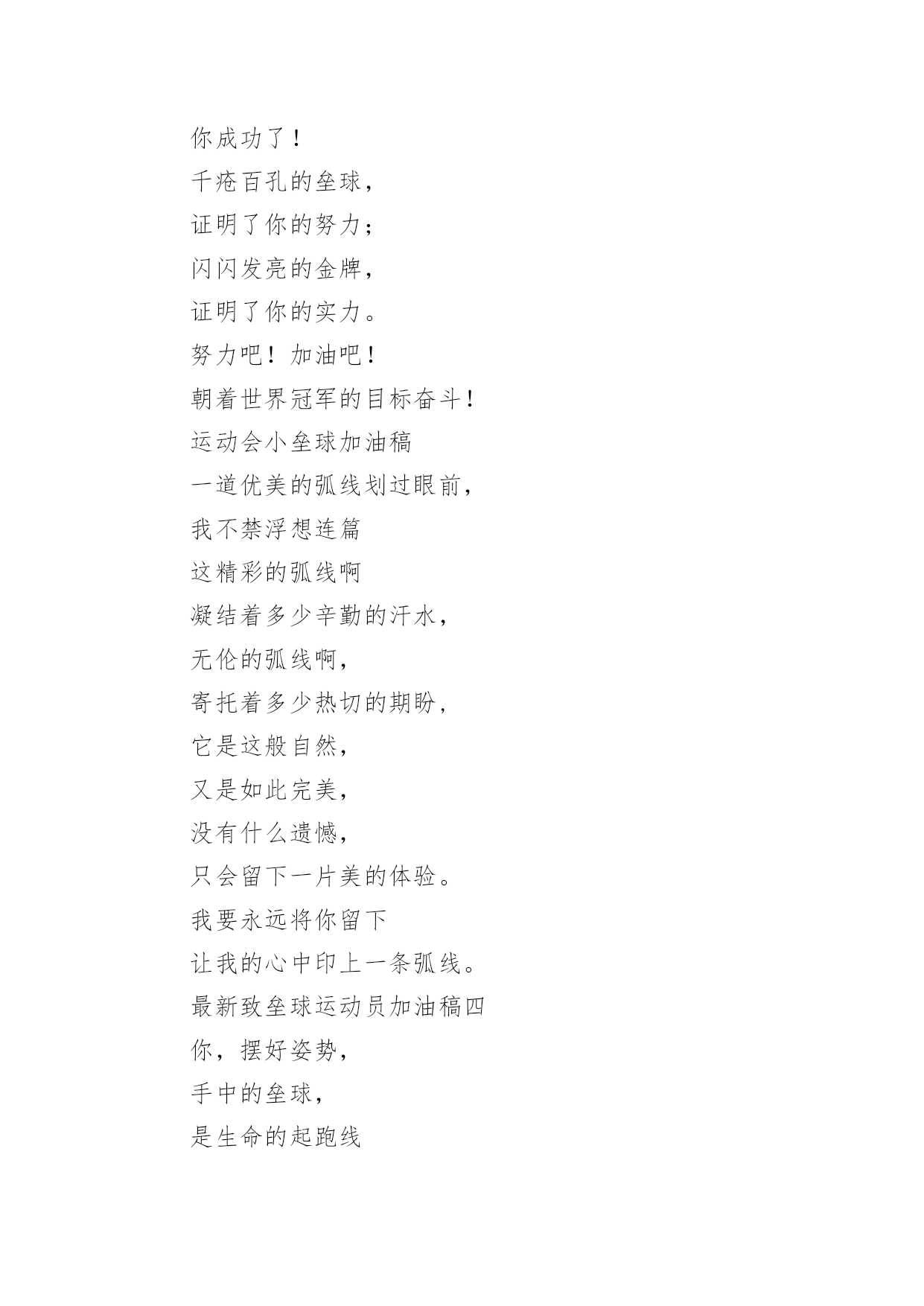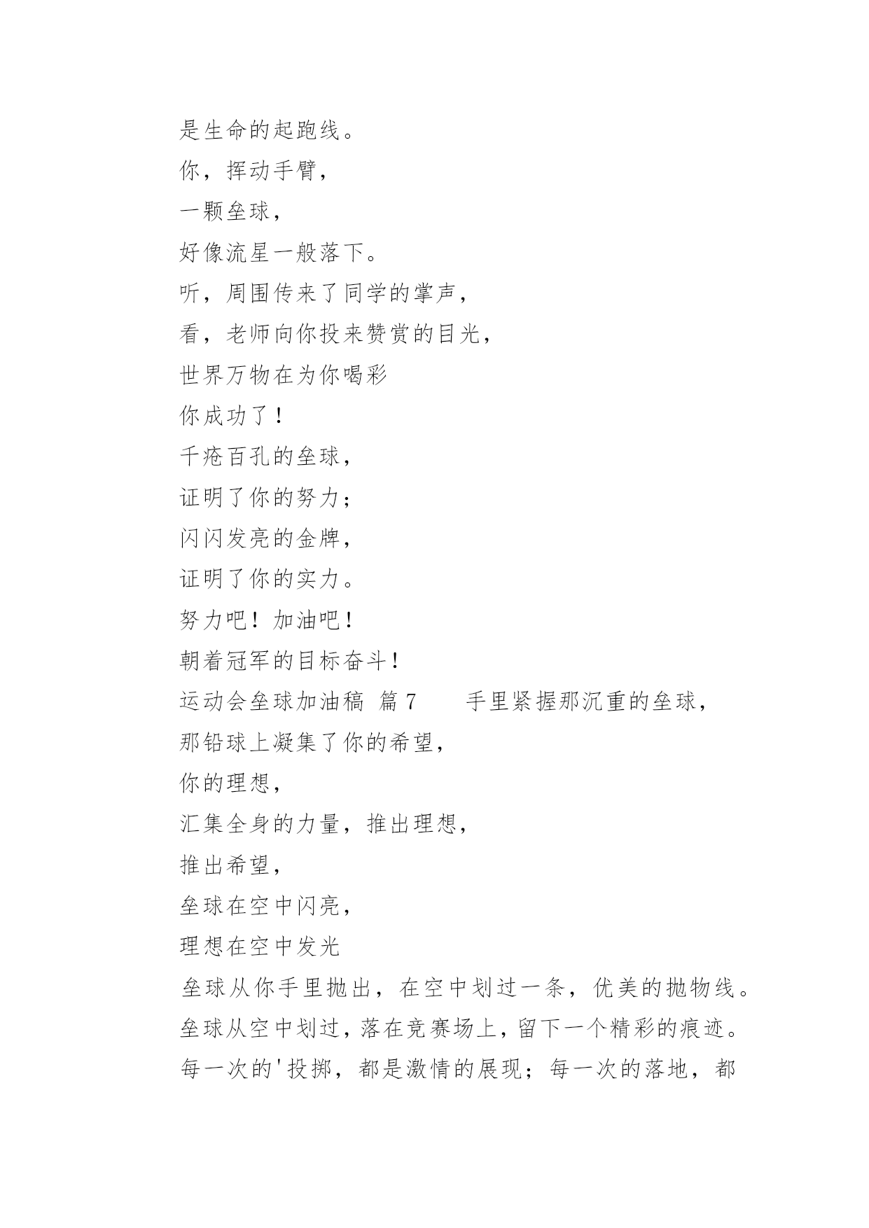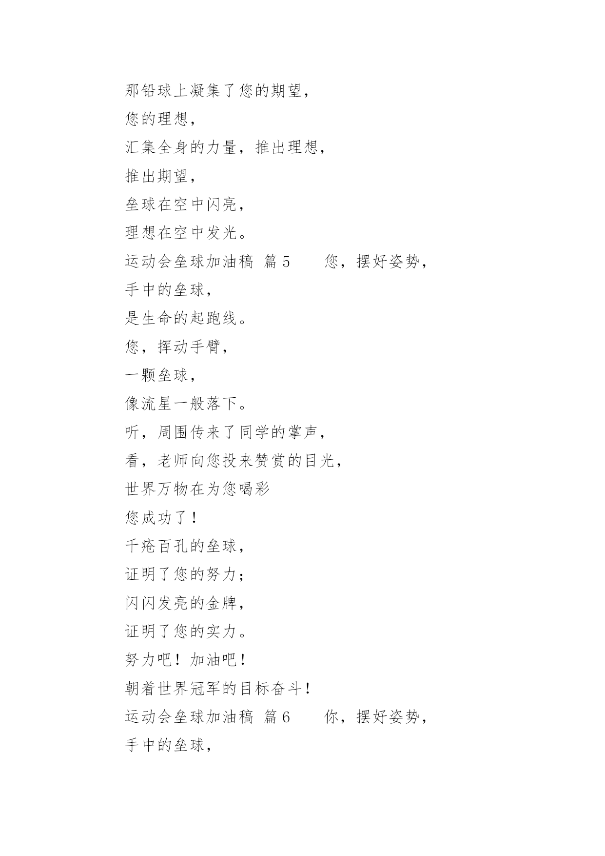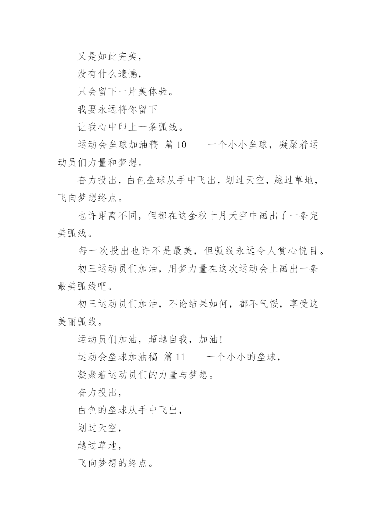 运动会垒球加油稿运动会垒球加油稿大全垒球也是一项很多人都喜欢的运动,运动会垒球加油稿小编已经整理好了,我们可以一起看看下面的运动会垒球加油稿,欢迎各位借鉴哦!运动会垒球加油稿篇1您,摆好姿势,手中的垒球,是生命的起跑线。您,挥动手臂,一颗垒球,像流星一般落下。听,周围传来了同学的掌声,看,老师向您投来赞赏的目光,世界万物在为您喝彩您成功了!千疮百孔的垒球,证明了您的努力;闪闪发亮的金牌,证明了您的实力。努力吧!加油吧!朝着世界冠军的目标奋斗!运动会垒球加油稿篇2一道优美的弧线划过眼前,我不禁浮想连篇这精彩的弧线啊凝结着多少辛勤的汗水,无伦的弧线啊,寄托着多少热切的期盼。它是这般自然,又是如此完美,没有什么遗憾,只会留下一片美的体验。我要永远将您留下让我的心中印上一条弧线。运动会垒球加油稿篇3一个小的垒球,凝聚着运动员们的力量和梦想。奋力投出,白色的垒球从手中飞出,划过天空,越过草地,飞向梦想的终点。也许距离不同,但都在这金秋十月的天空中画出了一条完美的弧线。每次的投出也许不是最美,但弧线永远令人赏心悦目。初三的运动员们加油,用梦的力量在这次运动会上画出一条最美的弧线吧。初三的运动员们加油,不论结果如何,都不气馁,享受这美丽的弧线。运动员们加油,超越自我,加油!运动会垒球加油稿篇4手里紧握那沉重的垒球,那铅球上凝集了您的期望,您的理想,汇集全身的力量,推出理想,推出期望,垒球在空中闪亮,理想在空中发光。运动会垒球加油稿篇5您,摆好姿势,手中的垒球,是生命的起跑线。您,挥动手臂,一颗垒球,像流星一般落下。听,周围传来了同学的掌声,看,老师向您投来赞赏的目光,世界万物在为您喝彩您成功了!千疮百孔的垒球,证明了您的努力;闪闪发亮的金牌,证明了您的实力。努力吧!加油吧!朝着世界冠军的目标奋斗!运动会垒球加油稿篇6你,摆好姿势,手中的垒球,是生命的起跑线。你,挥动手臂,一颗垒球,好像流星一般落下。听,周围传来了同学的掌声,看,老师向你投来赞赏的目光,世界万物在为你喝彩你成功了!千疮百孔的垒球,证明了你的努力;闪闪发亮的金牌,证明了你的实力。努力吧!加油吧!朝着冠军的目标奋斗!运动会垒球加油稿篇7手里紧握那沉重的垒球,那铅球上凝集了你的希望,你的理想,汇集全身的力量,推出理想,推出希望,垒球在空中闪亮,理想在空中发光垒球从你手里抛出,在空中划过一条,优美的抛物线。垒球从空中划过,落在竞赛场上,留下一个精彩的痕迹。每一次的'投掷,都是激情的展现;每一次的落地,都是努力的结果。运动会垒球加油稿篇8你,摆好姿势,手中垒球,是生命起跑线。你,挥动手臂,一颗垒球,像流星一般落下。听,周围传来了同学掌声,看,老师向你投来赞赏目光,世界万物在为你喝彩你成功了!千疮百孔垒球,证明了你努力;闪闪发亮金牌,证明了你实力。努力吧!加油吧!朝着世界冠军目标奋斗!运动会垒球加油稿篇9一道优美弧线划过眼前,我不禁浮想连篇这精彩弧线啊凝结着多少辛勤汗水,无伦弧线啊,寄托着多少热切期盼。它是这般自然,又是如此完美,没有什么遗憾,只会留下一片美体验。我要永远将你留下让我心中印上一条弧线。运动会垒球加油稿篇10一个小小垒球,凝聚着运动员们力量和梦想。奋力投出,白色垒球从手中飞出,划过天空,越过草地,飞向梦想终点。也许距离不同,但都在这金秋十月天空中画出了一条完美弧线。每一次投出也许不是最美,但弧线永远令人赏心悦目。初三运动员们加油,用梦力量在这次运动会上画出一条最美弧线吧。初三运动员们加油,不论结果如何,都不气馁,享受这美丽弧线。运动员们加油,超越自我,加油!运动会垒球加油稿篇11一个小小的垒球,凝聚着运动员们的力量与梦想。奋力投出,白色的垒球从手中飞出,划过天空,越过草地,飞向梦想的终点。也许距离不同,但是都在这金秋十月的天空中画出了一条完美的弧线。每一次的投出也许不是最美,但是弧线永远令人赏心悦目。加油!运动会垒球加油稿篇12你是运动场的心脏,跳动梦想;你是漫长路的精神,激励辉煌;你们是将上下求索的人!风为你加油,云为你助兴,坚定,执着,耐力与希望,在延伸的白色跑道中点点凝聚!力量,信念,拼搏与奋斗,在遥远的终点线上渐渐明亮!时代的强音正在你的脚下踏响。运动会垒球加油稿篇13一道优美的弧线划过眼前,我不禁浮想连篇这精彩的弧线啊凝结着多少辛勤的汗水,无伦的弧线啊,寄托着多少热切的期盼,它是这般自然,又是如此完美,没有什么遗憾,只会留下一片美的体验。我要永远将你留下让我的心中印上一条弧线。最新致垒球运动员加油稿四你,摆好姿势,手中的垒球,是生命的起跑线运动会垒球加油稿篇14手里紧握那沉重的垒球,那铅球上凝集了你的希望,你的理想,汇集全身的力量,推出理想,推出希望,垒球在空中闪亮,理想在空中发光。运动会垒球加油稿篇15你,摆好姿势,手中的垒球,是生命的起跑线。你,挥动手臂,