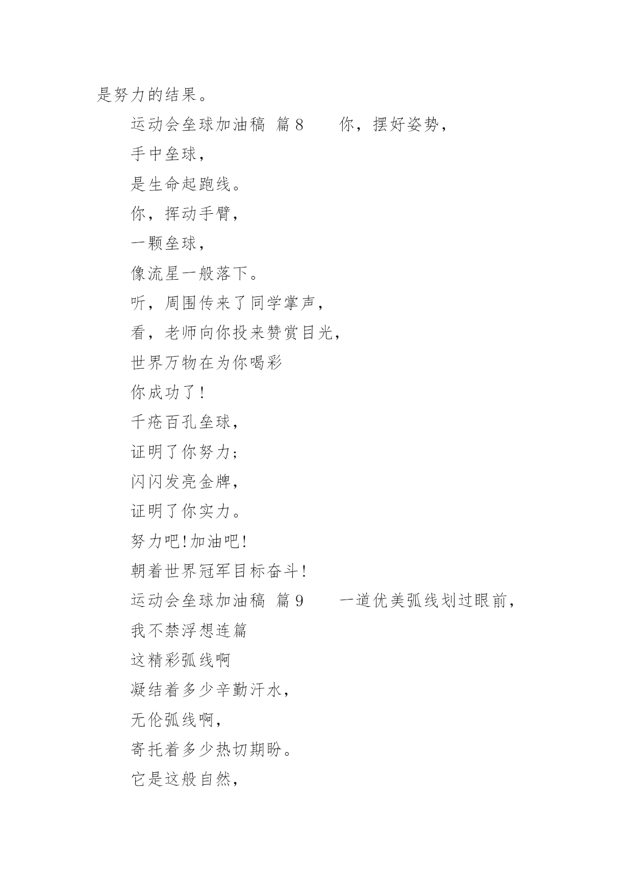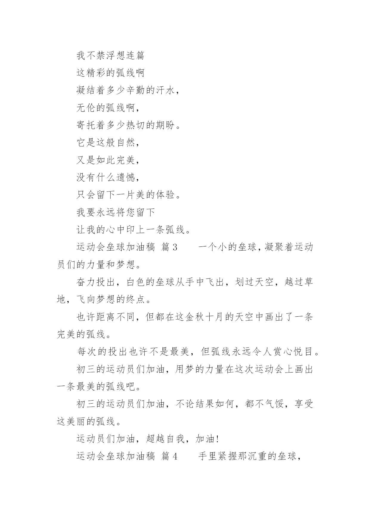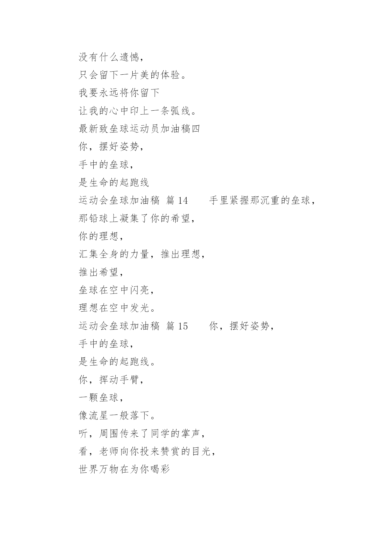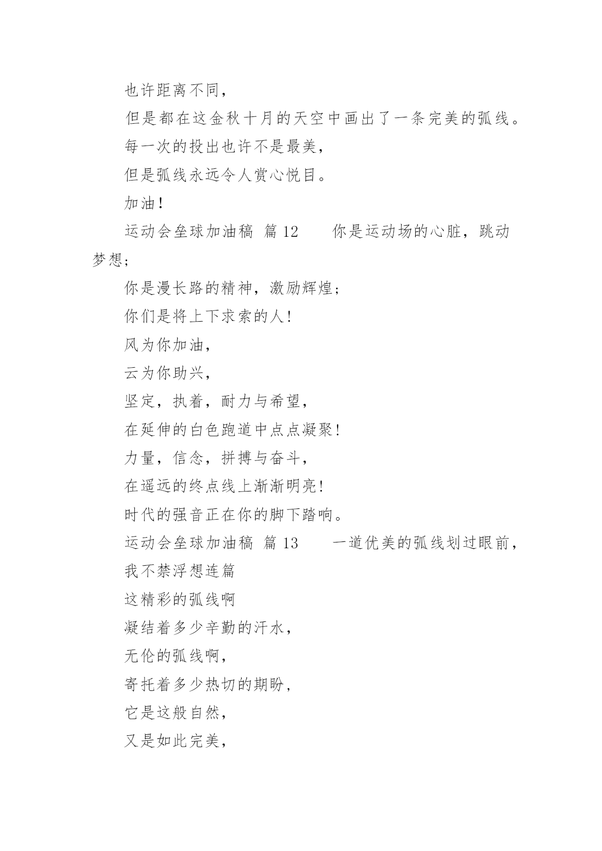 运动会垒球加油稿运动会垒球加油稿大全垒球也是一项很多人都喜欢的运动,运动会垒球加油稿小编已经整理好了,我们可以一起看看下面的运动会垒球加油稿,欢迎各位借鉴哦!运动会垒球加油稿篇1您,摆好姿势,手中的垒球,是生命的起跑线。您,挥动手臂,一颗垒球,像流星一般落下。听,周围传来了同学的掌声,看,老师向您投来赞赏的目光,世界万物在为您喝彩您成功了!千疮百孔的垒球,证明了您的努力;闪闪发亮的金牌,证明了您的实力。努力吧!加油吧!朝着世界冠军的目标奋斗!运动会垒球加油稿篇2一道优美的弧线划过眼前,我不禁浮想连篇这精彩的弧线啊凝结着多少辛勤的汗水,无伦的弧线啊,寄托着多少热切的期盼。它是这般自然,又是如此完美,没有什么遗憾,只会留下一片美的体验。我要永远将您留下让我的心中印上一条弧线。运动会垒球加油稿篇3一个小的垒球,凝聚着运动员们的力量和梦想。奋力投出,白色的垒球从手中飞出,划过天空,越过草地,飞向梦想的终点。也许距离不同,但都在这金秋十月的天空中画出了一条完美的弧线。每次的投出也许不是最美,但弧线永远令人赏心悦目。初三的运动员们加油,用梦的力量在这次运动会上画出一条最美的弧线吧。初三的运动员们加油,不论结果如何,都不气馁,享受这美丽的弧线。运动员们加油,超越自我,加油!运动会垒球加油稿篇4手里紧握那沉重的垒球,那铅球上凝集了您的期望,您的理想,汇集全身的力量,推出理想,推出期望,垒球在空中闪亮,理想在空中发光。运动会垒球加油稿篇5您,摆好姿势,手中的垒球,是生命的起跑线。您,挥动手臂,一颗垒球,像流星一般落下。听,周围传来了同学的掌声,看,老师向您投来赞赏的目光,世界万物在为您喝彩您成功了!千疮百孔的垒球,证明了您的努力;闪闪发亮的金牌,证明了您的实力。努力吧!加油吧!朝着世界冠军的目标奋斗!运动会垒球加油稿篇6你,摆好姿势,手中的垒球,是生命的起跑线。你,挥动手臂,一颗垒球,好像流星一般落下。听,周围传来了同学的掌声,看,老师向你投来赞赏的目光,世界万物在为你喝彩你成功了!千疮百孔的垒球,证明了你的努力;闪闪发亮的金牌,证明了你的实力。努力吧!加油吧!朝着冠军的目标奋斗!运动会垒球加油稿篇7手里紧握那沉重的垒球,那铅球上凝集了你的希望,你的理想,汇集全身的力量,推出理想,推出希望,垒球在空中闪亮,理想在空中发光垒球从你手里抛出,在空中划过一条,优美的抛物线。垒球从空中划过,落在竞赛场上,留下一个精彩的痕迹。每一次的'投掷,都是激情的展现;每一次的落地,都是努力的结果。运动会垒球加油稿篇8你,摆好姿势,手中垒球,是生命起跑线。你,挥动手臂,一颗垒球,像流星一般落下。听,周围传来了同学掌声,看,老师向你投来赞赏目光,世界万物在为你喝彩你成功了!千疮百孔垒球,证明了你努力;闪闪发亮金牌,证明了你实力。努力吧!加油吧!朝着世界冠军目标奋斗!运动会垒球加油稿篇9一道优美弧线划过眼前,我不禁浮想连篇这精彩弧线啊凝结着多少辛勤汗水,无伦弧线啊,寄托着多少热切期盼。它是这般自然,又是如此完美,没有什么遗憾,只会留下一片美体验。我要永远将你留下让我心中印上一条弧线。运动会垒球加油稿篇10一个小小垒球,凝聚着运动员们力量和梦想。奋力投出,白色垒球从手中飞出,划过天空,越过草地,飞向梦想终点。也许距离不同,但都在这金秋十月天空中画出了一条完美弧线。每一次投出也许不是最美,但弧线永远令人赏心悦目。初三运动员们加油,用梦力量在这次运动会上画出一条最美弧线吧。初三运动员们加油,不论结果如何,都不气馁,享受这美丽弧线。运动员们加油,超越自我,加油!运动会垒球加油稿篇11一个小小的垒球,凝聚着运动员们的力量与梦想。奋力投出,白色的垒球从手中飞出,划过天空,越过草地,飞向梦想的终点。也许距离不同,但是都在这金秋十月的天空中画出了一条完美的弧线。每一次的投出也许不是最美,但是弧线永远令人赏心悦目。加油!运动会垒球加油稿篇12你是运动场的心脏,跳动梦想;你是漫长路的精神,激励辉煌;你们是将上下求索的人!风为你加油,云为你助兴,坚定,执着,耐力与希望,在延伸的白色跑道中点点凝聚!力量,信念,拼搏与奋斗,在遥远的终点线上渐渐明亮!时代的强音正在你的脚下踏响。运动会垒球加油稿篇13一道优美的弧线划过眼前,我不禁浮想连篇这精彩的弧线啊凝结着多少辛勤的汗水,无伦的弧线啊,寄托着多少热切的期盼,它是这般自然,又是如此完美,没有什么遗憾,只会留下一片美的体验。我要永远将你留下让我的心中印上一条弧线。最新致垒球运动员加油稿四你,摆好姿势,手中的垒球,是生命的起跑线运动会垒球加油稿篇14手里紧握那沉重的垒球,那铅球上凝集了你的希望,你的理想,汇集全身的力量,推出理想,推出希望,垒球在空中闪亮,理想在空中发光。运动会垒球加油稿篇15你,摆好姿势,手中的垒球,是生命的起跑线。你,挥动手臂,