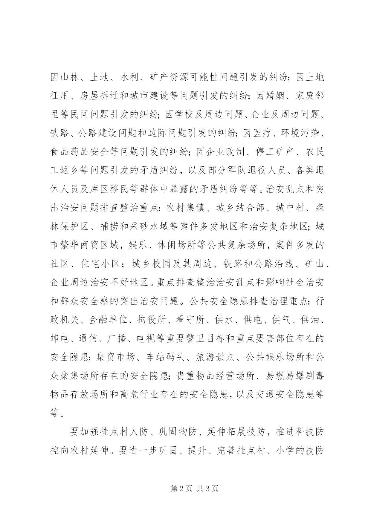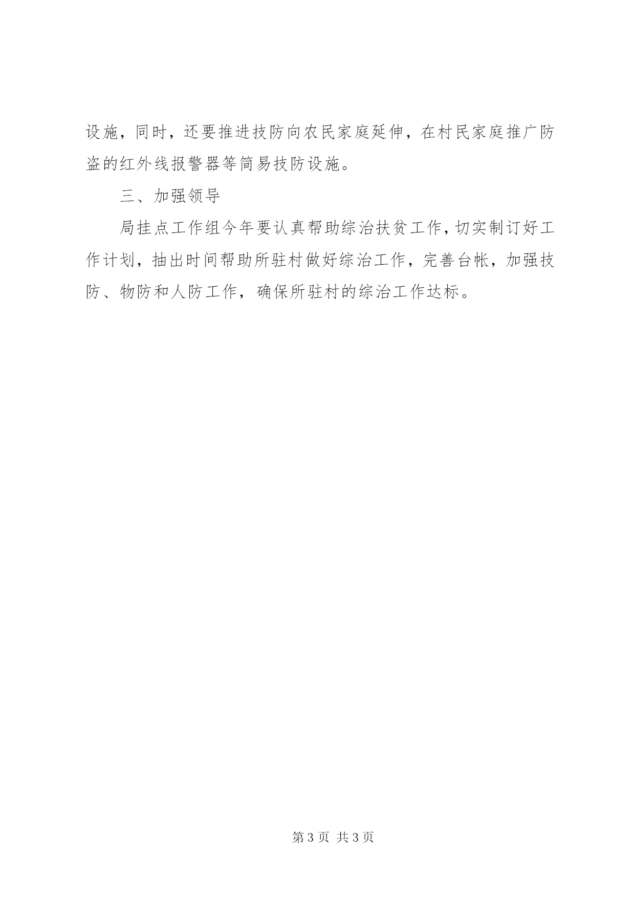 第PAGE\*Arabic\*MERGEFORMAT3页共NUMPAGES\*MERGEFORMAT3页司法局挂乡扶村方案为落实2012年县社会治安综合治理工作要点XX县区综治责任书精神,结合《县2012年社会主义新农村建设和农村基层组织建设挂乡蹲村工作方案》,特制订2012年挂点联系综治、平安创建工作方案:一、指导思想以强化基层综治组织、完善软硬件设施、健全工作机制为重点,以落实责任制为抓手,努力把基层综治组织做强、把综治基础工作做实。继续按照市、县要求,巩固乡镇综治办规范化建设,配齐配强综治干部,提高综治工作保障水平。建立健全乡镇综治委(办)工作制度,有关制度、图表统一制作上墙,资料台帐规范有序。进一步加强挂点村综治工作室建设。进一步规范和加强各种形式的群防群治队伍建设,促进综治与平安建设各项措施在基层全面落实,各种不安定、不安全因素和隐患在基层及时化解,维护社会稳定长效工作机制在基层得到建立和完善。二、工作目标根据县综治委部署,从4月下旬至10月,在全县范围内组织开展排查调处矛盾纠纷、排查整治治安乱点和突出治安问题以及公共安全隐患集中行动(以下简称“三个排查”集中行动)。这是今年综治工作的一个工作重点。局挂点组要督促指导挂点乡镇、村开展好“三个排查”集中行动。矛盾纠纷排查调处重点:因山林、土地、水利、矿产资源可能性问题引发的纠纷;因土地征用、房屋拆迁和城市建设等问题引发的纠纷;因婚姻、家庭邻里等民间问题引发的纠纷;因学校及周边问题、企业及周边问题、铁路、公路建设问题和边际问题引发的纠纷;因医疗、环境污染、食品药品安全等问题引发的纠纷;因企业改制、停工矿产、农民工返乡等问题引发的矛盾纠纷,以及部分军队退役人员、各类退休人员及库区移民等群体中暴露的矛盾纠纷等等。治安乱点和突出治安问题排查整治重点:农村集镇、城乡结合部、城中村、森林保护区、捕捞和采砂水域等案件多发地区和治安复杂地区;城市繁华商贸区域,娱乐、休闲场所等公共复杂场所,案件多发的社区、住宅小区;城乡校园及其周边、铁路和公路沿线、矿山、企业周边治安不好地区。重点排查整治治安乱点和影响社会治安和群众安全感的突出治安问题。公共安全隐患排查治理重点:行政机关、金融单位、拘役所、看守所、供水、供电、供气、供油、邮电、通信、广播、电视等重要警卫目标和重点要害部位存在的安全隐患;集贸市场、车站码头、旅游景点、公共娱乐场所和公众聚集场所存在的安全隐患;贵重物品经营场所、易燃易爆剧毒物品存放场所和高危行业存在的安全隐患,以及交通安全隐患等等。要加强挂点村人防、巩固物防、延伸拓展技防,推进科技防控向农村延伸。要进一步巩固、提升、完善挂点村、小学的技防设施,同时,还要推进技防向农民家庭延伸,在村民家庭推广防盗的红外线报警器等简易技防设施。三、加强领导局挂点工作组今年要认真帮助综治扶贫工作,切实制订好工作计划,抽出时间帮助所驻村做好综治工作,完善台帐,加强技防、物防和人防工作,确保所驻村的综治工作达标。