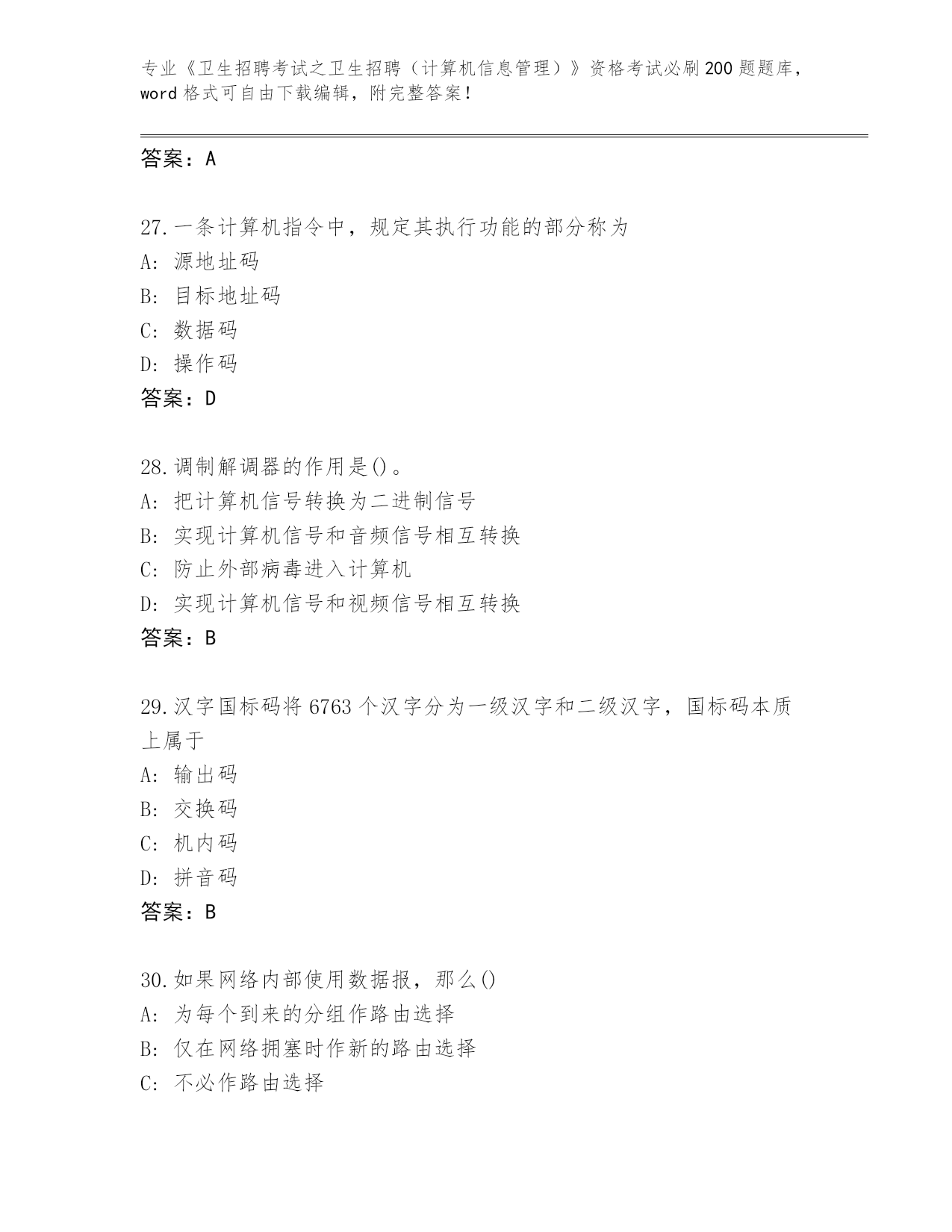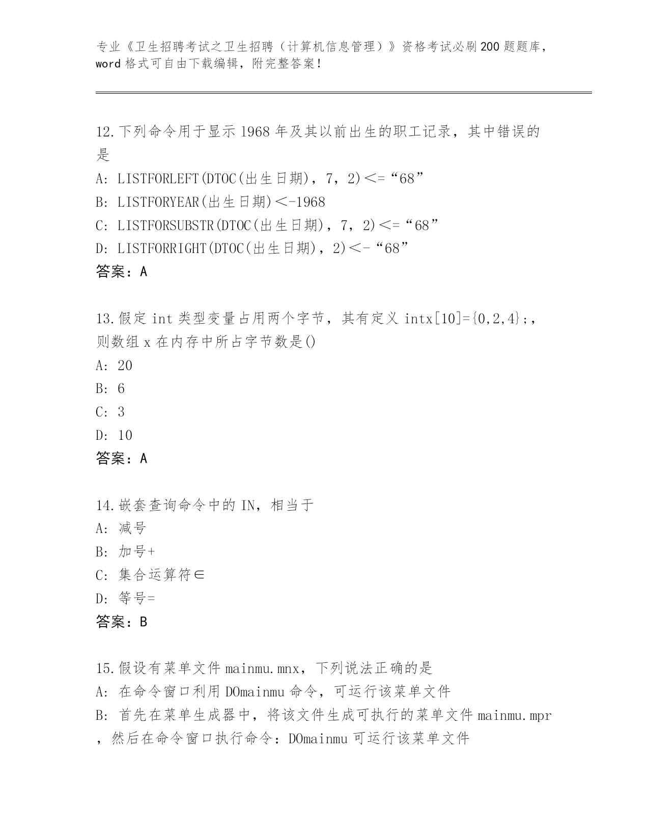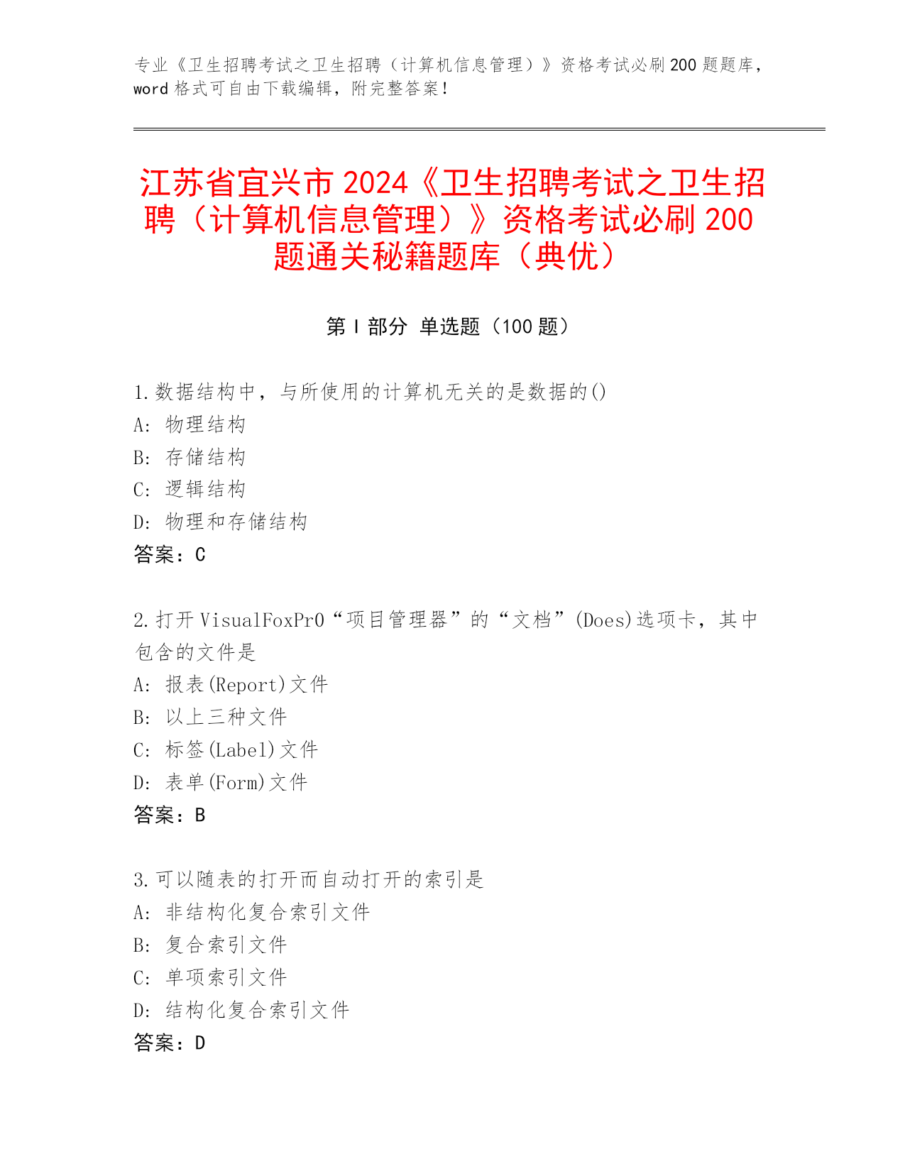 江苏省宜兴市2024《卫生招聘考试之卫生招聘(计算机信息管理)》资格考试必刷200题通关秘籍题库(典优)