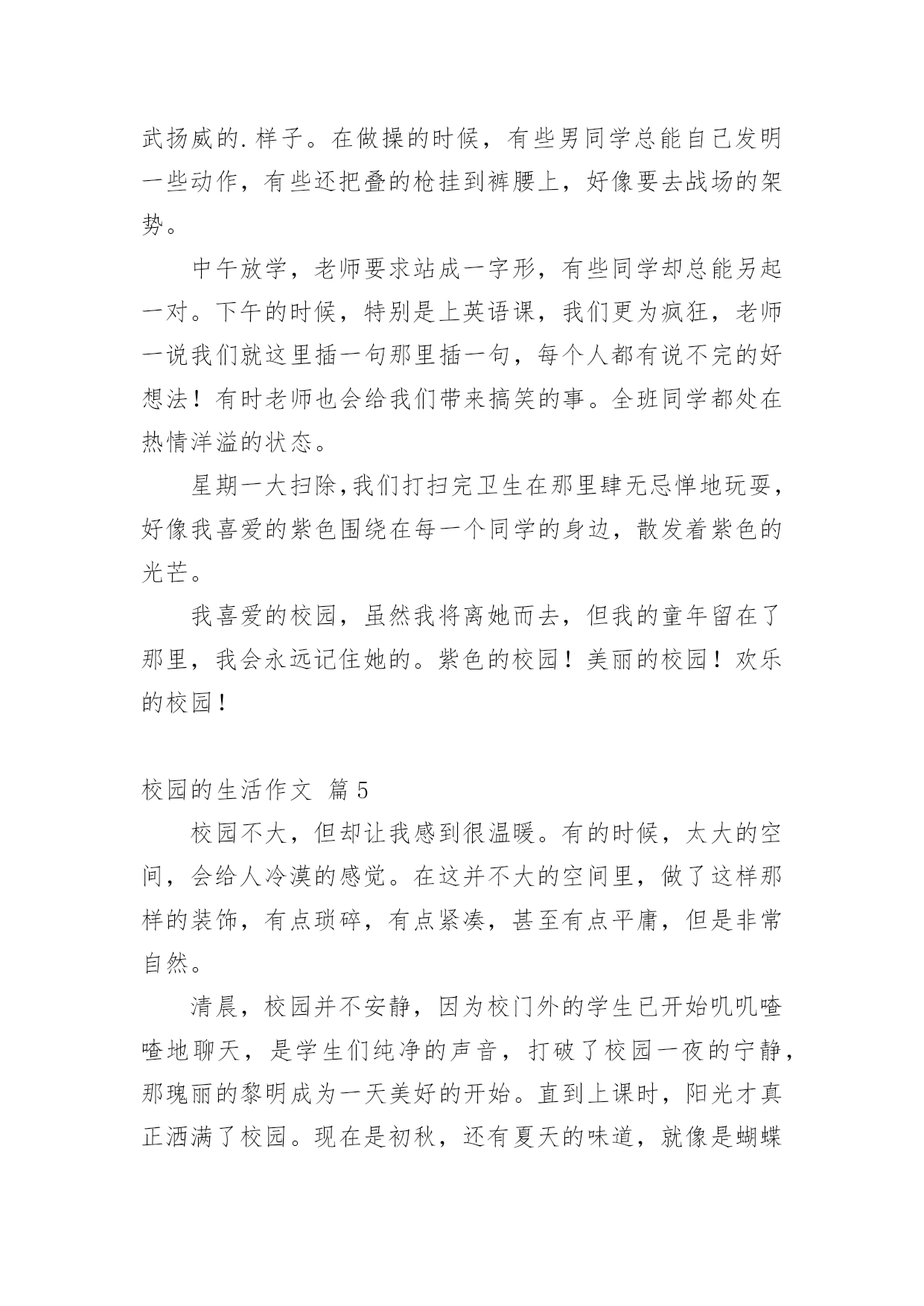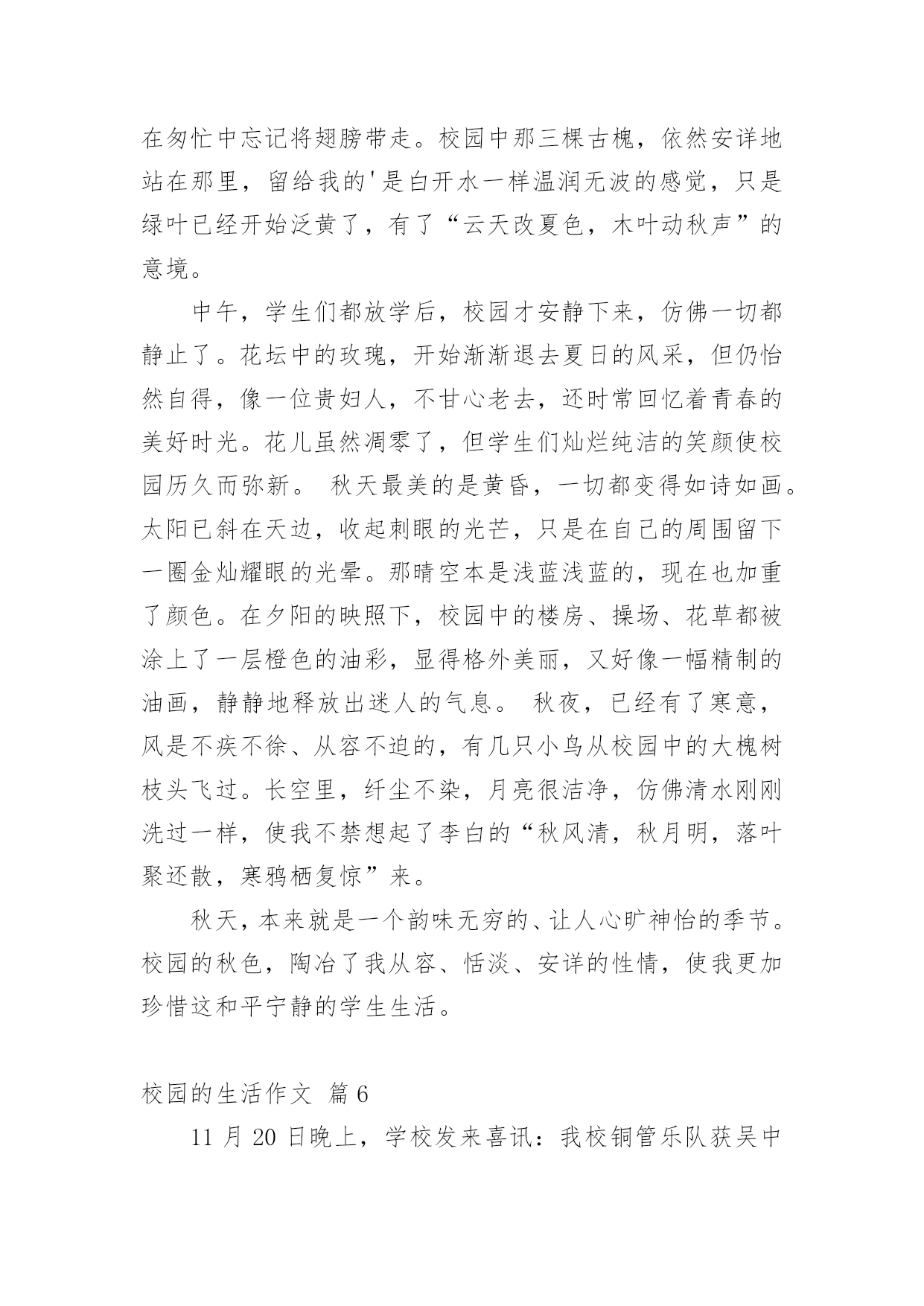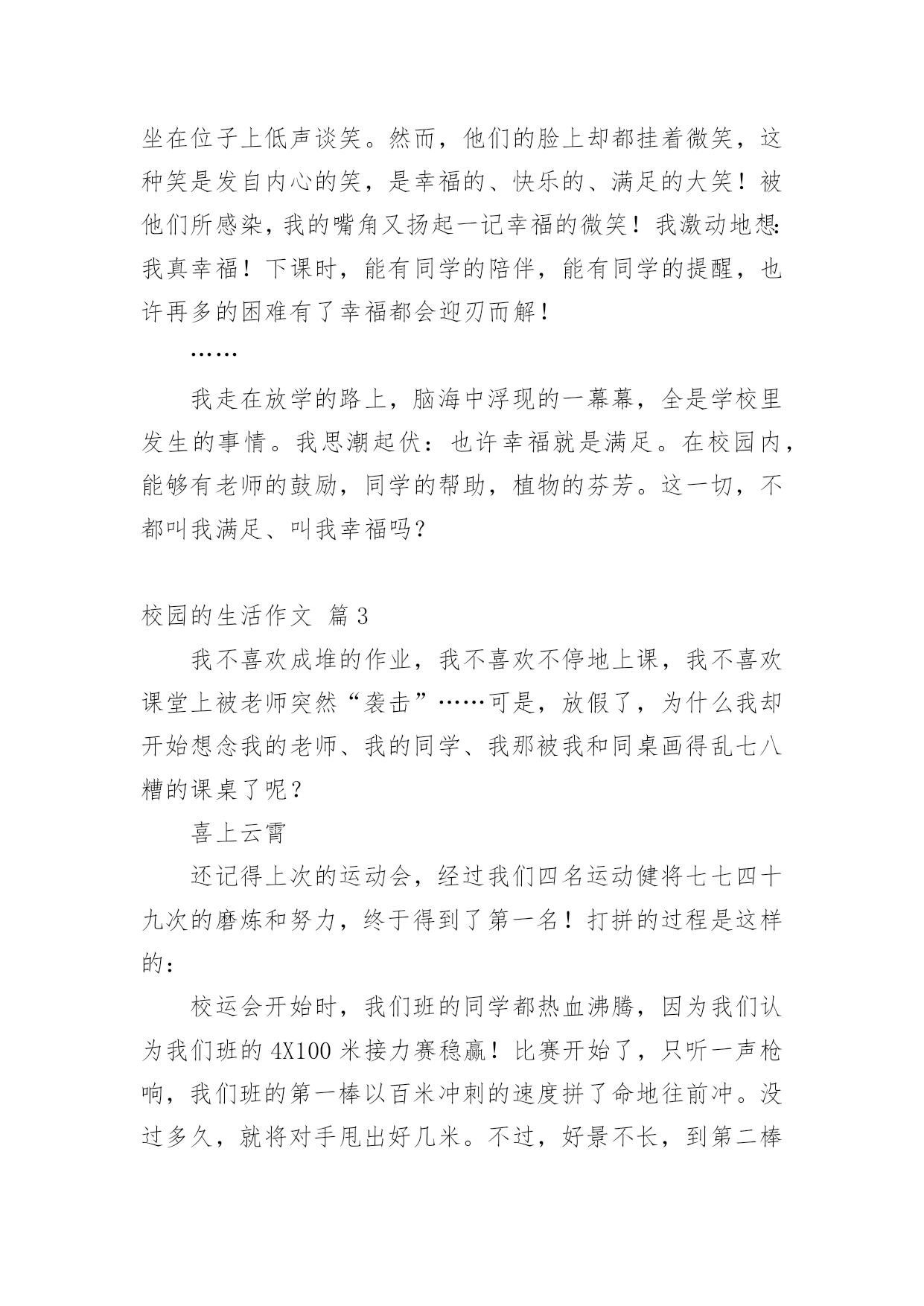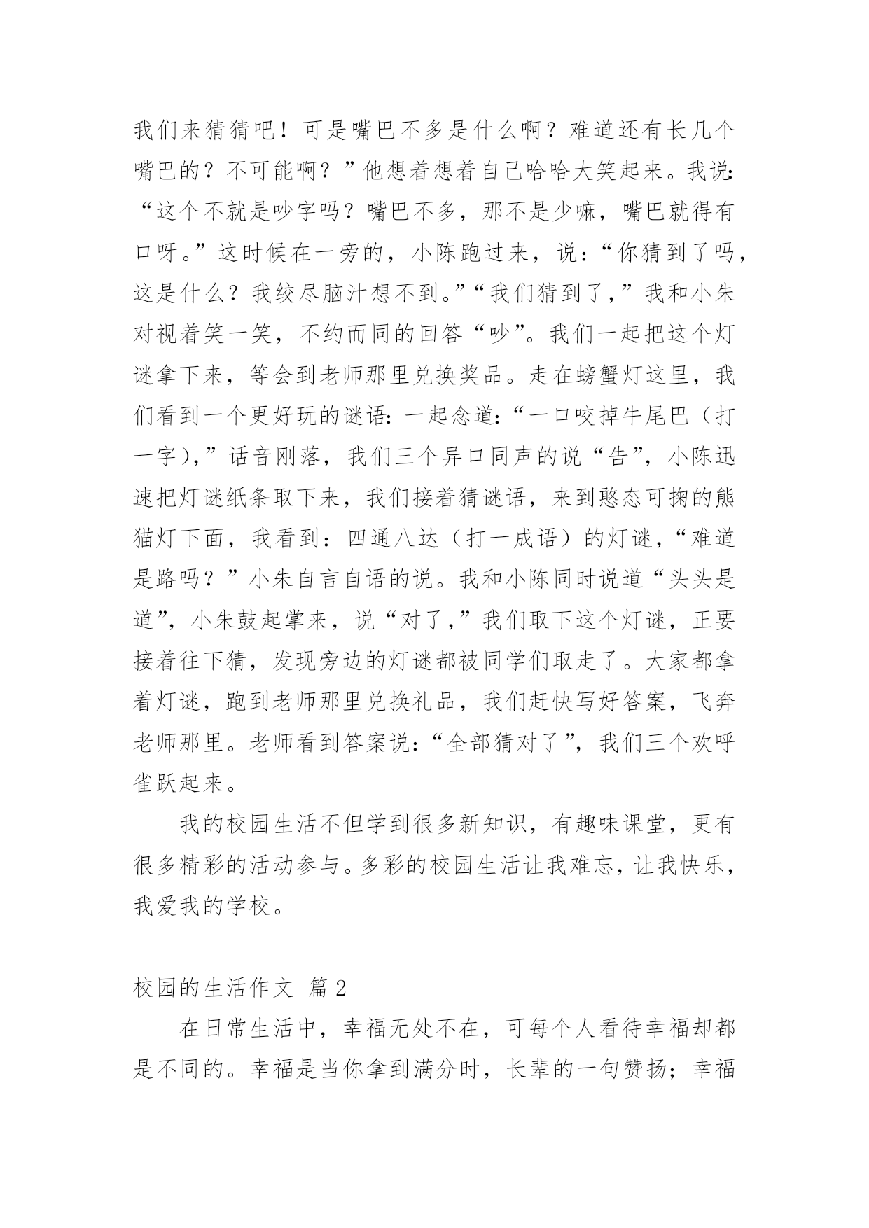 校园的生活作文【必备】校园的生活作文十篇在学习、工作、生活中,大家对作文都不陌生吧,作文根据写作时限的不同可以分为限时作文和非限时作文。你知道作文怎样才能写的好吗?下面是小编收集整理的校园的生活作文10篇,欢迎阅读,希望大家能够喜欢。校园的生活作文篇1今天早上,我背着书包,来到学校,唉,校园怎么变样了?到处张灯结彩,锣鼓喧天,原来今天是元肖节呀!一进教学大楼我就看到许多五颜六色的花灯。有可爱的兔灯,挂在头顶的粉色兔子正张着一双红色的眼睛微笑着看着我;有蝴蝶灯,蝴蝶灯有一双五彩缤纷的翅膀,漂亮极了;还有螃蟹灯,夹着它那大钳子,似乎要爬过来夹我的额头,花灯太多了,我看的眼花缭乱。我对着花灯做了个鬼脸,飞快地跑上楼。进入教室,我发现小朋友们有说有笑,议论纷纷。这时,老师走进来说:“同学们,猜灯迷游戏要开始啦,你们可以找自己的`好朋友,一起到一楼大厅去猜灯迷。”“太棒了!”全班顿时沸腾起来,大家拉着自己的好朋友,冲下楼,到大厅去猜灯谜。我和小朱一起猜灯谜。我看到了兔子灯下面写着:嘴巴不多却能闹(打一汉字)。小朱说:“你看,你看这个简单,我们来猜猜吧!可是嘴巴不多是什么啊?难道还有长几个嘴巴的?不可能啊?”他想着想着自己哈哈大笑起来。我说:“这个不就是吵字吗?嘴巴不多,那不是少嘛,嘴巴就得有口呀。”这时候在一旁的,小陈跑过来,说:“你猜到了吗,这是什么?我绞尽脑汁想不到。”“我们猜到了,”我和小朱对视着笑一笑,不约而同的回答“吵”。我们一起把这个灯谜拿下来,等会到老师那里兑换奖品。走在螃蟹灯这里,我们看到一个更好玩的谜语:一起念道:“一口咬掉牛尾巴(打一字),”话音刚落,我们三个异口同声的说“告”,小陈迅速把灯谜纸条取下来,我们接着猜谜语,来到憨态可掬的熊猫灯下面,我看到:四通八达(打一成语)的灯谜,“难道是路吗?”小朱自言自语的说。我和小陈同时说道“头头是道”,小朱鼓起掌来,说“对了,”我们取下这个灯谜,正要接着往下猜,发现旁边的灯谜都被同学们取走了。大家都拿着灯谜,跑到老师那里兑换礼品,我们赶快写好答案,飞奔老师那里。老师看到答案说:“全部猜对了”,我们三个欢呼雀跃起来。我的校园生活不但学到很多新知识,有趣味课堂,更有很多精彩的活动参与。多彩的校园生活让我难忘,让我快乐,我爱我的学校。校园的生活作文篇2在日常生活中,幸福无处不在,可每个人看待幸福却都是不同的。幸福是当你拿到满分时,长辈的一句赞扬;幸福是当你依偎在妈妈的怀抱里,那一阵阵温暖;幸福也是当你失败时,朋友给你的一声声安慰……但我却总是陶醉在校园那散发出的幸福气息中。早晨刚进到校园的我,便听到一阵阵校园中特有的气息。哦——原来,这是花儿的娇笑声;大树的命令声;体育老师的哨声;训练队同学的喘气声;以及教学楼里传来的朗朗的读书声……一切的一切,在我听来都是那样的动人。我的嘴角不禁向上扬起一记幸福的微笑,心想:我真幸福!能有这样的学习环境伴随着我成长。第一节课,是数学课。教室里,并没有因为学习的压力而严肃,反而充满了愉快的气息。我的眉毛微微皱起,嘴巴向前噘了撅,自言自语道:“哎呀!怎么都解决不了啊!”这时,周老师微笑的走过来,问道:“怎么了?一向百战百胜的郑嘉琦,今天也失败了?”我一偏头,回答:“周老师,别挖苦我了。告诉我怎么解吧!”周老师点点头,拿起纸笔,便在我的本子上圈圈点点。我认真地听着,时常问个问题,周老师的微笑不见了,取而代之的是认真。几分钟过去,我在书上写完最后一个字后,嘴角又扬起一记幸福的微笑。我用手支着头,心想:呵呵!又解决了一道难题,虽然是在老师的帮助下完成的',但是并不可惜!我真幸福,有老师的帮助、照顾……”下课了,走廊、教室里同学们各干各的事。瞧,刘杨正埋着头安静的画画;李泽妍则在教室里提醒同学们注意安全;邓楚楚站在椅子上,像男生般大声呼喊;黄思远和吴希平则坐在位子上低声谈笑。然而,他们的脸上却都挂着微笑,这种笑是发自内心的笑,是幸福的、快乐的、满足的大笑!被他们所感染,我的嘴角又扬起一记幸福的微笑!我激动地想:我真幸福!下课时,能有同学的陪伴,能有同学的提醒,也许再多的困难有了幸福都会迎刃而解!……我走在放学的路上,脑海中浮现的一幕幕,全是学校里发生的事情。我思潮起伏:也许幸福就是满足。在校园内,能够有老师的鼓励,同学的帮助,植物的芬芳。这一切,不都叫我满足、叫我幸福吗?校园的生活作文篇3我不喜欢成堆的作业,我不喜欢不停地上课,我不喜欢课堂上被老师突然“袭击”……可是,放假了,为什么我却开始想念我的老师、我的同学、我那被我和同桌画得乱七八糟的课桌了呢?喜上云霄还记得上次的运动会,经过我们四名运动健将七七四十九次的磨炼和努力,终于得到了第一名!打拼的过程是这样的:校运会开始时,我们班的同学都热血沸腾,因为我们认为我们班的4X100米接力赛稳赢!比赛开始了,