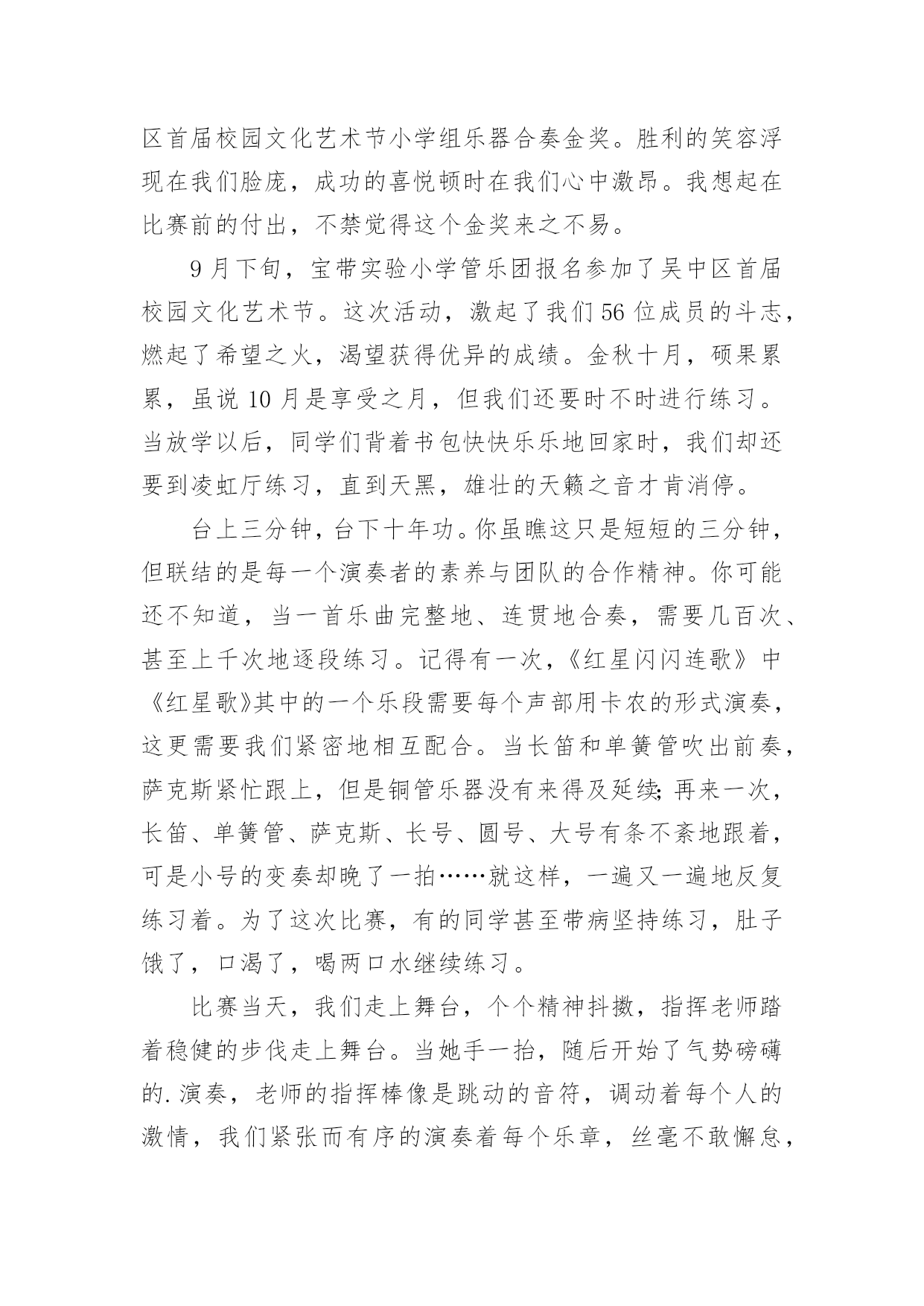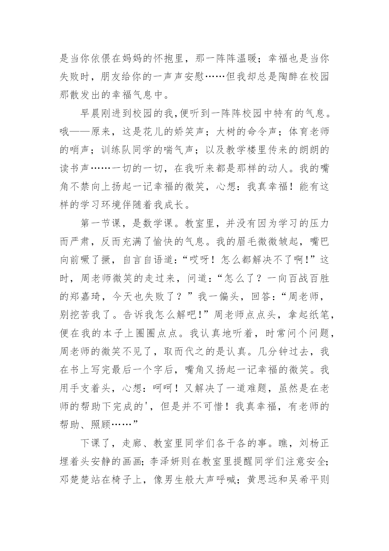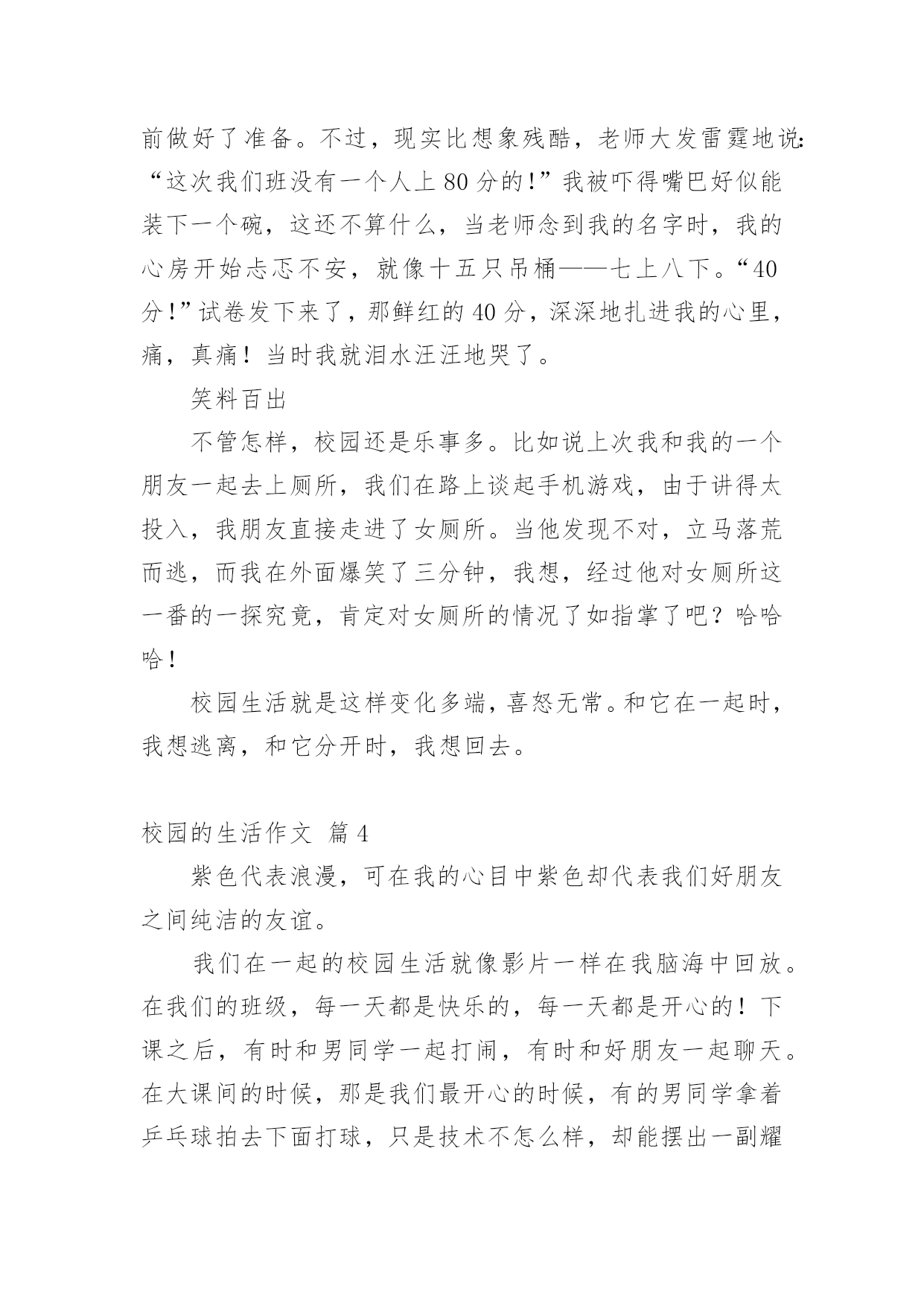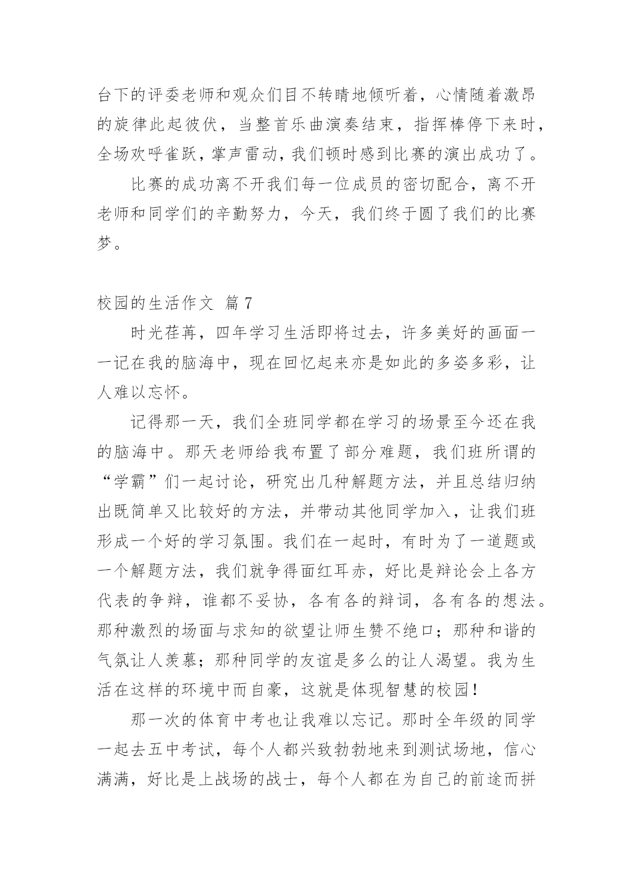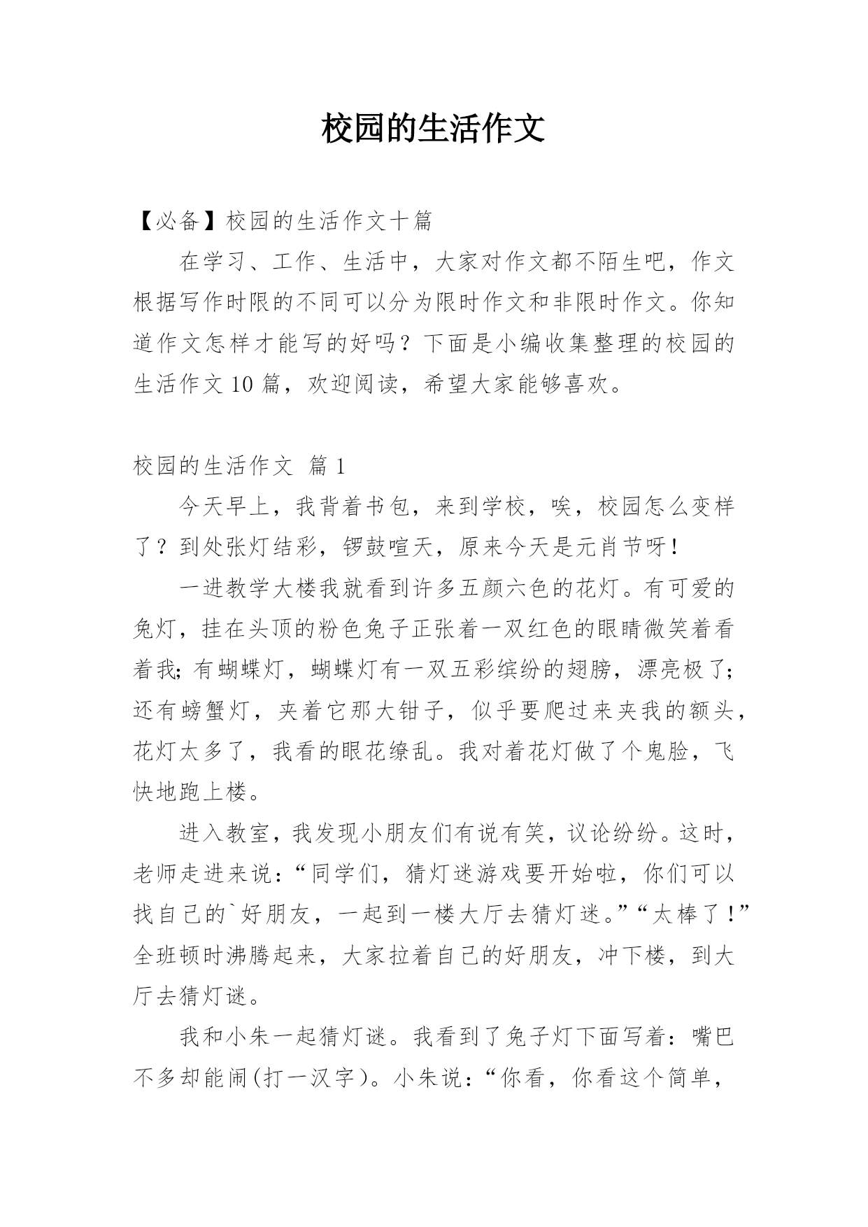 校园的生活作文【必备】校园的生活作文十篇在学习、工作、生活中,大家对作文都不陌生吧,作文根据写作时限的不同可以分为限时作文和非限时作文。你知道作文怎样才能写的好吗?下面是小编收集整理的校园的生活作文10篇,欢迎阅读,希望大家能够喜欢。校园的生活作文篇1今天早上,我背着书包,来到学校,唉,校园怎么变样了?到处张灯结彩,锣鼓喧天,原来今天是元肖节呀!一进教学大楼我就看到许多五颜六色的花灯。有可爱的兔灯,挂在头顶的粉色兔子正张着一双红色的眼睛微笑着看着我;有蝴蝶灯,蝴蝶灯有一双五彩缤纷的翅膀,漂亮极了;还有螃蟹灯,夹着它那大钳子,似乎要爬过来夹我的额头,花灯太多了,我看的眼花缭乱。我对着花灯做了个鬼脸,飞快地跑上楼。进入教室,我发现小朋友们有说有笑,议论纷纷。这时,老师走进来说:“同学们,猜灯迷游戏要开始啦,你们可以找自己的`好朋友,一起到一楼大厅去猜灯迷。”“太棒了!”全班顿时沸腾起来,大家拉着自己的好朋友,冲下楼,到大厅去猜灯谜。我和小朱一起猜灯谜。我看到了兔子灯下面写着:嘴巴不多却能闹(打一汉字)。小朱说:“你看,你看这个简单,我们来猜猜吧!可是嘴巴不多是什么啊?难道还有长几个嘴巴的?不可能啊?”他想着想着自己哈哈大笑起来。我说:“这个不就是吵字吗?嘴巴不多,那不是少嘛,嘴巴就得有口呀。”这时候在一旁的,小陈跑过来,说:“你猜到了吗,这是什么?我绞尽脑汁想不到。”“我们猜到了,”我和小朱对视着笑一笑,不约而同的回答“吵”。我们一起把这个灯谜拿下来,等会到老师那里兑换奖品。走在螃蟹灯这里,我们看到一个更好玩的谜语:一起念道:“一口咬掉牛尾巴(打一字),”话音刚落,我们三个异口同声的说“告”,小陈迅速把灯谜纸条取下来,我们接着猜谜语,来到憨态可掬的熊猫灯下面,我看到:四通八达(打一成语)的灯谜,“难道是路吗?”小朱自言自语的说。我和小陈同时说道“头头是道”,小朱鼓起掌来,说“对了,”我们取下这个灯谜,正要接着往下猜,发现旁边的灯谜都被同学们取走了。大家都拿着灯谜,跑到老师那里兑换礼品,我们赶快写好答案,飞奔老师那里。老师看到答案说:“全部猜对了”,我们三个欢呼雀跃起来。我的校园生活不但学到很多新知识,有趣味课堂,更有很多精彩的活动参与。多彩的校园生活让我难忘,让我快乐,我爱我的学校。校园的生活作文篇2在日常生活中,幸福无处不在,可每个人看待幸福却都是不同的。幸福是当你拿到满分时,长辈的一句赞扬;幸福是当你依偎在妈妈的怀抱里,那一阵阵温暖;幸福也是当你失败时,朋友给你的一声声安慰……但我却总是陶醉在校园那散发出的幸福气息中。早晨刚进到校园的我,便听到一阵阵校园中特有的气息。哦——原来,这是花儿的娇笑声;大树的命令声;体育老师的哨声;训练队同学的喘气声;以及教学楼里传来的朗朗的读书声……一切的一切,在我听来都是那样的动人。我的嘴角不禁向上扬起一记幸福的微笑,心想:我真幸福!能有这样的学习环境伴随着我成长。第一节课,是数学课。教室里,并没有因为学习的压力而严肃,反而充满了愉快的气息。我的眉毛微微皱起,嘴巴向前噘了撅,自言自语道:“哎呀!怎么都解决不了啊!”这时,周老师微笑的走过来,问道:“怎么了?一向百战百胜的郑嘉琦,今天也失败了?”我一偏头,回答:“周老师,别挖苦我了。告诉我怎么解吧!”周老师点点头,拿起纸笔,便在我的本子上圈圈点点。我认真地听着,时常问个问题,周老师的微笑不见了,取而代之的是认真。几分钟过去,我在书上写完最后一个字后,嘴角又扬起一记幸福的微笑。我用手支着头,心想:呵呵!又解决了一道难题,虽然是在老师的帮助下完成的',但是并不可惜!我真幸福,有老师的帮助、照顾……”下课了,走廊、教室里同学们各干各的事。瞧,刘杨正埋着头安静的画画;李泽妍则在教室里提醒同学们注意安全;邓楚楚站在椅子上,像男生般大声呼喊;黄思远和吴希平则坐在位子上低声谈笑。然而,他们的脸上却都挂着微笑,这种笑是发自内心的笑,是幸福的、快乐的、满足的大笑!被他们所感染,我的嘴角又扬起一记幸福的微笑!我激动地想:我真幸福!下课时,能有同学的陪伴,能有同学的提醒,也许再多的困难有了幸福都会迎刃而解!……我走在放学的路上,脑海中浮现的一幕幕,全是学校里发生的事情。我思潮起伏:也许幸福就是满足。在校园内,能够有老师的鼓励,同学的帮助,植物的芬芳。这一切,不都叫我满足、叫我幸福吗?校园的生活作文篇3我不喜欢成堆的作业,我不喜欢不停地上课,我不喜欢课堂上被老师突然“袭击”……可是,放假了,为什么我却开始想念我的老师、我的同学、我那被我和同桌画得乱七八糟的课桌了呢?喜上云霄还记得上次的运动会,经过我们四名运动健将七七四十九次的磨炼和努力,终于得到了第一名!打拼的过程是这样的:校运会开始时,我们班的同学都热血沸腾,因为我们认为我们班的4X100米接力赛稳赢!比赛开始了,