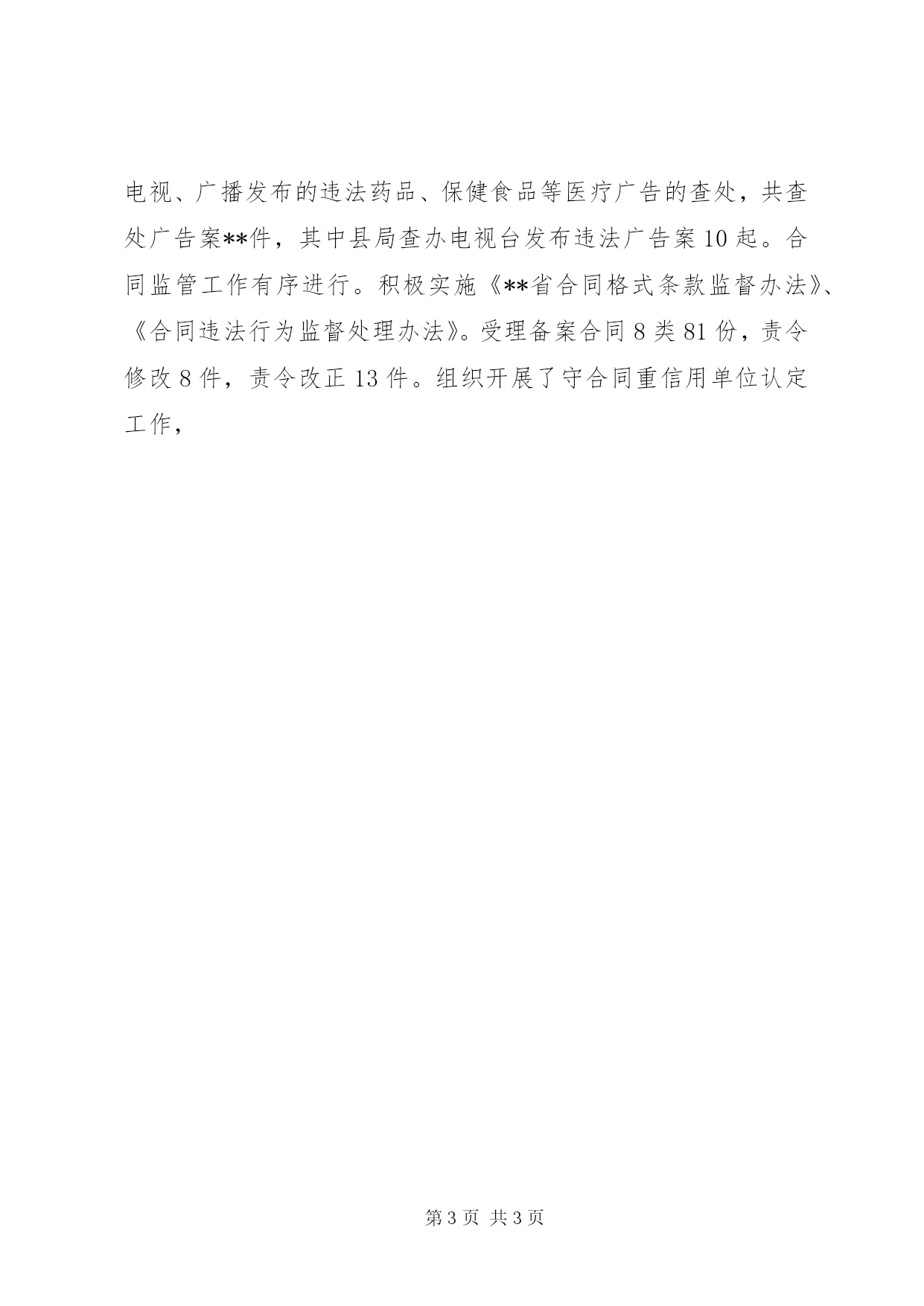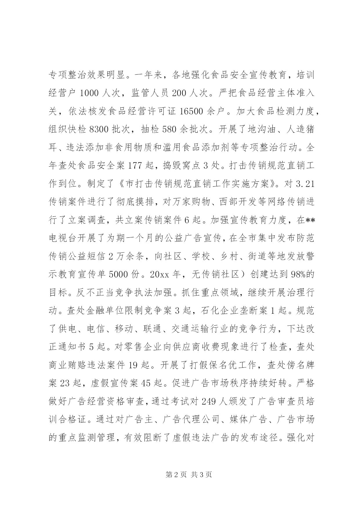 第PAGE\*Arabic\*MERGEFORMAT3页共NUMPAGES\*MERGEFORMAT3页XX年度工商局年终工作总结20xx年是深入学习贯彻落实党的十八大精神的开局之年,也是全面小康社会和中国特色社会主义社会建设的关键一年。在本年度的工作当中,在市委、市政府的正确领导下,认真组织学习党的十八大精神,紧紧围绕年初工作会议制定的工作计划和部署安排,贯彻执行上级工商行政管理机关关于工商行政管理工作的方针、政策、法律、法规和规章制度,较好的完成了各项工作任务。现将本年度工作情况总结汇报如下:一、20xx年工作情况。(一)突出重点,服务发展效能进一步提升。服务市场主体健康发展有新作为。全市工商部门通过强化政策服务、效率服务、职能服务,促进了各类市场主体稳定健康发展,营造了公平有序的发展环境。服务区域经济发展有新提升。出台了《xx市工商系统支持赣南等原中央苏区振兴发展二十九条》意见,从市场准入、简化办事程序、构建现代产业体系三个方面全力推动吉安经济发展。发挥职能作用服务吉泰走廊建设,为吉泰走廊上升为国家和省发展战略作出了新贡献。全力支持全民创业,为全民创业搭建更为宽松、便利的环境。对重点项目建设,实行一对一挂钩服务。针对文化体制改革单位,提前介入、跟踪办理,获得了党委政府及有关部门好评。(二)加强监管,维护市场秩序效能进一步提升。食品安全专项整治效果明显。一年来,各地强化食品安全宣传教育,培训经营户1000人次,监管人员200人次。严把食品经营主体准入关,依法核发食品经营许可证16500余户。加大食品检测力度,组织快检8300批次,抽检580余批次。开展了地沟油、人造猪耳、违法添加非食用物质和滥用食品添加剂等专项整治行动。全年查处食品安全案177起,捣毁窝点3处。打击传销规范直销工作到位。制定了《市打击传销规范直销工作实施方案》。对3.21传销案件进行了彻底摸排,对万家购物、西部开发等网络传销进行了立案调查,共立案传销案件6起。加强宣传教育力度,在**电视台开展了为期一个月的公益广告宣传,在全市集中发布防范传销公益短信2万余条,向社区、学校、乡村、街道等地发放警示教育宣传单5000份。20xx年,无传销社区)创建达到98%的目标。反不正当竞争执法加强。抓住重点领域,继续开展治理行动。查处金融单位限制竞争案3起,石化企业垄断案1起。规范了供电、电信、移动、联通、交通运输行业的竞争行为,下达改正通知书5起。对零售企业向供应商收费现象进行了检查,查处商业贿赂违法案件19起。开展了打假保名优工作,查处傍名牌案23起,虚假宣传案45起。促进广告市场秩序持续好转。严格做好广告经营资格审查,通过考试对249人颁发了广告审查员培训合格证。通过对广告主、广告代理公司、媒体广告、广告市场的重点监测管理,有效阻断了虚假违法广告的发布途径。强化对电视、广播发布的违法药品、保健食品等医疗广告的查处,共查处广告案**件,其中县局查办电视台发布违法广告案10起。合同监管工作有序进行。积极实施《**省合同格式条款监督办法》、《合同违法行为监督处理办法》。受理备案合同8类81份,责令修改8件,责令改正13件。组织开展了守合同重信用单位认定工作,