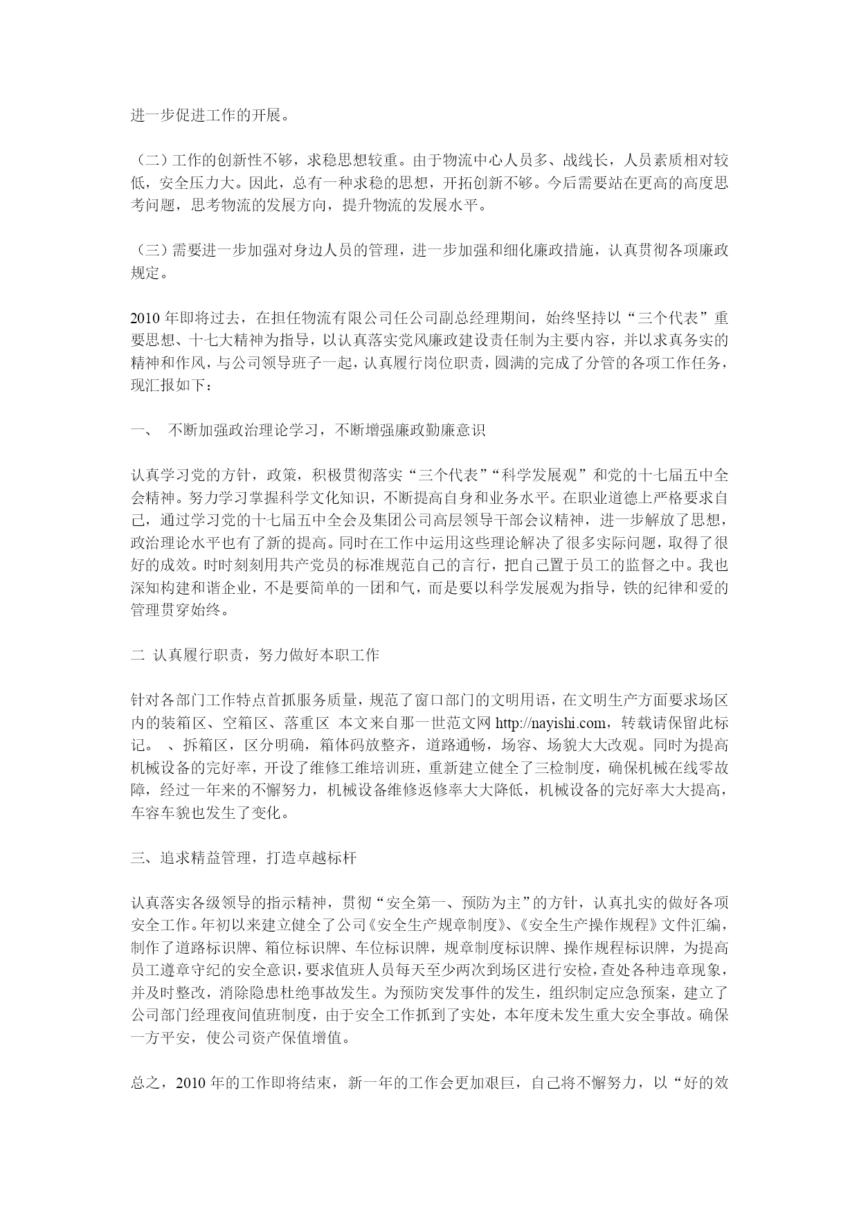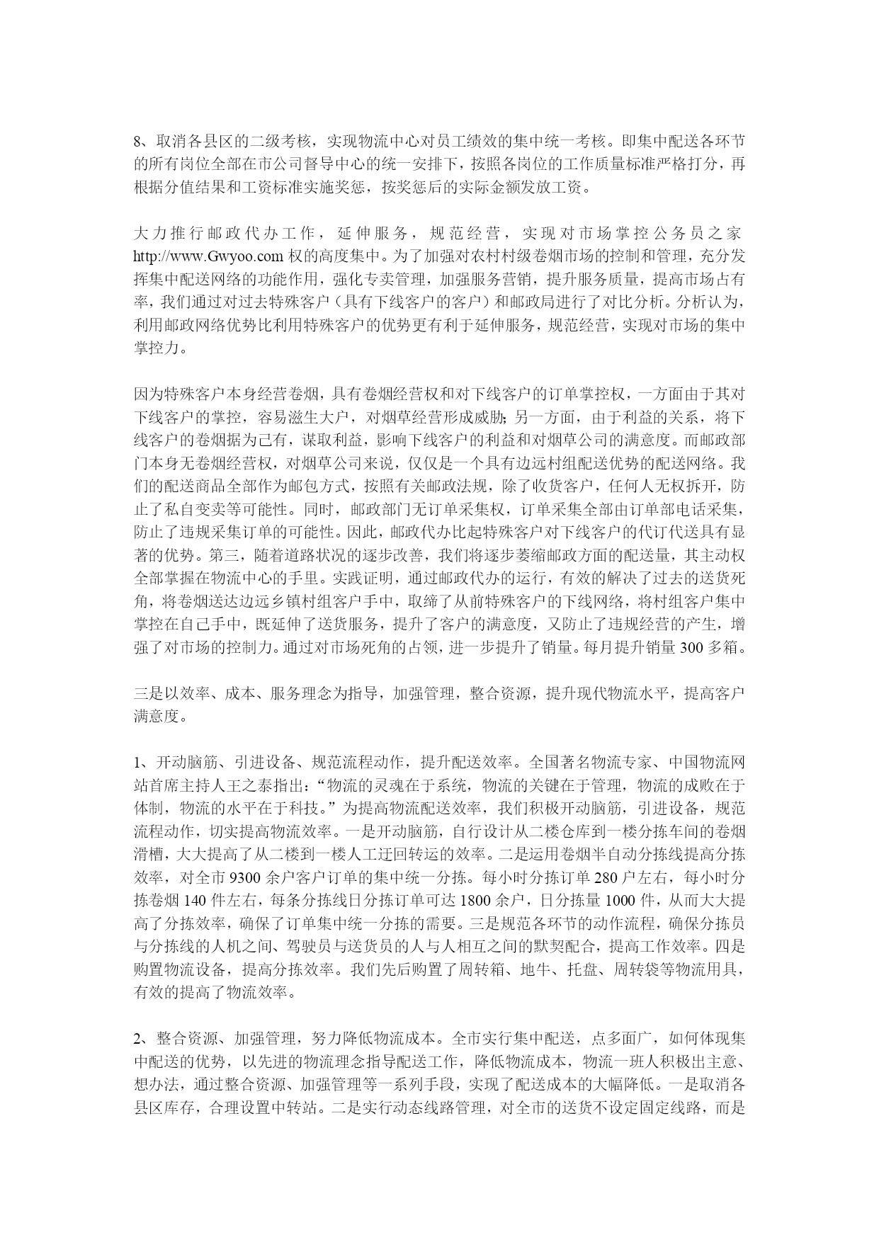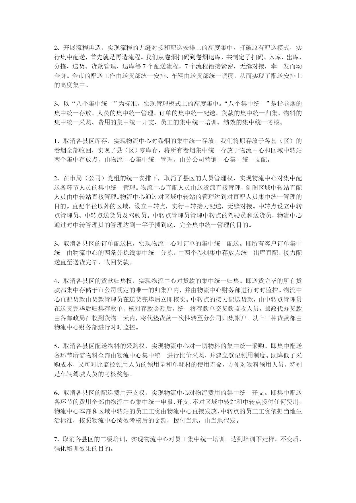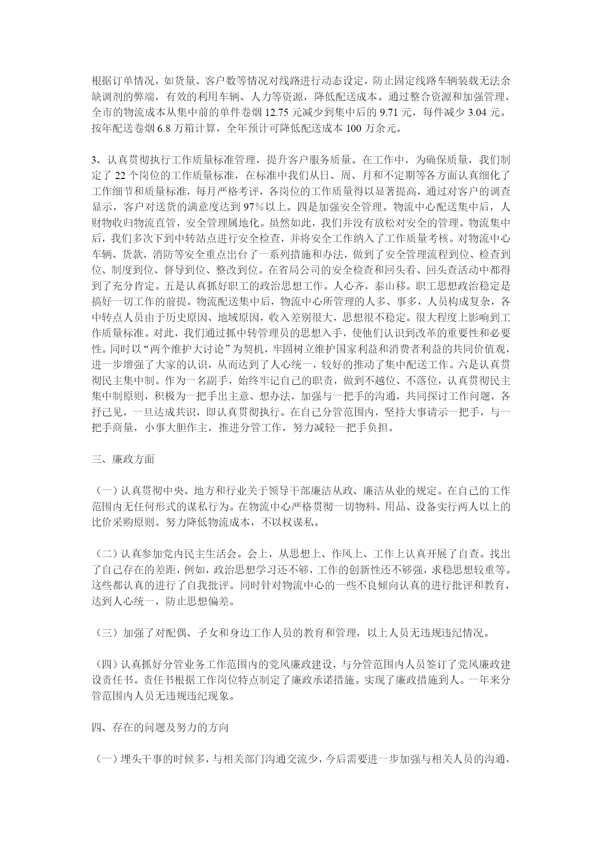 物流公司经理述职报告(2)今年,是市公司进行“三集中”试点改革的一年,在“三集中”中,我积极投身改革,结合物流中心实际,与大家一起积极探索物流集中的方案和办法,在市局(公司)的领导下探索了“干线自主、支线代办、一票到底”的配送模式,实现了“八个集中统一”的管理方式,制定了全市物流配送各环节的工作流程和质量标准,实现了物流配送组织构架、市场掌控、配送安排和管理模式的“四个高度集中”。现将一年来工作和廉政情况作如下汇报。一、学习方面(一)加强政治理论学习。1、认真学习马克思列宁主义、毛泽东思想、邓小平理论,认真学习十六大精神和“三个代表”重要思想,认真学习党最新的路线、方针、政策。通过各种学习,认真领会马列主义、毛泽东思想、邓小平理论和“三个代表”重要思想的精神实质,提高了自己的认识水平,进一步明确了前进的方向,澄清了头脑中的模糊认识,始终保持理论上的清醒和政治上的坚定。进一步坚定了正确的世界观、人生观和价值观,提高了认识问题、分析问题、理解问题、解决问题的能力。2、认真学习了新党章和十六大以来的中央政策精神。通过学习,提高了自己的政治素质和应用政策的能力。通过及时了解中央的最新精神,使自己能够紧跟党中央的步伐,及时以最新的精神指导自己的各项工作。3、认真学习了《保持共产党员先进型教育读本》、《马克思主义四观两论》等书籍。通过不断的学习,达到了不断提高的目的,使自己永远保持共产党员的先进型,不退色、不变色。(二)认真学习烟草业务和现代物流知识,提高综合素质和烟草经营管理水平。经济全球化步伐的加快,烟草面临的国际竞争压力越来越大,对烟草人的要求越来越高,新的经营理念、新的管理方式不断涌现。逆水行舟,不进则退。现代物流是一个向时间、向空间要效益的一个新兴产业,是一个现代流通的第三利润源泉。烟草物流作为现代物流的一个分支,既有着现代物流的共性,又有着烟草物流的特性。烟草要作大作强,需要注入现代物流的新理念。因此,需要不断的学习。二、工作方面一认真贯彻执行党的路线、方针、政策和上级指示精神。在“三集中”改革中,我认真贯彻市局公司的决定,认真履行自己的工作职责,为物流配送发挥积极的作用。一是结合山区特点,认真贯彻执行以物流中心为圆心的“干线自主、支线代办、一票到底”的集中配送模式。二是加强管理,再造流程,实现“四个高度集中”。1、合理设置集中配送组织构架和岗位人员,实现组织构架上的高度集中。根据省局要求和实际,除在物流中心的内设机构上设置了综合部、送货部、储配部、安保部、财务部5个部门外,同时根据的特殊情况在剑阁设置了区域中转站,负责的配送工作。在送货部下设旺苍和朝天曾家中转点,在剑阁区域中转站下设了苍溪和青川两个中转点。中转点起到了承上启下、接力配送的作用。为确保集中配送工作能顺利的实现,在组织构架中,我们还设置了22个工作岗位,其中在直配线路上设置了驾驶员、送货员;接力配送线路上,在仓库与中转点之间设置了区间中转员,在中转点设置了中转管理员,中转管理员下面设驾送人员。这样,一个完整的组织构架就完全搭建好了,为集中配送的实施奠定了管理基础。2、开展流程再造,实现流程的无缝对接和配送安排上的高度集中。打破原有配送模式,实行集中配送,首先就是再造流程。我们从卷烟扫码到卷烟退库,共制定了扫码、入库、出库、分拣、送货、货款管理、退库等7个配送流程,7个流程衔接紧密,无缝对接,牵一发而动全身。全市的配送工作由送货部统一安排、车辆由送货部统一调度,从而实现了配送安排上的高度集中。3、以“八个集中统一”为标准,实现管理模式上的高度集中。“八个集中统一”是指卷烟的集中统一存放、人员的集中统一管理、订单的集中统一配送、货款的集中统一归集、物料的集中统一采购、费用的集中统一开支、员工的集中统一培训、绩效的集中统一考核。1、取消各县区库存,实现物流中心对卷烟的集中统一存放。我们将原存放于各县(区)的卷烟全部收回,实现了县(区)零库存,将所有卷烟集中统一存放于物流中心和区域中转站两个集中存放点,由物流中心集中统一管理,由分公司营销中心集中统一支配。2、在市局(公司)党组的统一安排下,取消了县区的人员管理权,实现物流中心对集中配送各环节人员的集中统一管理。物流中心直配人员由送货部直接管理,剑阁区域中转站直配人员由中转站直接管理。物流中心通过对区域中转站的管理达到对直配人员集中统一管理的目的。直配半径以外的区域,设立中转点,实行中转接力配送,无缝对接。中转点设立中转点管理员、中转点送货员及驾驶员。中转点管理员管理中转点的驾驶员和送货员,物流中心通过对中转管理员的管理达到一竿子插到底、完全集中统一管理的目的。3、取消各县区的订单配送权,实现物流中心对订单的集中统一配送。即所有客户订单集中统一由物流中心的两条分拣线集中统一