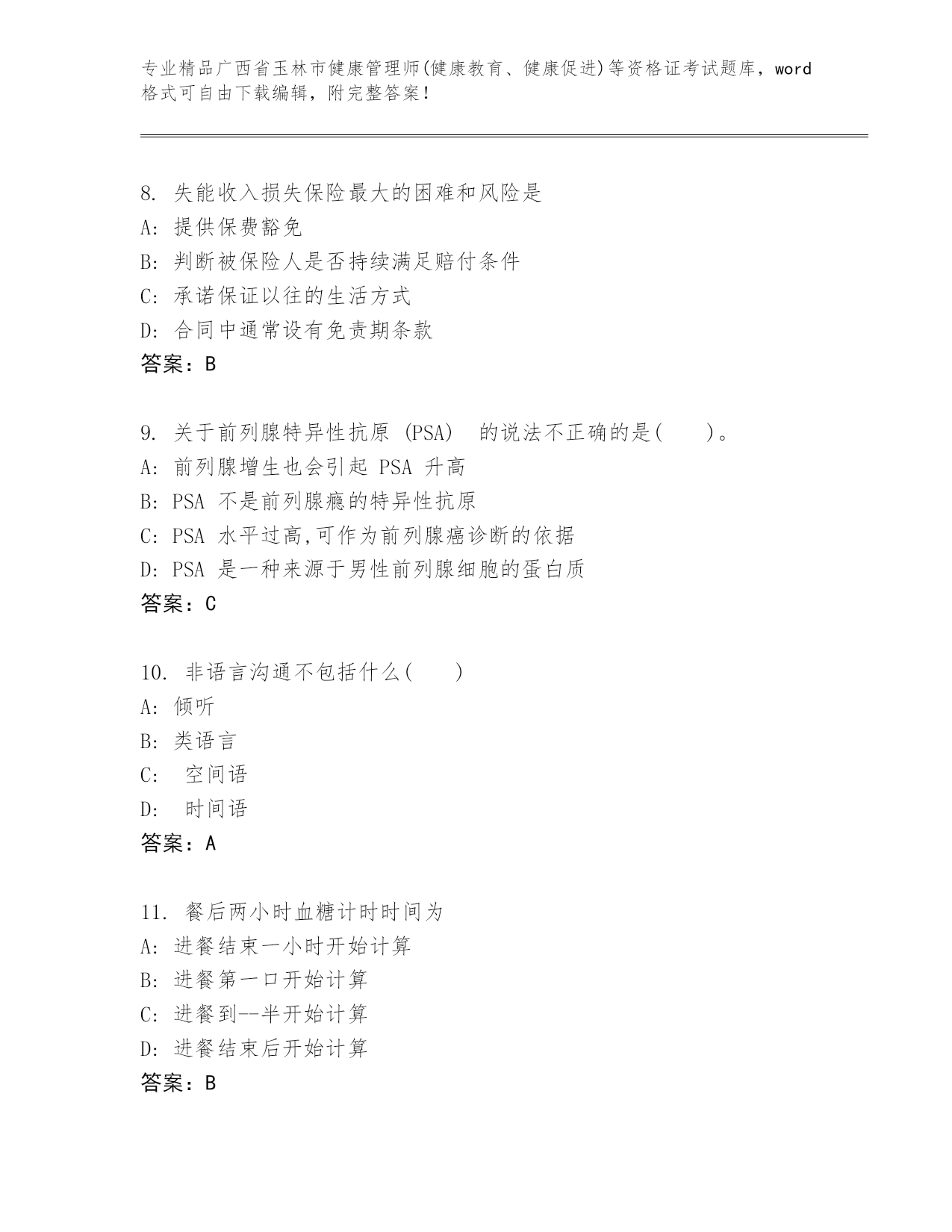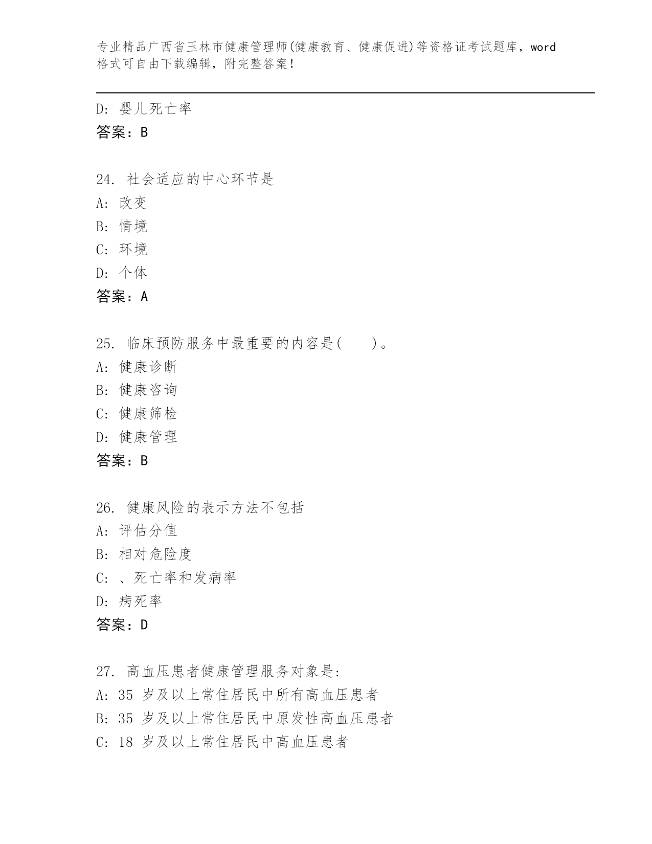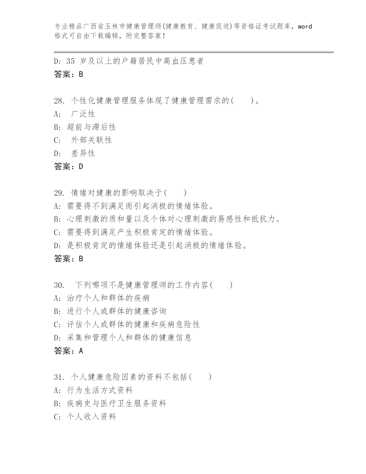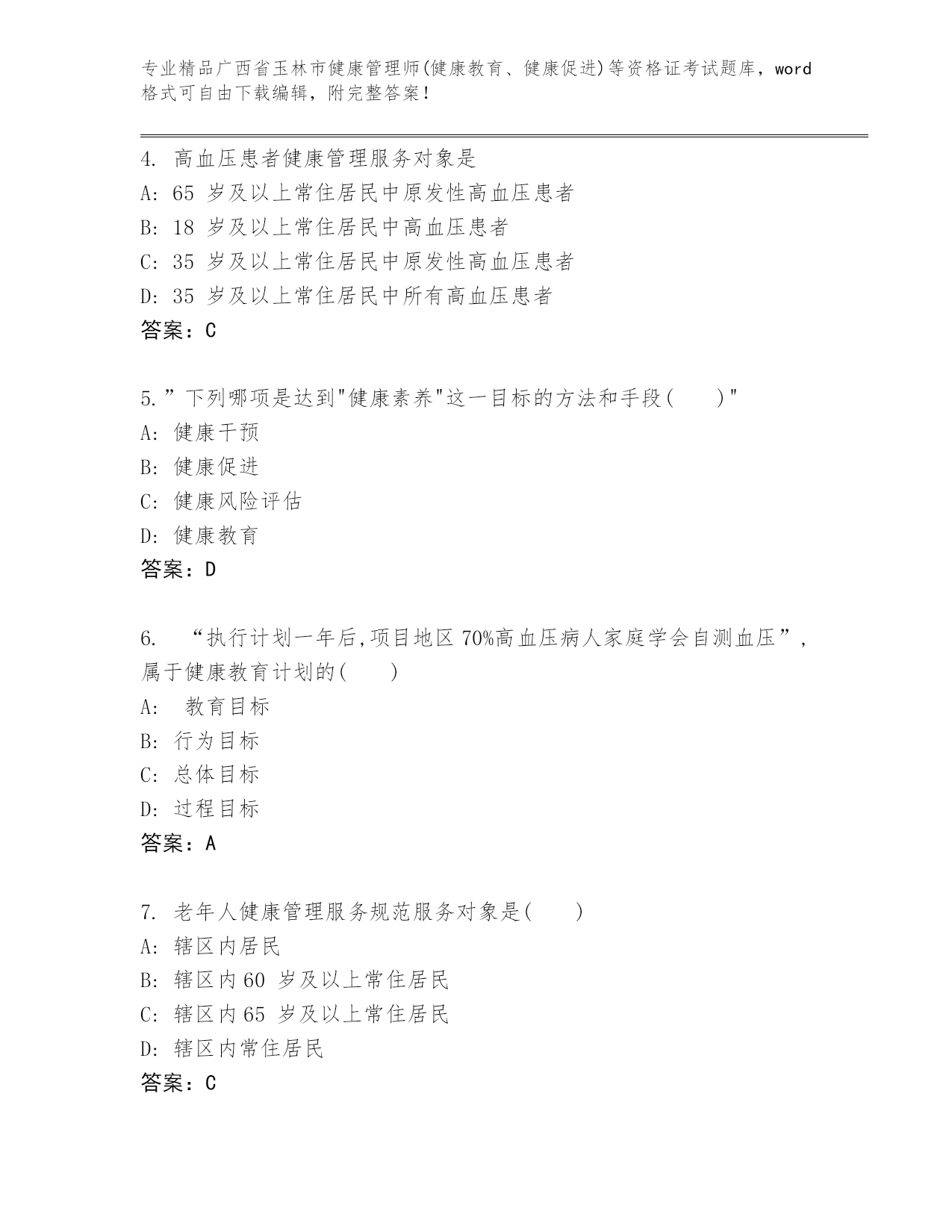 广西省玉林市健康管理师(健康教育、健康促进)等资格证考试通用题库附答案【精练】