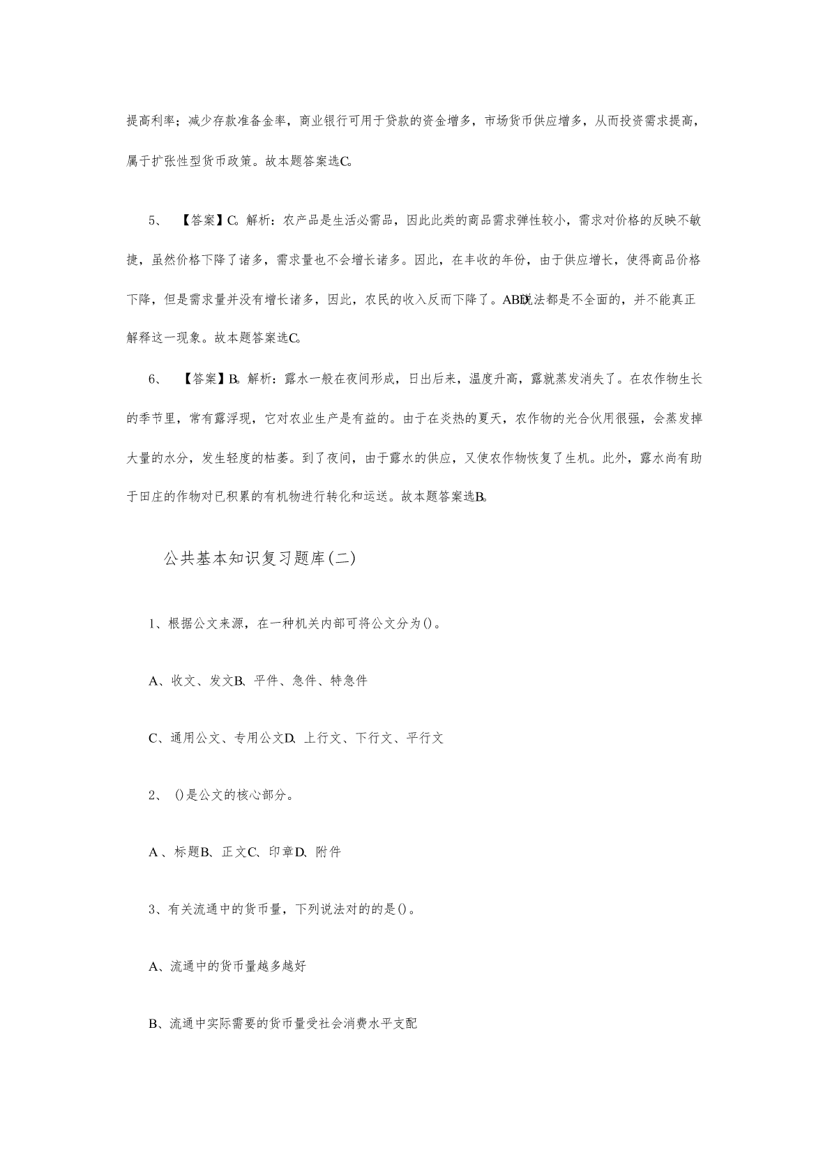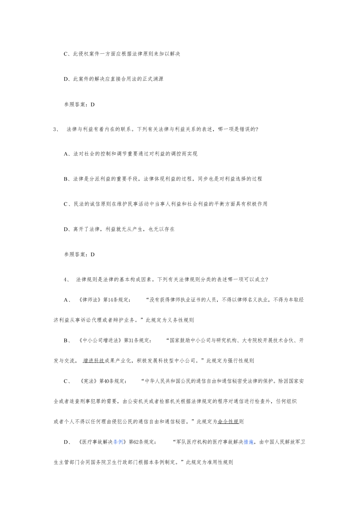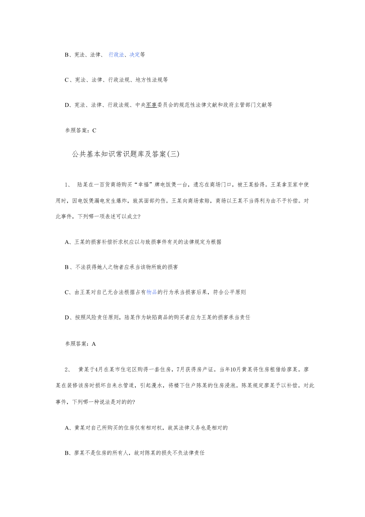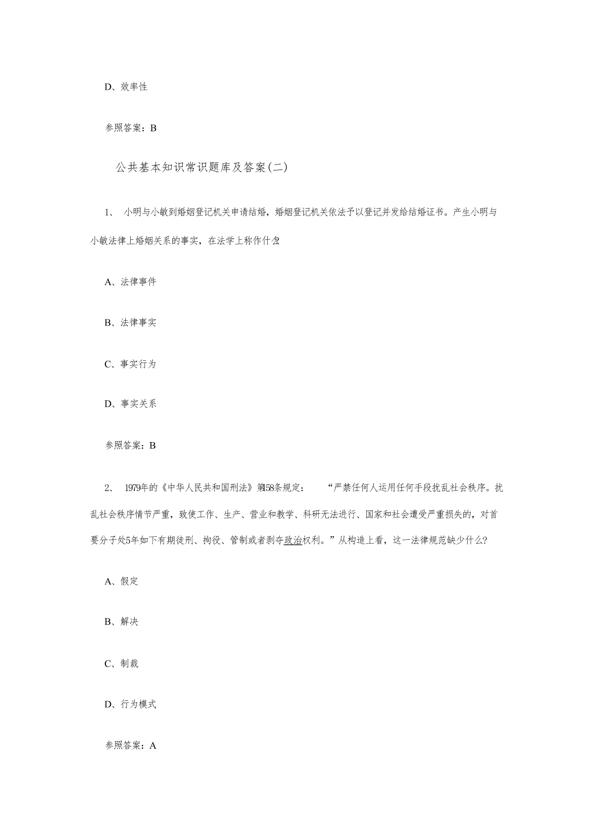 公共基本知识常识题库及答案(一)1、下列所述的法律原则中,属于政策性原则的是:A、《民法通则》规定,民事活动应当遵循自愿、公平、等价有偿的原则B、《婚姻法》规定,国内鼓励晚婚晚育和实行筹划生育C、《合同法》规定,当事人行使权利、履行义务应当遵循诚实信用原则D、《刑事诉讼法》规定,未经人民法院依法判决,对任何人都不得拟定有罪参照答案:B2、张某系精神病患者,在村上不务正业,常常打骂周边群众,使四周不得安宁。某日,张某的妈妈及两个哥哥张二、张三用扁担、木棒将张某打死。此后,三人被捕关押。检察院觉得,三个被告人非法剥夺她人生命,应当以故意杀人罪依法追究其刑事责任。村民觉得,张某的妈妈和两个哥哥杀死她是为民除害,也是替人们雪恨。法院最后对此三个被告予以减轻惩罚,法院在审理此案的时候合用的解决法的价值冲突的是哪一原则?A、价值位阶原则B、个案平衡原则C、比例原则D、并未合用任何原则参照答案:B3、公法与私法的划分重要出目前:A、民法法系B、一般法法系C、社会主义法系D、伊斯兰法系参照答案:A4、法律规范生效的时间,如无明文规定,依惯例应是:A、法律通过之日B、法律发布之日C、法律批准之日D、法律实行之日参照答案:B5、法律是由国家制定或承认的并由国家强制力保证明施的正式的官方拟定的行为规范。这表白法具有:A、规范性B、国家性C、概括性D、效率性参照答案:B公共基本知识常识题库及答案(二)1、小明与小敏到婚姻登记机关申请结婚,婚姻登记机关依法予以登记并发给结婚证书。产生小明与小敏法律上婚姻关系的事实,在法学上称作什么?A、法律事件B、法律事实C、事实行为D、事实关系参照答案:B2、1979年的《中华人民共和国刑法》第158条规定:“严禁任何人运用任何手段扰乱社会秩序。扰乱社会秩序情节严重,致使工作、生产、营业和教学、科研无法进行、国家和社会遭受严重损失的,对首要分子处5年如下有期徒刑、拘役、管制或者剥夺政治权利。”从构造上看,这一法律规范缺少什么?A、假定B、解决C、制裁D、行为模式参照答案:A3、《中华人民共和国和全国人民代表大会和地方各级人民代表大会选举法》第53条规定:“省、自治区、直辖市的人民代表大会及其常务委员会根据本法可以制定实行细则,报全国人民代表大会常务委员会备案。”这一规范属于。A、委任性规范B、授权性规范C、非拟定性规范D、准用性规范参照答案:A4、司机田某贪污货品价值2万元,后又交通肇事,将A国留学生马丁撞死,被人民法院判处有期待刑,对田某的这一制裁体现的是?A、法的政治职能B、法的经济职能C、法在执行社会公共事务方面的职能D、法的对外职能参照答案:A5、法律渊源实质是按照一定的原则对法律进行的分类,根据法律渊源的含义,国内可以把法律分为A、宪法、民法、刑法、诉讼法等B、宪法、法律、行政法、决定等C、宪法、法律、行政法规、地方性法规等D、宪法、法律、行政法规、中央军事委员会的规范性法律文献和政府主管部门文献等参照答案:C公共基本知识常识题库及答案(三)1、陆某在一百货商场购买“幸福”牌电饭煲一台,遗忘在商场门口,被王某拾得。王某拿至家中使用时,因电饭煲漏电发生爆炸,致其面部灼伤。王某向商场索赔,商场以王某不当得利为由不予补偿。对此事件,下列哪一项表述可以成立?A、王某的损害补偿祈求权应以与致损事件有关的法律规定为根据B、不法获得她人之物者应承当该物所致的损害C、由王某对自己无合法根据占有物品的行为承当损害后果,符合公平原则D、按照风险责任原则,陆某作为缺陷商品的购买者应为王某的损害承当责任参照答案:A2、黄某于4月在某市住宅区购得一套住房,7月获得房产证。当年10月黄某将住房租借给廖某。廖某在装修该房时损坏自来水管道,引起漫水,将楼下住户陈某的住房浸泡。陈某规定廖某予以补偿。对此事件,下列哪一种说法是对的的?A、黄某对自己所购买的住房仅有相对权,故其法律义务也是相对的B、廖某不是住房的所有人,故对陈某的损失不负法律责任C、此侵权案件一方面应根据法律原则来加以解决D、此案件的解决应直接合用法的正式渊源参照答案:D3、法律与利益有着内在的联系。下列有关法律与利益关系的表述,哪一项是错误的?A、法对社会的控制和