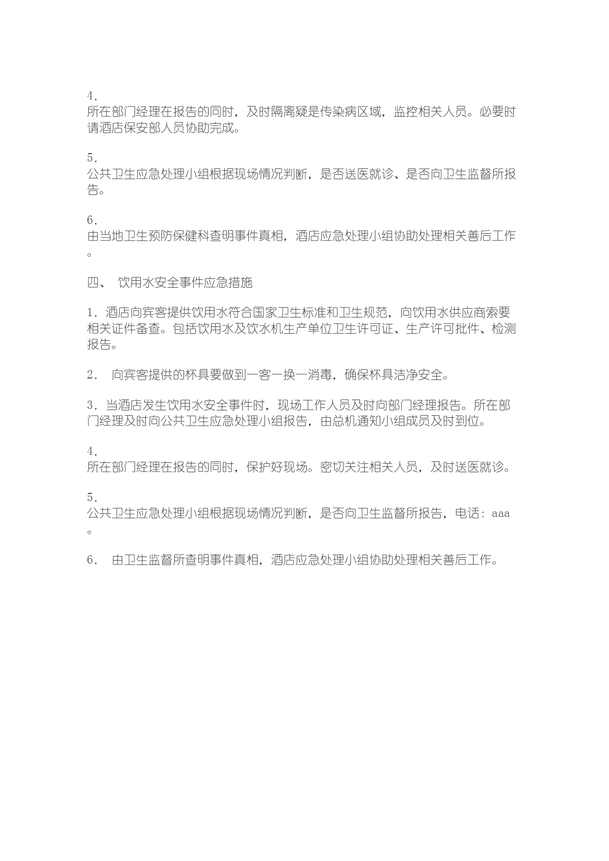 宾馆突发公共卫生事件应急预案为了有效预防、及时控制和消除突发公共卫生事件的危害,保障酒店宾客及员工身体健康与生命安全。特制定酒店公共卫生应急预案。一、成立公共卫生应急处理小组:组长:刘凤骅(总经理)副组长:朱庆华(总办主任)成员:客房部经理、餐饮部经理、保安部经理、人事部经理、财务部经理、工程部经理、值班经理)。发生公共卫生突发事件,在处理小组成员到达之前,由现场值班经理负责处理。二、酒店公共卫生应急小组职责:1.负责设立事件应急处理指挥部,由总经理担任总指挥,负责对突发事件应急处理的统一领导、统一指挥。2.负责公共卫生突发事件信息收集、分析、报告、通报制度。3.负责向卫生监督所报告公共卫生突发事件相关信息,电话:。4.负责公共卫生突发事件预防、现场控制、善后协调处理。三、传染病事件应急措施:1.酒店公共场所要保持卫生洁净,空气流动更新。宾客接触设施设备及时消毒清洁。2.客房客用棉织品及易耗品一客一换,日常用品一客一消毒。3.当酒店公共场所发生疑是传染病事件,现场工作人员及时向部门经理报告。所在部门经理及时向卫生监督所报告。电话aaaaa,由总机通知小组成员及时到位。4.所在部门经理在报告的同时,及时隔离疑是传染病区域,监控相关人员。必要时请酒店保安部人员协助完成。5.公共卫生应急处理小组根据现场情况判断,是否送医就诊、是否向卫生监督所报告。6.由当地卫生预防保健科查明事件真相,酒店应急处理小组协助处理相关善后工作。四、饮用水安全事件应急措施1.酒店向宾客提供饮用水符合国家卫生标准和卫生规范,向饮用水供应商索要相关证件备查。包括饮用水及饮水机生产单位卫生许可证、生产许可批件、检测报告。2.向宾客提供的杯具要做到一客一换一消毒,确保杯具洁净安全。3.当酒店发生饮用水安全事件时,现场工作人员及时向部门经理报告。所在部门经理及时向公共卫生应急处理小组报告,由总机通知小组成员及时到位。4.所在部门经理在报告的同时,保护好现场。密切关注相关人员,及时送医就诊。5.公共卫生应急处理小组根据现场情况判断,是否向卫生监督所报告,电话:aaa。6.由卫生监督所查明事件真相,酒店应急处理小组协助处理相关善后工作。