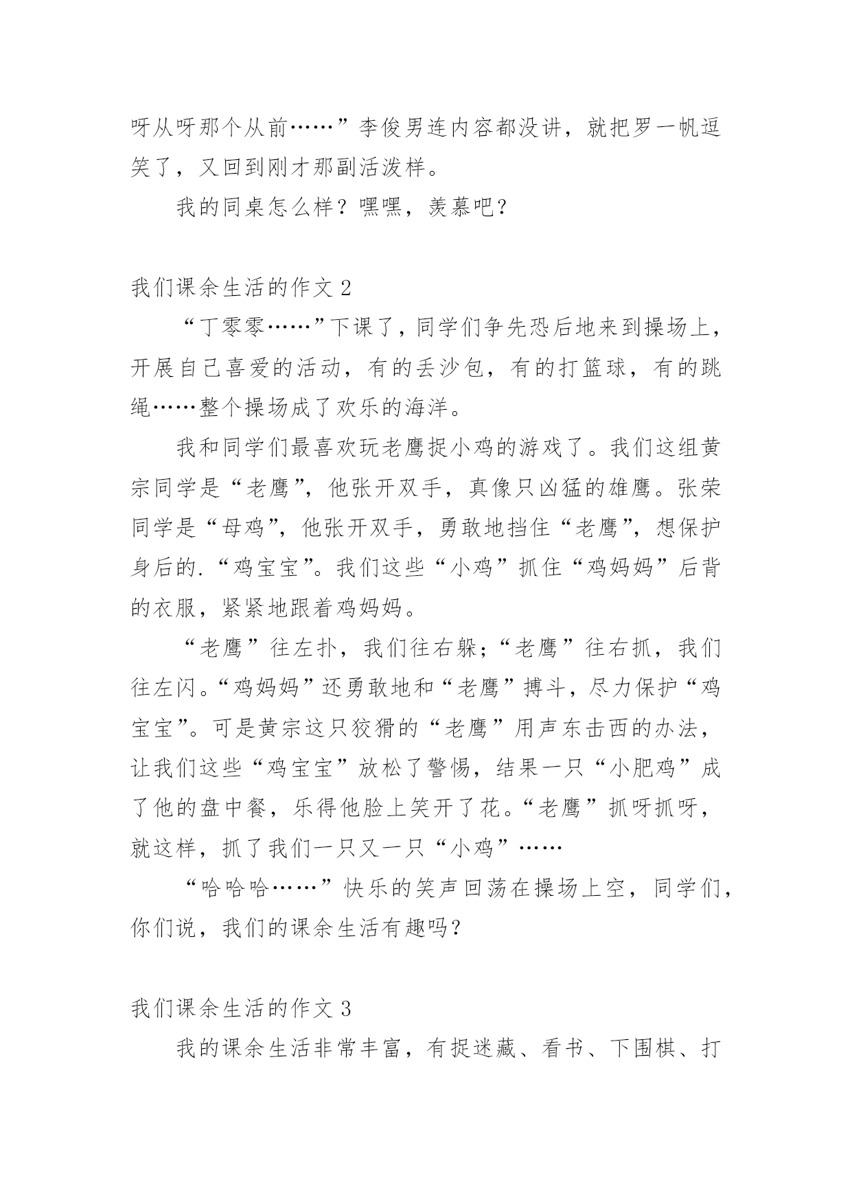 我们课余生活的作文我们课余生活的作文汇编6篇在日常学习、工作抑或是生活中,大家都有写作文的经历,对作文很是熟悉吧,作文是由文字组成,经过人的思想考虑,通过语言组织来表达一个主题意义的文体。那么问题来了,到底应如何写一篇优秀的作文呢?下面是小编精心整理的我们课余生活的作文,欢迎大家借鉴与参考,希望对大家有所帮助。我们课余生活的作文1在我们班,有一位数学特别好的同学,嘿嘿,他就是我的“死对头”同桌——罗一帆。罗一帆长着一个“国”字形的脑袋,一对炯炯有神的眼睛总在课堂上露出智慧之光。短短的头发给人一种十分帅气的感觉。别看他表面帅气,一张嘴巴,一颗颗和我一样参差不齐的牙齿就露了出来。一笑,两个浅浅的'酒窝便挤了出来。我同桌可是一个“阴转晴”的高手。如果有一个同学惹了他,罗一帆就会像一头愤怒的小狮子,冲向那位同学,吓着那位同学连连道歉。班上的同学都知道,惹了罗一帆,他会生好大一会儿气。果然同桌愤怒地坐在位置上,嘟着嘴巴,不停地对惹他生气的同学翻白眼。我把我们班“著名”的笑星——李俊男请了过来,叫他给罗一帆消消气。“从前,从呀从呀那个从前……”李俊男连内容都没讲,就把罗一帆逗笑了,又回到刚才那副活泼样。我的同桌怎么样?嘿嘿,羡慕吧?我们课余生活的作文2“丁零零……”下课了,同学们争先恐后地来到操场上,开展自己喜爱的活动,有的丢沙包,有的打篮球,有的跳绳……整个操场成了欢乐的海洋。我和同学们最喜欢玩老鹰捉小鸡的游戏了。我们这组黄宗同学是“老鹰”,他张开双手,真像只凶猛的雄鹰。张荣同学是“母鸡”,他张开双手,勇敢地挡住“老鹰”,想保护身后的.“鸡宝宝”。我们这些“小鸡”抓住“鸡妈妈”后背的衣服,紧紧地跟着鸡妈妈。“老鹰”往左扑,我们往右躲;“老鹰”往右抓,我们往左闪。“鸡妈妈”还勇敢地和“老鹰”搏斗,尽力保护“鸡宝宝”。可是黄宗这只狡猾的“老鹰”用声东击西的办法,让我们这些“鸡宝宝”放松了警惕,结果一只“小肥鸡”成了他的盘中餐,乐得他脸上笑开了花。“老鹰”抓呀抓呀,就这样,抓了我们一只又一只“小鸡”……“哈哈哈……”快乐的笑声回荡在操场上空,同学们,你们说,我们的课余生活有趣吗?我们课余生活的作文3我的课余生活非常丰富,有捉迷藏、看书、下围棋、打架子鼓和捕鱼,其中我最喜欢的课余生活还是下围棋。我非常喜欢围棋,可是有人说围棋这么难,你还是放弃吧。可是我没有放弃我一定要一直学下去。第一天我上围棋课的时候我有一点紧张,我心想:“围棋是不是真的跟他说的一样?”一节课下了我的妈妈问我说:“真有意思。”妈妈问我什么想法,我问:“我能一直学下去吗?”妈妈说:“能,只有你能坚持下去就能一直学下去”。我现在已经学了2年了,可我还是没下过我爸爸,因为我爸爸4段了,而且他还是自学的已经20年了。我还参加过比赛呢!可是成绩不是很好,希望这次比赛我能拿第一名。我以后一定学好围棋,下过我的'爸爸。争取以后下出9段水平。我们课余生活的作文4丁零零,丁零零,下课了,我是第一个冲出教室的,往操场上跑,跑到操场上,我在操场上玩比赛跳绳,我一分钟跳了102下,另一个人跳了130下,还有一个人跳了97下,我们三个人一比,你第一多,我第二多,他第三多。我想,我跳了第二名,也不错,但是,我还要努力,加油。后来,我又去比赛跑了,我们开始了,跑着跑着我们已经都很累了,我们跑了一圈后,我跑了第一名,他跑了第三名,你跑了第名,我高兴极了。我们以后玩耍的`时候都是我们三个人玩,我说,咱们交朋友吧。我们说,行。我们课余生活的作文5我的课余生活丰富多彩,做游戏是我最喜欢的,我经常和小伙伴们一起玩“小猫钓鱼”的游戏。这个游戏有三个或三个以上的人就可以玩。规则是这样的:先石头剪子布,输了的`人就当“小猫”,赢了了人就当“鱼儿”,“小猫”背过身去,“鱼儿”们摸了“小猫”就赶快跑,“小猫”就赶快说“停”,然后向离自己最近的“鱼儿”跨近一步,再喊“小猫”,“鱼儿”们喊“钓鱼”,“小猫”就可以“钓”自己能摸得到的“鱼儿”了,谁被摸到谁就要当“小猫”了。我可喜欢玩这个游戏了,每次我当“小猫”的时候,都特别希望能摸到“鱼儿”,总是竭尽全力去摸“鱼儿”;每次我当“鱼儿”的时候又特别紧张,生怕被“小猫”摸到了。这个游戏给我的课余生活带来了无穷的快乐!我们课余生活的作文6“丁零零……”同学们随着清脆的下课铃声来到了操场,我也信步走出教室,倚着走廊的栏杆,俯身往楼下的操场望去。这个操场不太大,人却不少,有的打羽毛球,有的玩单杠,有的.跳绳,有的在追逐嬉戏……大家玩得还挺起劲。十来人围成一个圆圈,拍着手,唱着歌:“丢手绢,丢手绢,轻轻的放在小朋友的后面……”她们虽然嘴里唱着歌,眼睛却偷偷的往后瞟,生怕手绢丢在背后自己又没有及时发现。一个扎蝴蝶结的小姑娘背着手,手里拿着一条花手绢,正绕着圆圈悄悄走着。走哇走哇,就把手绢轻轻