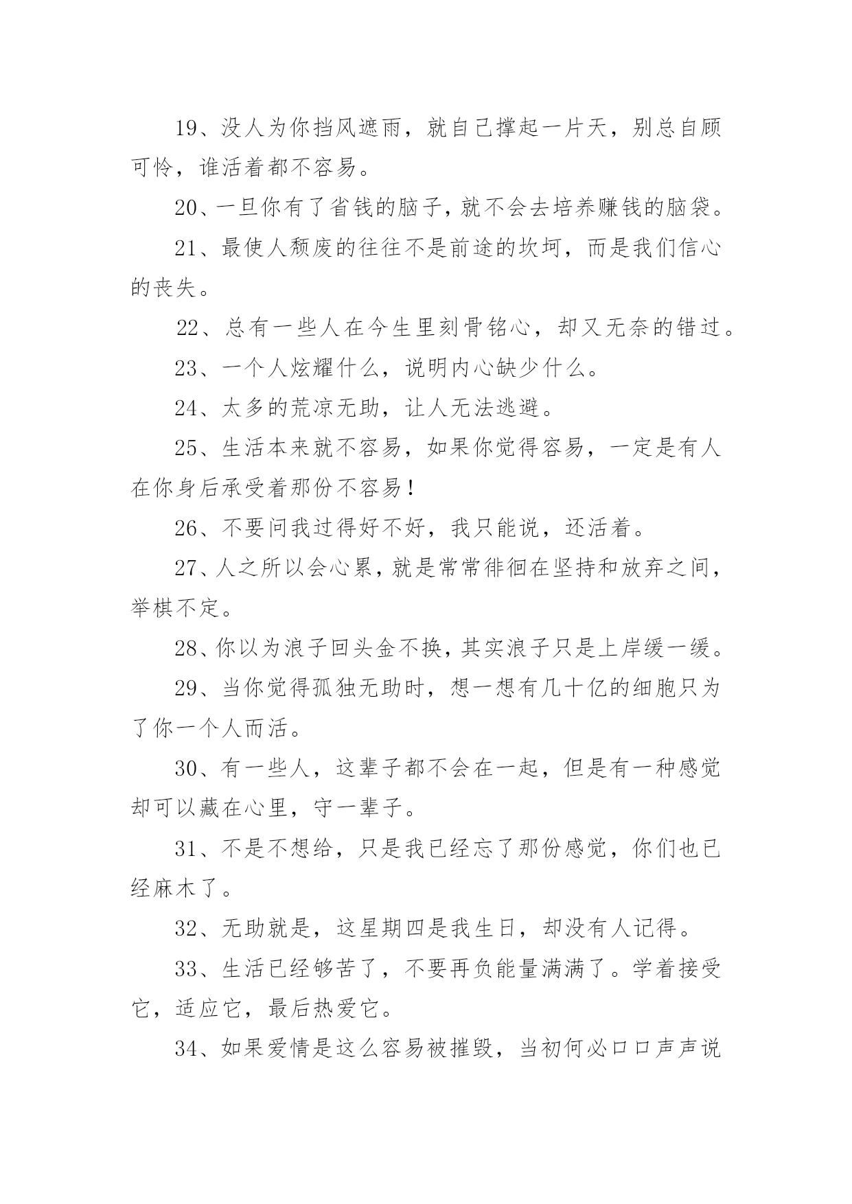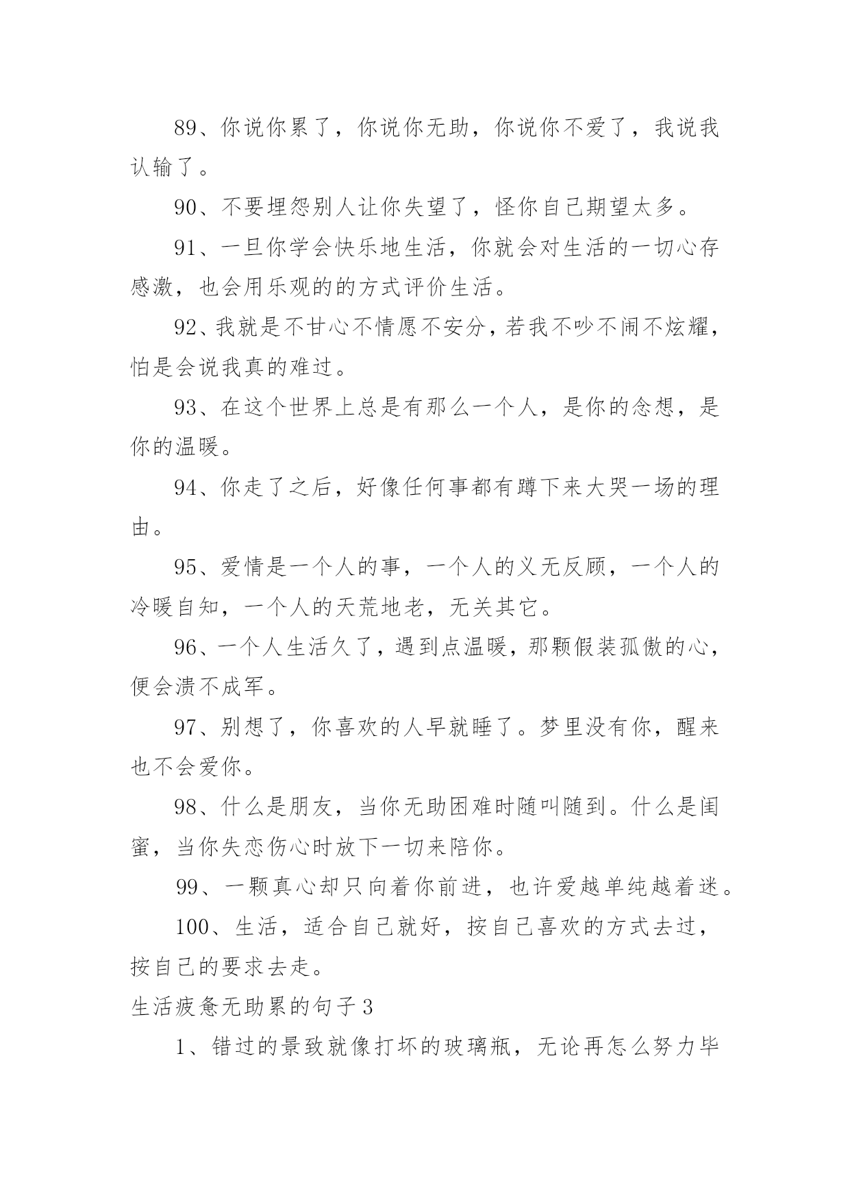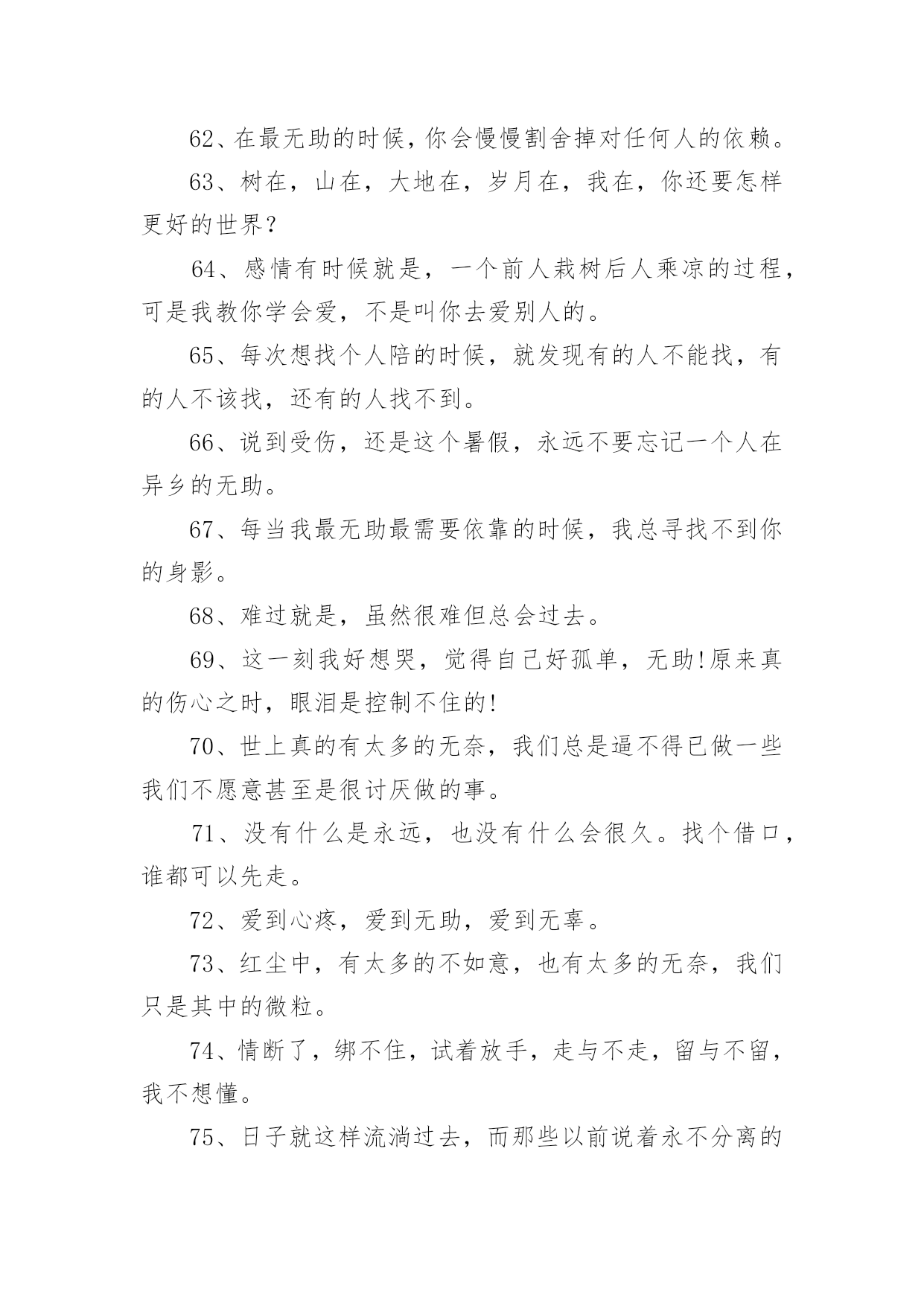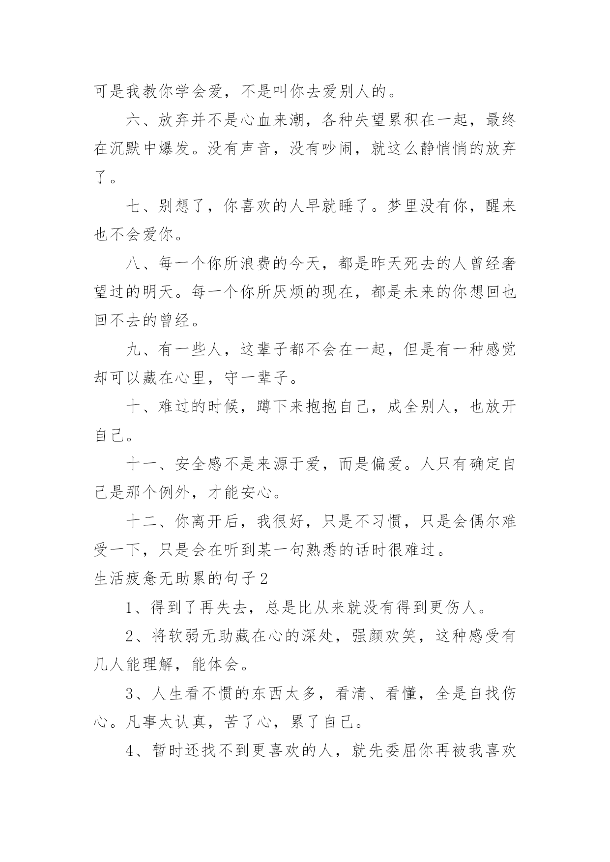 生活疲惫无助累的句子生活疲惫无助累的句子8篇在日常学习、工作抑或是生活中,大家或多或少都接触过一些经典的句子吧,从表达的角度说,句子是最基本的表述单位。你知道什么样的句子才能称之为经典吗?以下是小编帮大家整理的生活疲惫无助累的句子,仅供参考,欢迎大家阅读。生活疲惫无助累的句子1一、当你认为被抛弃的时候,受损失的其实是对方;因为他失去了一个深爱他的人,而你只不过少了一个不爱你的人。二、用得着你的时候,好话说尽;用不着你的时候,立马转身;喜欢你的时候,你就是最亮的星;厌恶你的时候,你就是最差的景。这就是,你不得不接受的社会!三、你老实忠厚了,欺负你的人就多了;你单纯善良了,利用你的人就多了;你有权有势了,追随你的人就多了;你穷困潦倒了,抛弃你的人就多了。四、有没有人像我一样,每到夜晚总会想到一些人,想起一些事,然后不由自主地流泪。白天又继续做回那个嘻嘻哈哈爱笑的孩子,只是笑得有些落寞。五、感情有时候就是,一个前人栽树后人乘凉的过程,可是我教你学会爱,不是叫你去爱别人的。六、放弃并不是心血来潮,各种失望累积在一起,最终在沉默中爆发。没有声音,没有吵闹,就这么静悄悄的放弃了。七、别想了,你喜欢的人早就睡了。梦里没有你,醒来也不会爱你。八、每一个你所浪费的今天,都是昨天死去的人曾经奢望过的明天。每一个你所厌烦的现在,都是未来的你想回也回不去的曾经。九、有一些人,这辈子都不会在一起,但是有一种感觉却可以藏在心里,守一辈子。十、难过的时候,蹲下来抱抱自己,成全别人,也放开自己。十一、安全感不是来源于爱,而是偏爱。人只有确定自己是那个例外,才能安心。十二、你离开后,我很好,只是不习惯,只是会偶尔难受一下,只是会在听到某一句熟悉的话时很难过。生活疲惫无助累的句子21、得到了再失去,总是比从来就没有得到更伤人。2、将软弱无助藏在心的深处,强颜欢笑,这种感受有几人能理解,能体会。3、人生看不惯的东西太多,看清、看懂,全是自找伤心。凡事太认真,苦了心,累了自己。4、暂时还找不到更喜欢的人,就先委屈你再被我喜欢会儿吧。5、你离开后,我很好,只是不习惯,只是会偶尔难受一下,只是会在听到某一句熟悉的话时很难过。6、你还是放弃了,这个拿青春和你赌的姑娘。7、谁能知道、体会到我那些躲在角落里的无助与可怜。8、感觉突然失去了方向,瞬间陷入了迷茫,看着竞争对手们在努力我却感觉有点无助和莫名的难过!9、笑确实是生活的解药,生活已经够苦了,为何不再来点甜。10、原谅是容易的,再次信任,就没那么容易了。11、第一次哭是因为你不在,第一次笑是因为遇到你,第一次笑着流泪是因为不能拥有你!12、如果上帝要毁灭一个人必先令其疯狂可我疯狂了这么久为何上帝还不把我毁掉。13、在你最无助的时候你会看透很多人14、匆匆的走过人群,只怕别人见了自己的无助和悲伤。15、既不回头,何必不忘。既然无缘,何需誓言。昨日种种,似水无痕。明夕何夕,君已陌路。16、生活就是这样的简单,吃饭睡觉做喜欢的事;生活就是这样的艰辛,奔波算计做无奈的事。17、黎明前的黑暗,我们总会期待点什么,总得期待点什么。18、记忆想是倒在掌心的水,不论你摊开还是紧握,终究还是会从指缝中一滴一滴流淌干净。19、没人为你挡风遮雨,就自己撑起一片天,别总自顾可怜,谁活着都不容易。20、一旦你有了省钱的脑子,就不会去培养赚钱的脑袋。21、最使人颓废的往往不是前途的坎坷,而是我们信心的丧失。22、总有一些人在今生里刻骨铭心,却又无奈的错过。23、一个人炫耀什么,说明内心缺少什么。24、太多的荒凉无助,让人无法逃避。25、生活本来就不容易,如果你觉得容易,一定是有人在你身后承受着那份不容易!26、不要问我过得好不好,我只能说,还活着。27、人之所以会心累,就是常常徘徊在坚持和放弃之间,举棋不定。28、你以为浪子回头金不换,其实浪子只是上岸缓一缓。29、当你觉得孤独无助时,想一想有几十亿的细胞只为了你一个人而活。30、有一些人,这辈子都不会在一起,但是有一种感觉却可以藏在心里,守一辈子。31、不是不想给,只是我已经忘了那份感觉,你们也已经麻木了。32、无助就是,这星期四是我生日,却没有人记得。33、生活已经够苦了,不要再负能量满满了。学着接受它,适应它,最后热爱它。34、如果爱情是这么容易被摧毁,当初何必口口声声说爱35、爱,从来就是一件千回百转的事。不曾被离弃,不曾受伤害,怎懂得爱人?36、如果有一天,我彻底的在你的世界里消失,你会不会想起有我37、一个人撑得真的很累很累,不知道可以找谁倾诉那份无助!38、有些话,说与不说,都是伤害。有些人,留与不留,都会离开。39、好朋友就是在你无助地在雨中奔跑时给你把伞啊。40、无论何时至少你都还有我,我会在你无聊无助的时候陪你说笑话,帮你擦眼泪。41、活在别人的掌声中,最易迷失自己;处在别人