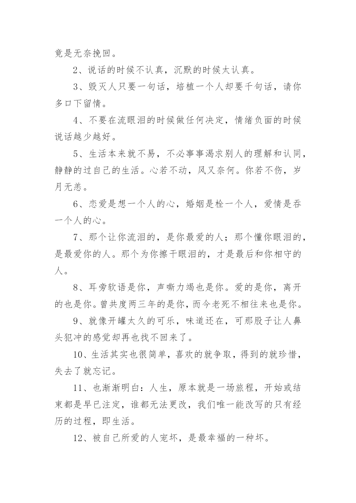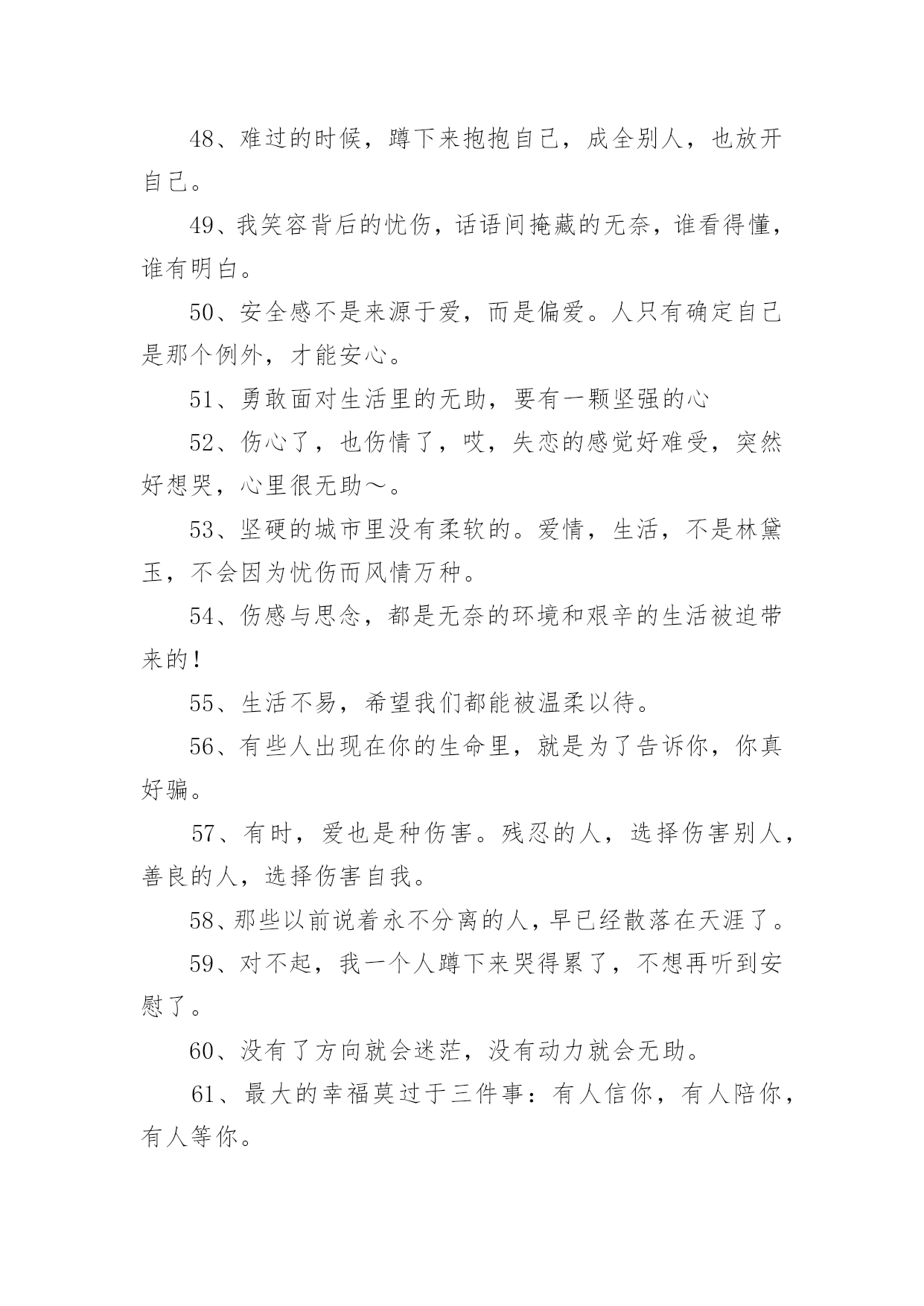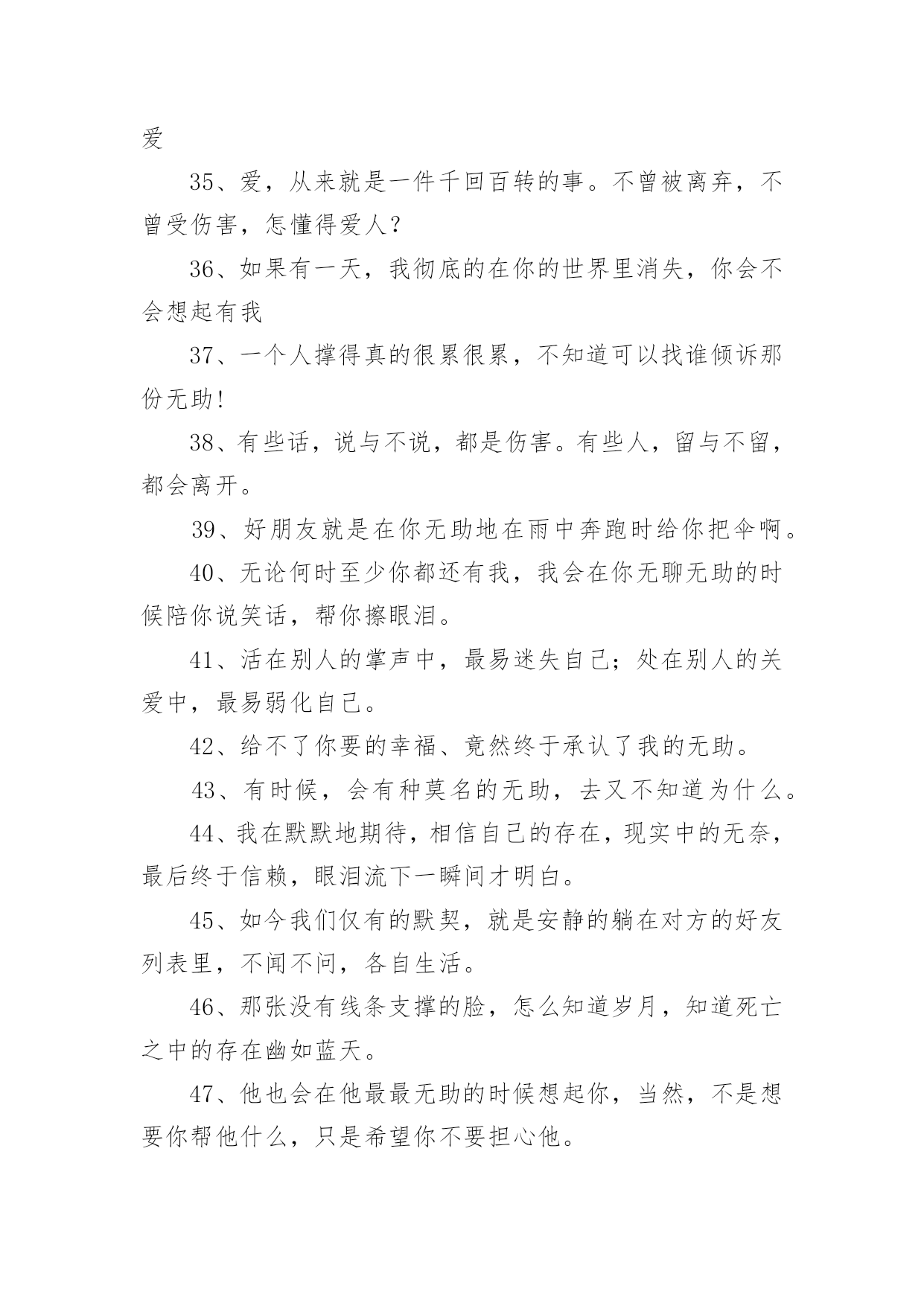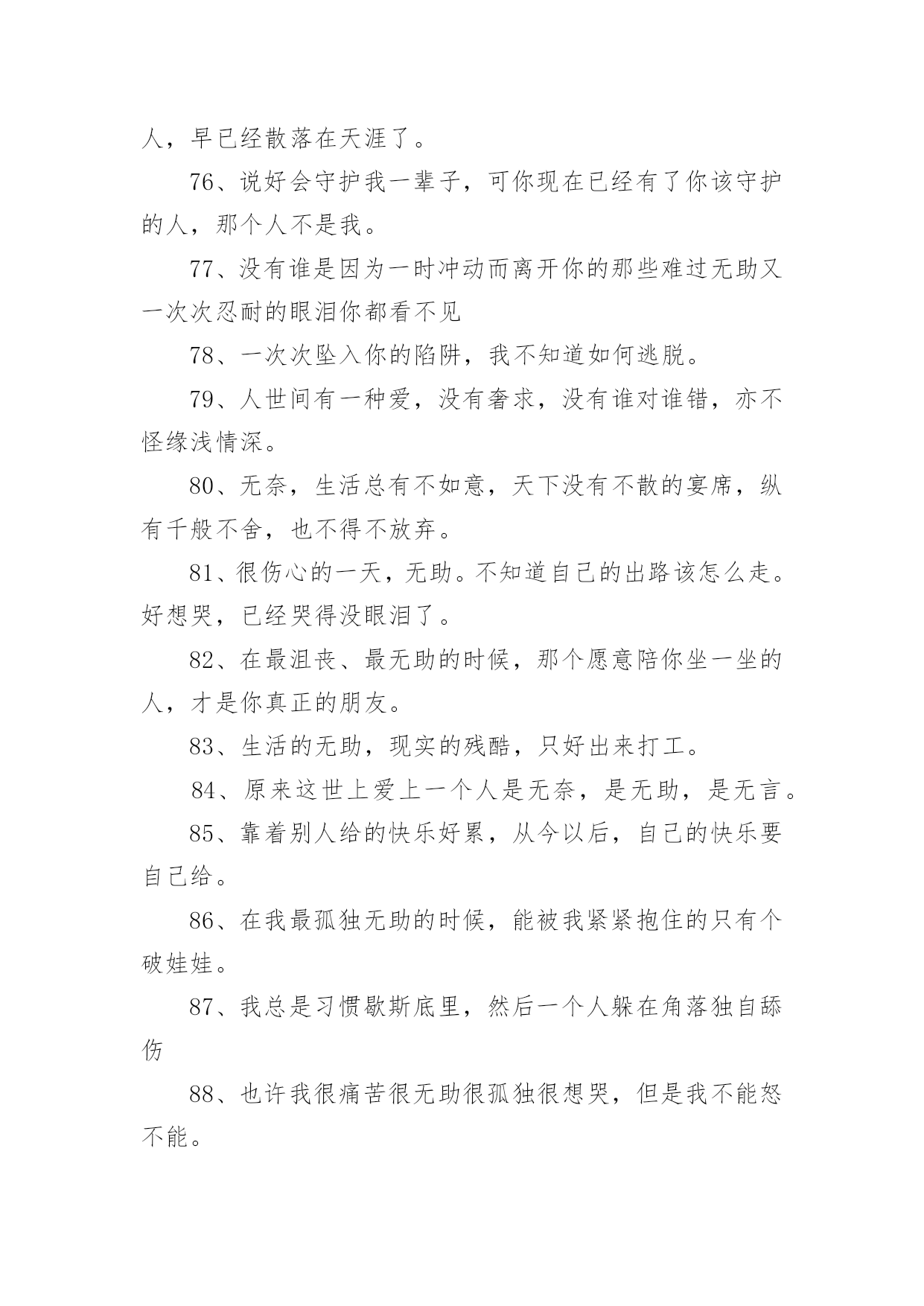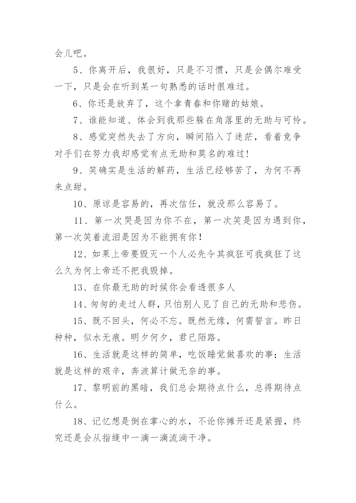 生活疲惫无助累的句子生活疲惫无助累的句子8篇在日常学习、工作抑或是生活中,大家或多或少都接触过一些经典的句子吧,从表达的角度说,句子是最基本的表述单位。你知道什么样的句子才能称之为经典吗?以下是小编帮大家整理的生活疲惫无助累的句子,仅供参考,欢迎大家阅读。生活疲惫无助累的句子1一、当你认为被抛弃的时候,受损失的其实是对方;因为他失去了一个深爱他的人,而你只不过少了一个不爱你的人。二、用得着你的时候,好话说尽;用不着你的时候,立马转身;喜欢你的时候,你就是最亮的星;厌恶你的时候,你就是最差的景。这就是,你不得不接受的社会!三、你老实忠厚了,欺负你的人就多了;你单纯善良了,利用你的人就多了;你有权有势了,追随你的人就多了;你穷困潦倒了,抛弃你的人就多了。四、有没有人像我一样,每到夜晚总会想到一些人,想起一些事,然后不由自主地流泪。白天又继续做回那个嘻嘻哈哈爱笑的孩子,只是笑得有些落寞。五、感情有时候就是,一个前人栽树后人乘凉的过程,可是我教你学会爱,不是叫你去爱别人的。六、放弃并不是心血来潮,各种失望累积在一起,最终在沉默中爆发。没有声音,没有吵闹,就这么静悄悄的放弃了。七、别想了,你喜欢的人早就睡了。梦里没有你,醒来也不会爱你。八、每一个你所浪费的今天,都是昨天死去的人曾经奢望过的明天。每一个你所厌烦的现在,都是未来的你想回也回不去的曾经。九、有一些人,这辈子都不会在一起,但是有一种感觉却可以藏在心里,守一辈子。十、难过的时候,蹲下来抱抱自己,成全别人,也放开自己。十一、安全感不是来源于爱,而是偏爱。人只有确定自己是那个例外,才能安心。十二、你离开后,我很好,只是不习惯,只是会偶尔难受一下,只是会在听到某一句熟悉的话时很难过。生活疲惫无助累的句子21、得到了再失去,总是比从来就没有得到更伤人。2、将软弱无助藏在心的深处,强颜欢笑,这种感受有几人能理解,能体会。3、人生看不惯的东西太多,看清、看懂,全是自找伤心。凡事太认真,苦了心,累了自己。4、暂时还找不到更喜欢的人,就先委屈你再被我喜欢会儿吧。5、你离开后,我很好,只是不习惯,只是会偶尔难受一下,只是会在听到某一句熟悉的话时很难过。6、你还是放弃了,这个拿青春和你赌的姑娘。7、谁能知道、体会到我那些躲在角落里的无助与可怜。8、感觉突然失去了方向,瞬间陷入了迷茫,看着竞争对手们在努力我却感觉有点无助和莫名的难过!9、笑确实是生活的解药,生活已经够苦了,为何不再来点甜。10、原谅是容易的,再次信任,就没那么容易了。11、第一次哭是因为你不在,第一次笑是因为遇到你,第一次笑着流泪是因为不能拥有你!12、如果上帝要毁灭一个人必先令其疯狂可我疯狂了这么久为何上帝还不把我毁掉。13、在你最无助的时候你会看透很多人14、匆匆的走过人群,只怕别人见了自己的无助和悲伤。15、既不回头,何必不忘。既然无缘,何需誓言。昨日种种,似水无痕。明夕何夕,君已陌路。16、生活就是这样的简单,吃饭睡觉做喜欢的事;生活就是这样的艰辛,奔波算计做无奈的事。17、黎明前的黑暗,我们总会期待点什么,总得期待点什么。18、记忆想是倒在掌心的水,不论你摊开还是紧握,终究还是会从指缝中一滴一滴流淌干净。19、没人为你挡风遮雨,就自己撑起一片天,别总自顾可怜,谁活着都不容易。20、一旦你有了省钱的脑子,就不会去培养赚钱的脑袋。21、最使人颓废的往往不是前途的坎坷,而是我们信心的丧失。22、总有一些人在今生里刻骨铭心,却又无奈的错过。23、一个人炫耀什么,说明内心缺少什么。24、太多的荒凉无助,让人无法逃避。25、生活本来就不容易,如果你觉得容易,一定是有人在你身后承受着那份不容易!26、不要问我过得好不好,我只能说,还活着。27、人之所以会心累,就是常常徘徊在坚持和放弃之间,举棋不定。28、你以为浪子回头金不换,其实浪子只是上岸缓一缓。29、当你觉得孤独无助时,想一想有几十亿的细胞只为了你一个人而活。30、有一些人,这辈子都不会在一起,但是有一种感觉却可以藏在心里,守一辈子。31、不是不想给,只是我已经忘了那份感觉,你们也已经麻木了。32、无助就是,这星期四是我生日,却没有人记得。33、生活已经够苦了,不要再负能量满满了。学着接受它,适应它,最后热爱它。34、如果爱情是这么容易被摧毁,当初何必口口声声说爱35、爱,从来就是一件千回百转的事。不曾被离弃,不曾受伤害,怎懂得爱人?36、如果有一天,我彻底的在你的世界里消失,你会不会想起有我37、一个人撑得真的很累很累,不知道可以找谁倾诉那份无助!38、有些话,说与不说,都是伤害。有些人,留与不留,都会离开。39、好朋友就是在你无助地在雨中奔跑时给你把伞啊。40、无论何时至少你都还有我,我会在你无聊无助的时候陪你说笑话,帮你擦眼泪。41、活在别人的掌声中,最易迷失自己;处在别人
