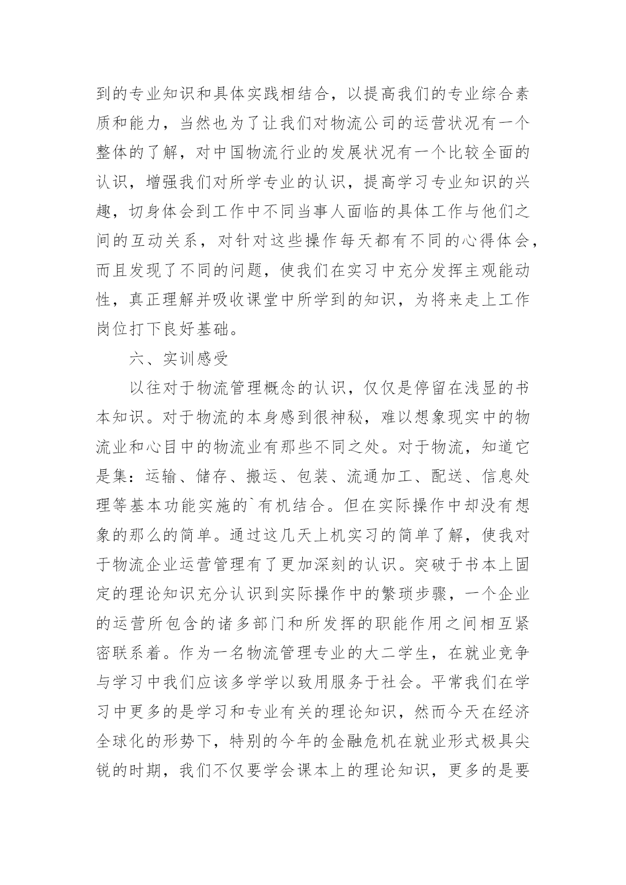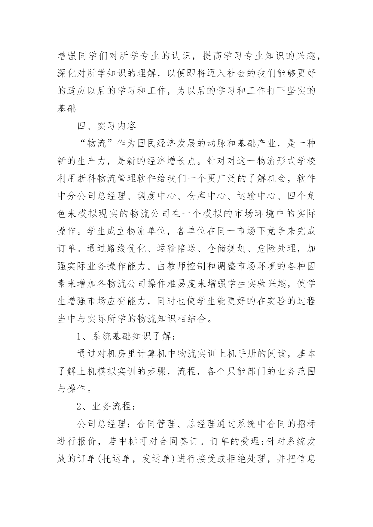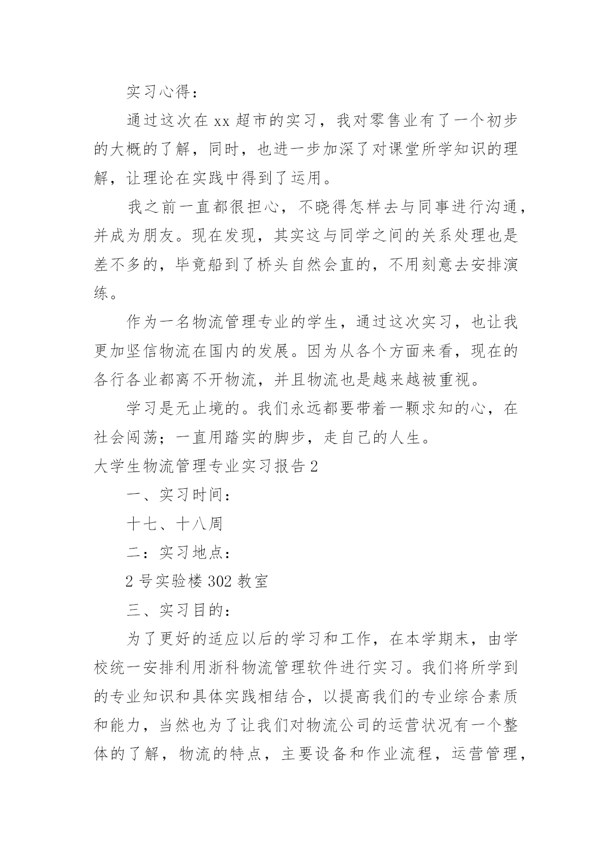 大学生物流管理专业实习报告大学生物流管理专业实习报告我们眼下的社会,报告与我们的生活紧密相连,不同的报告内容同样也是不同的。你所见过的报告是什么样的呢?下面是小编精心整理的大学生物流管理专业实习报告,希望对大家有所帮助。大学生物流管理专业实习报告1实习时间:xx年1月21日至xx年3月31日实习地点:xxxxxxxx超市实习目的:1、锻炼自己的工作能力,丰富自己的工作经历;2、检验自己适应社会的能力和自我管理能力;3、坚定自己的职业素养和态度。公司简介:xxxx超市9月27日盛装开业,位于县开发区办公楼旁。环境一流,典雅装修。超市产品多样,种类齐全;上千种家庭生活用品应有尽有。物美价廉,质量第一,讲究诚信,xx超市给你家一般的感觉!xxxx超市是xxxx超市连锁店中的一家。xxxx超市是一家大型连锁超市机构,企业自xx年创办以来,先后开办了xx市xxxx商行、xx市xx贸易商行、xx市xx贸易商行、xxxx超市、xxxx超市等8家连锁超市,先后被xx市相关部门评为“优化经济发展环境测评点”、“食品安全示范店”、“质量诚信单位”等荣誉称号。企业永远秉承“赛马不相马”、“你有多大能,就给你多大舞台”的用人机制,为员工提供施展的平台。实习内容:1、卖场部分卖场是整个超市的核心,其经营模式与文化理念在这里体现无遗。1.1卖场巡察超市卖场面积有近一千平方米,商品种类繁多,营业员数量不够,因此,防损员的防损工作尤显重要。尤其是在早购和晚上的销售黄金时间段,卖场顾客众多,商品的安全以及部分货架上商品排面的整洁就需要我们防损员尽职尽责的工作。敏锐的观察、踏实的作风、灵活的应变这些都是必不可少的。我在超市卖场主要是负责调味品、方便面、膨化食品、百货等区域的货物安全与整理,这对我来说也是一个小挑战。调味品,尽是些瓶瓶罐罐,需要轻拿轻放;方便面和膨化食品,是销售速度极快的,需及时上货;百货,种类、货品繁多,不易打理。这些问题是我在经过一段时间的工作后总结发现的.,不过,只要脚踏实地的用心去做,是用不了多少功夫的。1.2打堆头堆头是指超市中商品单独陈列所形成的商品陈列,有时是一个品牌产品单独陈列,有时会是几个品牌的组合堆头。一般都需要放在打底物上,或箱式产品直接堆码在地上。打堆头需要注意两个方面的细节,一是堆头的高度,一是堆头的打底物。以我的身高为标准的话,堆头的高度以在我大腿根部为宜(大概在1.2-1.3米),方便顾客选购。堆头打底物的选择非常重要,它决定了打出来的堆关是否美观、是否整齐,不管是什么打底物,最主要都是要够结实、够牢靠。在超市,堆头的位置、堆头摆放的货物都是要随时更换的,以保证提供给顾客最新的信息,并给顾客焕然一新的感觉。1.3营业和收银因为超市的营业员较少的缘故,加之又正值春节时间段;所以,在卖场人满为患的时候,我们防损员除了做好本职工作之外还要兼做营业员。也就是为顾客提供面对面的服务:推荐商品,讲解商品,推销商品。我发现,在推销讲解商品的时候除了口才、态度要好外,好需要对商品有一个大概的了解,这又为仓库的工作积累了知识。说到收银,也还蛮巧的,这主要是因为我的好奇和好学吧。收银其实是一份挺无聊又是挺压抑的工作。每天做着同样的事,但又必须要随时都保持着一份紧张(这可是与钱打交道啊,能大意吗?)。我对收银这事纯粹是觉得好玩,在收银员忙不过来的时候,或者是有收银员休假的时候才会让我去帮忙。这工作考验细心,但这东西我恰好又有。2、仓库部分仓库是在计划好的空间环境里供贮存物品之用的建筑。对于一个超市来说,仓库相当于是灵魂。有了仓库,超市才可以正常运转;有了仓库,超市的供需体系才会平衡。2.1理货/仓管理货,说得难听一点就是搬货。但是,这又是一门艺术。怎么样让一个仓库的空间得到最大化的利用,这就需要货物的合理有规划的摆放。在我们那个超市没有专门的仓管,仓库的商品整理与安排就得靠我们这些个防损员了。为了提高寻找商品的效率,我们需要把关联商品放在相邻位置上,这就需要对商品有一定的了解,之前的营业员工作就帮到大忙了。2.2收/退货随着工作能力的提升,经验的积累,主管会开始也让我去收个货。收货的时候最主要的还是考验细心,货物的数量、条码、价格等重要信息的核对决不容半点含糊。退货主要退的是那些有质量问题,或者是接近保质期的商品。把每个供应商的商品归类放到一起,在同一供应商中,相同种类或者同种价格的商品计算好数量和价格,等到有一定数量的库存再一次性退货。填写退货单时,条码一定要抄写做到100%的正确率。实习心得:通过这次在xx超市的实习,我对零售业有了一个初步的大概的了解,同时,也进一步加深了对课堂所学知识的理解,让理论在实践中得到了运用。我之前一直都很担心,不晓得怎样去与同事进行沟通,并成为朋友。现在发现,其实这与同学之间的关系处理也是差不多的,毕竟