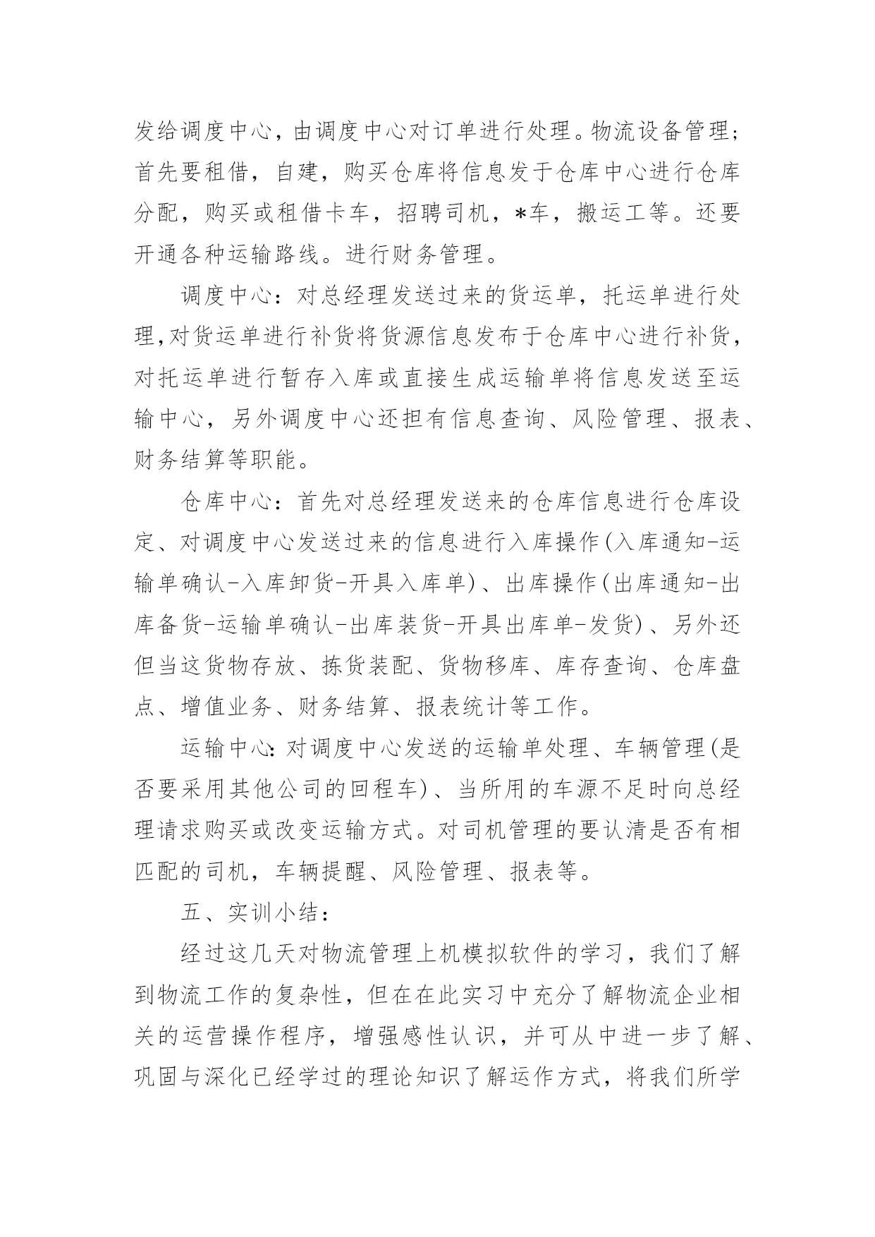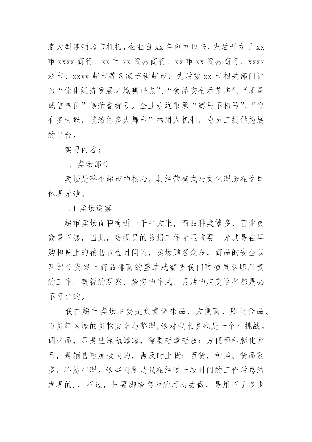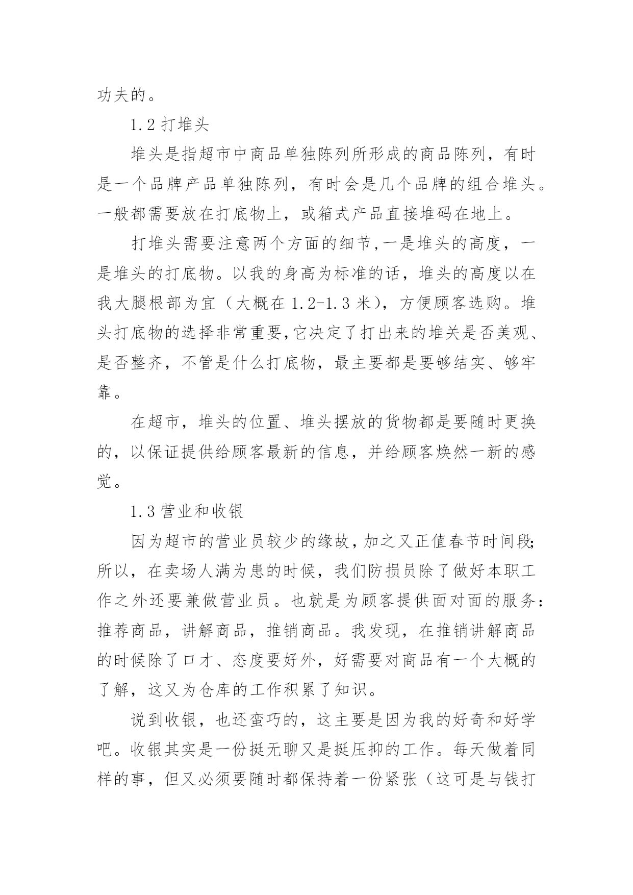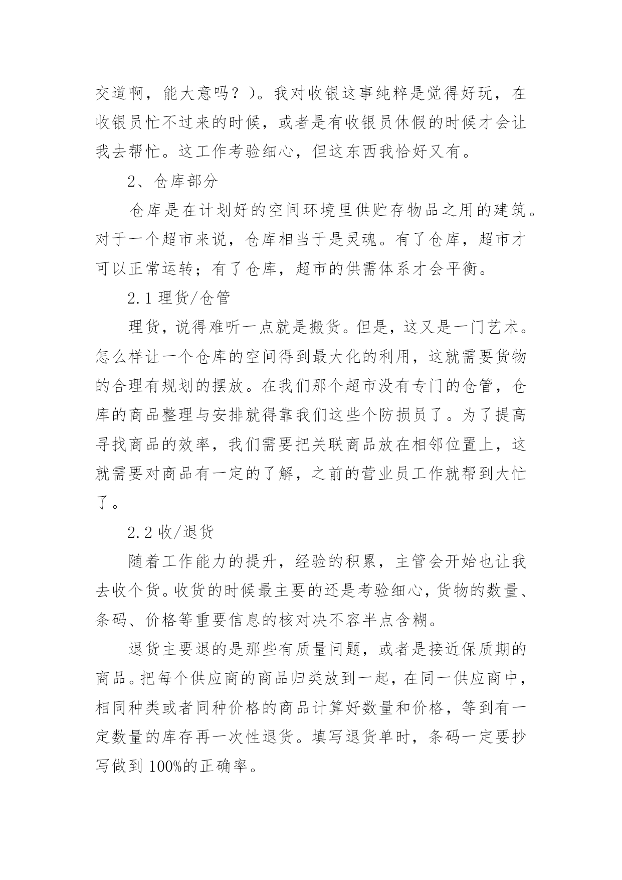大学生物流管理专业实习报告大学生物流管理专业实习报告我们眼下的社会,报告与我们的生活紧密相连,不同的报告内容同样也是不同的。你所见过的报告是什么样的呢?下面是小编精心整理的大学生物流管理专业实习报告,希望对大家有所帮助。大学生物流管理专业实习报告1实习时间:xx年1月21日至xx年3月31日实习地点:xxxxxxxx超市实习目的:1、锻炼自己的工作能力,丰富自己的工作经历;2、检验自己适应社会的能力和自我管理能力;3、坚定自己的职业素养和态度。公司简介:xxxx超市9月27日盛装开业,位于县开发区办公楼旁。环境一流,典雅装修。超市产品多样,种类齐全;上千种家庭生活用品应有尽有。物美价廉,质量第一,讲究诚信,xx超市给你家一般的感觉!xxxx超市是xxxx超市连锁店中的一家。xxxx超市是一家大型连锁超市机构,企业自xx年创办以来,先后开办了xx市xxxx商行、xx市xx贸易商行、xx市xx贸易商行、xxxx超市、xxxx超市等8家连锁超市,先后被xx市相关部门评为“优化经济发展环境测评点”、“食品安全示范店”、“质量诚信单位”等荣誉称号。企业永远秉承“赛马不相马”、“你有多大能,就给你多大舞台”的用人机制,为员工提供施展的平台。实习内容:1、卖场部分卖场是整个超市的核心,其经营模式与文化理念在这里体现无遗。1.1卖场巡察超市卖场面积有近一千平方米,商品种类繁多,营业员数量不够,因此,防损员的防损工作尤显重要。尤其是在早购和晚上的销售黄金时间段,卖场顾客众多,商品的安全以及部分货架上商品排面的整洁就需要我们防损员尽职尽责的工作。敏锐的观察、踏实的作风、灵活的应变这些都是必不可少的。我在超市卖场主要是负责调味品、方便面、膨化食品、百货等区域的货物安全与整理,这对我来说也是一个小挑战。调味品,尽是些瓶瓶罐罐,需要轻拿轻放;方便面和膨化食品,是销售速度极快的,需及时上货;百货,种类、货品繁多,不易打理。这些问题是我在经过一段时间的工作后总结发现的.,不过,只要脚踏实地的用心去做,是用不了多少功夫的。1.2打堆头堆头是指超市中商品单独陈列所形成的商品陈列,有时是一个品牌产品单独陈列,有时会是几个品牌的组合堆头。一般都需要放在打底物上,或箱式产品直接堆码在地上。打堆头需要注意两个方面的细节,一是堆头的高度,一是堆头的打底物。以我的身高为标准的话,堆头的高度以在我大腿根部为宜(大概在1.2-1.3米),方便顾客选购。堆头打底物的选择非常重要,它决定了打出来的堆关是否美观、是否整齐,不管是什么打底物,最主要都是要够结实、够牢靠。在超市,堆头的位置、堆头摆放的货物都是要随时更换的,以保证提供给顾客最新的信息,并给顾客焕然一新的感觉。1.3营业和收银因为超市的营业员较少的缘故,加之又正值春节时间段;所以,在卖场人满为患的时候,我们防损员除了做好本职工作之外还要兼做营业员。也就是为顾客提供面对面的服务:推荐商品,讲解商品,推销商品。我发现,在推销讲解商品的时候除了口才、态度要好外,好需要对商品有一个大概的了解,这又为仓库的工作积累了知识。说到收银,也还蛮巧的,这主要是因为我的好奇和好学吧。收银其实是一份挺无聊又是挺压抑的工作。每天做着同样的事,但又必须要随时都保持着一份紧张(这可是与钱打交道啊,能大意吗?)。我对收银这事纯粹是觉得好玩,在收银员忙不过来的时候,或者是有收银员休假的时候才会让我去帮忙。这工作考验细心,但这东西我恰好又有。2、仓库部分仓库是在计划好的空间环境里供贮存物品之用的建筑。对于一个超市来说,仓库相当于是灵魂。有了仓库,超市才可以正常运转;有了仓库,超市的供需体系才会平衡。2.1理货/仓管理货,说得难听一点就是搬货。但是,这又是一门艺术。怎么样让一个仓库的空间得到最大化的利用,这就需要货物的合理有规划的摆放。在我们那个超市没有专门的仓管,仓库的商品整理与安排就得靠我们这些个防损员了。为了提高寻找商品的效率,我们需要把关联商品放在相邻位置上,这就需要对商品有一定的了解,之前的营业员工作就帮到大忙了。2.2收/退货随着工作能力的提升,经验的积累,主管会开始也让我去收个货。收货的时候最主要的还是考验细心,货物的数量、条码、价格等重要信息的核对决不容半点含糊。退货主要退的是那些有质量问题,或者是接近保质期的商品。把每个供应商的商品归类放到一起,在同一供应商中,相同种类或者同种价格的商品计算好数量和价格,等到有一定数量的库存再一次性退货。填写退货单时,条码一定要抄写做到100%的正确率。实习心得:通过这次在xx超市的实习,我对零售业有了一个初步的大概的了解,同时,也进一步加深了对课堂所学知识的理解,让理论在实践中得到了运用。我之前一直都很担心,不晓得怎样去与同事进行沟通,并成为朋友。现在发现,其实这与同学之间的关系处理也是差不多的,毕竟