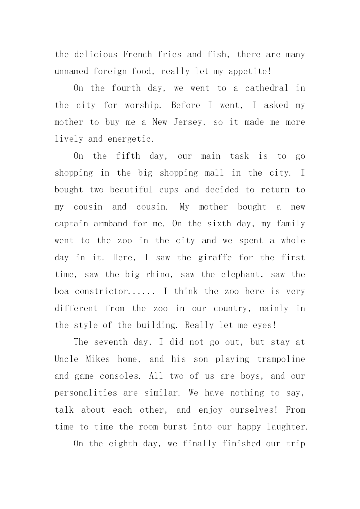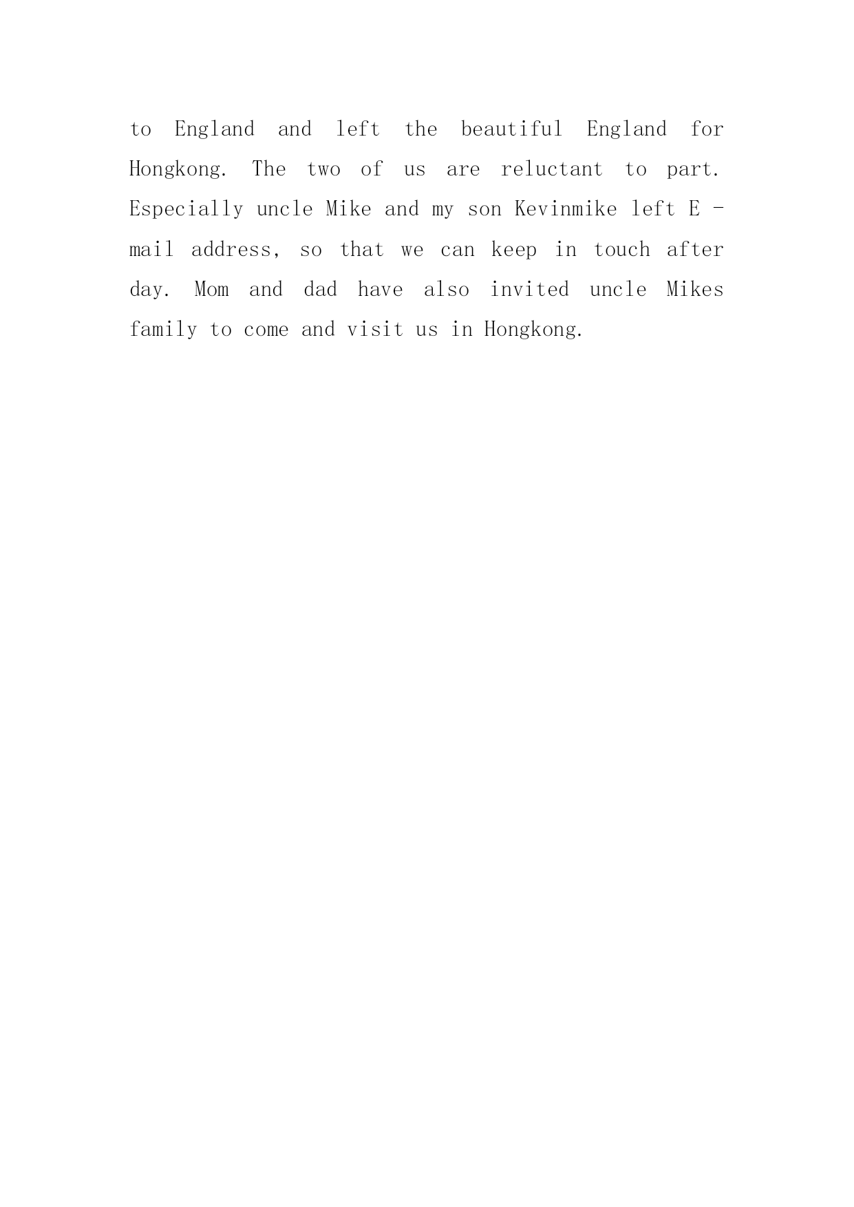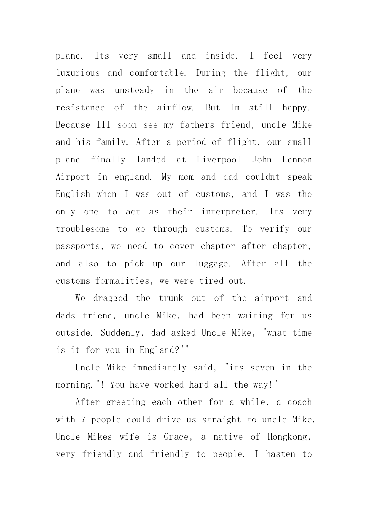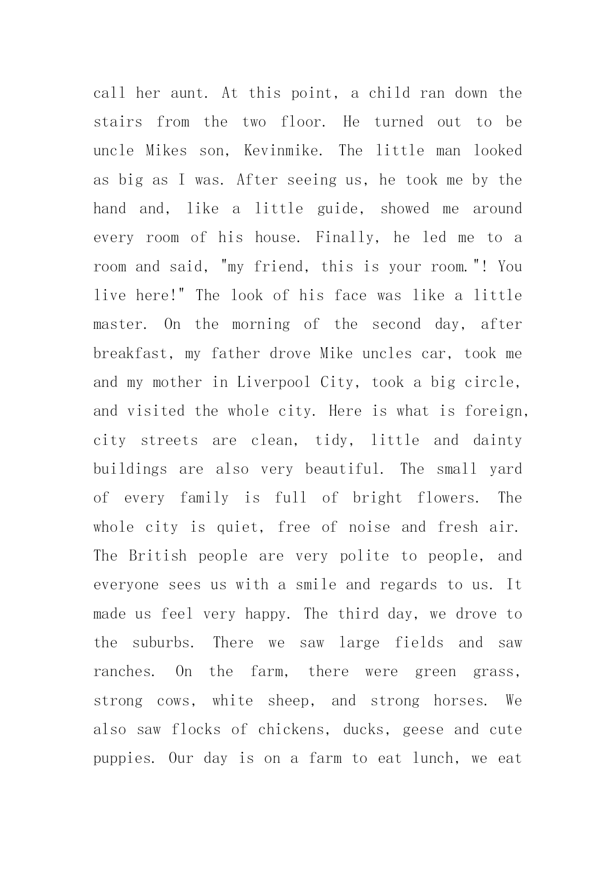 到英国旅游的英语作文无论是在学校还是在社会中,大家都不可避免地会接触到作文吧,写作文可以锻炼我们的.独处习惯,让自己的心静下来,思考自己未来的方向。为了让您在写作文时更加简单方便,以下是小编整理的到英国旅游的英语作文,希望对大家有所帮助。Lifehasmany,"thefirst"isalwaysunforgettable.Today,Imexcitedtotellyouaboutmyfirsttriptobritain.Lastsummer,myfatherandmotherdecidedtotakemetoEnglandforatrip.Onthatday,wewereontheplaneinHongkong,andmyfathertoldmewehadtoflytoHollandfirstandthentransferthere.Ontheplane,stewardessstewardessisverypolite.Shewillbringusfoodanddrinkforus.WepassengersarelikeGodandenjoythethoughtfulandmeticulousservice.Ontheplane,Iwaseating,drinkingandsleeping.Iwasveryexcitedinmybrain.Imlookingforwardtomydestinationsoon.Aftermorethantenhoursofflight,theplanefinallyarrivedatHollandAmsterdaminternationalairport.Afterwegotofftheplane,wewenttoEnglandbyalovelylittleplane.Dontlookattheplane.Itsverysmallandinside.Ifeelveryluxuriousandcomfortable.Duringtheflight,ourplanewasunsteadyintheairbecauseoftheresistanceoftheairflow.ButImstillhappy.BecauseIllsoonseemyfathersfriend,uncleMikeandhisfamily.Afteraperiodofflight,oursmallplanefinallylandedatLiverpoolJohnLennonAirportinengland.MymomanddadcouldntspeakEnglishwhenIwasoutofcustoms,andIwastheonlyonetoactastheirinterpreter.Itsverytroublesometogothroughcustoms.Toverifyourpassports,weneedtocoverchapterafterchapter,andalsotopickupourluggage.Afterallthecustomsformalities,weweretiredout.Wedraggedthetrunkoutoftheairportanddadsfriend,uncleMike,hadbeenwaitingforusoutside.Suddenly,dadaskedUncleMike,"whattimeisitforyouinEngland?""UncleMikeimmediatelysaid,"itsseveninthemorning."!Youhaveworkedhardalltheway!"Aftergreetingeachotherforawhile,acoachwith7peoplecoulddriveusstraighttouncleMike.UncleMikeswifeisGrace,anativeofHongkong,veryfriendlyandfriendlytopeople.Ihastentocallheraunt.Atthispoint,achildrandownthestairsfromthetwofloor.HeturnedouttobeuncleMikesson,Kevinmike.ThelittlemanlookedasbigasIwas.Afterseeingus,hetookmebythehandand,likealittleguide,showedmearoundeveryroomofhishouse.Finally,heledmetoaroomandsaid,"myfriend,thisisyourroom."!Youlivehere!"Thel