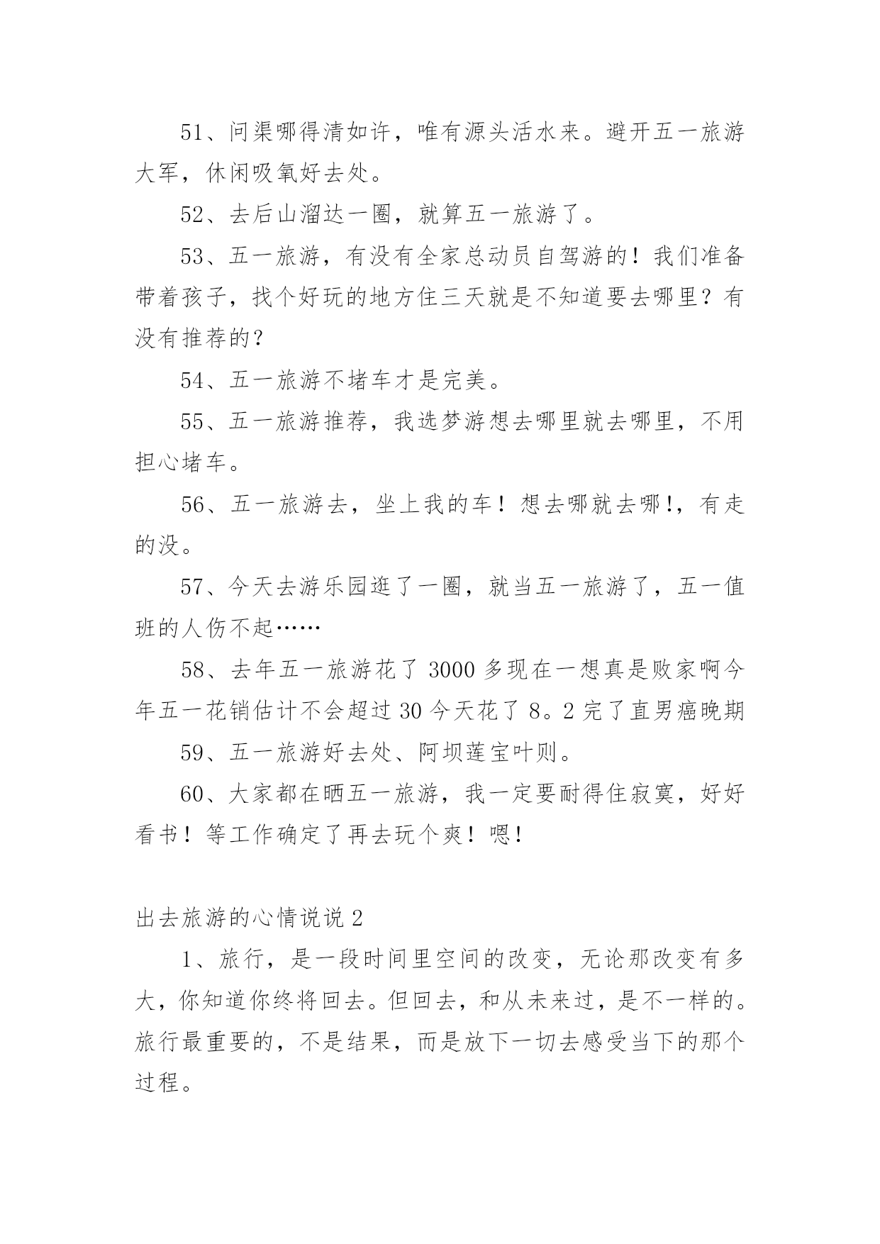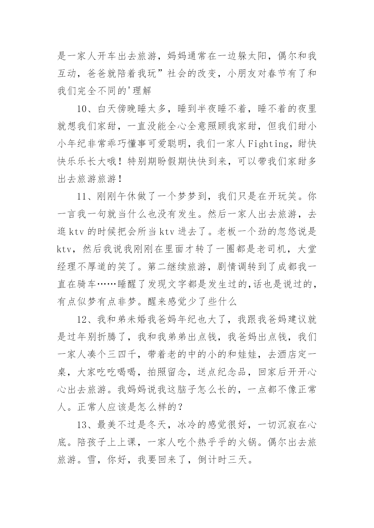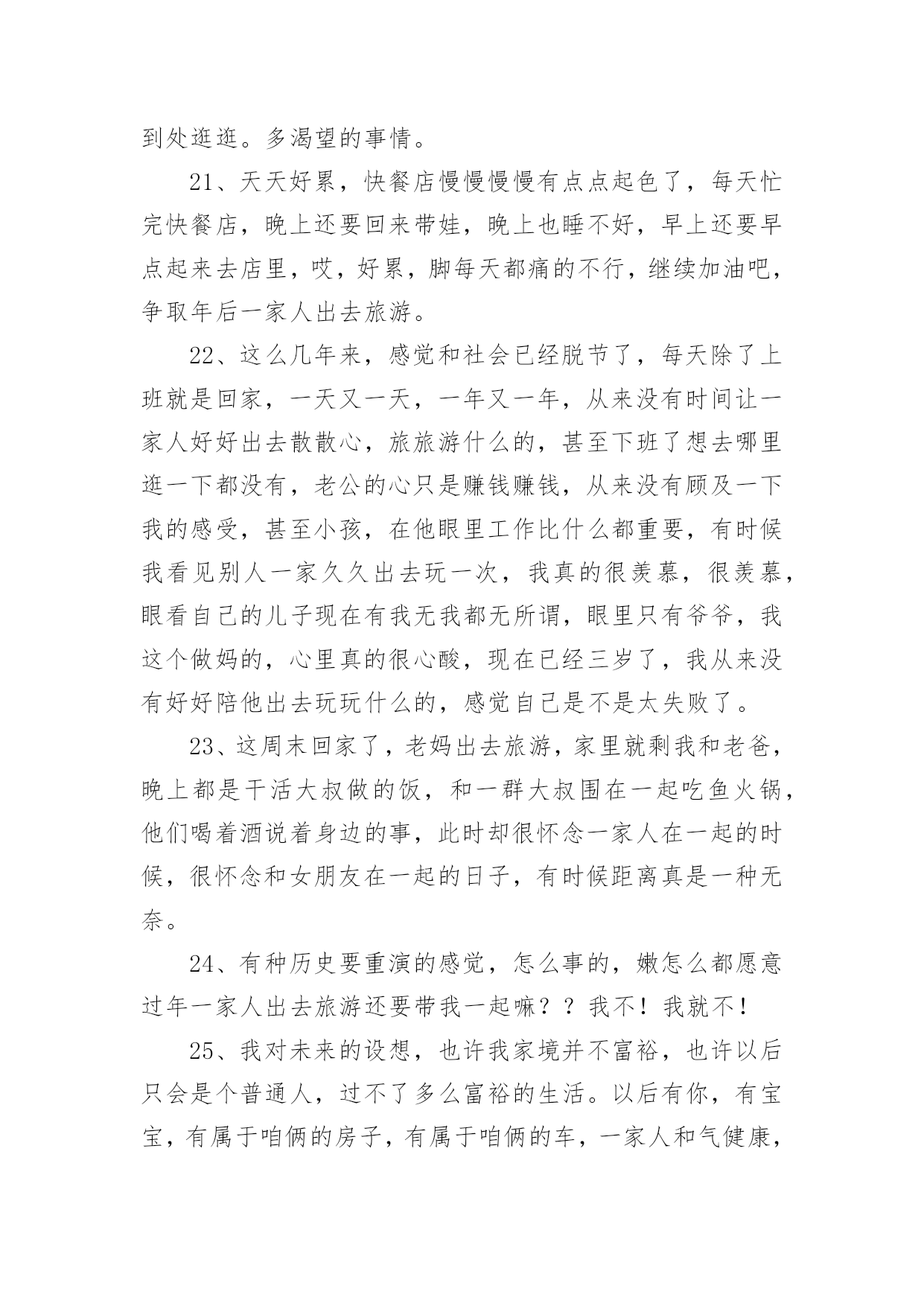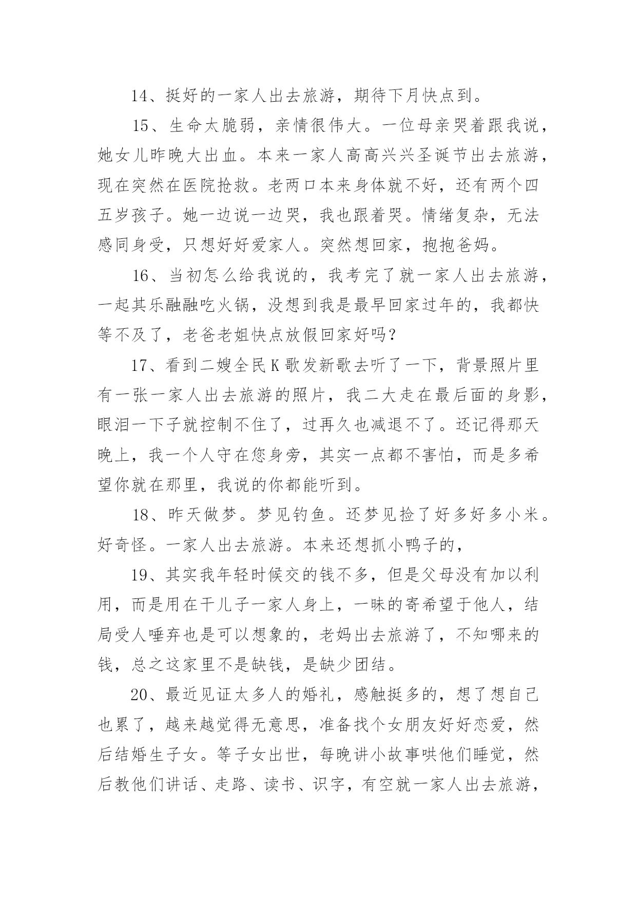 出去旅游的心情说说随着社交网络的兴起和普及,越来越多人钟情于发布说说,用以宣泄自己的情绪,调节心情。什么样的说说才让人印象深刻呢?下面是小编整理的出去旅游的心情说说,供大家参考借鉴,希望可以帮助到有需要的朋友。出去旅游的心情说说11、同样一家人,差别怎么这么大的呢,人人都出去旅游,就我一直呆在家。2、最近一家人出去旅游啦!宝宝好开心!很喜欢出去游玩~岳阳石牛寨,玻璃桥!老爸恐高也上了,勇敢的扶着不往下看走过去啦。3、打算,和男朋友一起去旅游当然是一家人出去开开心心的玩一下。4、这个跨年,看着朋友圈的朋友都在刷跨年,我的心有点酸酸的,很悲伤。好想找个人喝醉,好想堕落好想放纵一回。第二天一切都结束了,都变成我期望的样子,我想有个家,一个属于我的家,干净整洁温馨,每天接送孩子上下学,做着自己喜欢的工作,可以有时间学自己的爱好,可以一家人出去旅游…就这样一辈子。5、表妹一家人其乐融融的出去旅游,看到全家福得一瞬有种莫名的情绪,遗憾?羡慕?属于我的全家福依稀记得是十年多年前了吧。。。原来只是假装不在乎6、21岁大学毕业一毕业就想结婚生个女儿节假日一家人出去旅游很憧憬这种生活平淡才是真然而我并没有男朋友7、我有一个小妹妹,今年才高一,暑假和她一家人出去旅游,结果小姑娘全程都不说话,到了酒店就问酒店有没有电脑,要是没有的话就满脸不开心,要是有电脑就趴在电脑上看动漫啥的。我和几个发小都玩的挺开心的,爸妈就让我多跟小妹妹说说话。结果我去找她,她就让我陪她一起看动漫,我觉得挺无聊的,勉强看了一集就去睡觉了。大家出来玩,到旅游景点她也不拍照,感觉阴沉沉的,不喜欢和别人说话最后我问她怎么出来不高兴啊,她说自己本来要去看漫展,结果爸妈不让去,所以不开心。我觉得我们去的旅游景点都蛮好玩的,大家都嘻嘻哈哈玩的很开心,可是小妹妹全程都不开心,也不喜欢说话,感觉没有一点年轻人的活力啊。我一直这么觉得。8、日记:外婆和小姨生日快乐!今天是小姨的四十岁生日,同时也是外婆的涵生。很凑巧的,外婆在生日的那天生下了小姨。晚上一家人吃了一顿大餐,这样子是最温馨的时刻,我特别珍惜!一家人约定,等外婆生日的时候,一家人出去旅游!9、上周老师布置了一个看图写话作业,是关于春节的。小朋友照例争取用一句或者话概括5W1H,再加一句话覆盖题目要求(比如题目要求写心情之类的)。看着太简单了,就要求他再写一篇他怎么看春节的。小朋友写的是:“春节就是一家人开车出去旅游,妈妈通常在一边躲太阳,偶尔和我互动,爸爸就陪着我玩”社会的改变,小朋友对春节有了和我们完全不同的'理解10、白天傍晚睡太多,睡到半夜睡不着,睡不着的夜里就想我们家甜,一直没能全心全意照顾我家甜,但我们甜小小年纪非常乖巧懂事可爱聪明,我们一家人Fighting,甜快快乐乐长大哦!特别期盼假期快快到来,可以带我们家甜多出去旅游旅游!11、刚刚午休做了一个梦梦到,我们只是在开玩笑。你一言我一句就当什么也没有发生。然后一家人出去旅游,去逛ktv的时候把会所当ktv进去了。老板一个劲的忽悠说是ktv,然后我说我刚刚在里面才转了一圈都是老司机,大堂经理不厚道的笑了。第二继续旅游,剧情调转到了成都我一直在骑车……睡醒了发现文字都是发生过的,话也是说过的,有点似梦有点非梦。醒来感觉少了些什么12、我和弟未婚我爸妈年纪也大了,我跟我爸妈建议就是过年别折腾了,我和我弟弟出点钱,我爸妈出点钱,我们一家人凑个三四千,带着老的中的小的和娃娃,去酒店定一桌,大家吃吃喝喝,拍照留念,送点纪念品,回家后开开心心出去旅游。我妈妈说我这脑子怎么长的,一点都不像正常人。正常人应该是怎么样的?13、最美不过是冬天,冰冷的感觉很好,一切沉寂在心底。陪孩子上上课,一家人吃个热乎乎的火锅。偶尔出去旅旅游。雪,你好,我要回来了,倒计时三天。14、挺好的一家人出去旅游,期待下月快点到。15、生命太脆弱,亲情很伟大。一位母亲哭着跟我说,她女儿昨晚大出血。本来一家人高高兴兴圣诞节出去旅游,现在突然在医院抢救。老两口本来身体就不好,还有两个四五岁孩子。她一边说一边哭,我也跟着哭。情绪复杂,无法感同身受,只想好好爱家人。突然想回家,抱抱爸妈。16、当初怎么给我说的,我考完了就一家人出去旅游,一起其乐融融吃火锅,没想到我是最早回家过年的,我都快等不及了,老爸老姐快点放假回家好吗?17、看到二嫂全民K歌发新歌去听了一下,背景照片里有一张一家人出去旅游的照片,我二大走在最后面的身影,眼泪一下子就控制不住了,过再久也减退不了。还记得那天晚上,我一个人守在您身旁,其实一点都不害怕,而是多希望你就在那里,我说的你都能听到。18、昨天做梦。梦见钓鱼。还梦见捡了好多好多小米。好奇怪。一家人出去旅游。本来还想抓小鸭子的,19、其实我年轻时候交的钱不多,但是父母没有加以利用,而是用在干儿子一家人身